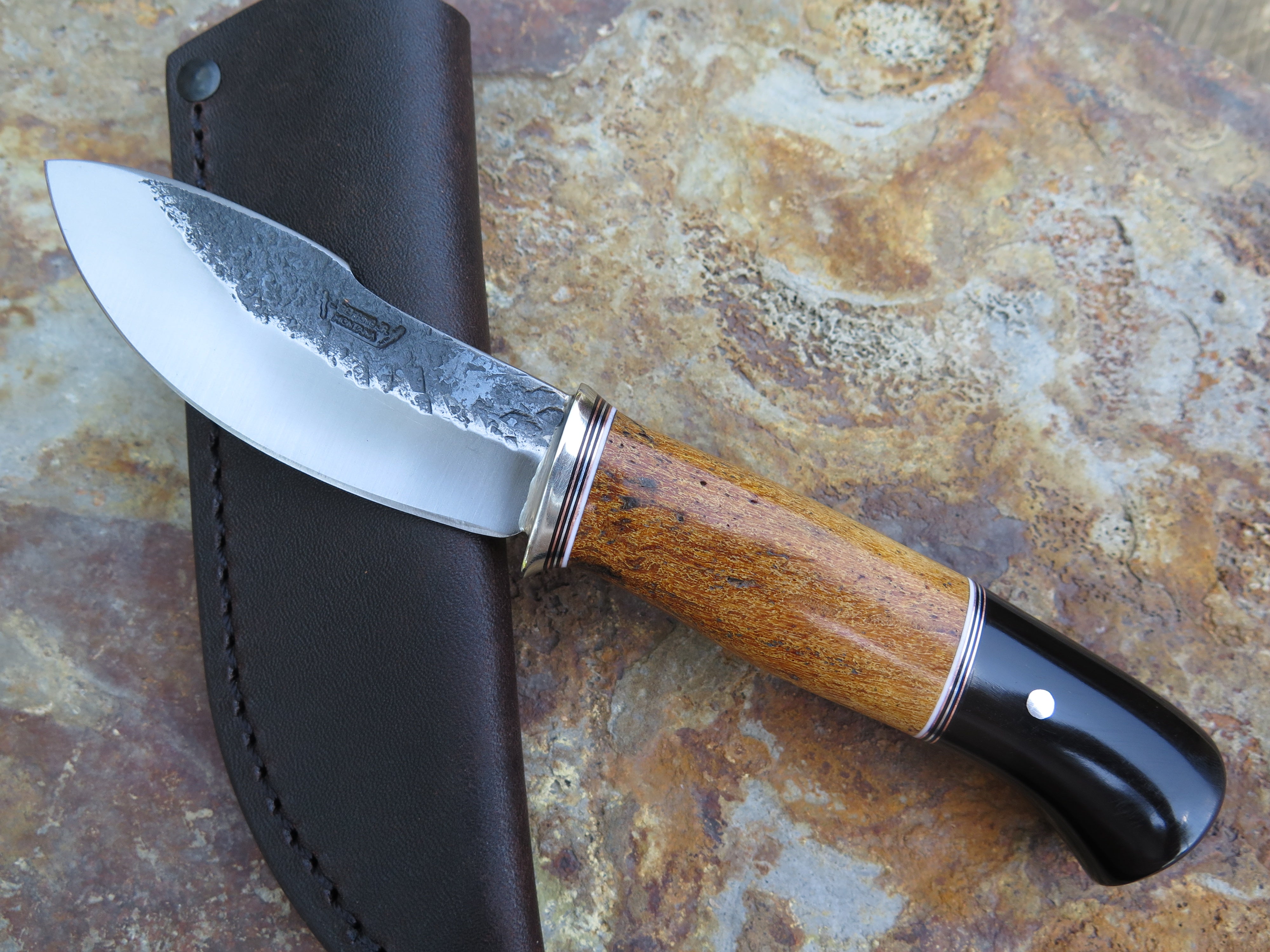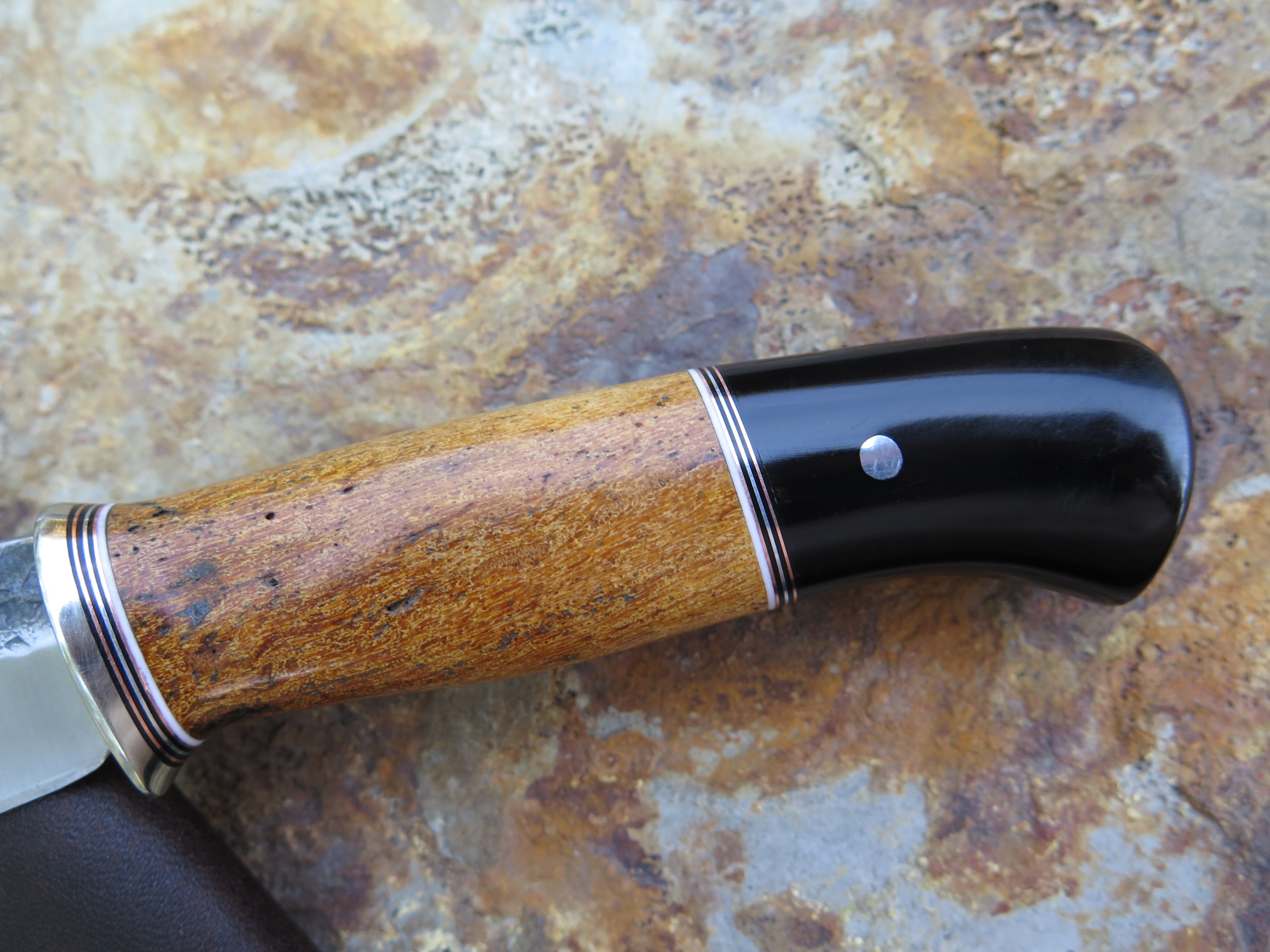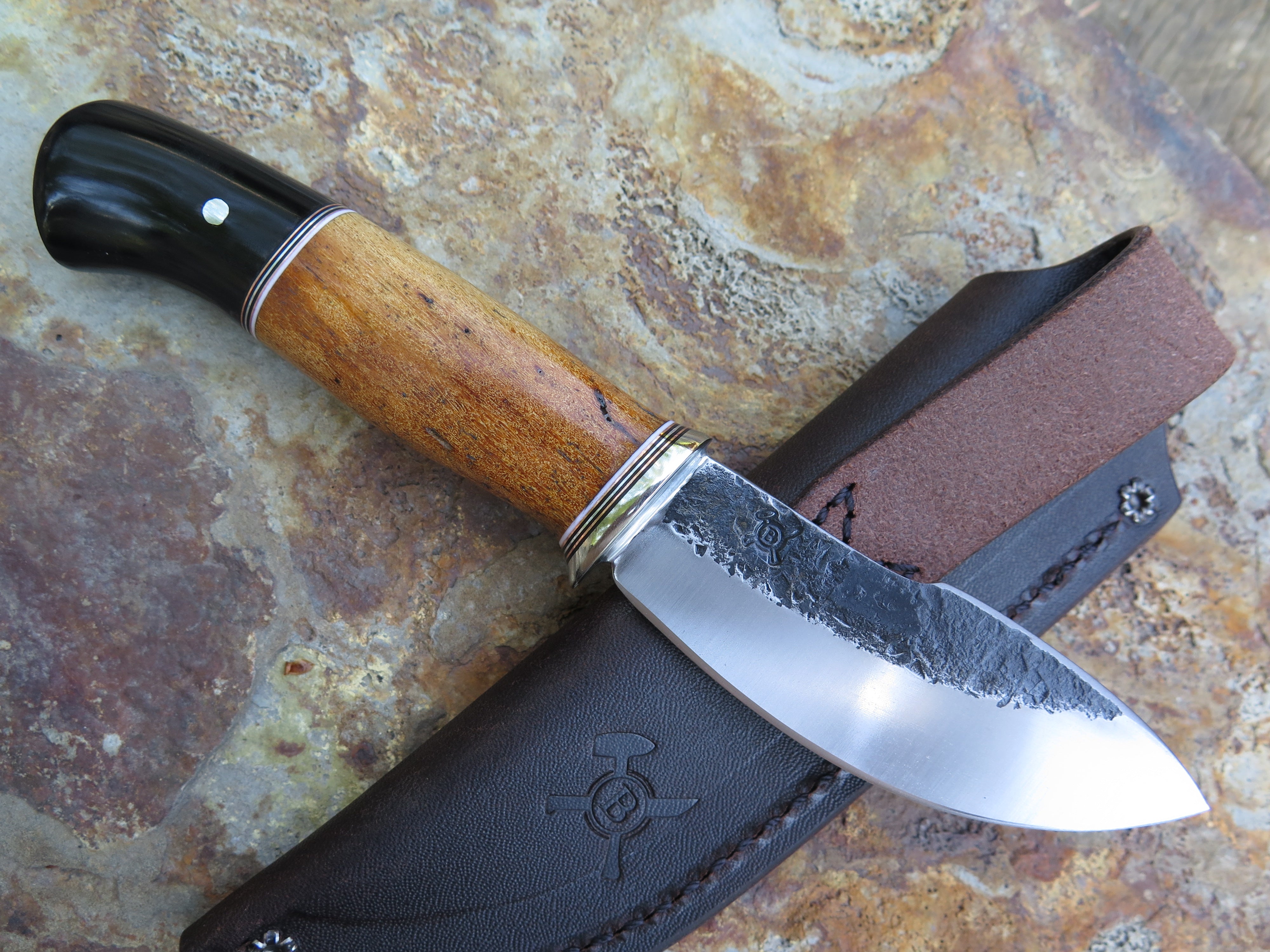This handsome new Canoe knife from Behring Made© is hand forged from 1/8" thick high carbon 01 tool steel and it measures 3 1/2" from tip to guard with a razor sharp hollow grind and our hammermark finish. The nickel silver guard is soldered in place above black and white fiber, aluminum and copper spacers amidst a two-piece stack of Stellar's sea cow and African water buffalo horn that's pinned through the tang with aluminum. The overall length measures 7 5/8" and it comes in a classic leather belt pouch sheath.