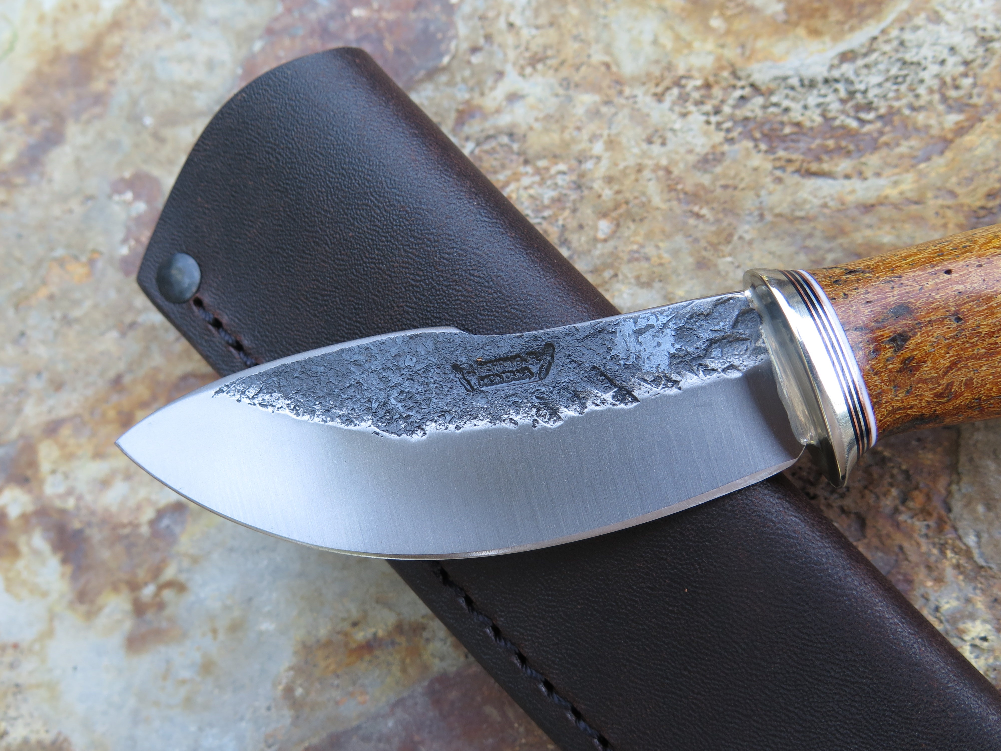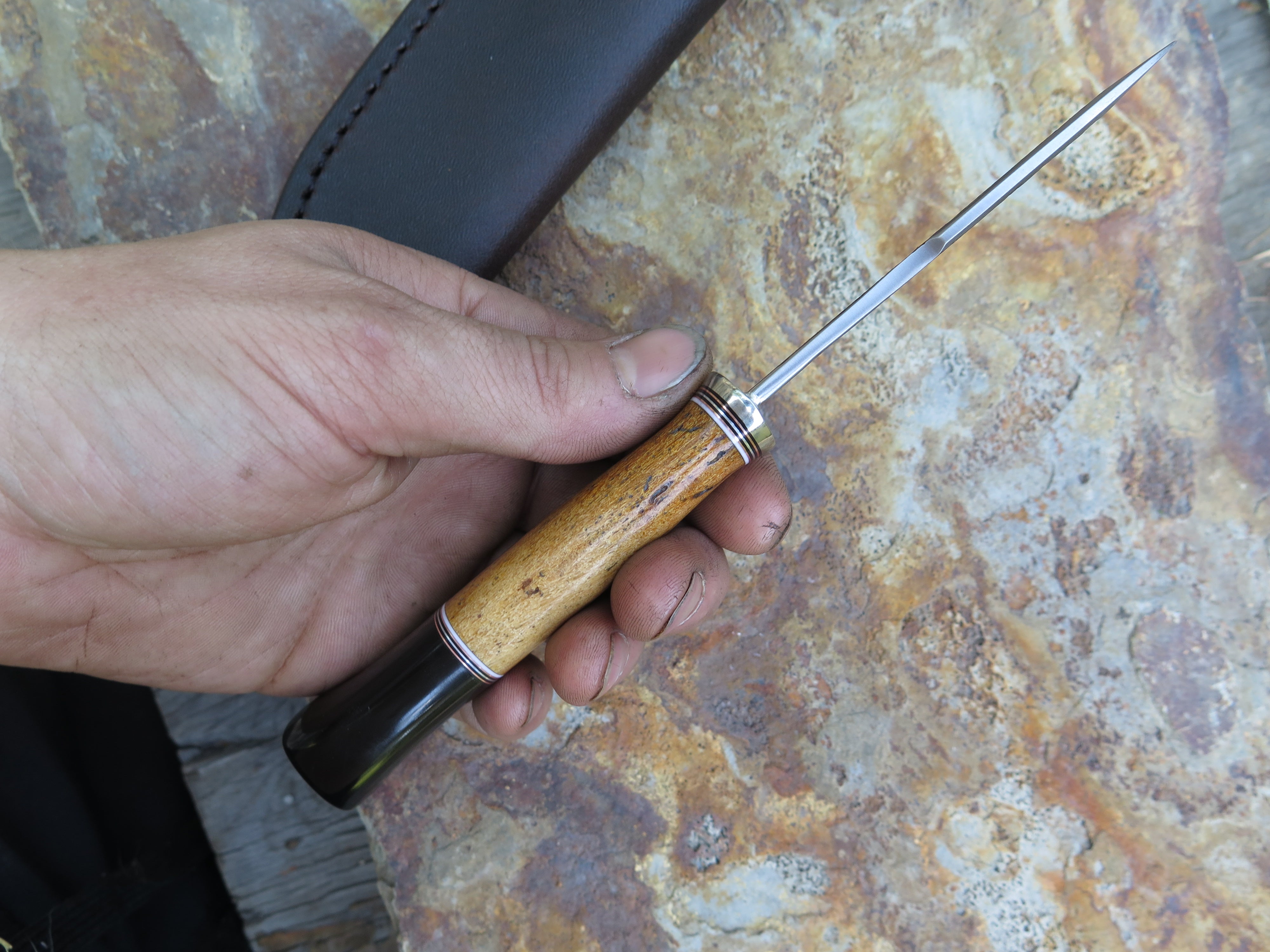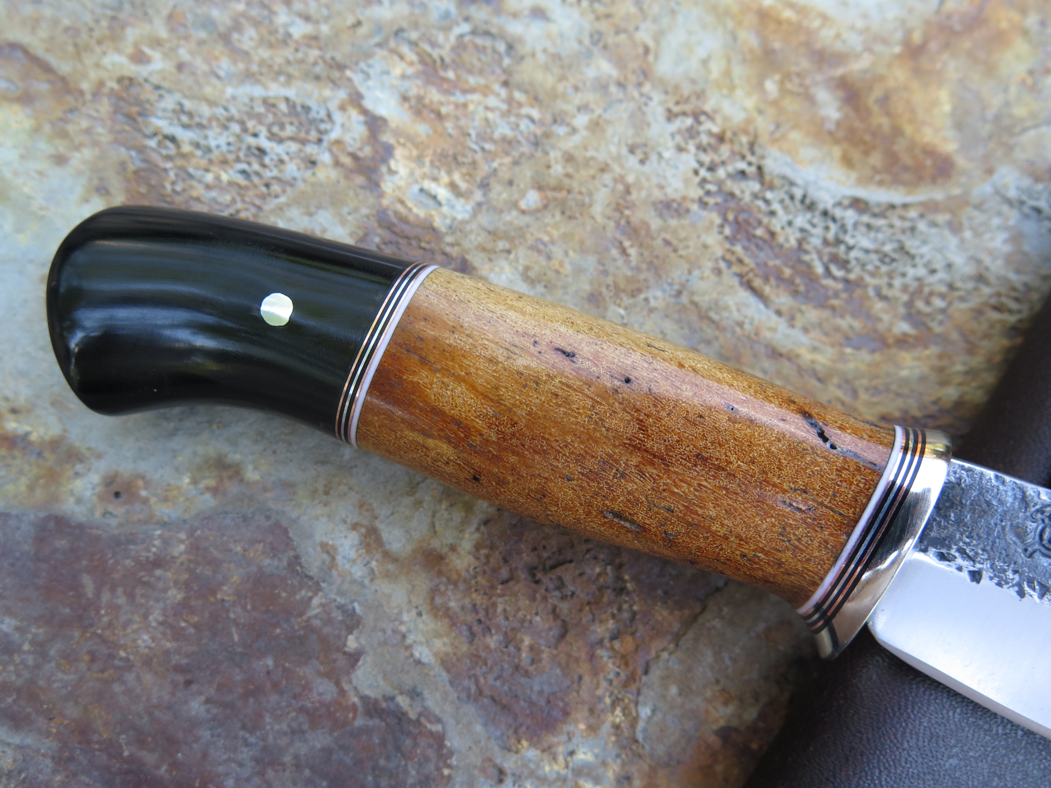 This handsome new Canoe knife from Behring Made© is hand forged from 1/8" thick high carbon 01 tool steel and it measures 3 1/2" from tip to guard with a razor sharp hollow grind and our hammermark finish. The nickel silver guard is soldered in place above black and white fiber, aluminum and copper spacers amidst a two-piece stack of Stellar's sea cow and African water buffalo horn that's pinned through the tang with aluminum. The overall length measures 7 5/8" and it comes in a classic leather belt pouch sheath.