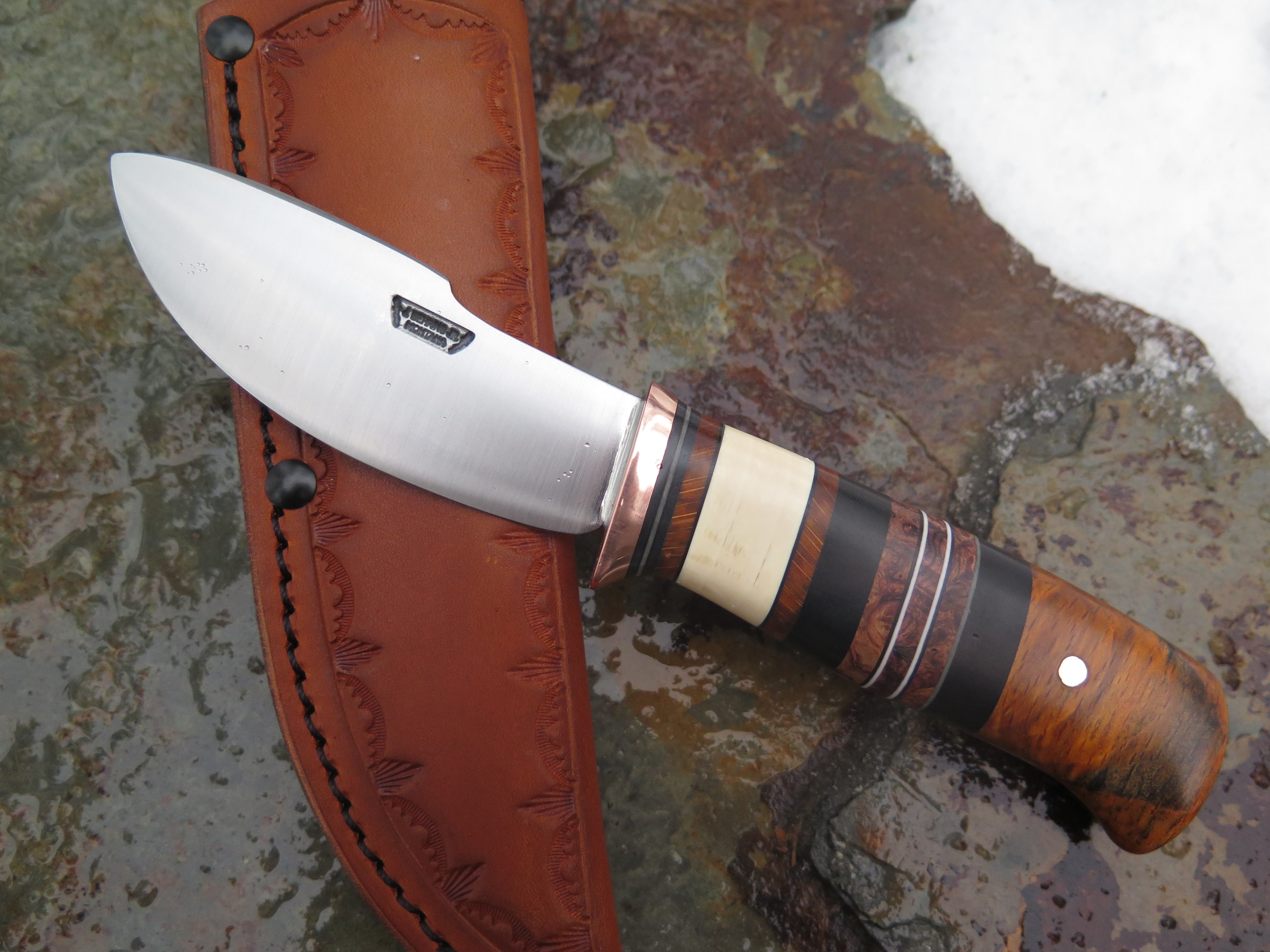 This beautiful new Canoe Knife from Behring Made© is hand forged from 1/8" thick high carbon 01 tool steel and measures 3 3/4" from tip to guard with a razor sharp convex grind. The copper guard is soldered in place above black, gray and white fiber and ancient mammoth ivory spacers as well as a woody handle of African ebony, redwood, maple, beech, amboyna and ironwood to boot. The butt is pinned through the tang with copper, and the overall length measures 7 3/4" plus it comes in the shown leather belt pouch sheath, though substitutions are available upon request.