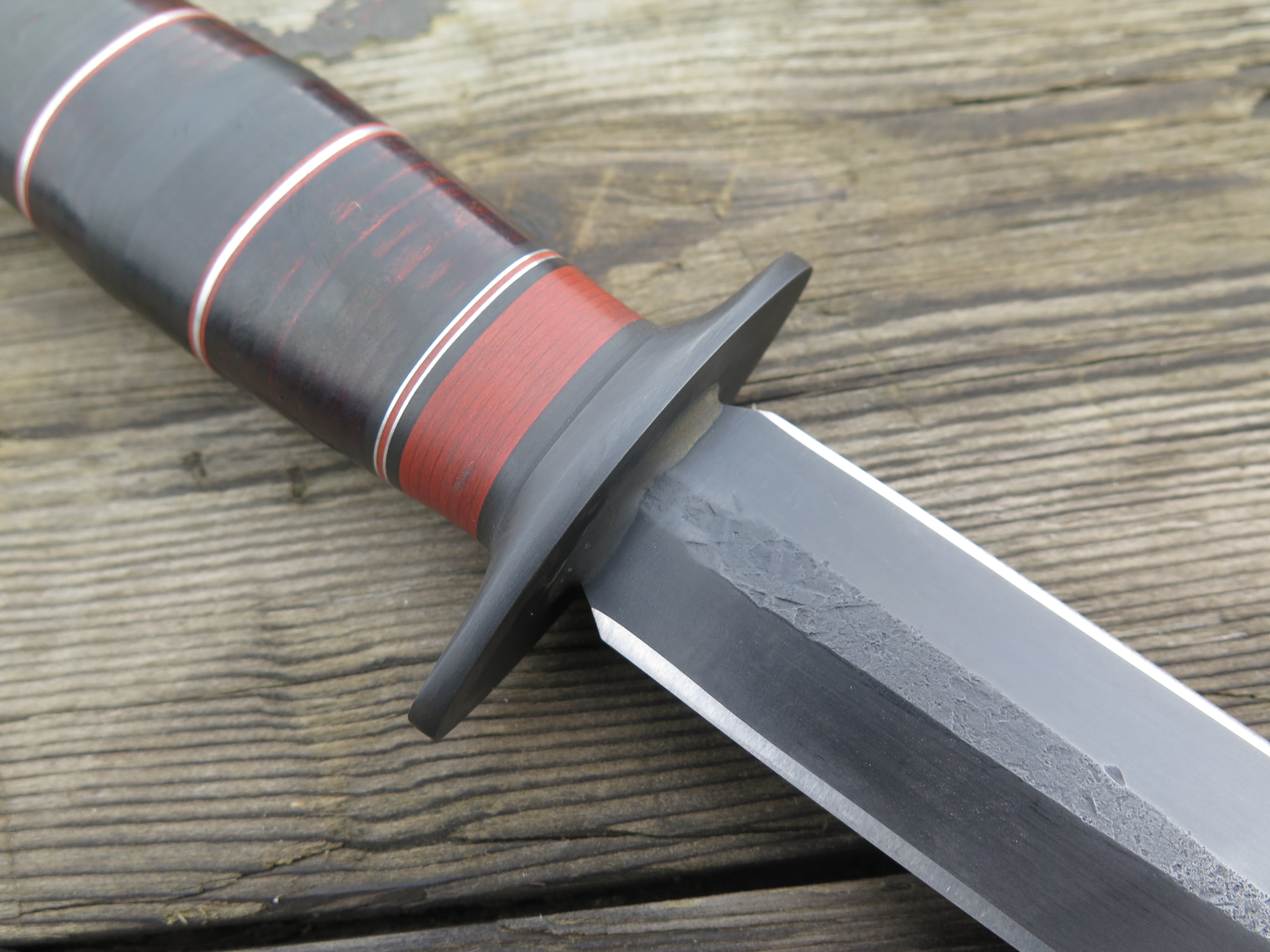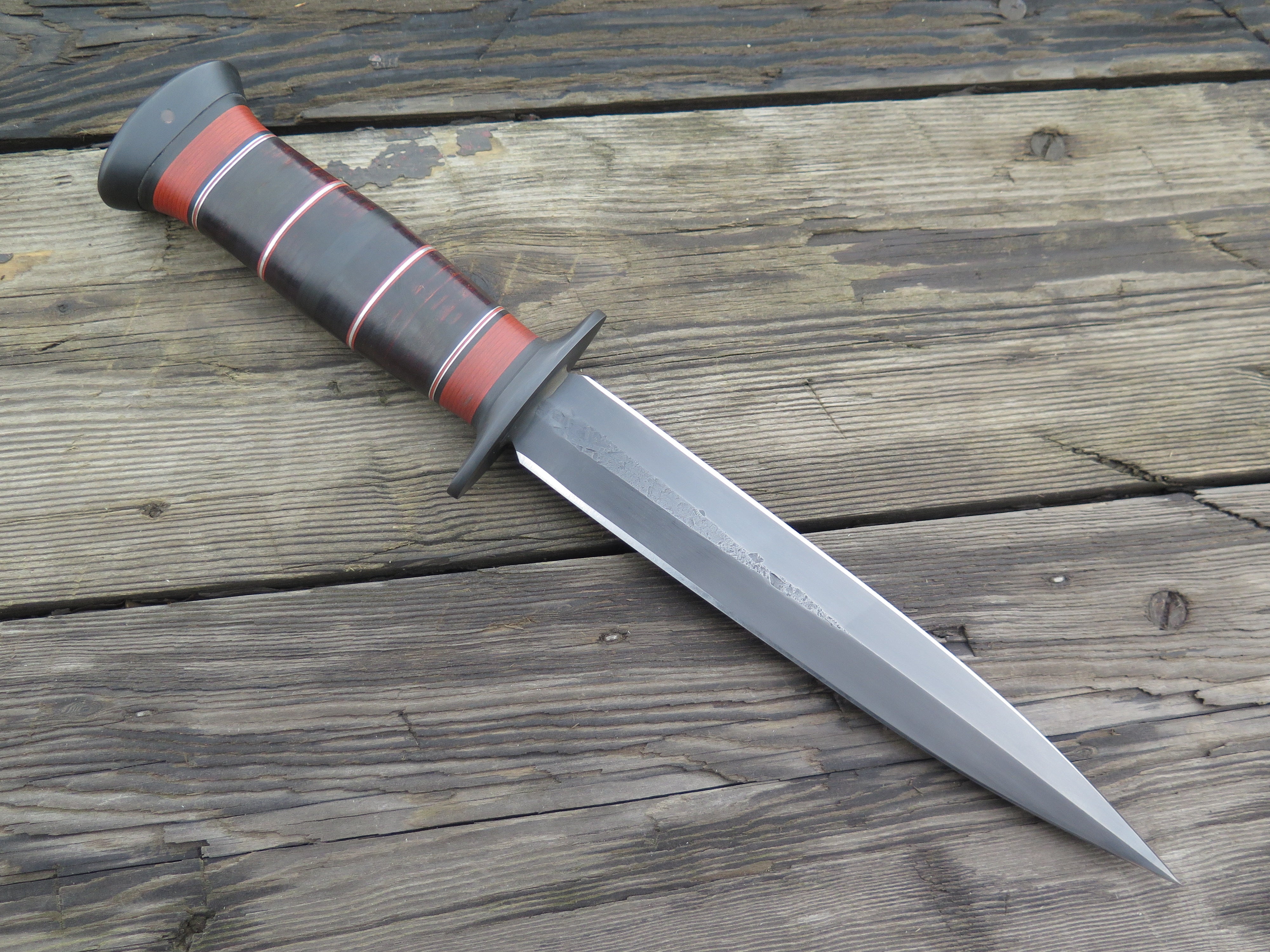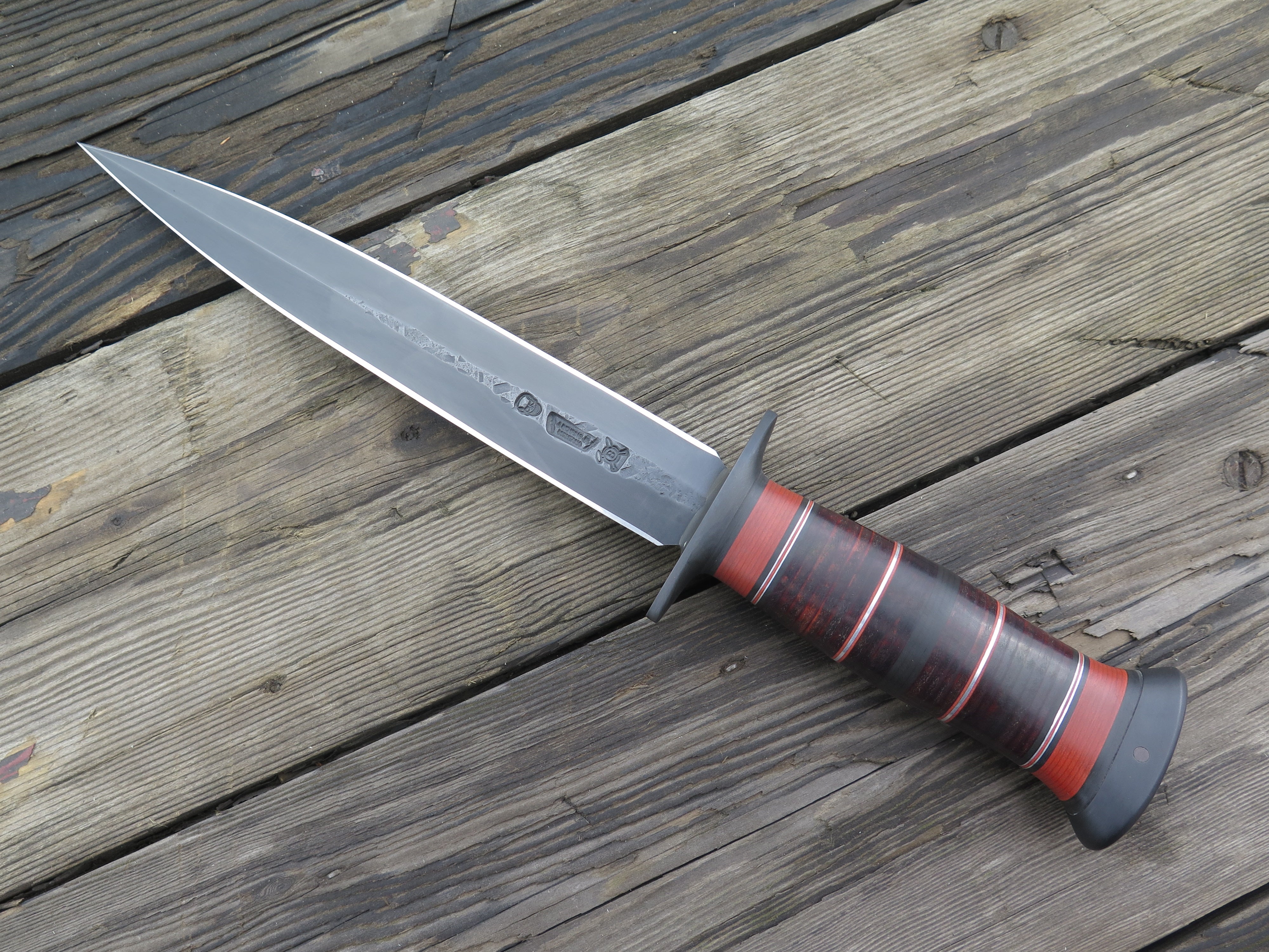 This bad ass new Fairbairn-Sykes double edge Fighter from Behring Made© is hand forged from 1/4" thick 5160 spring steel and it measures 7 3/4" from tip to guard with a razor sharp double hollow grind, hammermarks and our forced patina blued finish. The blued steel guard is soldered in place above lack and maroon fiber, aluminum and horsehide stacked leather between a blued steel butt that's pinned through the tang with copper. The overall length measures 12 1/2" and it comes in a custom sheath in the style of your choosing.