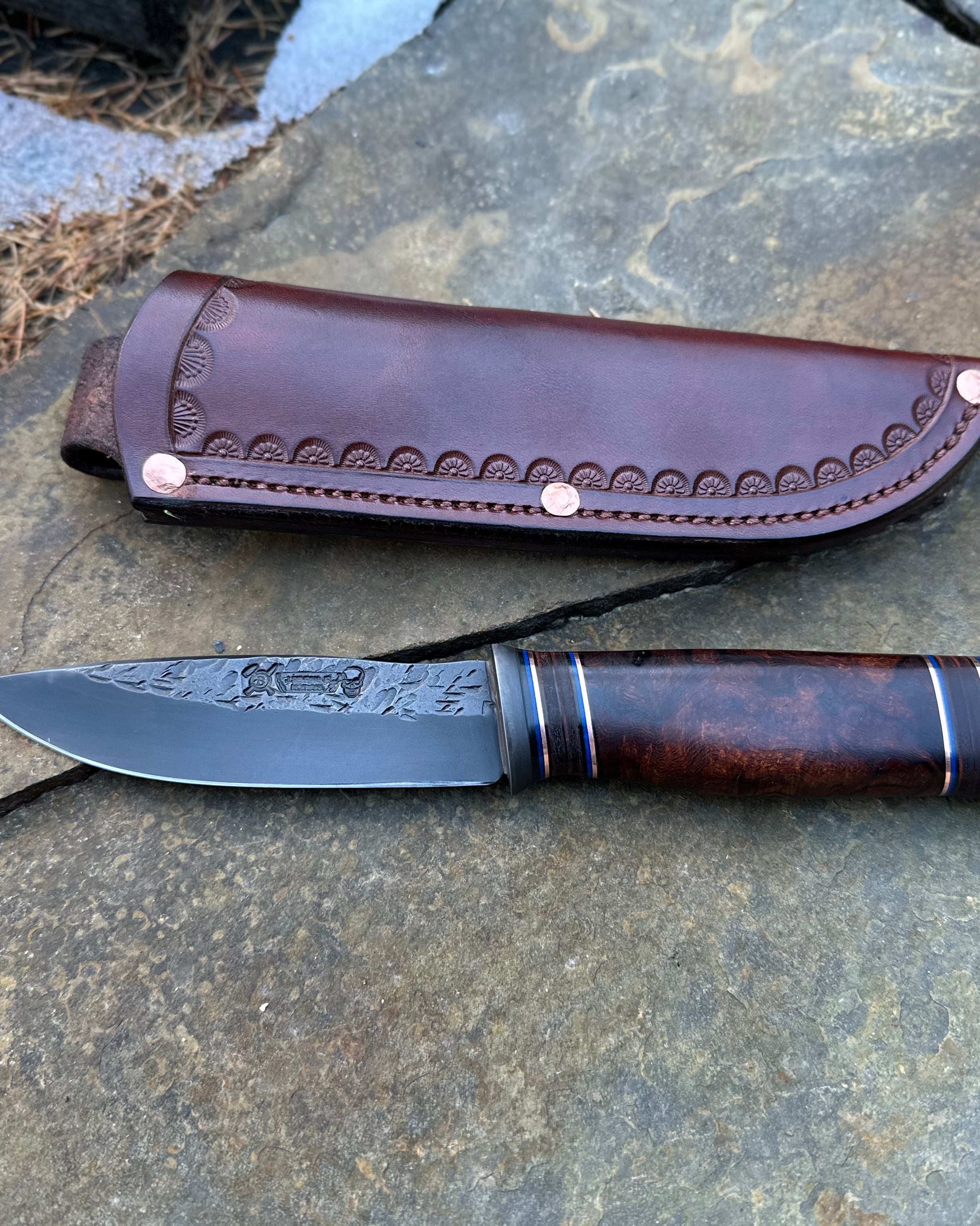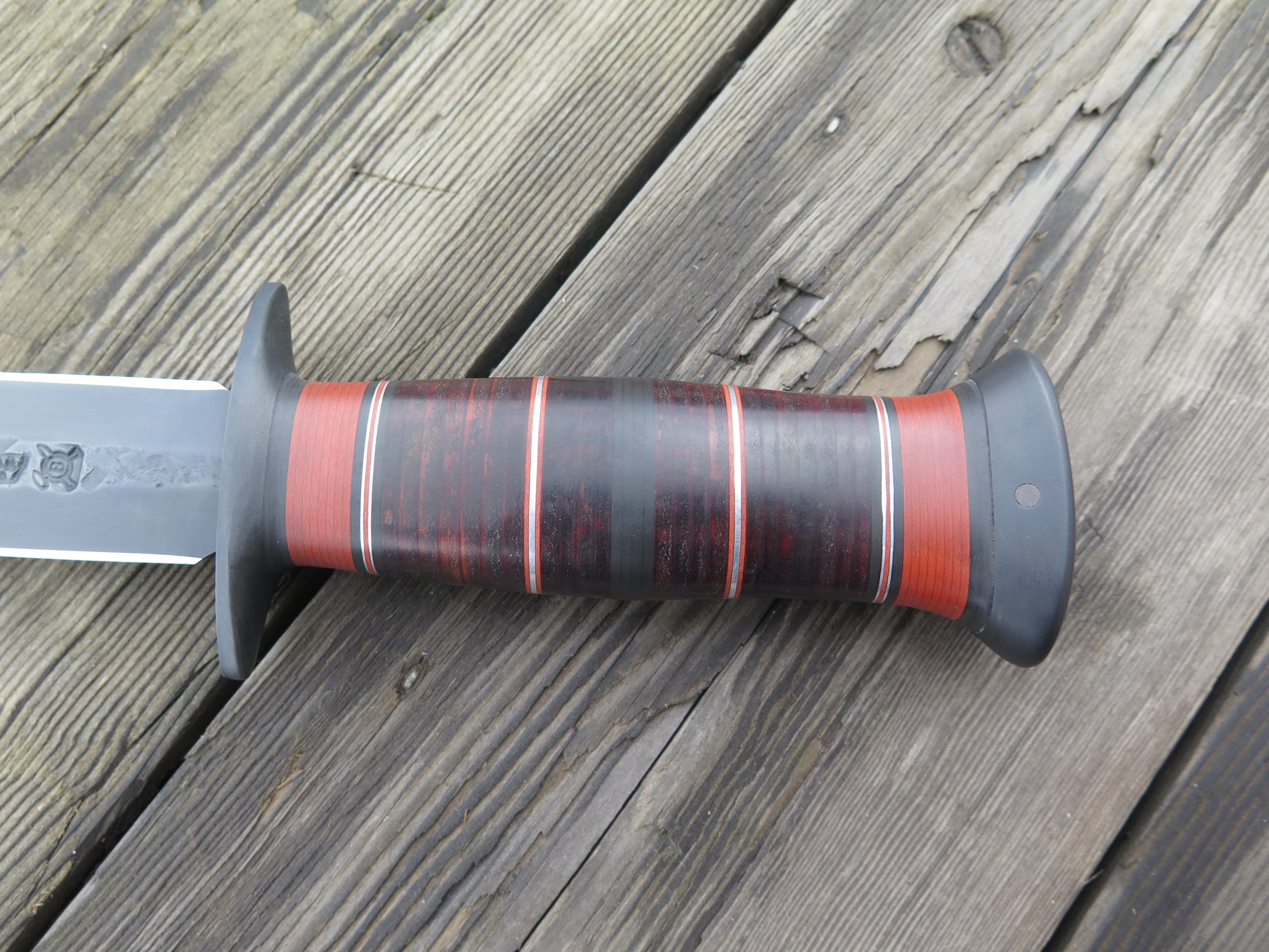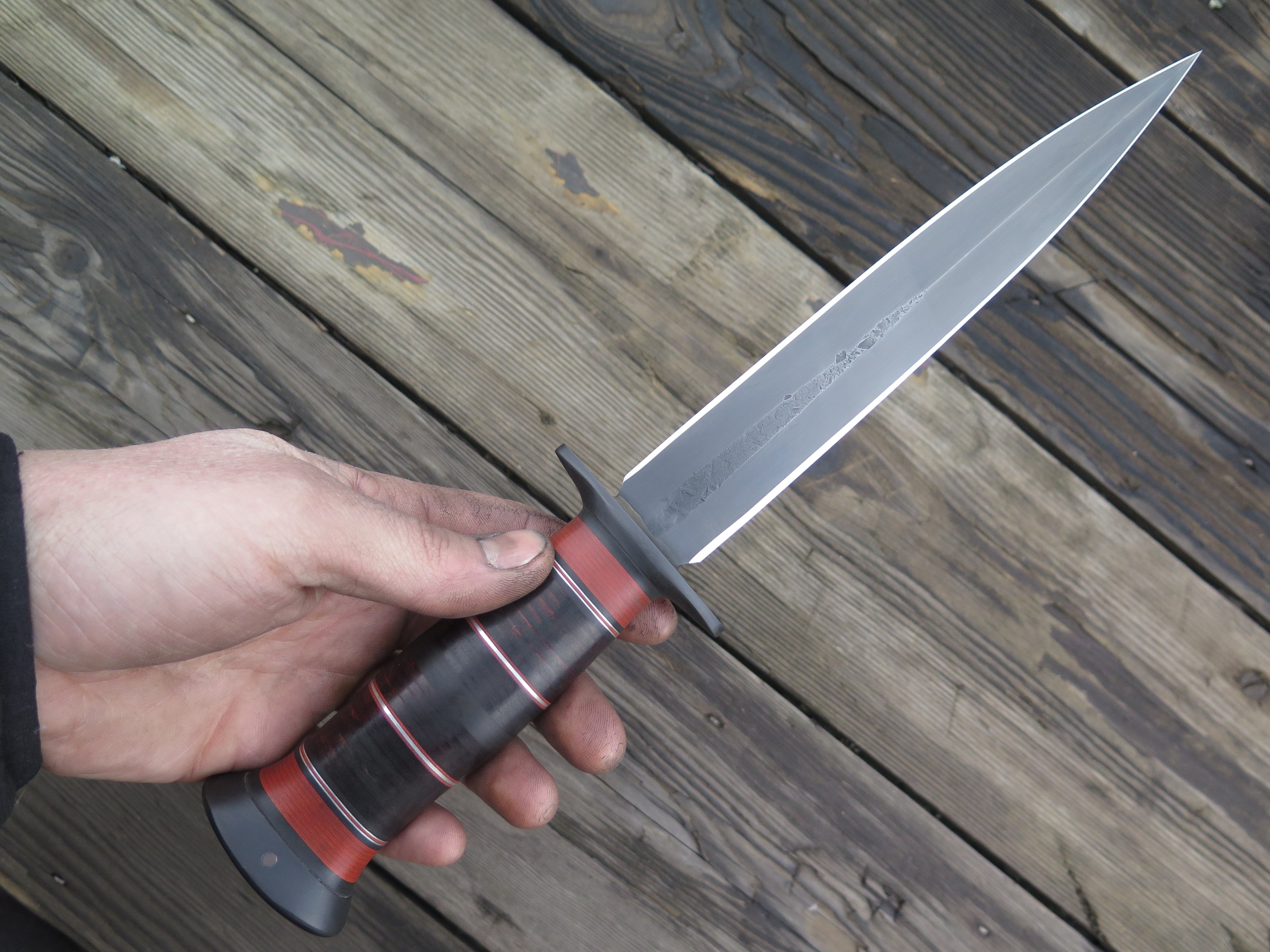 This bad ass new Fairbairn-Sykes double edge Fighter from Behring Made© is hand forged from 1/4" thick 5160 spring steel and it measures 7 3/4" from tip to guard with a razor sharp double hollow grind, hammermarks and our forced patina blued finish. The blued steel guard is soldered in place above lack and maroon fiber, aluminum and horsehide stacked leather between a blued steel butt that's pinned through the tang with copper. The overall length measures 12 1/2" and it comes in a custom sheath in the style of your choosing.