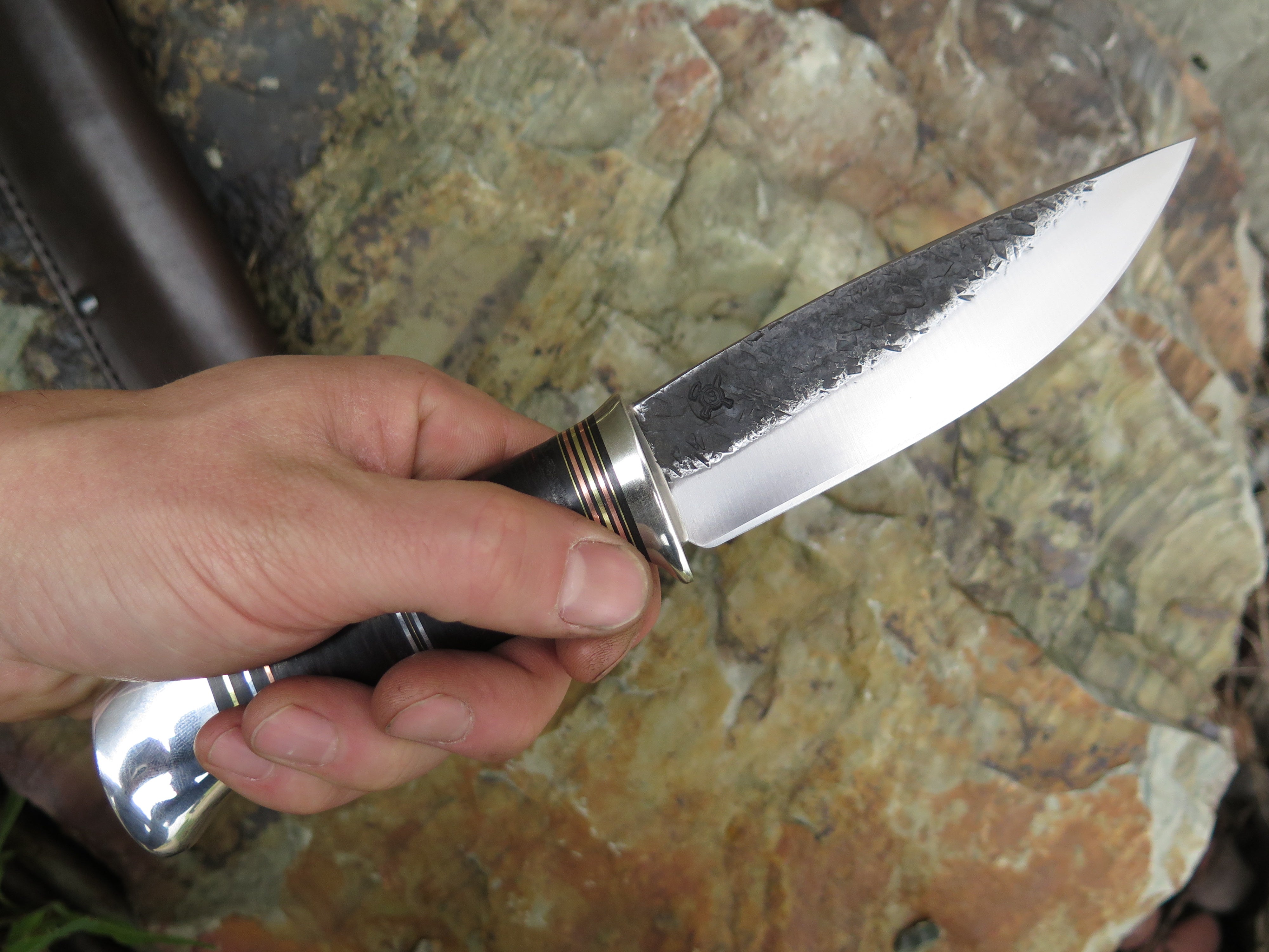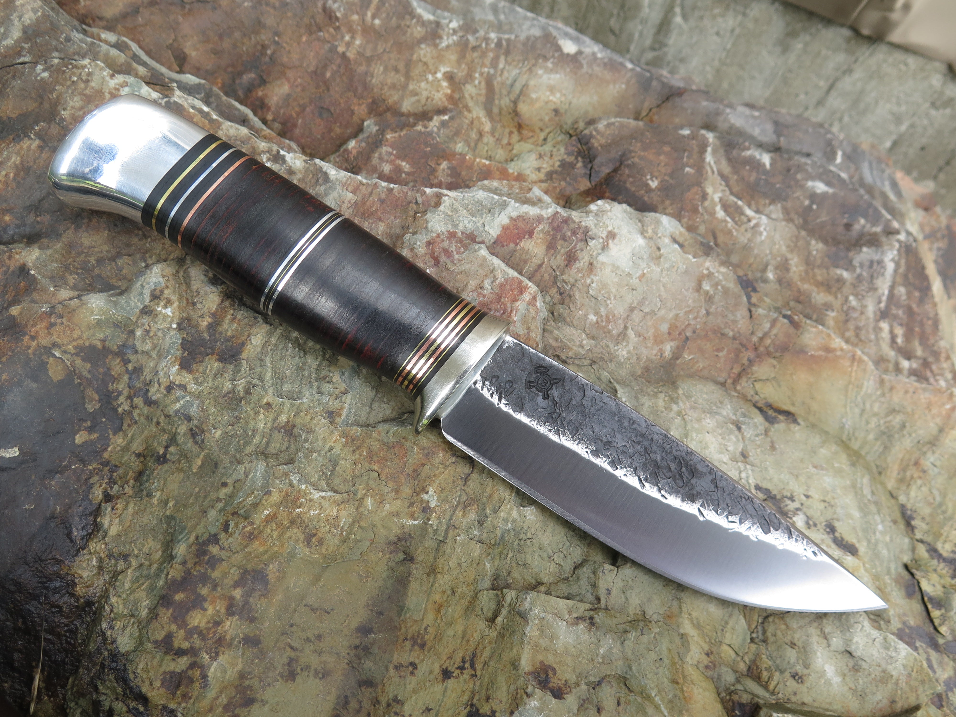 This classic style Drop Point from Behring Made™ is hand forged from 3/16" thick high carbon 01 tool steel and it measures 4 3/4" from tip to guard with a razor sharp hollow grind and a hammermark finish. The nickel silver guard is soldered in place above black fiber, brass, copper, aluminum and horsehide leather spacers as well as an aluminum butt that's pinned with aluminum through the tang. The overall length measures 9 1/4" and it comes in a Warlander Leather pouch sheath.