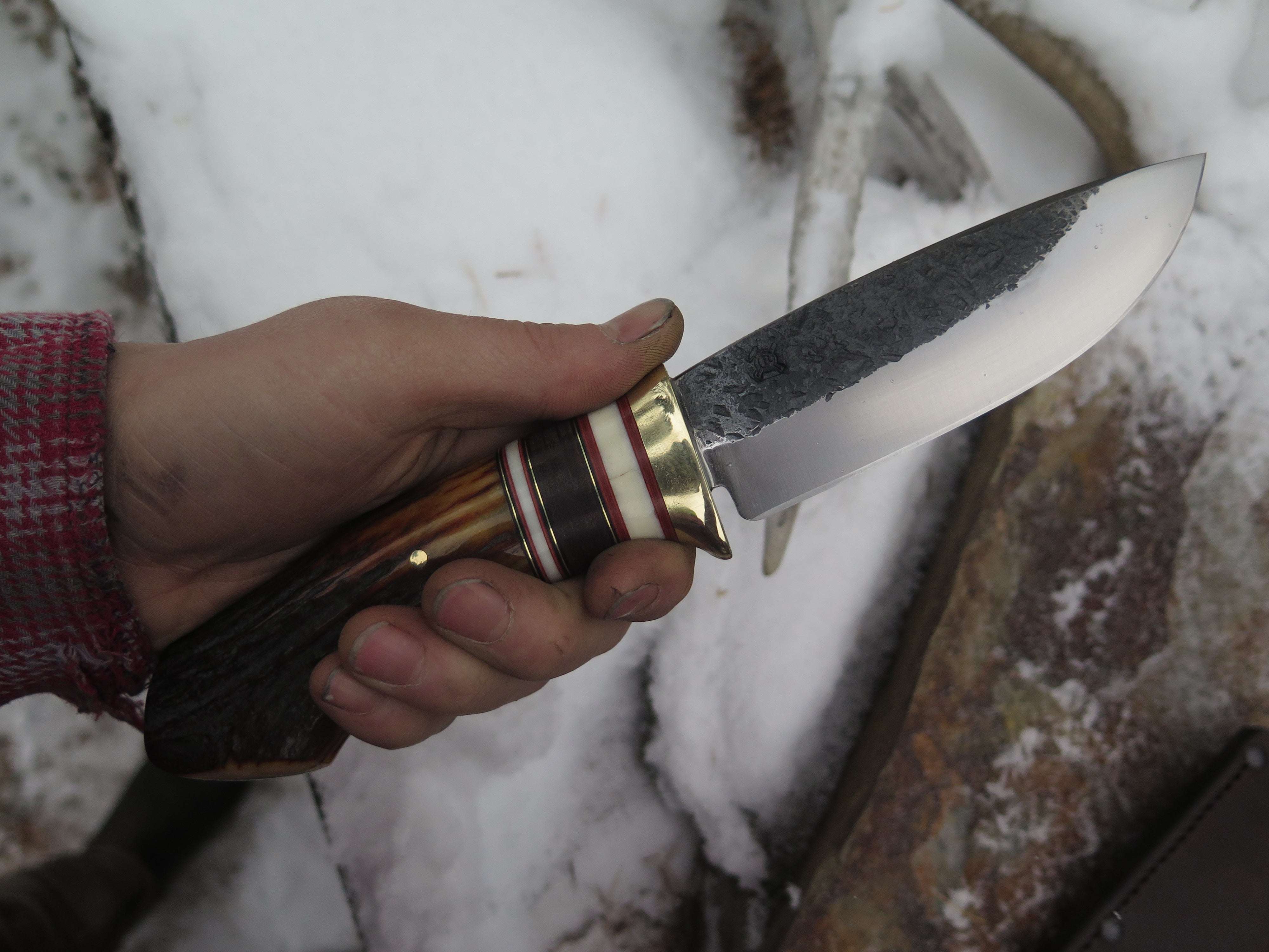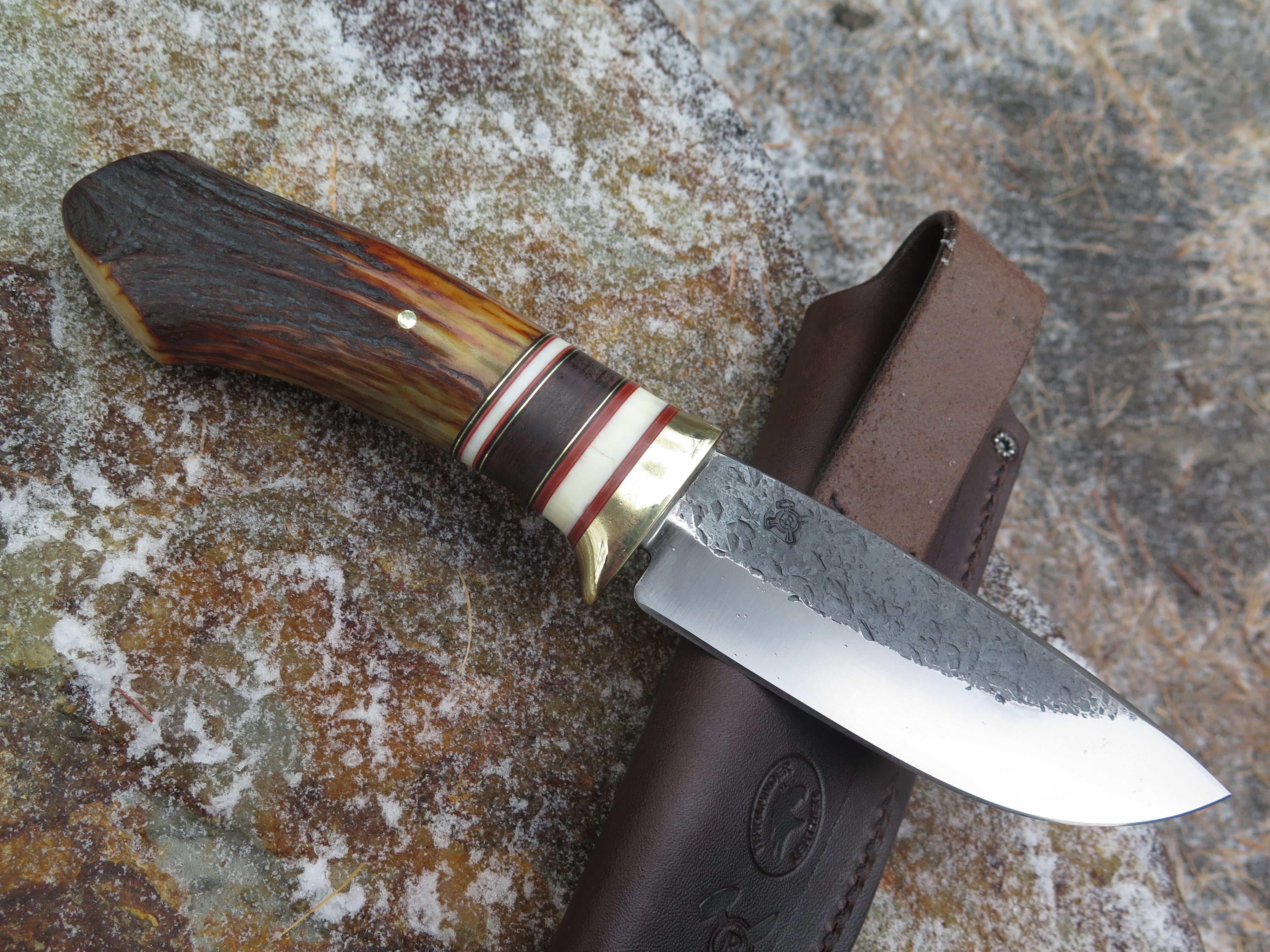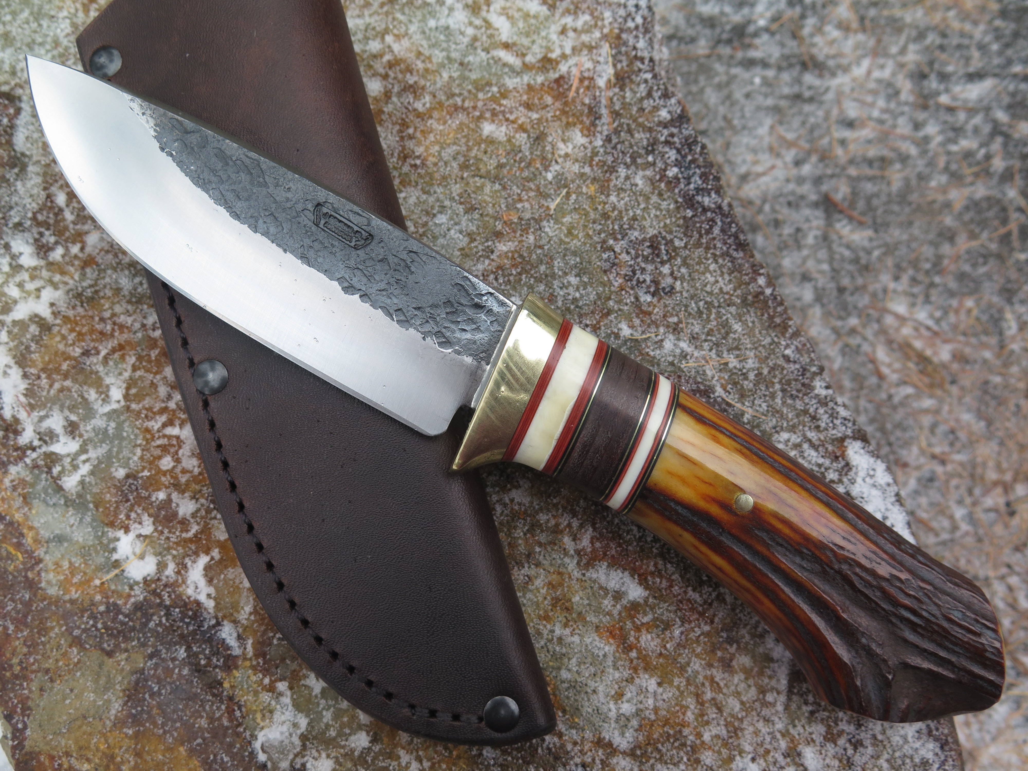 This bad ass Drop Point from Behring Made© is hand forged from 3/16" thick high carbon 01 tool steel and it measures 5" from tip to guard with a razor sharp hollow grind and our hammermark finish. The brass guard is soldered in place above black and maroon fiber, brass, horsehide and two premium mammoth ivory spacers. The handle is a sleek sambar crotch stag number that's pinned through the tang with brass and brings the overall length out to just over 10", plus it comes in a classic leather belt pouch sheath.