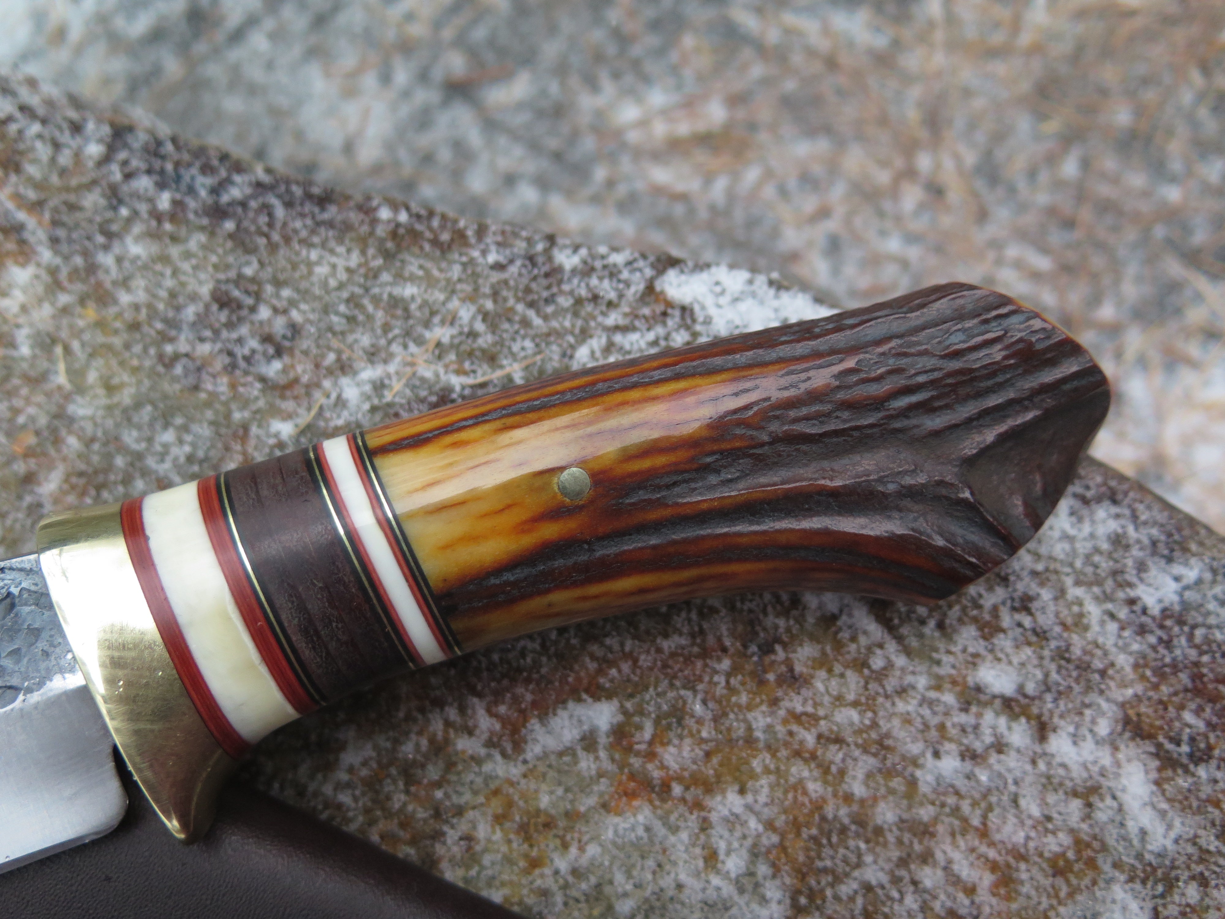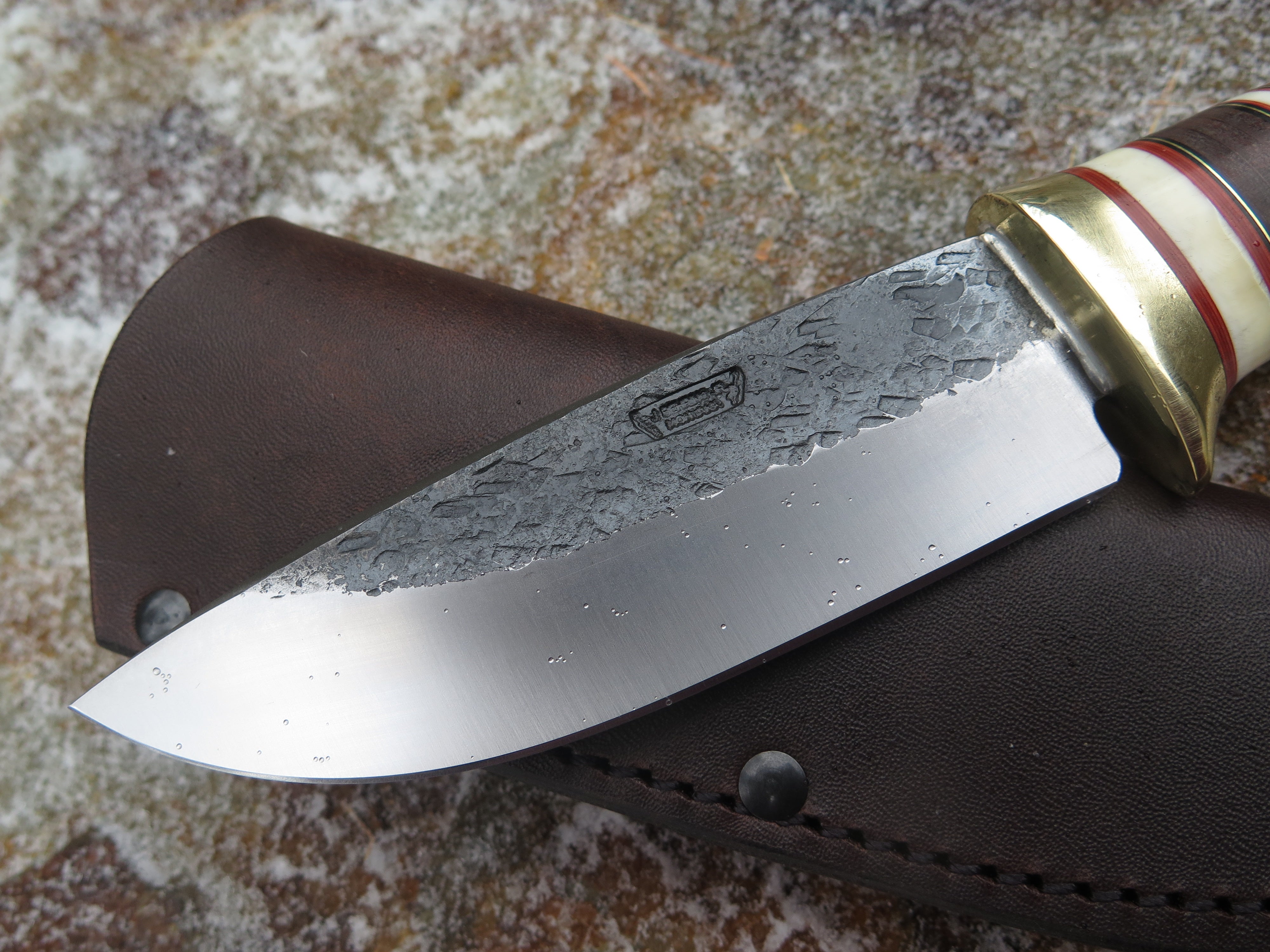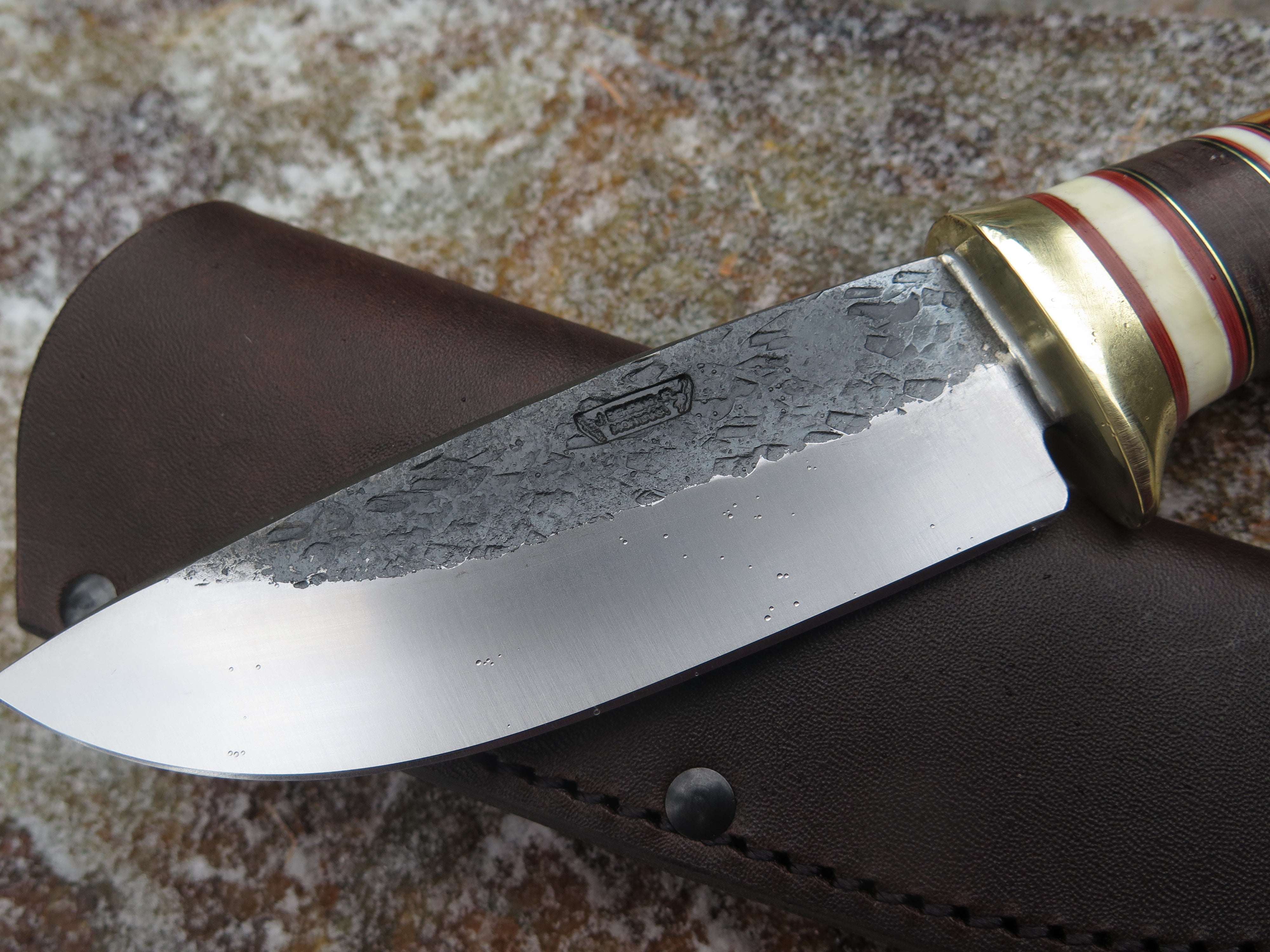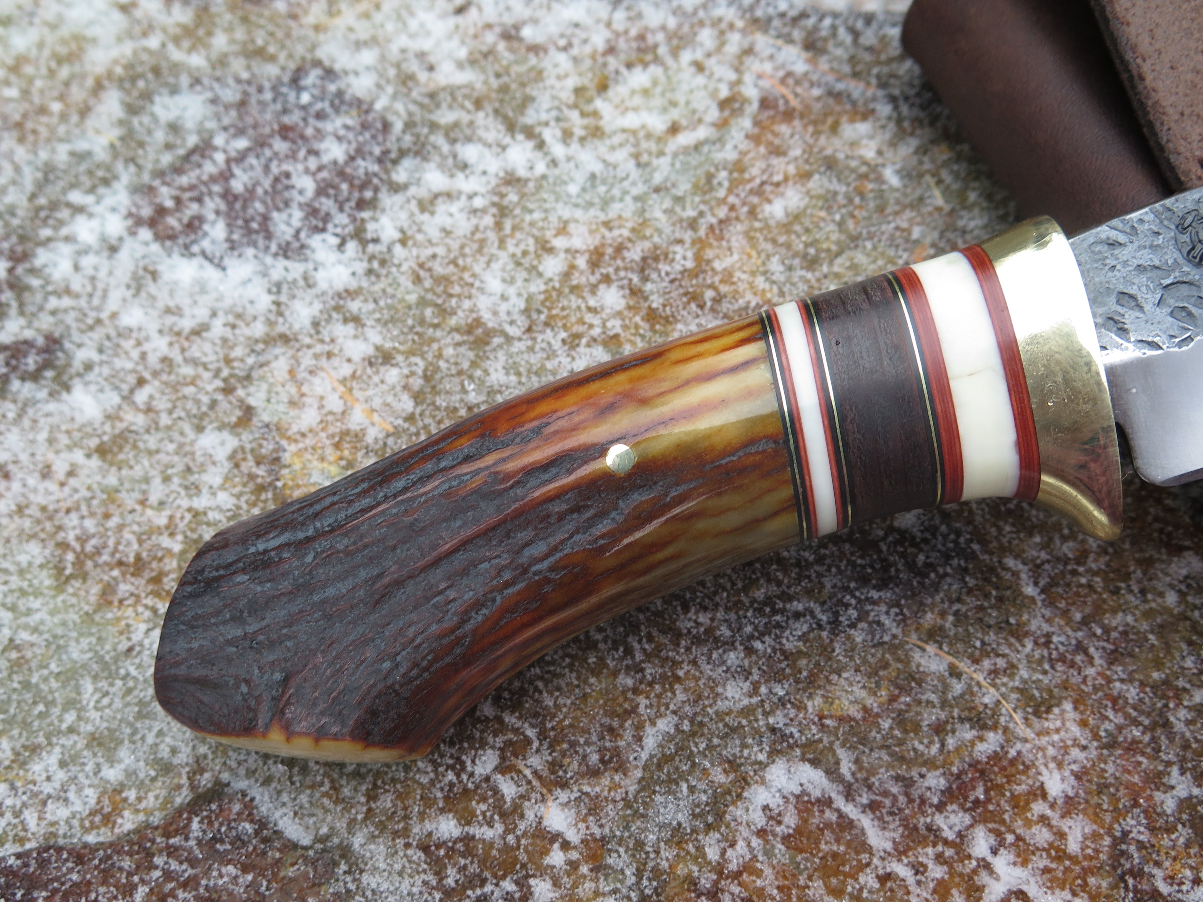 This bad ass Drop Point from Behring Made© is hand forged from 3/16" thick high carbon 01 tool steel and it measures 5" from tip to guard with a razor sharp hollow grind and our hammermark finish. The brass guard is soldered in place above black and maroon fiber, brass, horsehide and two premium mammoth ivory spacers. The handle is a sleek sambar crotch stag number that's pinned through the tang with brass and brings the overall length out to just over 10", plus it comes in a classic leather belt pouch sheath.