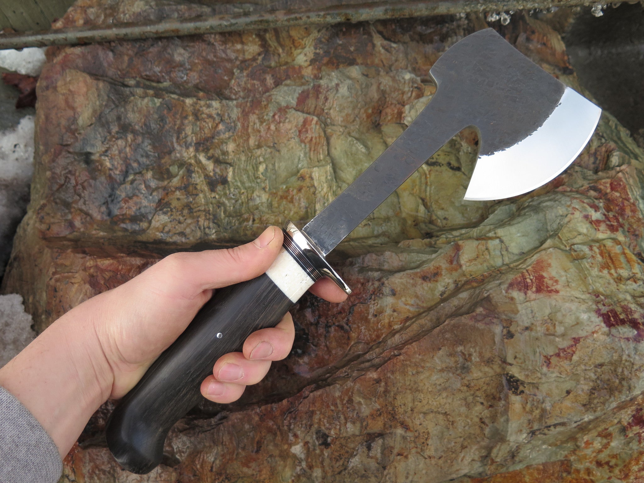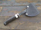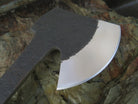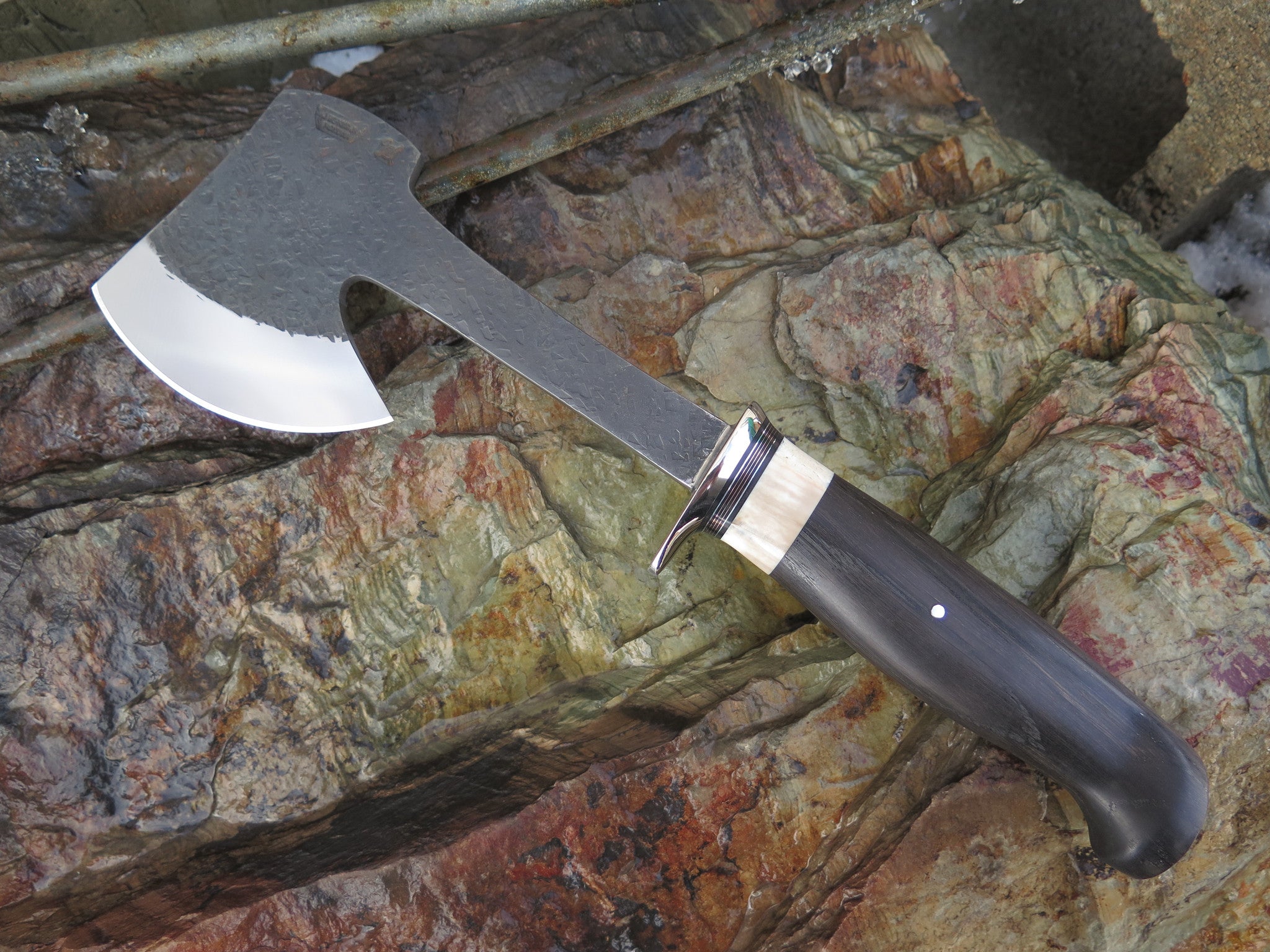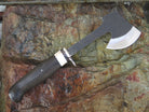 This Behring Made hatchet perfectly combines beauty in function in this work horse of a tool. Hand forged from 1/4" thick high carbon 01 tool steel, the bit measures a 4" cutting edge with a razor sharp hollow grind and a hammermark finish. The nickel silver guard is soldered in place above black, aluminum, copper and fossil walrus ivory spacers. The ancient bog oak handle features a nice fat crow's beak shape and really fills the hand. The overall length measures 14" and it will come in a Glacier Leather sheath.