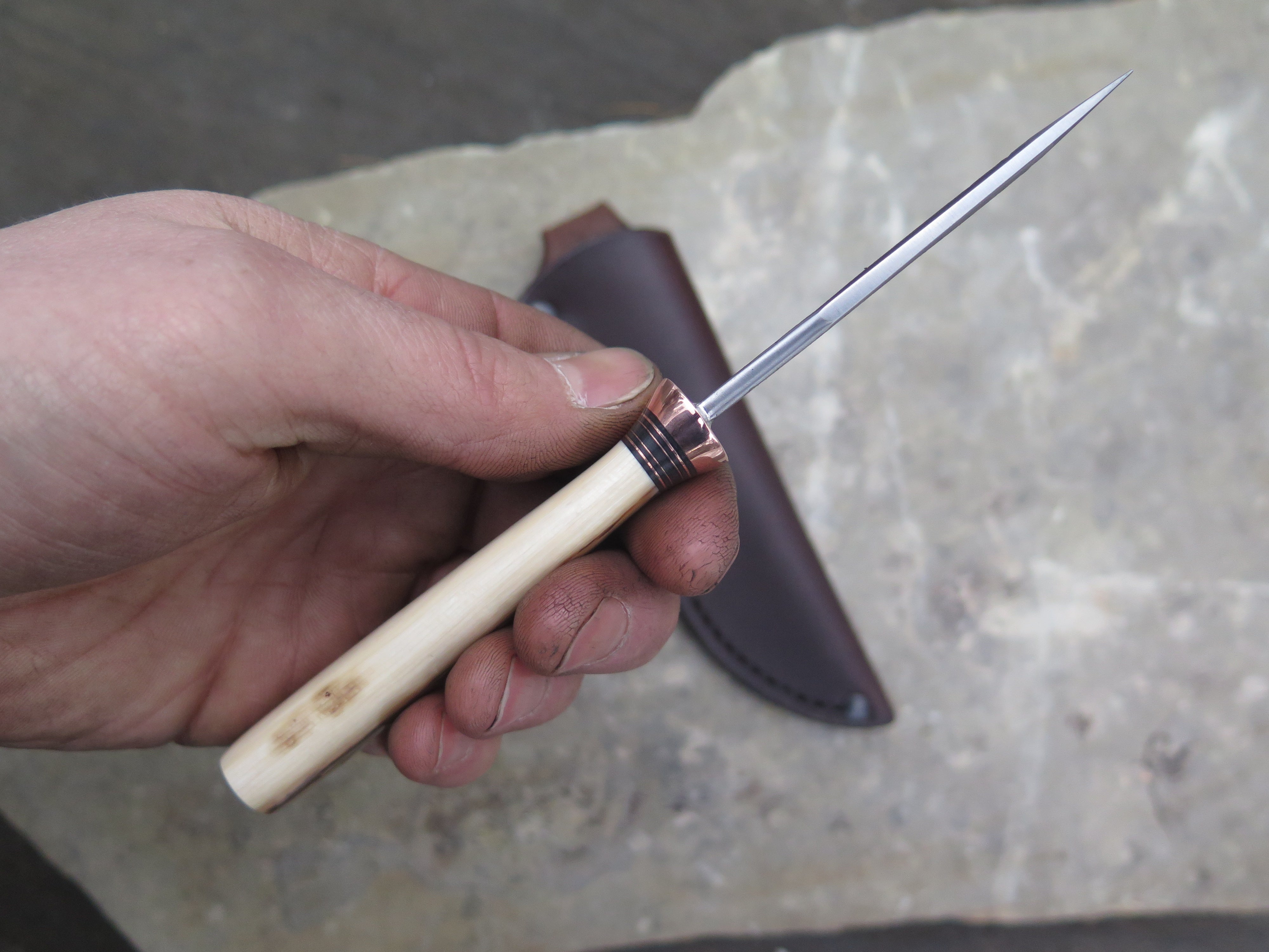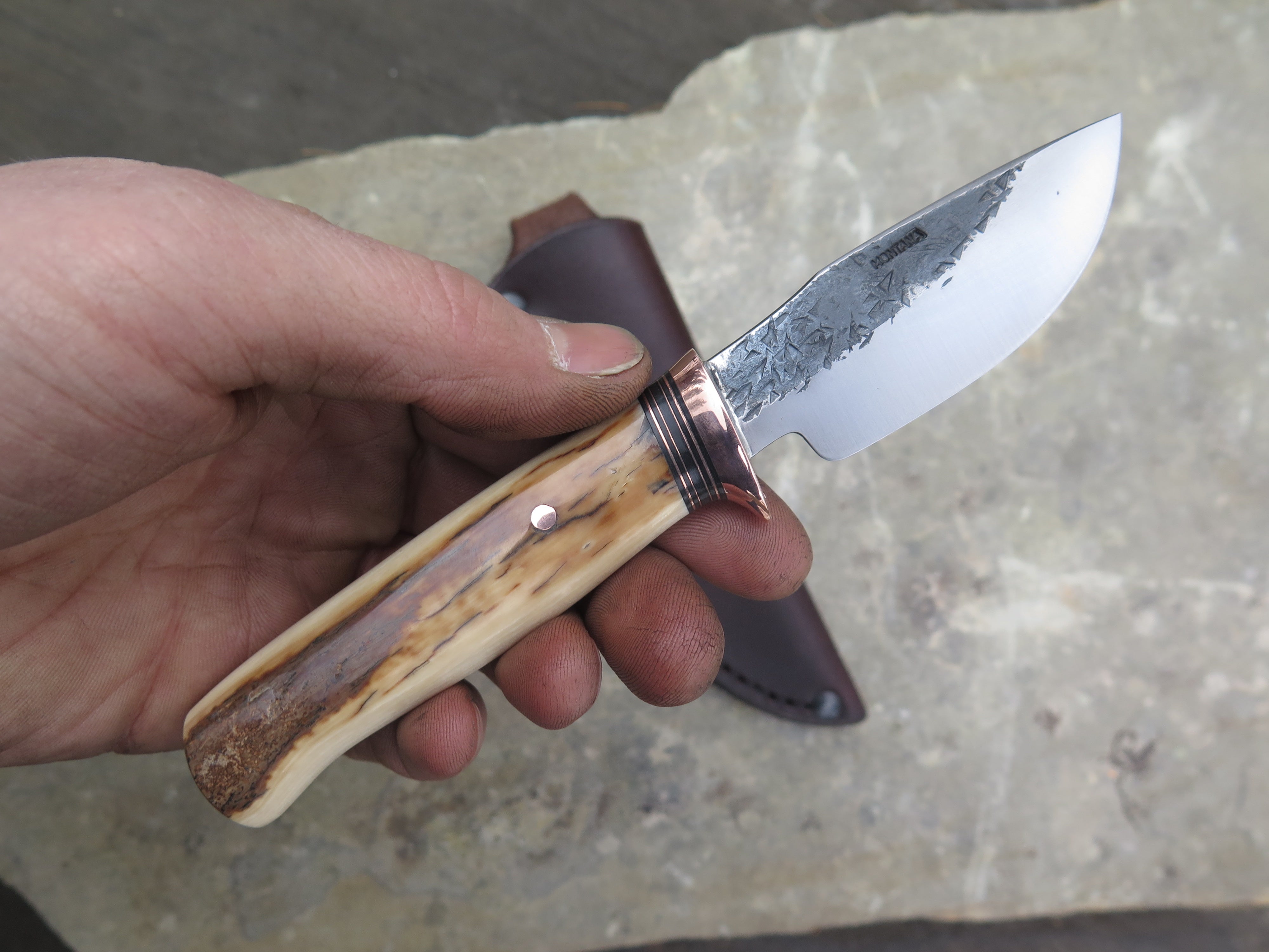 This beautiful Alaskan from Behring Made© is hand forged from 1/8" thick high carbon 01 tool steel and it measures 3" from tip to guard with a razor sharp hollow grind and our hammermark finish. The copper guard is soldered in place above black fiber and copper spacers with an outstanding handle made from ancient mammoth ivory and is pinned through the tang with copper. Overall length measures 6 1/2" and it comes in a classic belt pouch sheath.