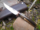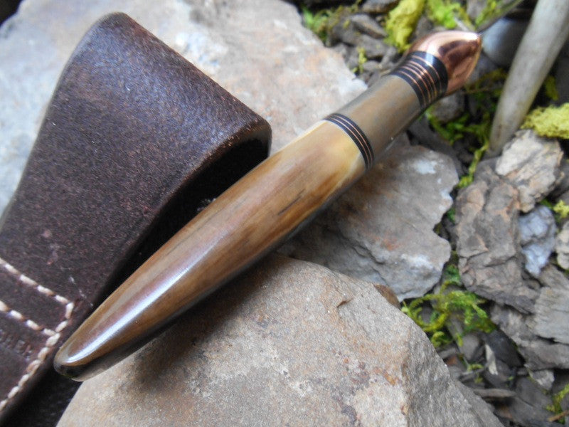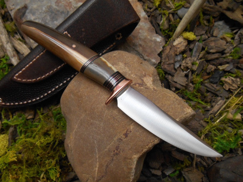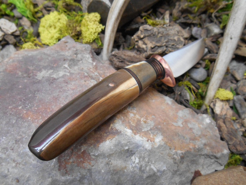 This Behring Made pintail is convex hand forged 01 tool steel, and features a 3 1/4" razor sharp cutting edge. The copper guard is accompanied by black and copper spacers as well as a nice thick walrus ivory spacer. The handle is artifact fossil walrus ivory with a beautiful light cream to dark brown range and brings the overall length of this Behring Made to 7 1/4" and it comes in a brown pouch sheath.
