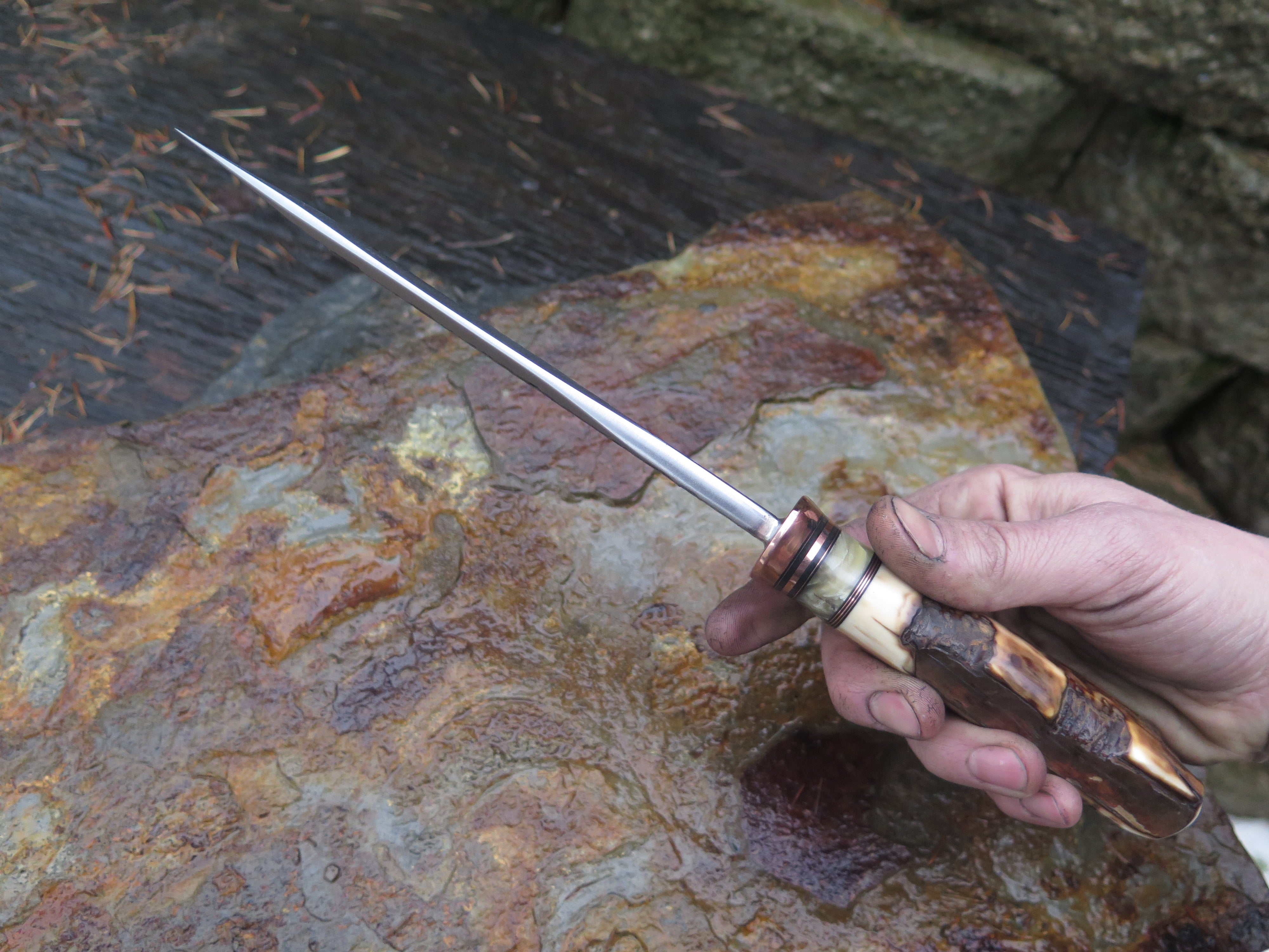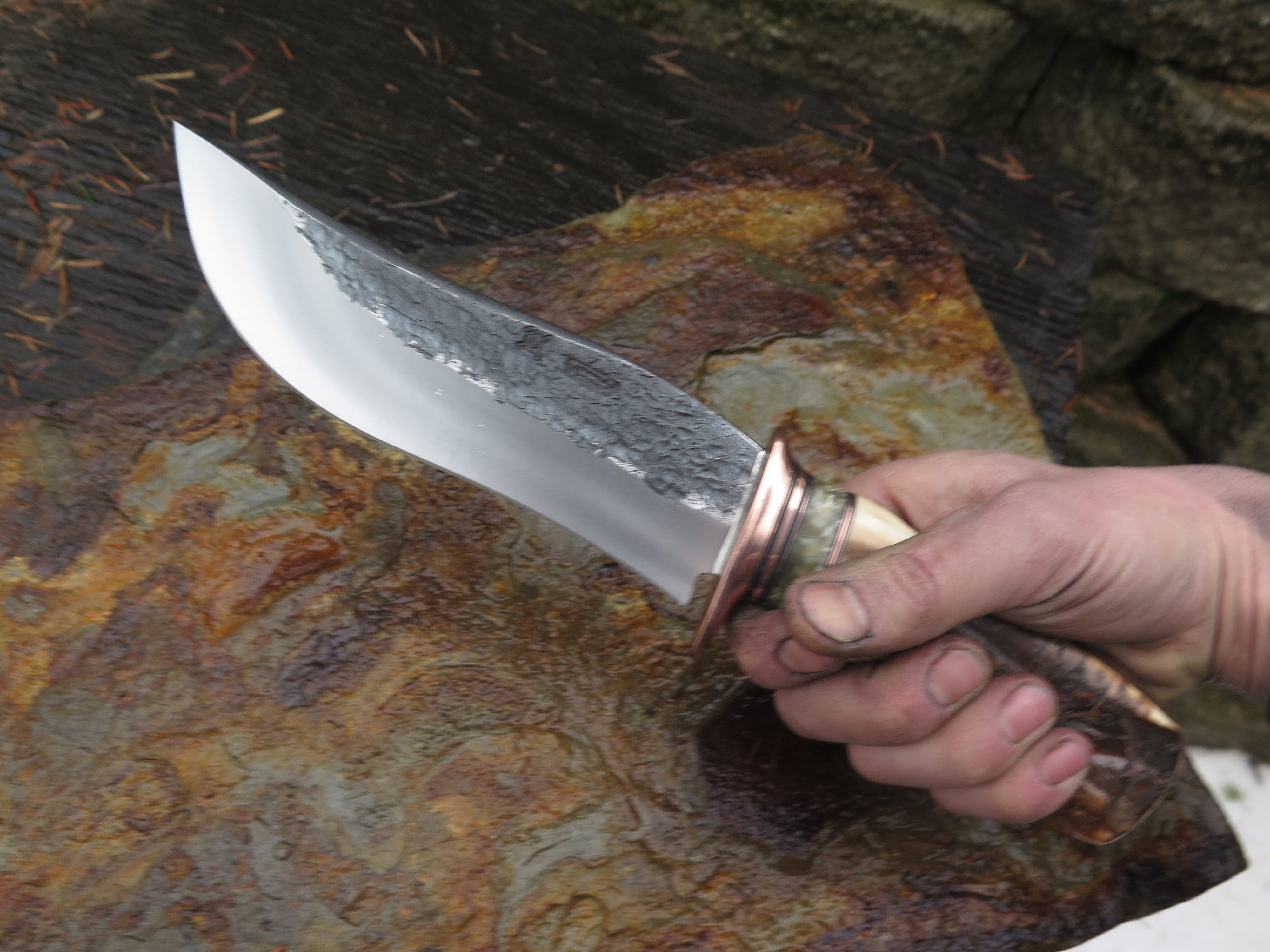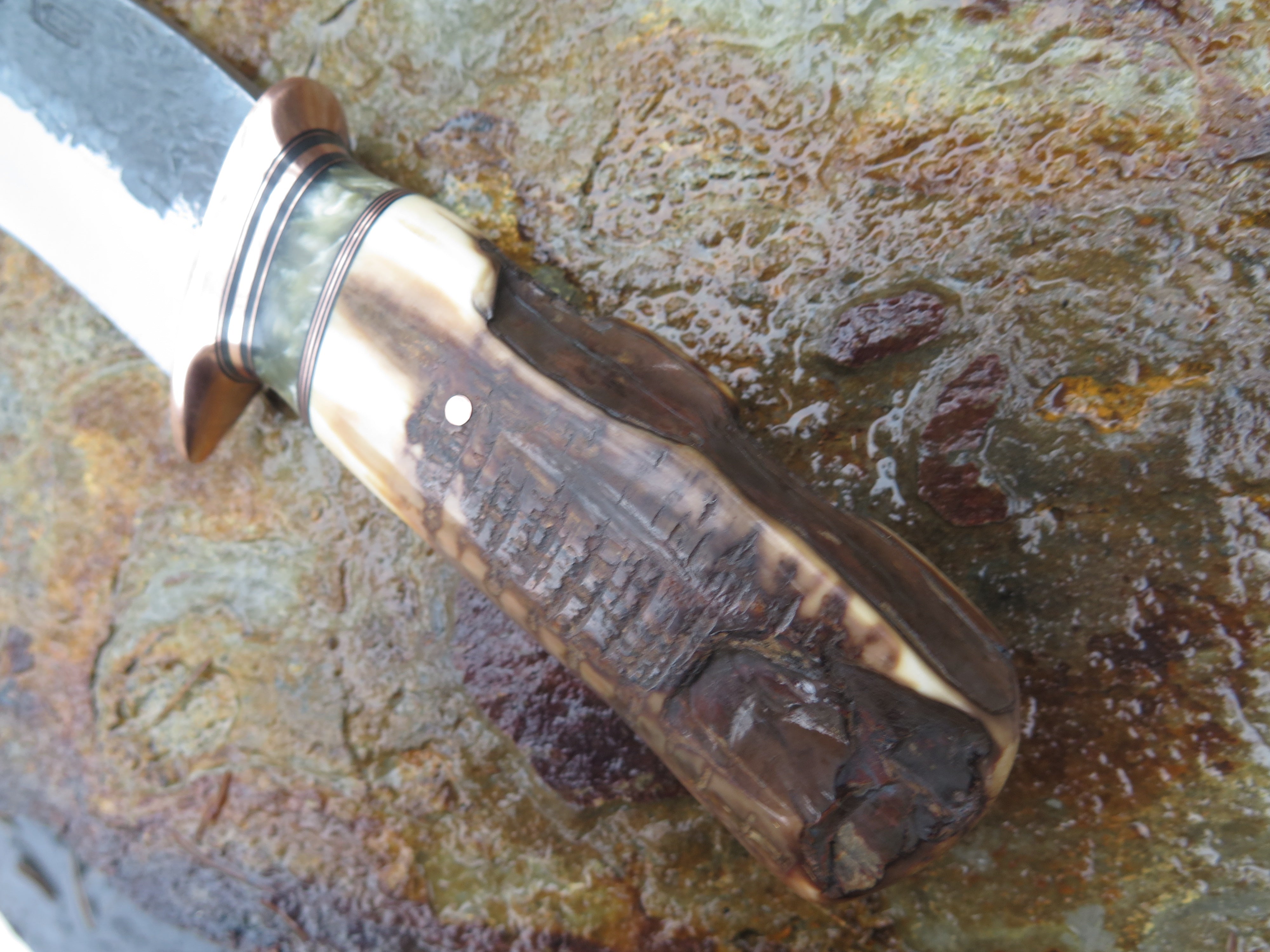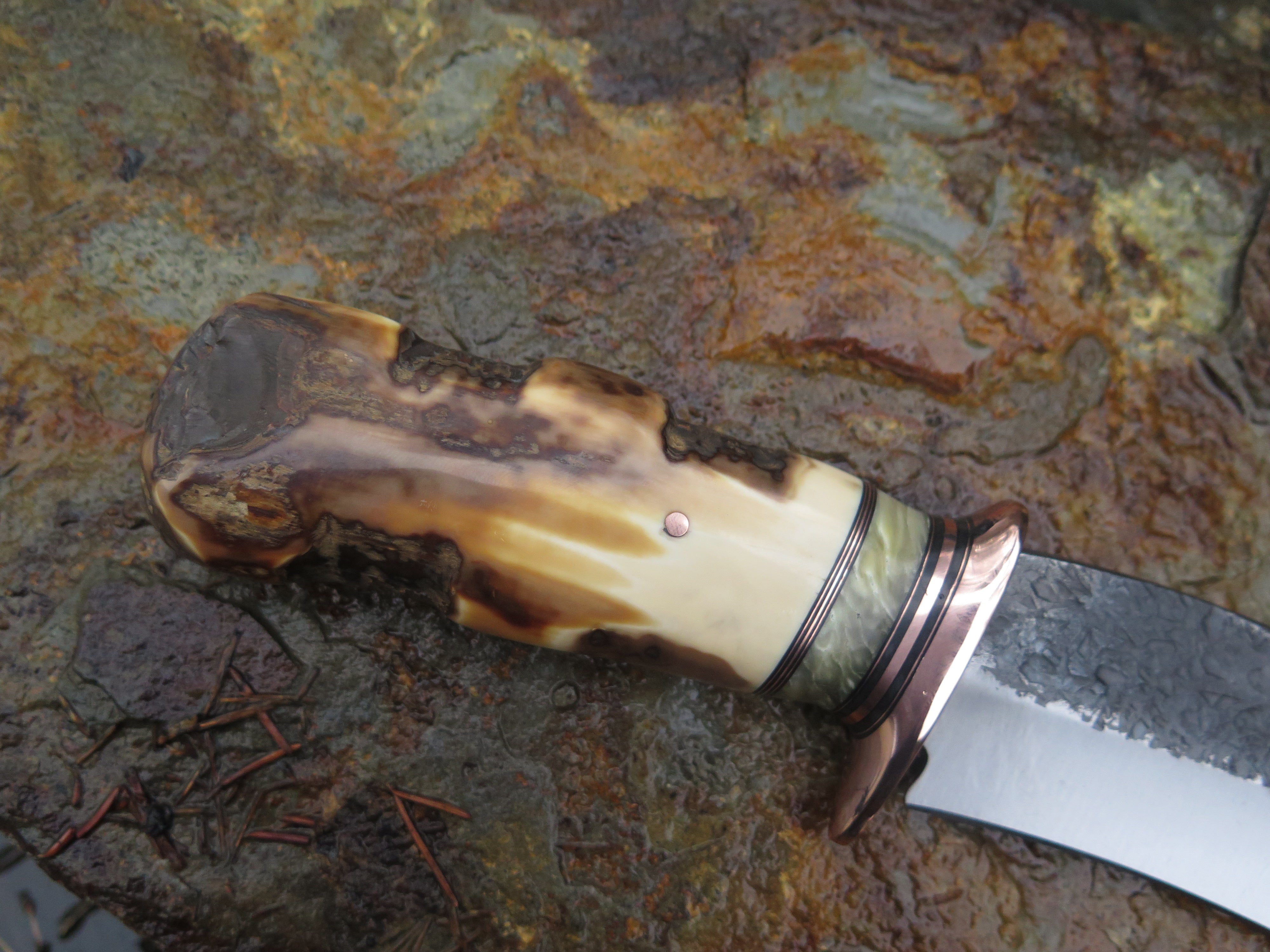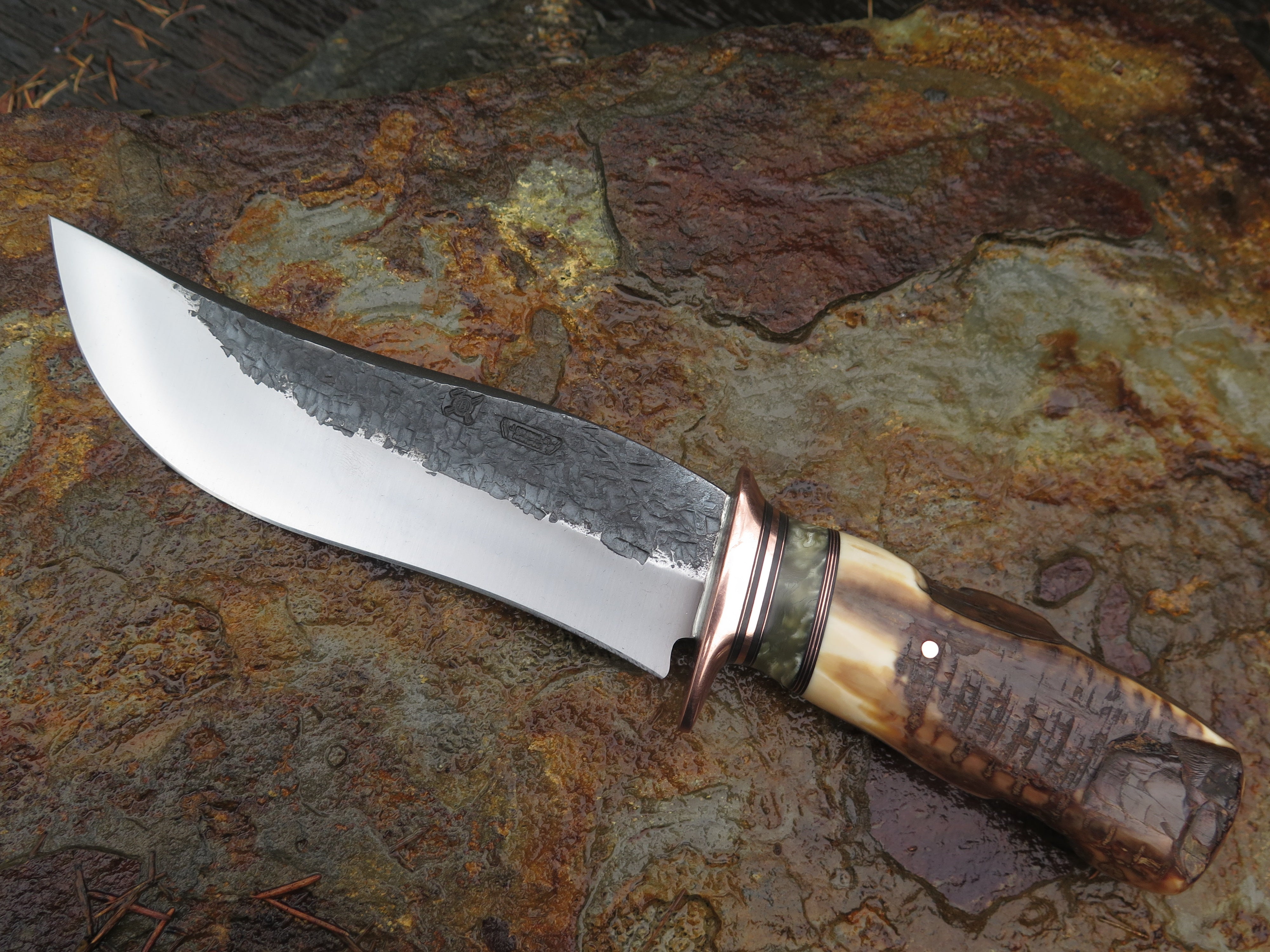 This beastly new Recurve Bowie from Behring Made© is hand forged from 13/64" thick 5160 spring steel and it measures 6 3/4" with a razor sharp hollow grind and our hammermark finish. The copper guard is soldered in place above black fiber, copper and musk ox boss spacers as well as a premium artifact walrus ivory handle that's pinned through the tang with copper. The overall length measures 11 5/8" and this one will come in a custom sheath from Imperial Leather.