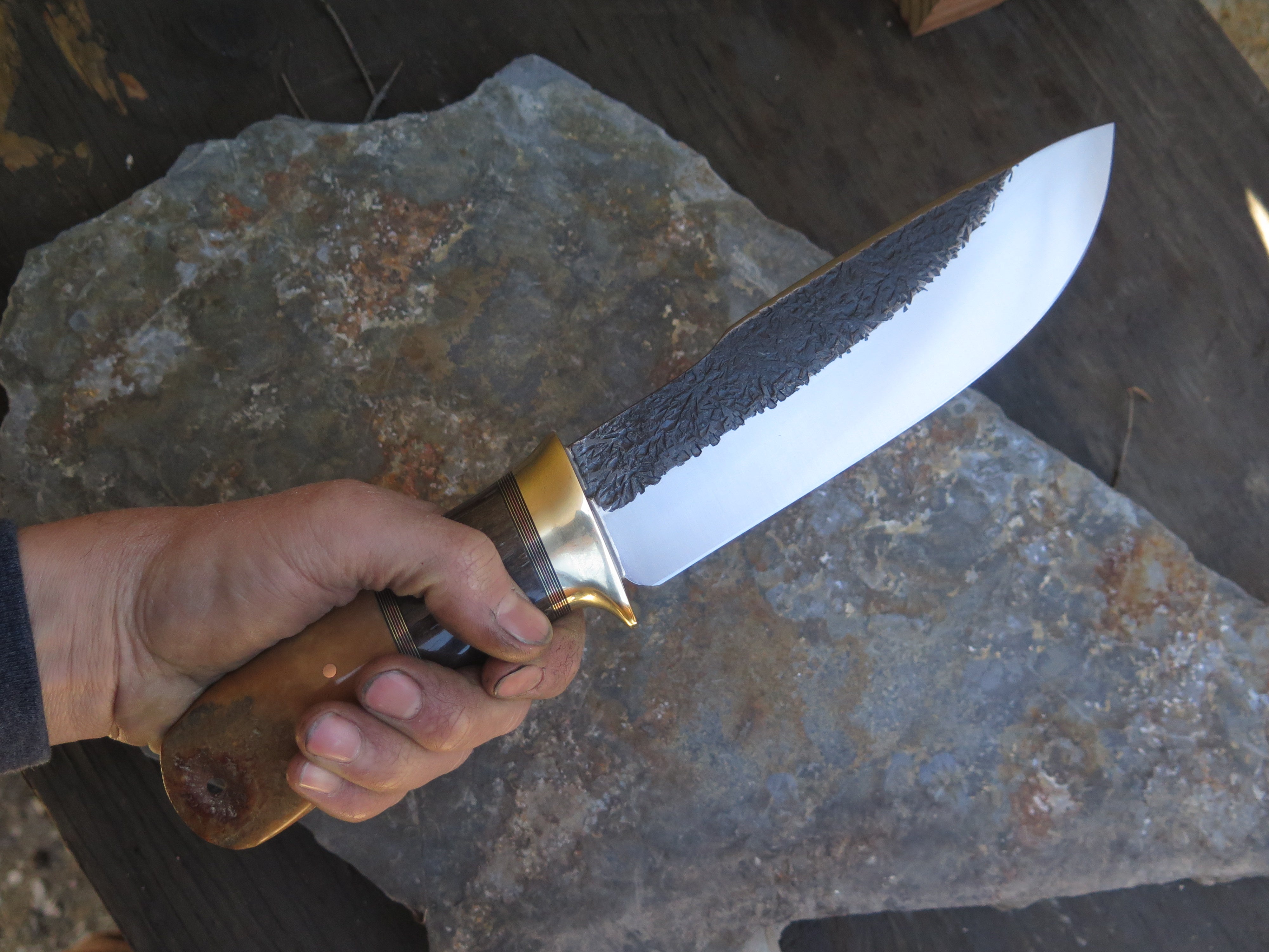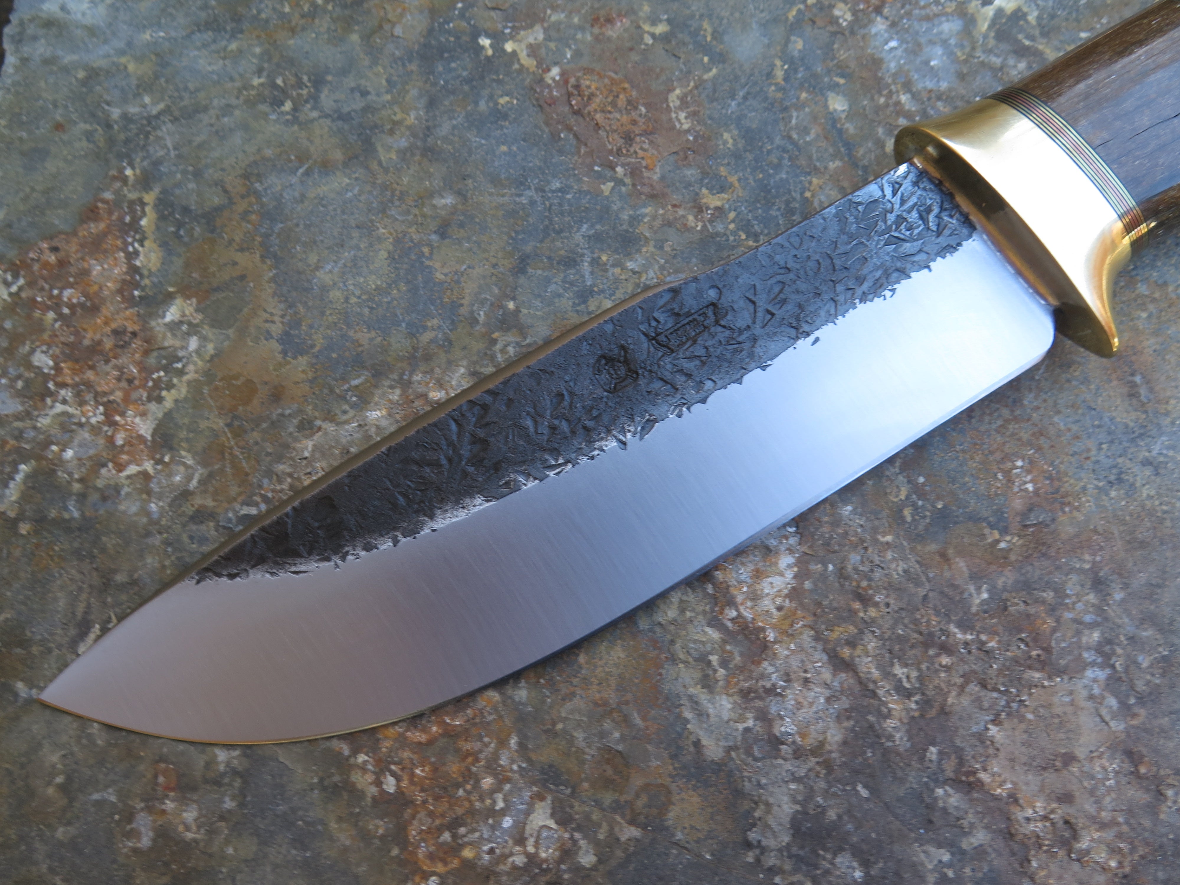 This beastly new Drop Point Camper from Behring Made© is hand forged from 1/4" thick high carbon 01 tool steel and it measures 8" from tip to guard with a razor sharp hollow grind and our hammermark finish. The large brass bolster is soldered in place above black fiber, brass and copper spacers amid a two-piece handle construction of fossilized ancient mammoth rib as well as an artifact walrus ivory fishing net weight which is pinned through the tang with brass. The overall length measures 13 1/4" and it will come in a custom sheath from Warlander Leather.