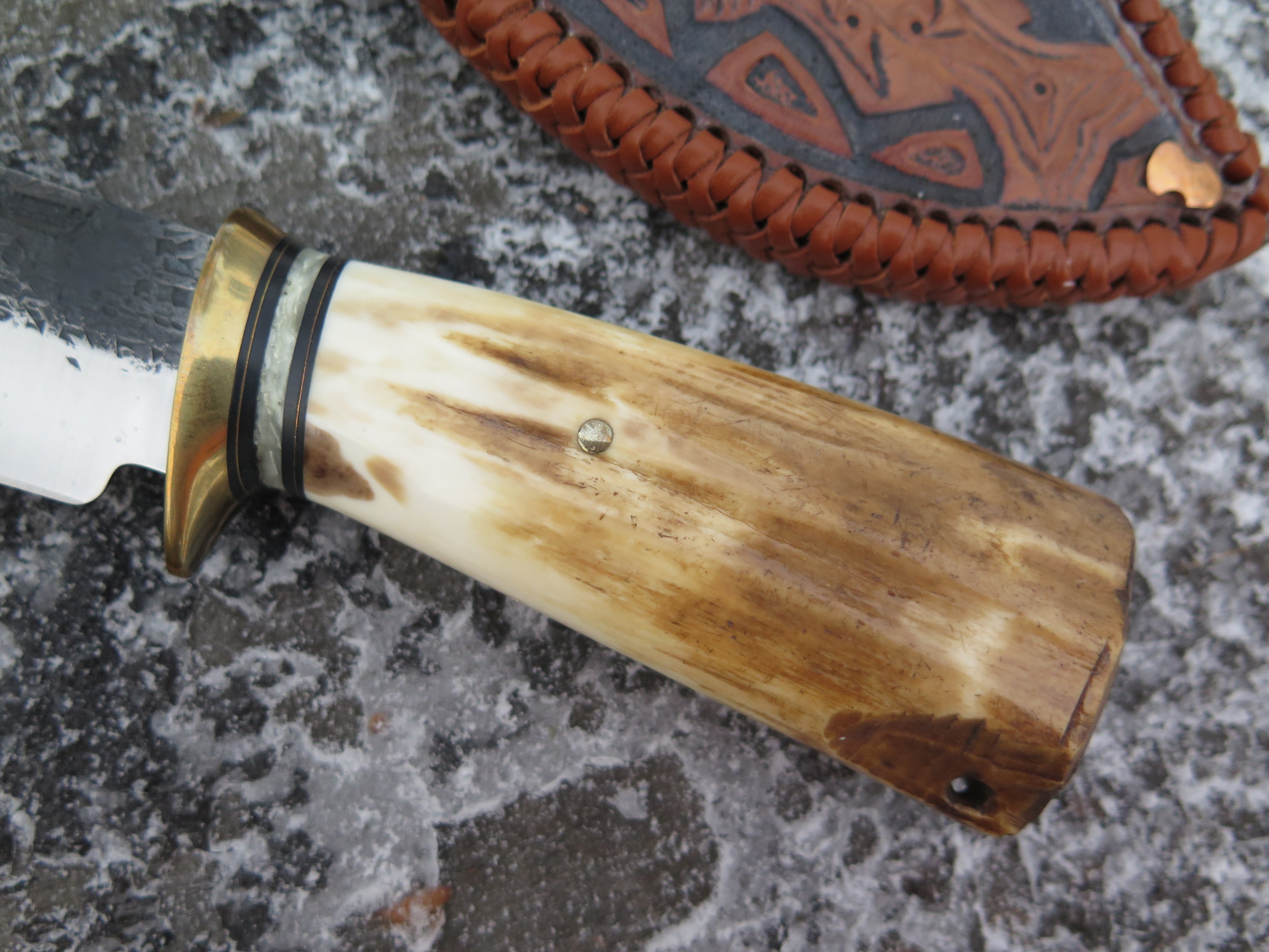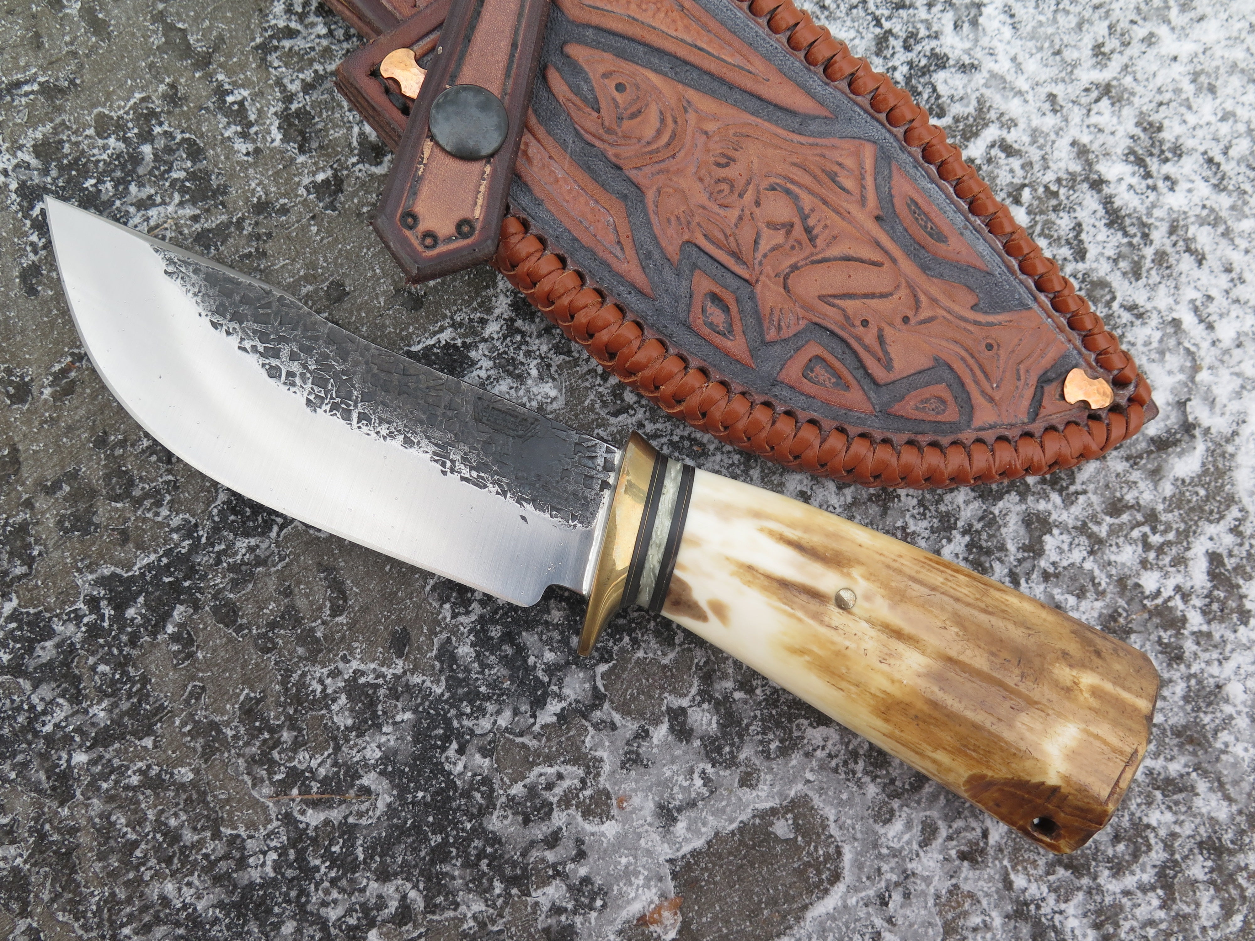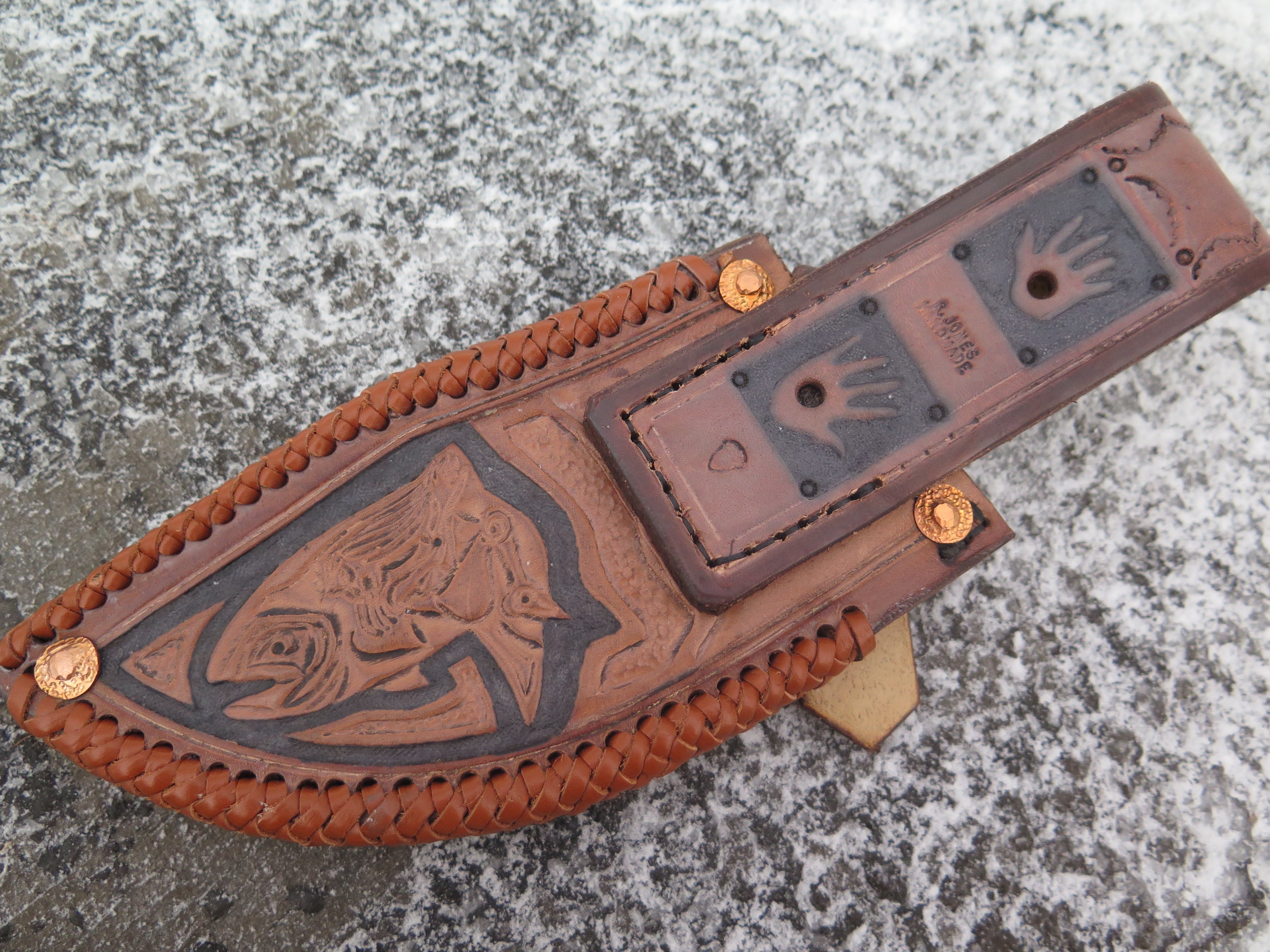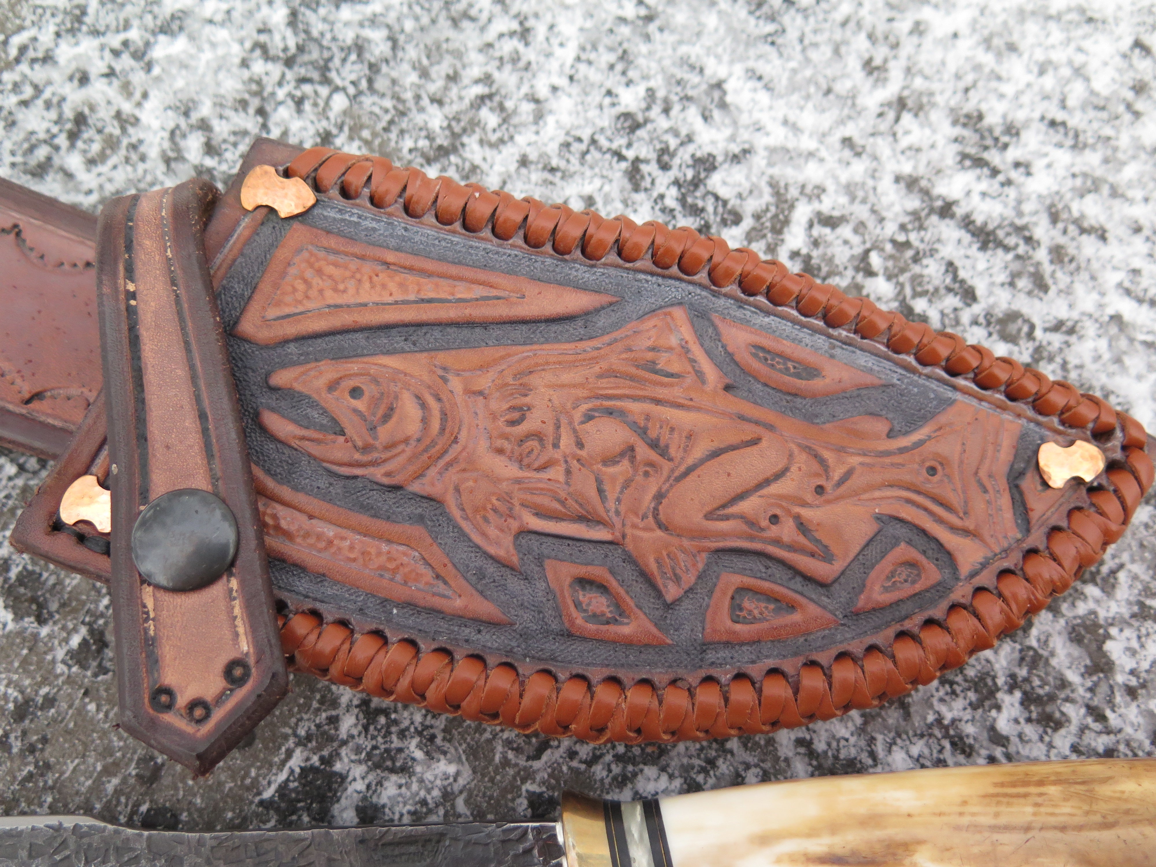 Nothing beats a Behring Made© blade, and the handle on this incredible new Woodcraft is like nothing you've seen or held before. It's an artifact walrus tusk that was used by Inuit Alaskan tribes as a primitive weight for their fishing nets with one of the holes still retained where it would be fastened- plus the range of colors is outstanding from light creams to earthy browns. The blade is hand forged from 3/16" thick high carbon 01 tool steel and measures 5 1/4" from tip to guard with a razor sharp hollow grind and our hammermark finish. The brass guard is soldered in place above black fiber, brass and musk ox boss spacers that pay a perfect compliment to the walrus below. The overall length measures just under 10" and we sent this one out to Mudbone for an over-the-top custom sheath. He drew inspiration from Native carvings depicting the early shamanistic interpretations of they believed to be man's connection to his brother the salmon. On the back strap Mudbone included two hands that signify one cannot retain all of life's blessings, in which excess falls through the holes for others. *PLEASE CONTACT TO ORDER