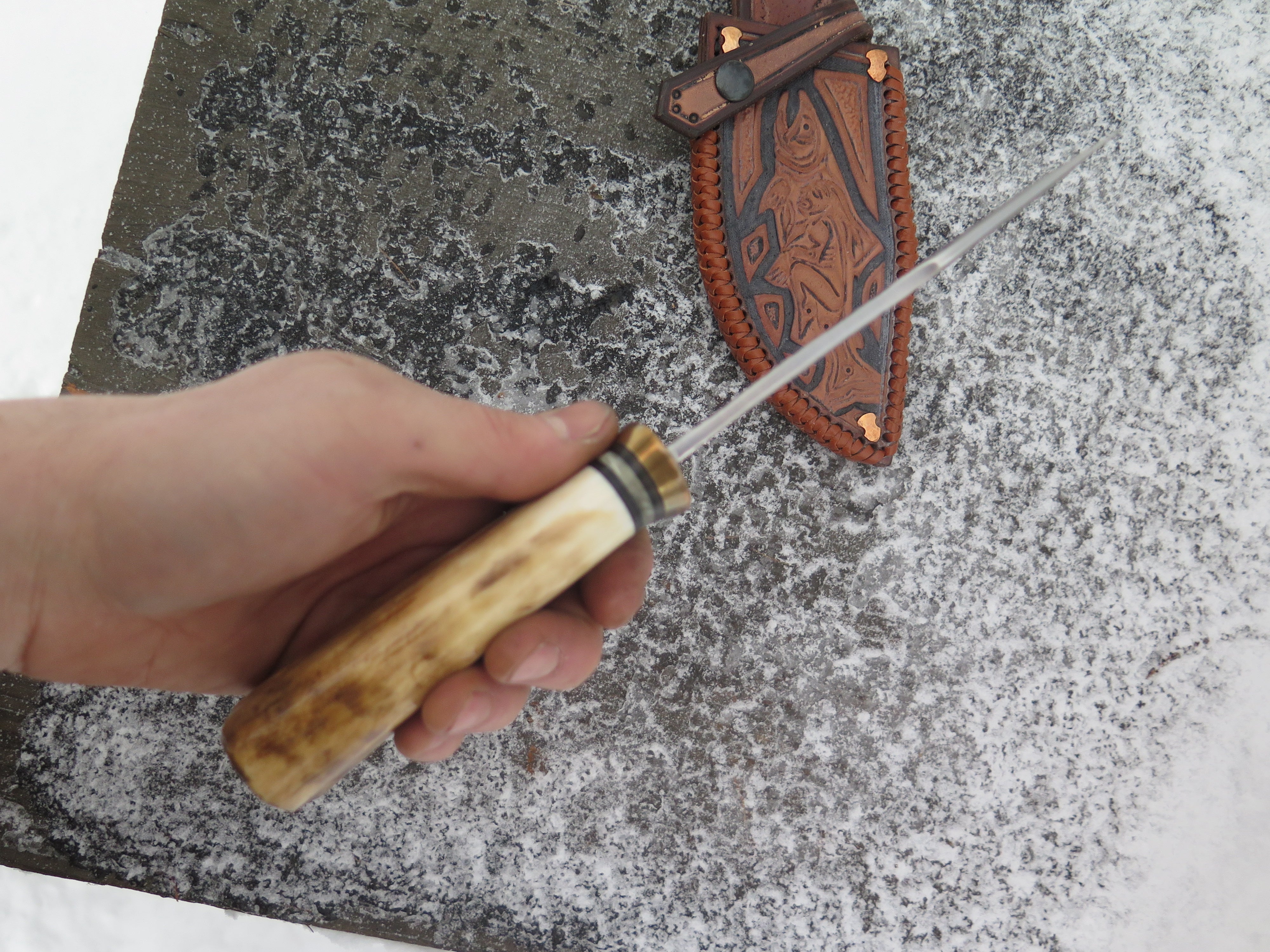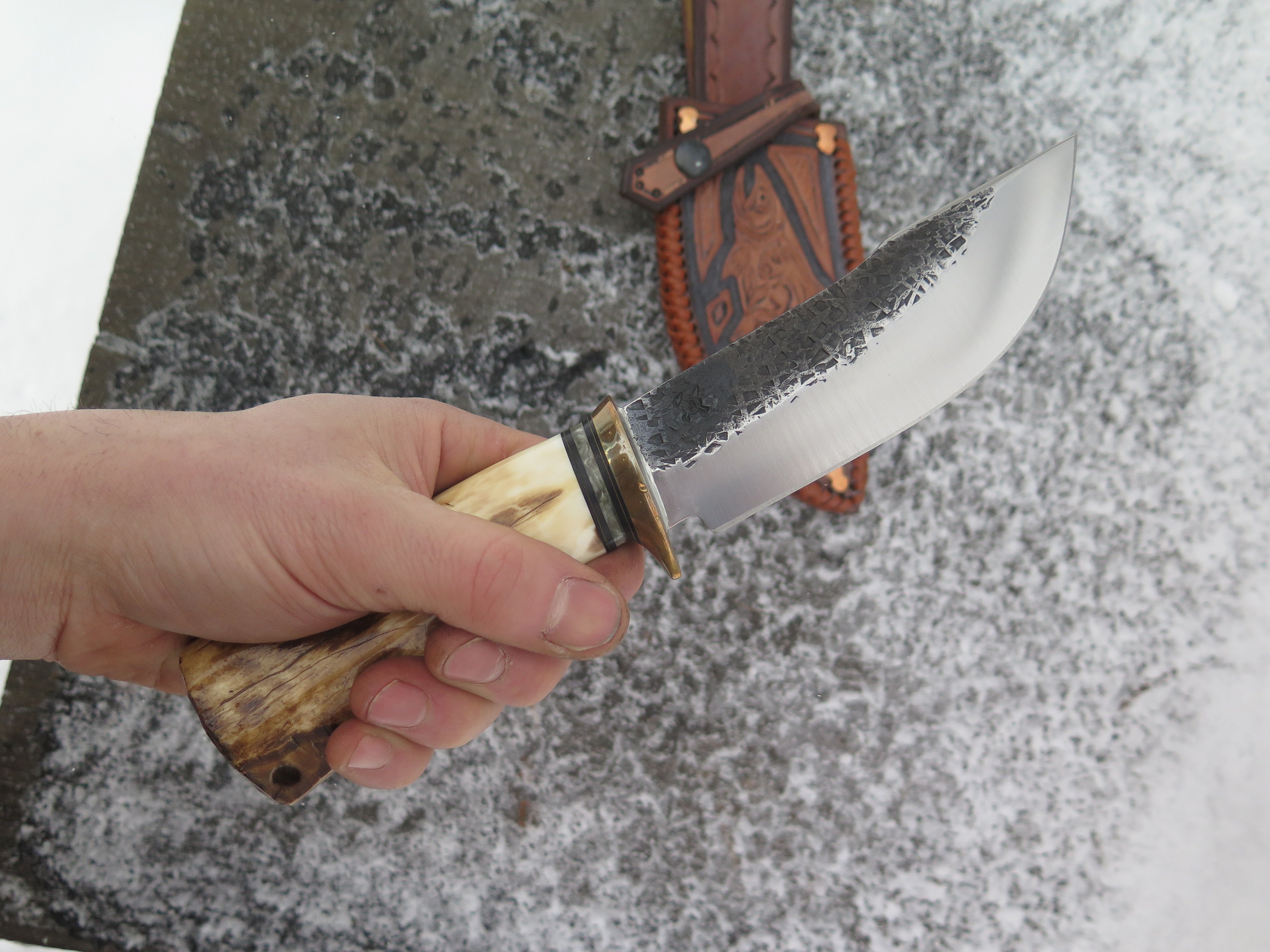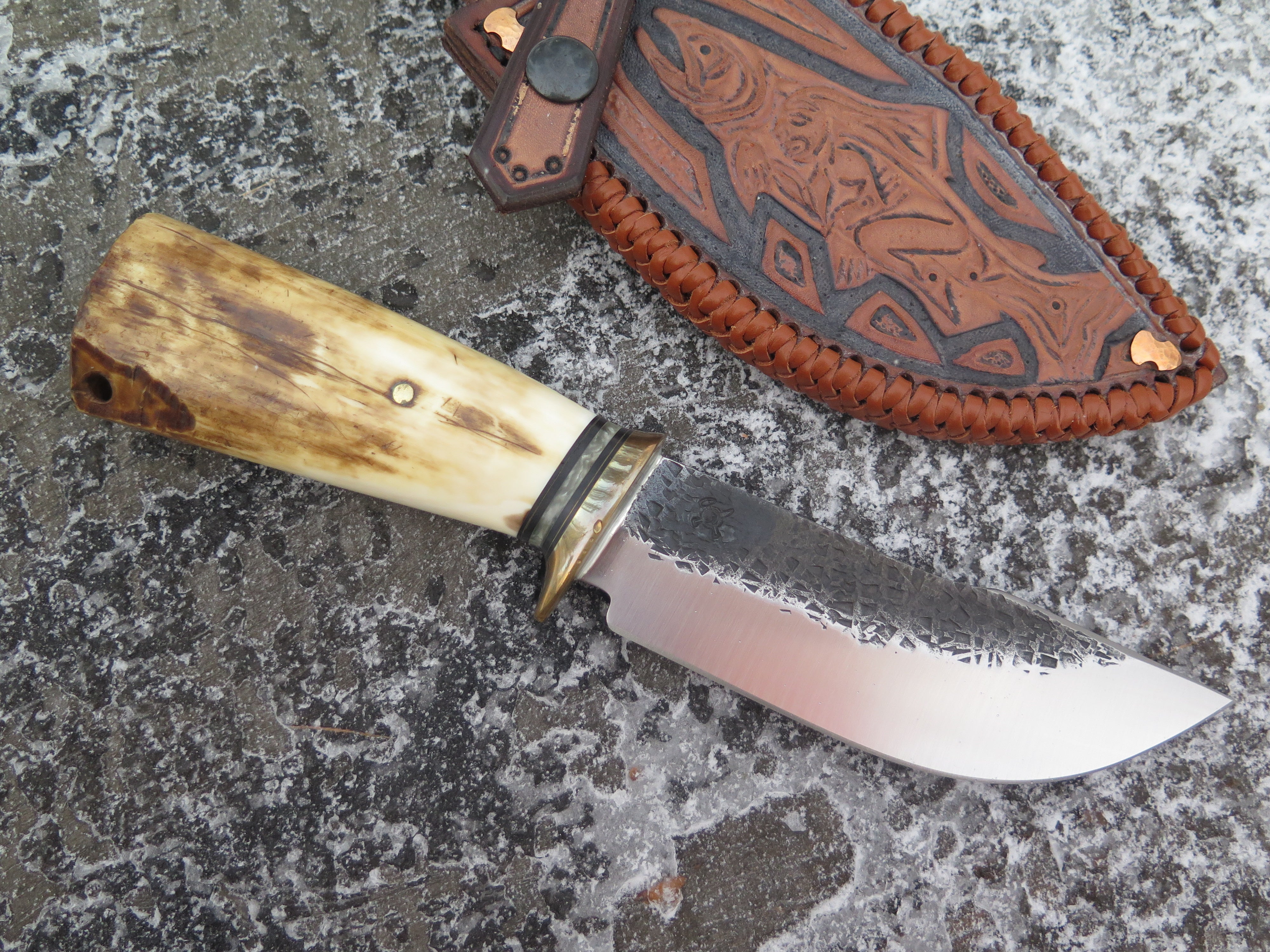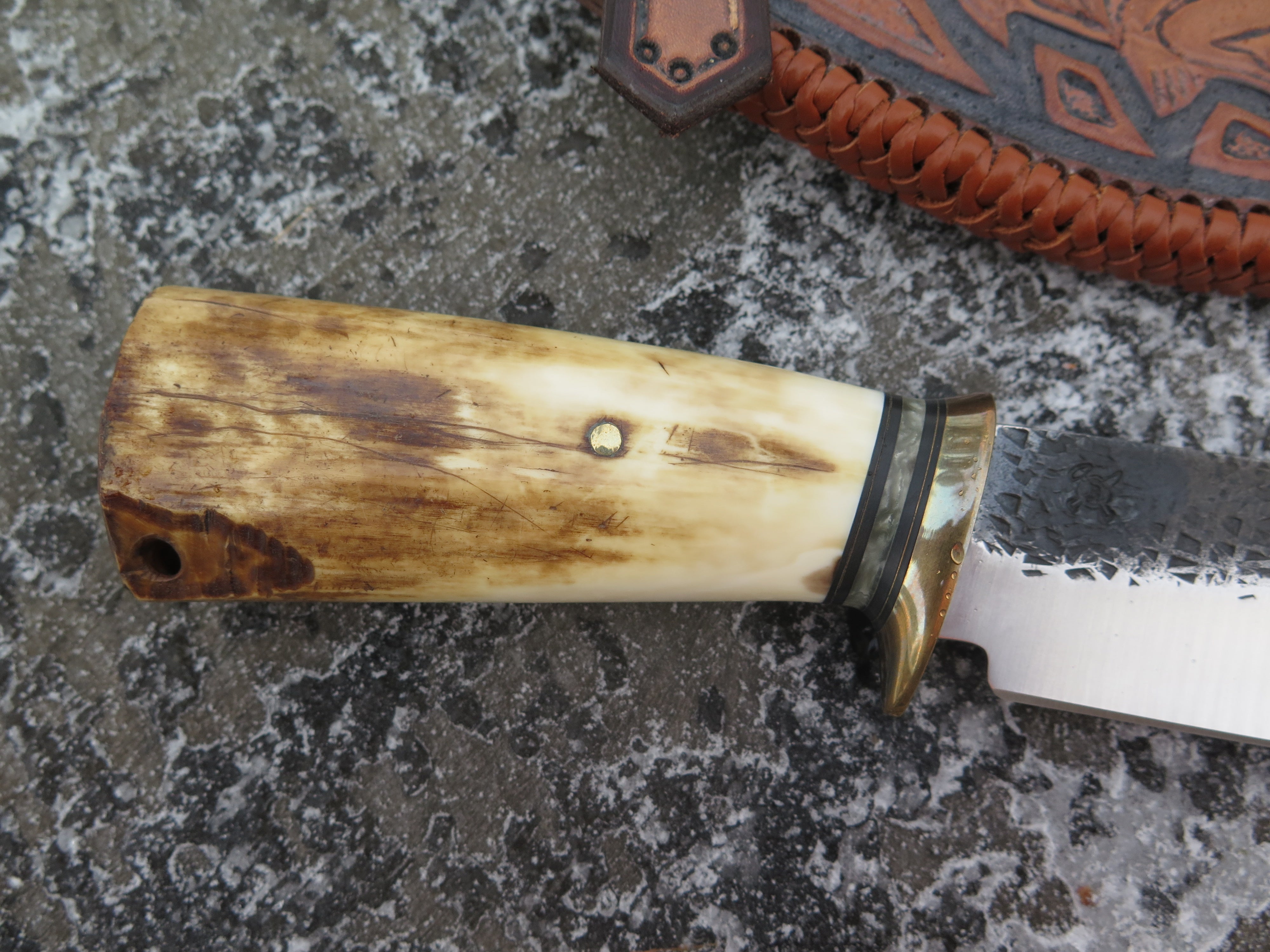 Nothing beats a Behring Made© blade, and the handle on this incredible new Woodcraft is like nothing you've seen or held before. It's an artifact walrus tusk that was used by Inuit Alaskan tribes as a primitive weight for their fishing nets with one of the holes still retained where it would be fastened- plus the range of colors is outstanding from light creams to earthy browns. The blade is hand forged from 3/16" thick high carbon 01 tool steel and measures 5 1/4" from tip to guard with a razor sharp hollow grind and our hammermark finish. The brass guard is soldered in place above black fiber, brass and musk ox boss spacers that pay a perfect compliment to the walrus below. The overall length measures just under 10" and we sent this one out to Mudbone for an over-the-top custom sheath. He drew inspiration from Native carvings depicting the early shamanistic interpretations of they believed to be man's connection to his brother the salmon. On the back strap Mudbone included two hands that signify one cannot retain all of life's blessings, in which excess falls through the holes for others. *PLEASE CONTACT TO ORDER