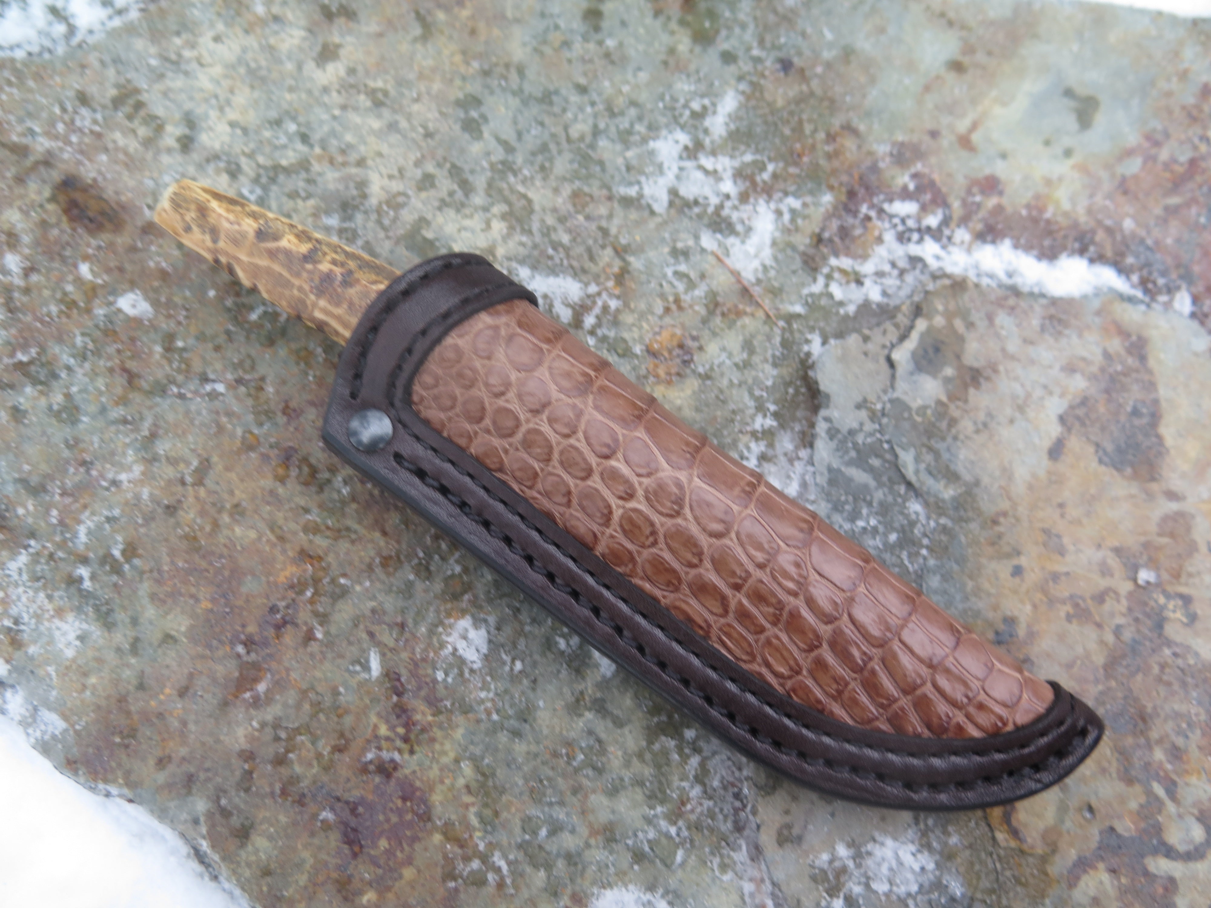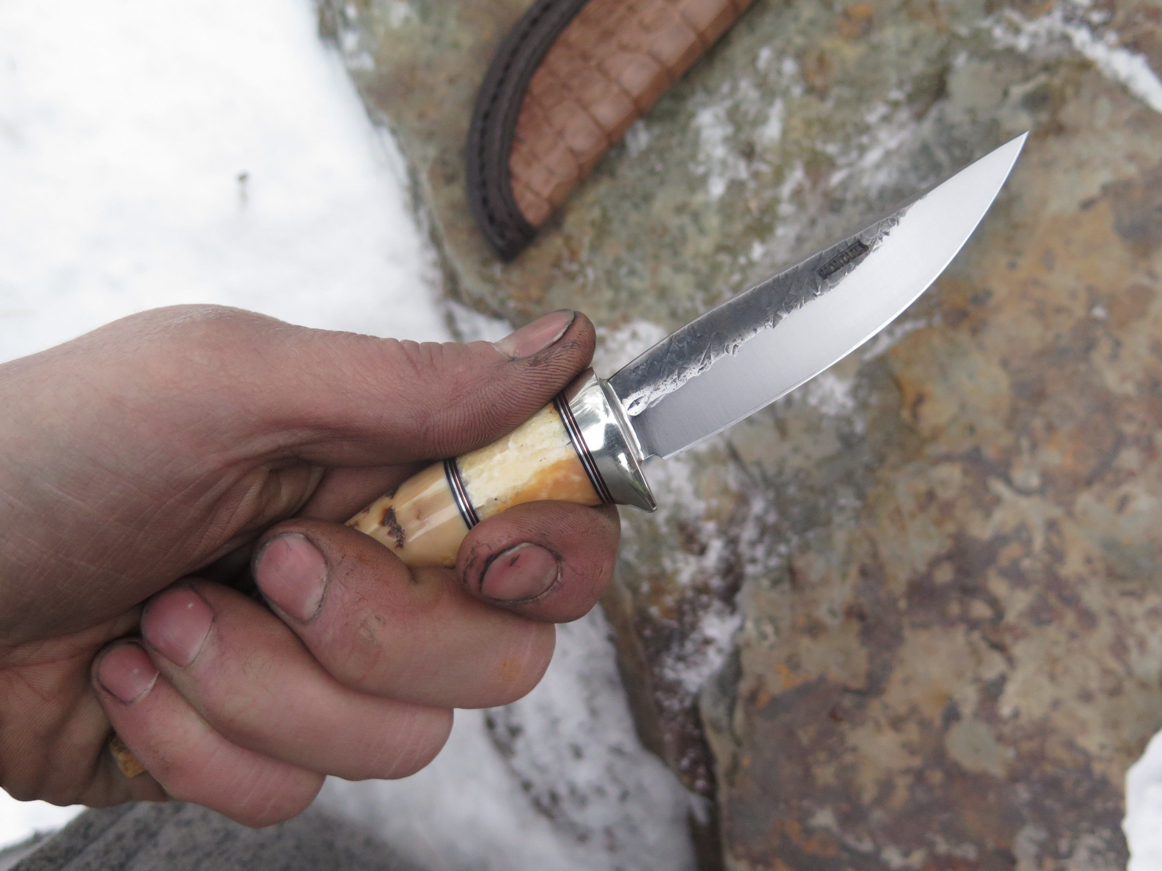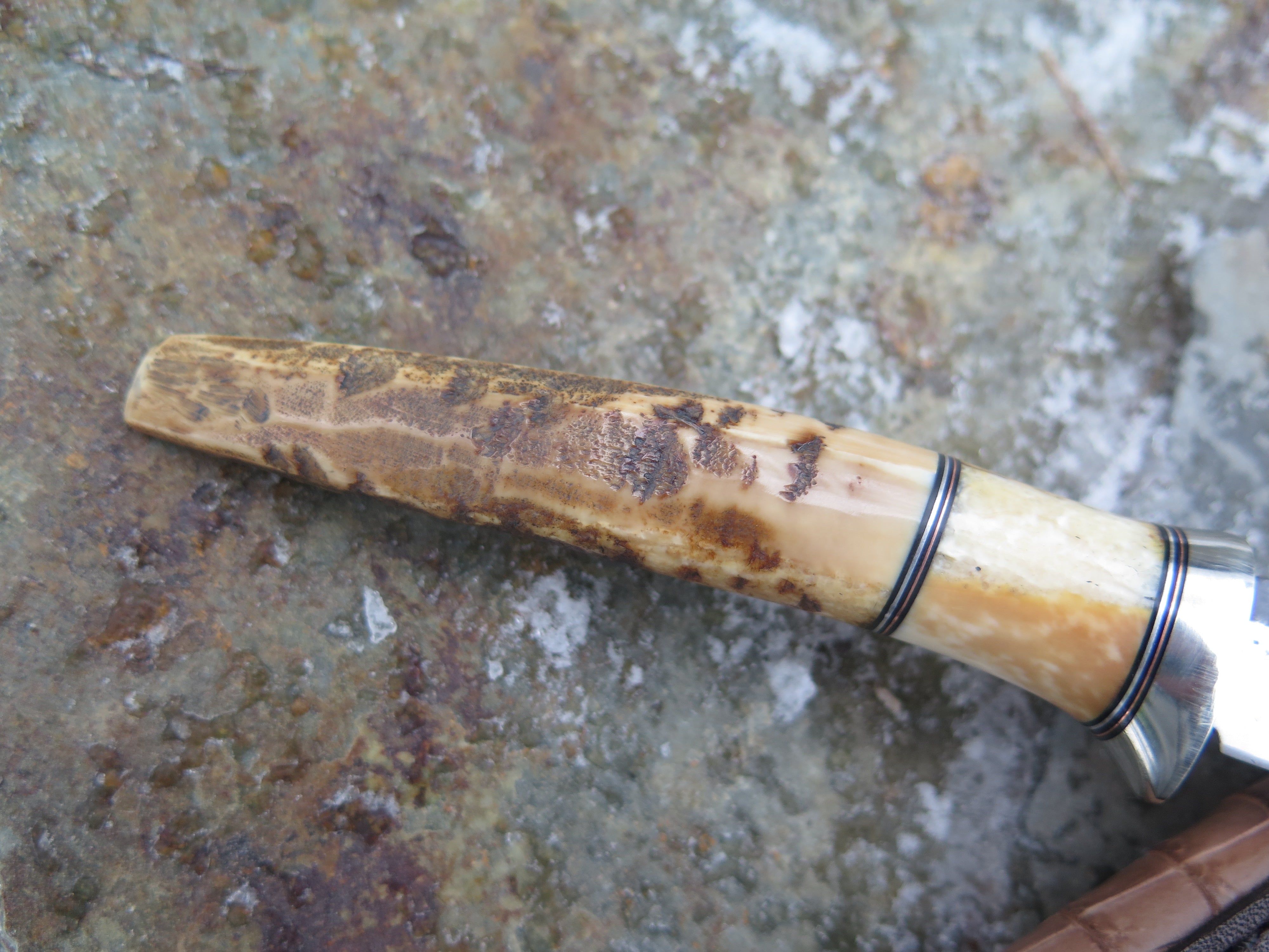 This incredible new Pintail from Behring Made© is hand forged from 1/8" thick high carbon 01 tool steel and it measures 3 1/4" from tip to guard with a razor sharp hollow grind and our hammermark finish. The nickel silver guard is soldered in place above black fiber, copper, aluminum and fossil walrus ivory spacers above an artifact walrus ivory handle with a range of light creams to deep browns. Overall length measures 7 1/2" and it comes in an exotic caiman inlay.