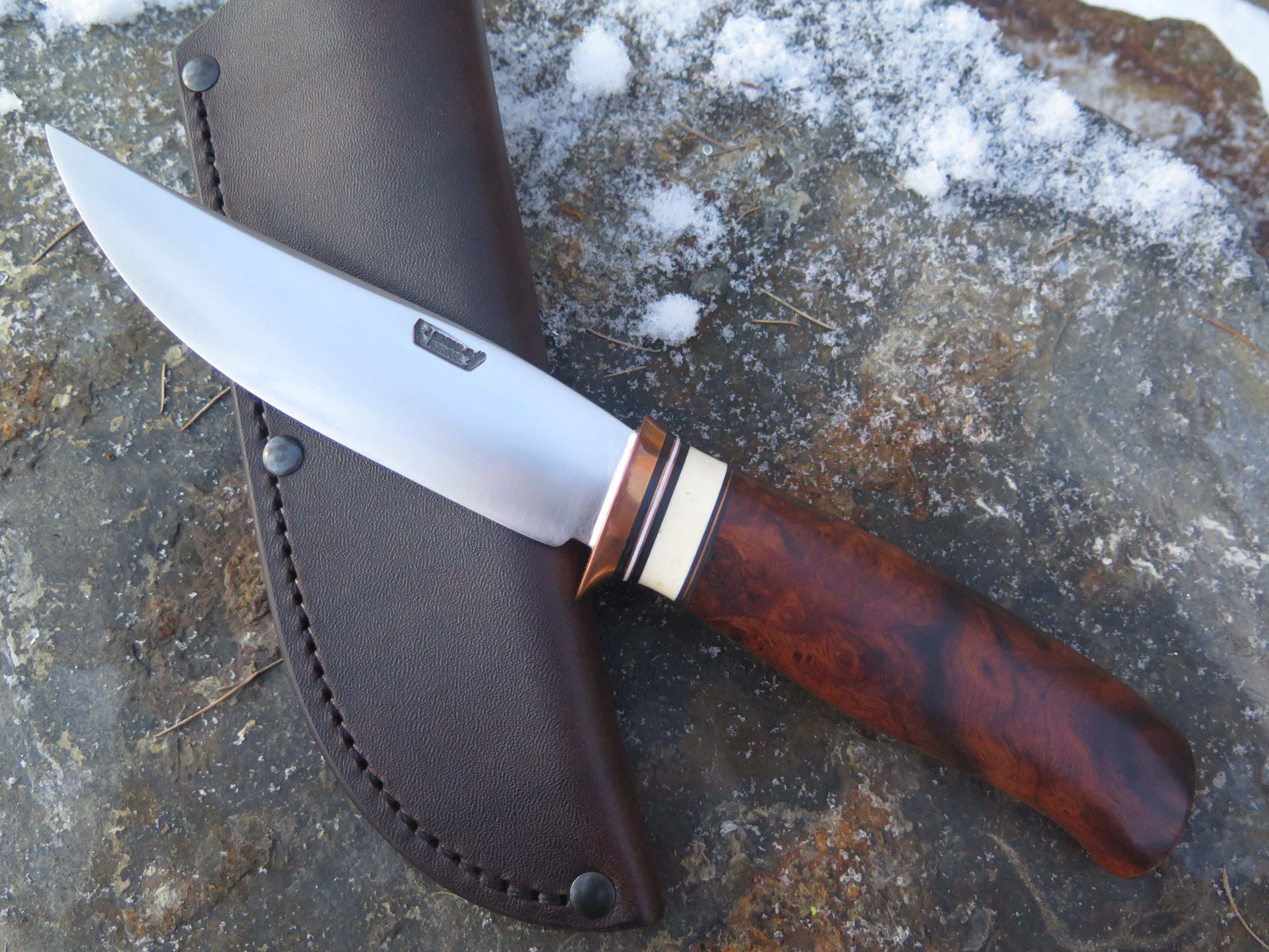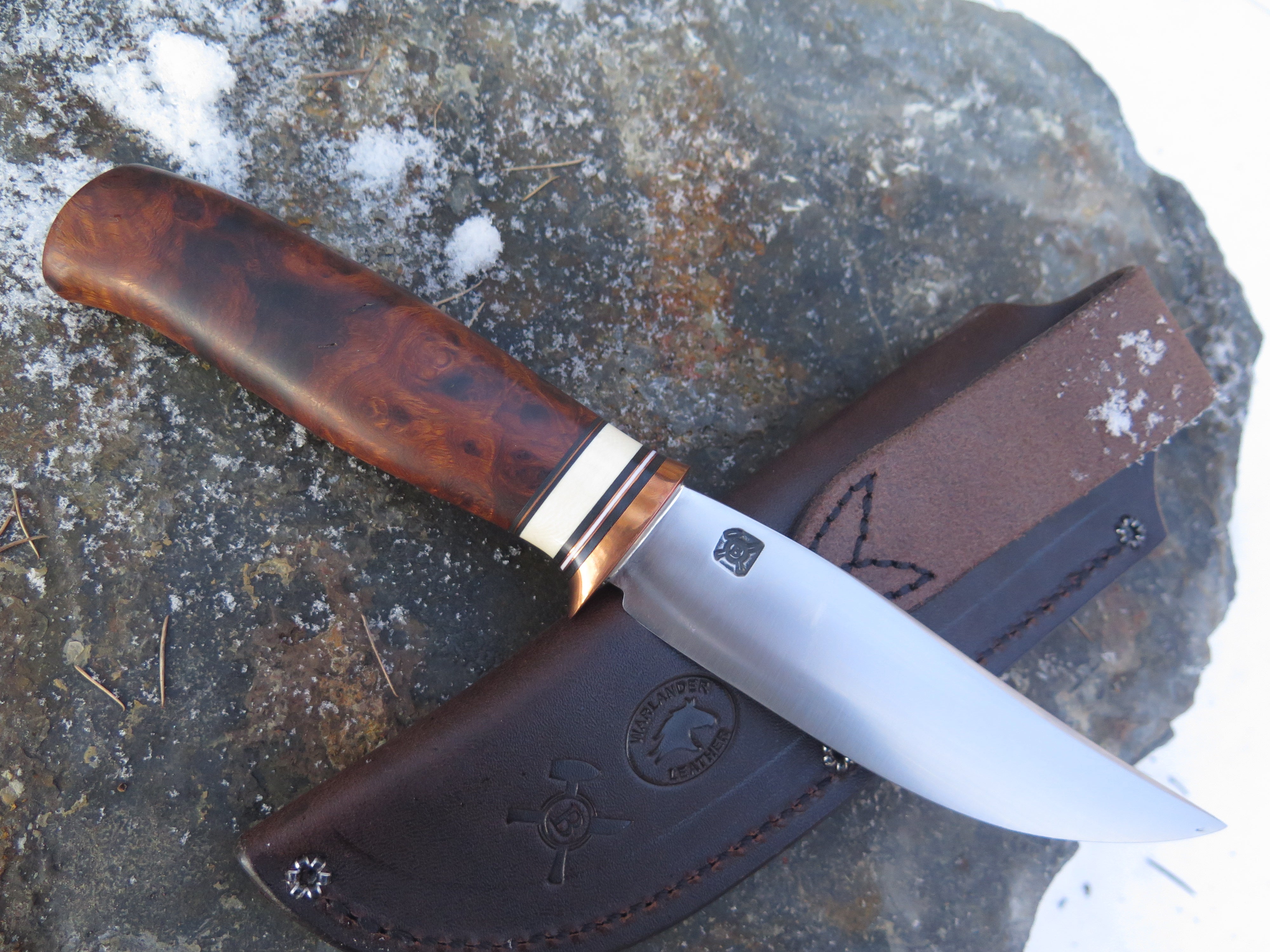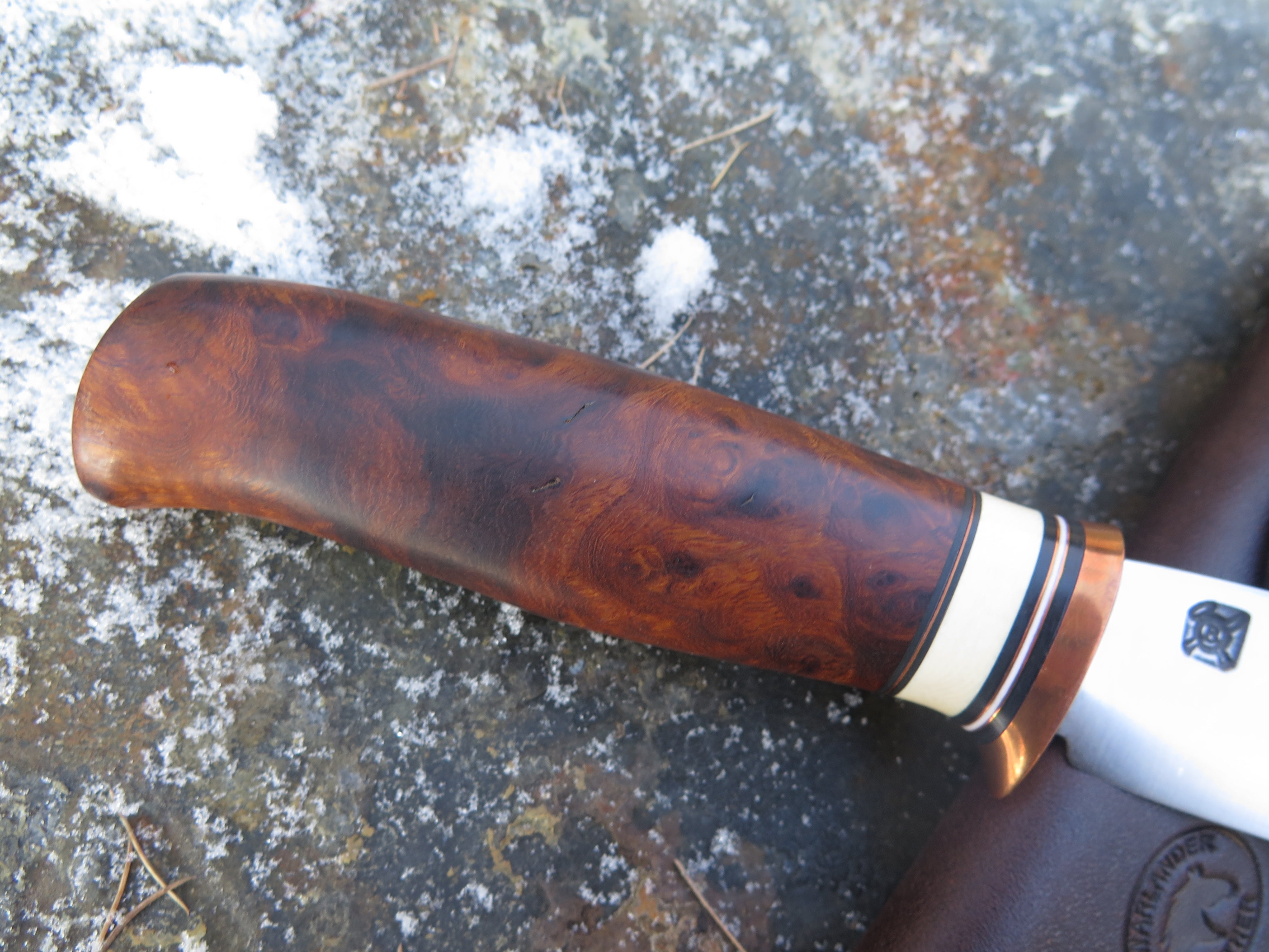 This beautiful Trout and Bird from Behring Made© is entirely handmade starting with the 440c stainless blades that measure just about 4 3/4" from tip to guard with a razor sharp convex grind. The copper guard is soldered in place above black and white fiber, copper and ancient mammoth ivory spacers that yield a wonderful contrast against the premium desert ironwood burl handle. The overall length measures about 9 1/2" and it comes guaranteed for life in a classic leather belt sheath.