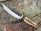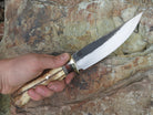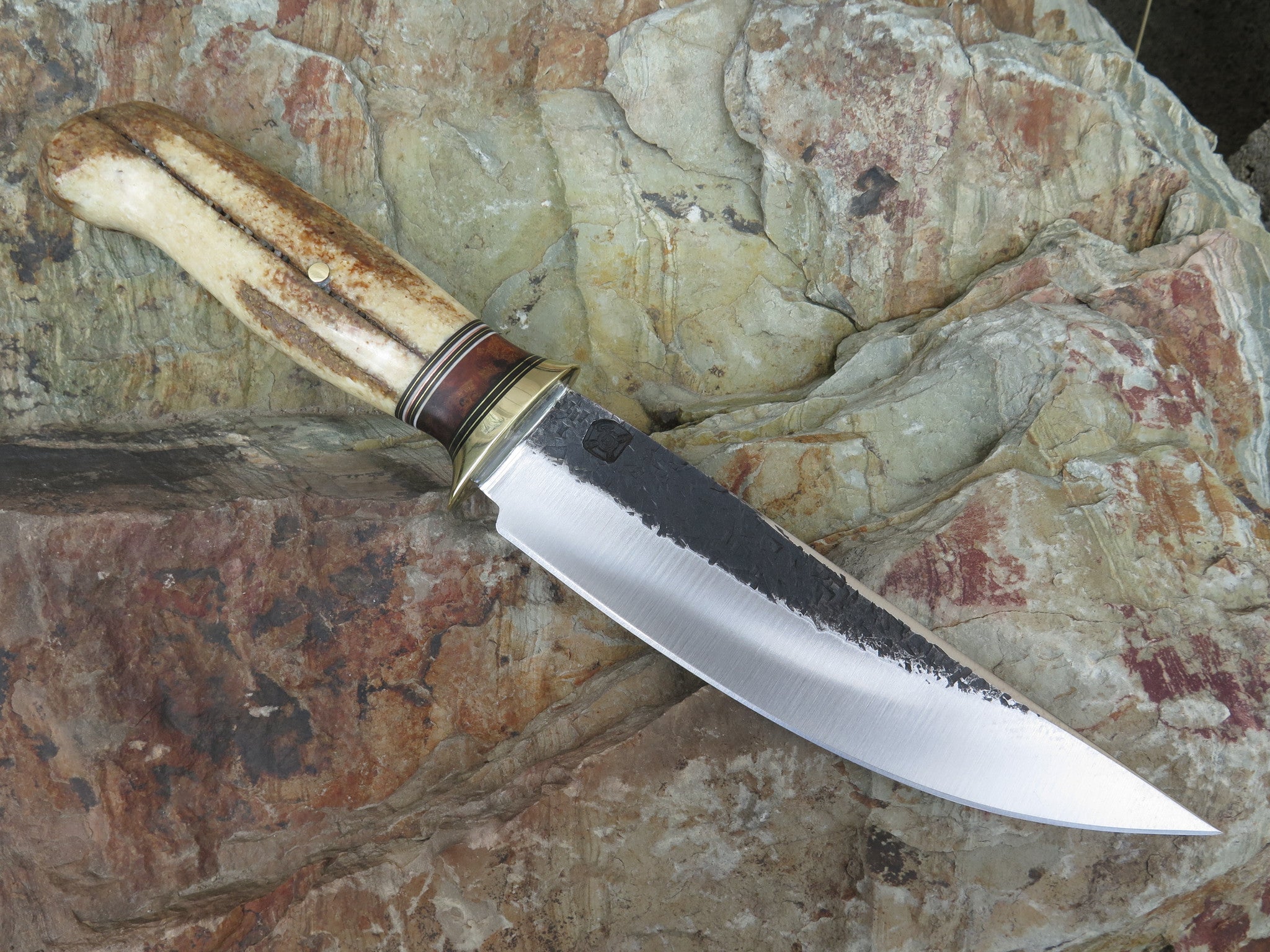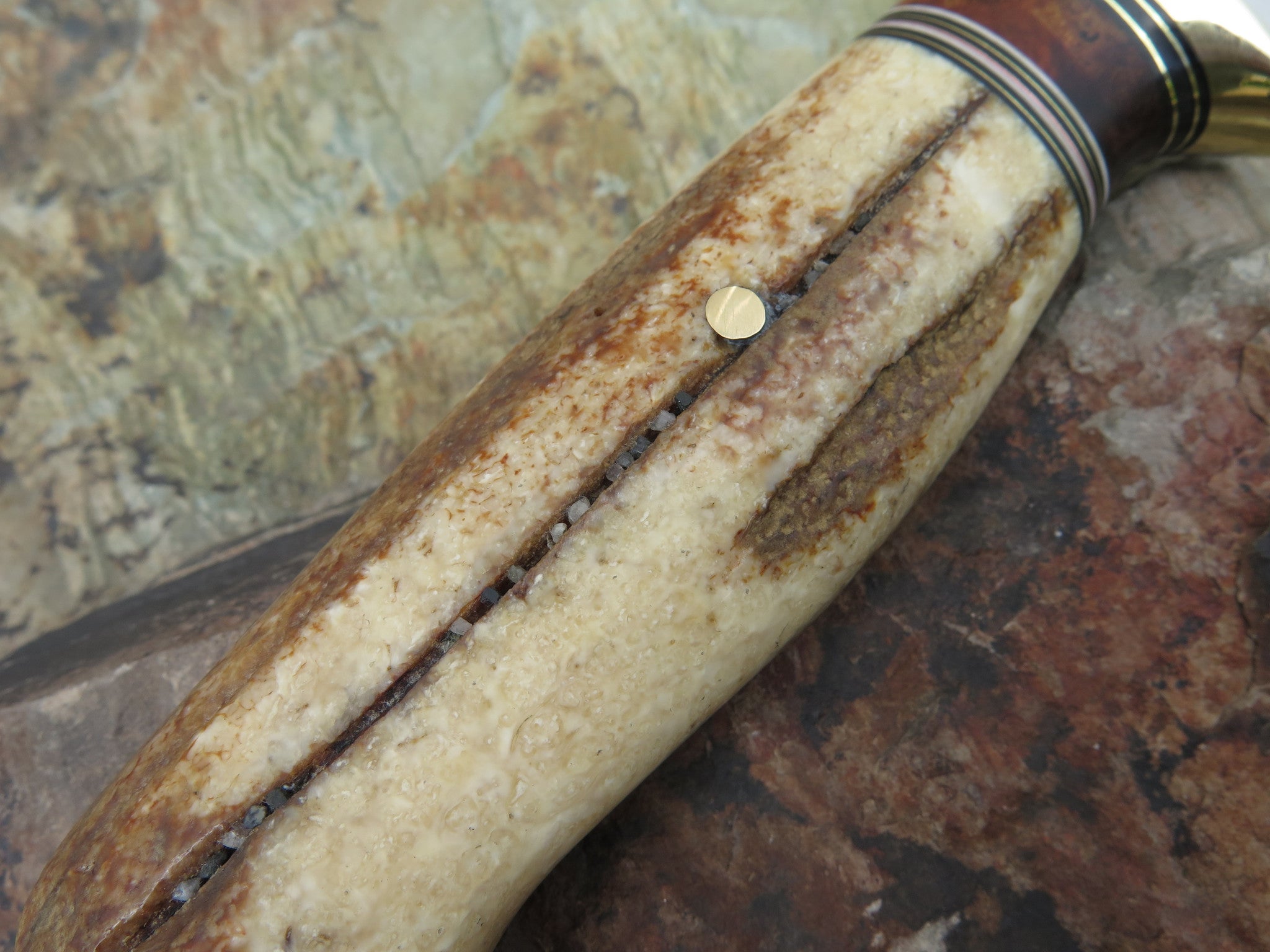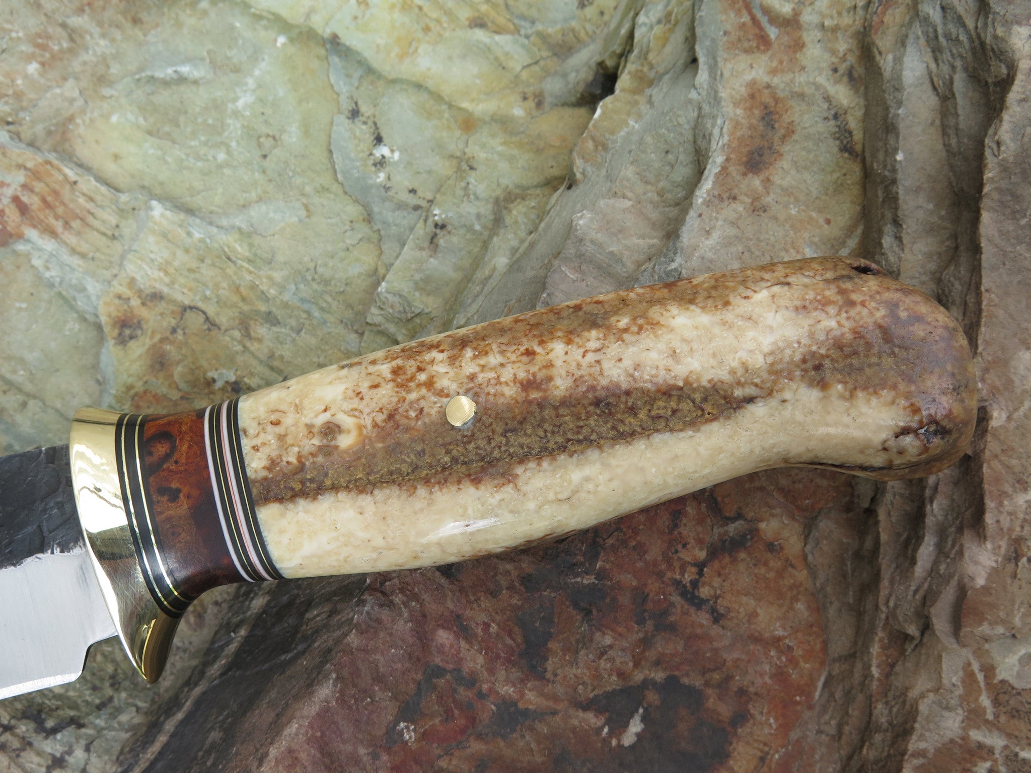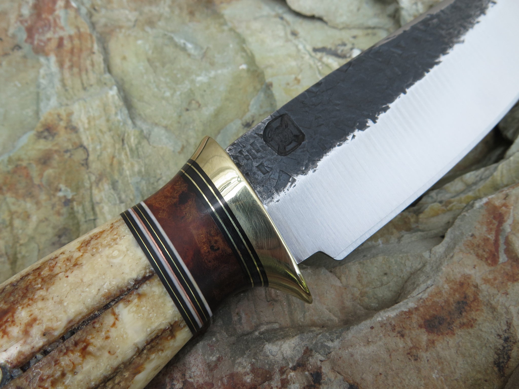This incredible Mission knife from Behring Made is hand forged from high carbon steel and measures 6 3/4" from tip to guard with a razor sharp hollow grind and a hammermark finish. The brass guard is soldered in place above black, white, copper, brass and desert ironwood burl spacers. The handle is a premium walrus ivory artifact that we pinned with brass, and the overall length measures 11 7/8", and it will come in a custom exotic inlay sheath from Warlander Leather. *CONTACT TO ORDER, MATERIALS SUBJECT TO VARIED FIGURE