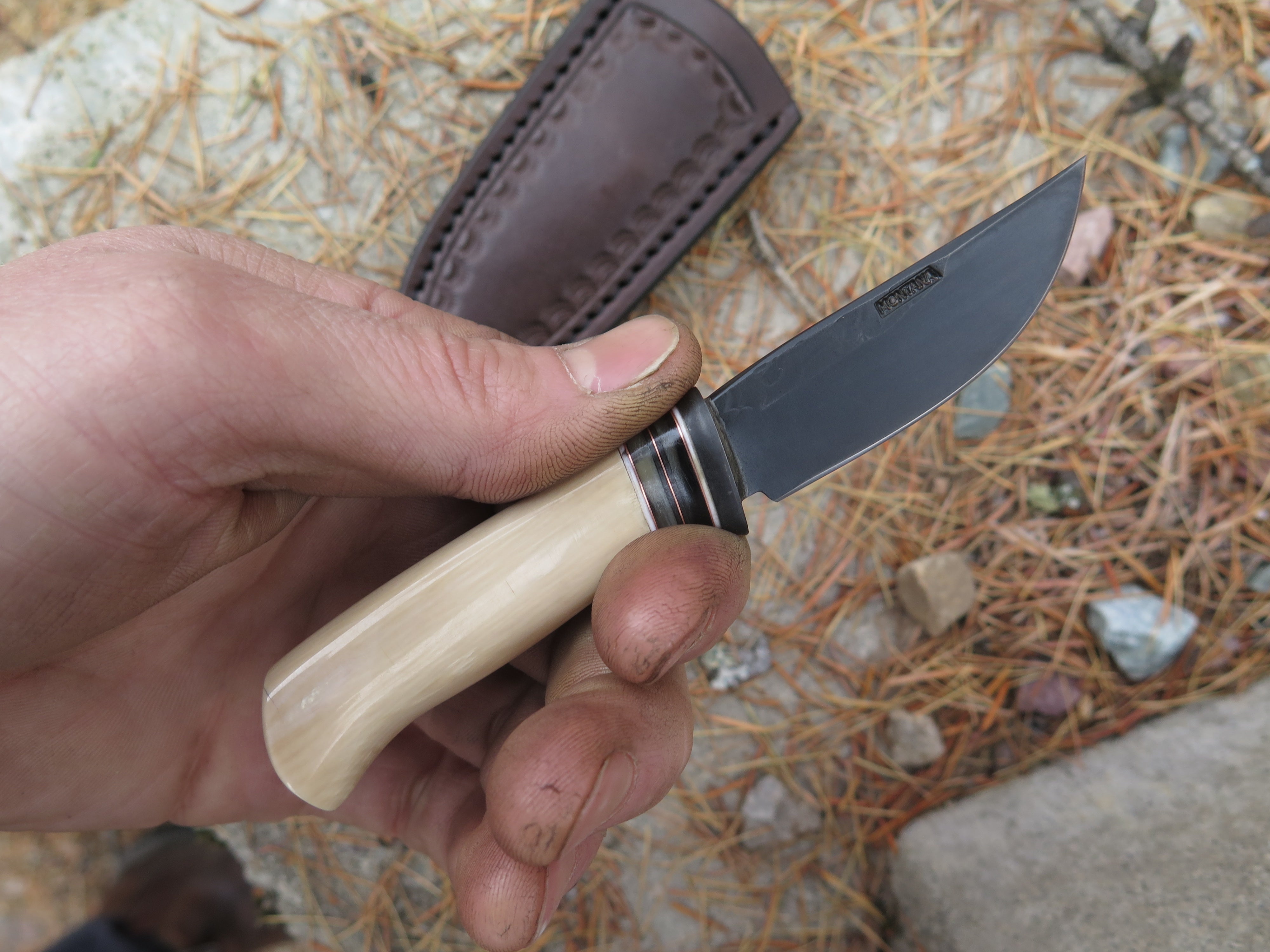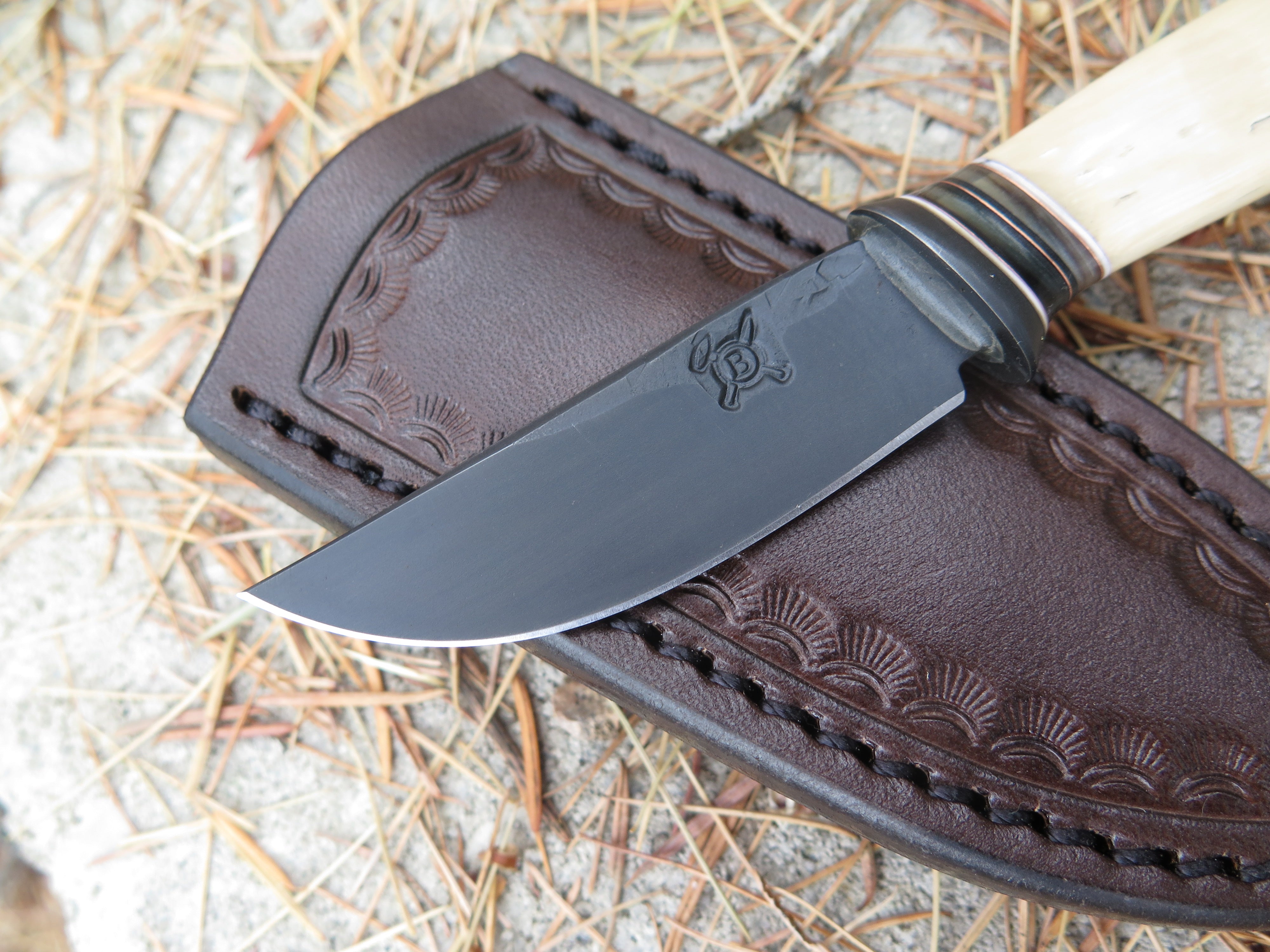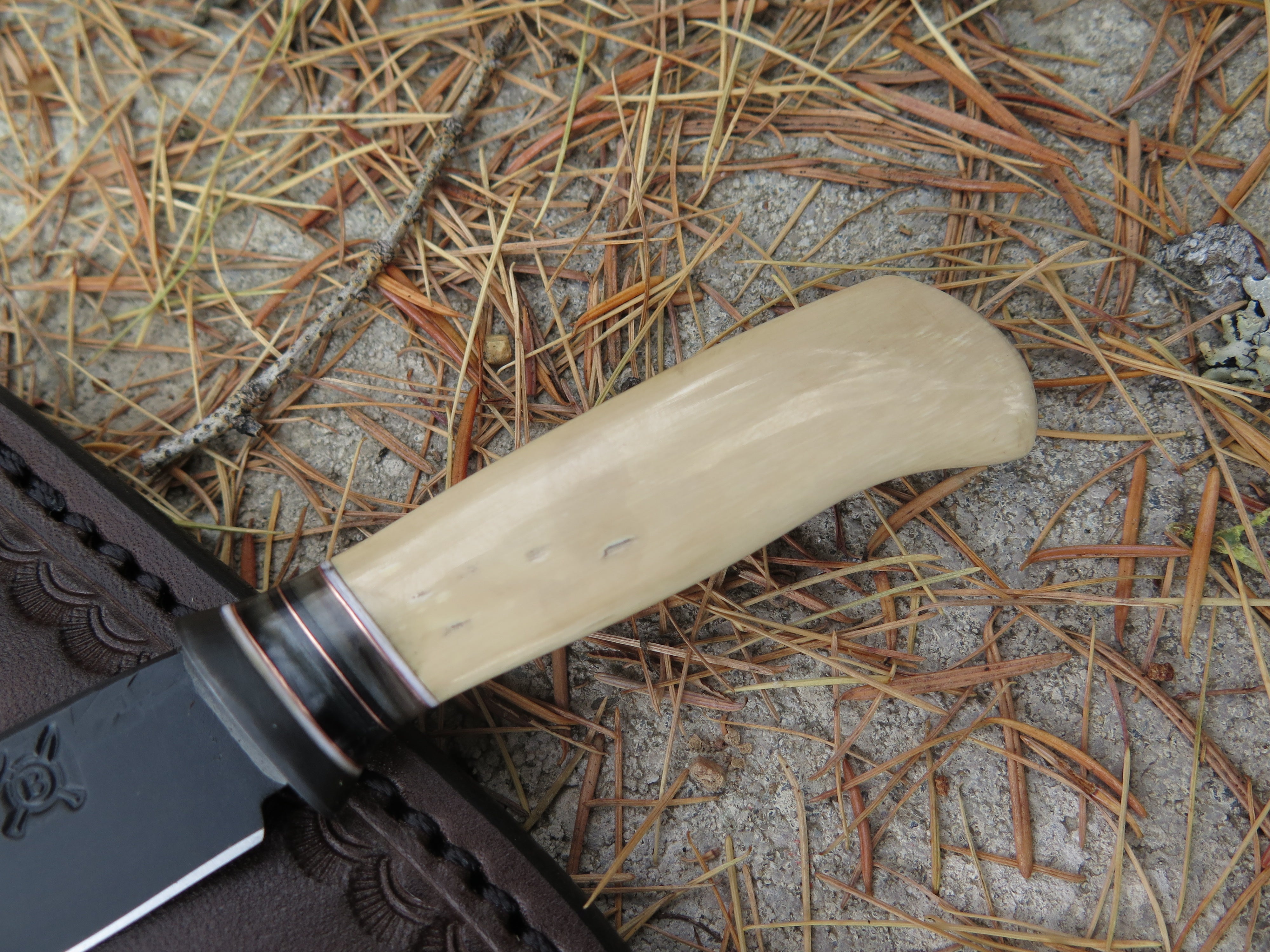 This beautiful new 5th pocket from Behring Made© is hand forged from 1/8" thick high carbon 01 tool steel and it measures 2 1/2" from tip to guard with a razor sharp hollow grind, hammermarks and a blued finish. The blued steel guard is soldered in place above white and black fiber, copper and dall's sheep horn spacers atop an ancient mammoth ivory handle. The overall length measures 5 1/8" and it comes in a clip style 5h pocket sheath.