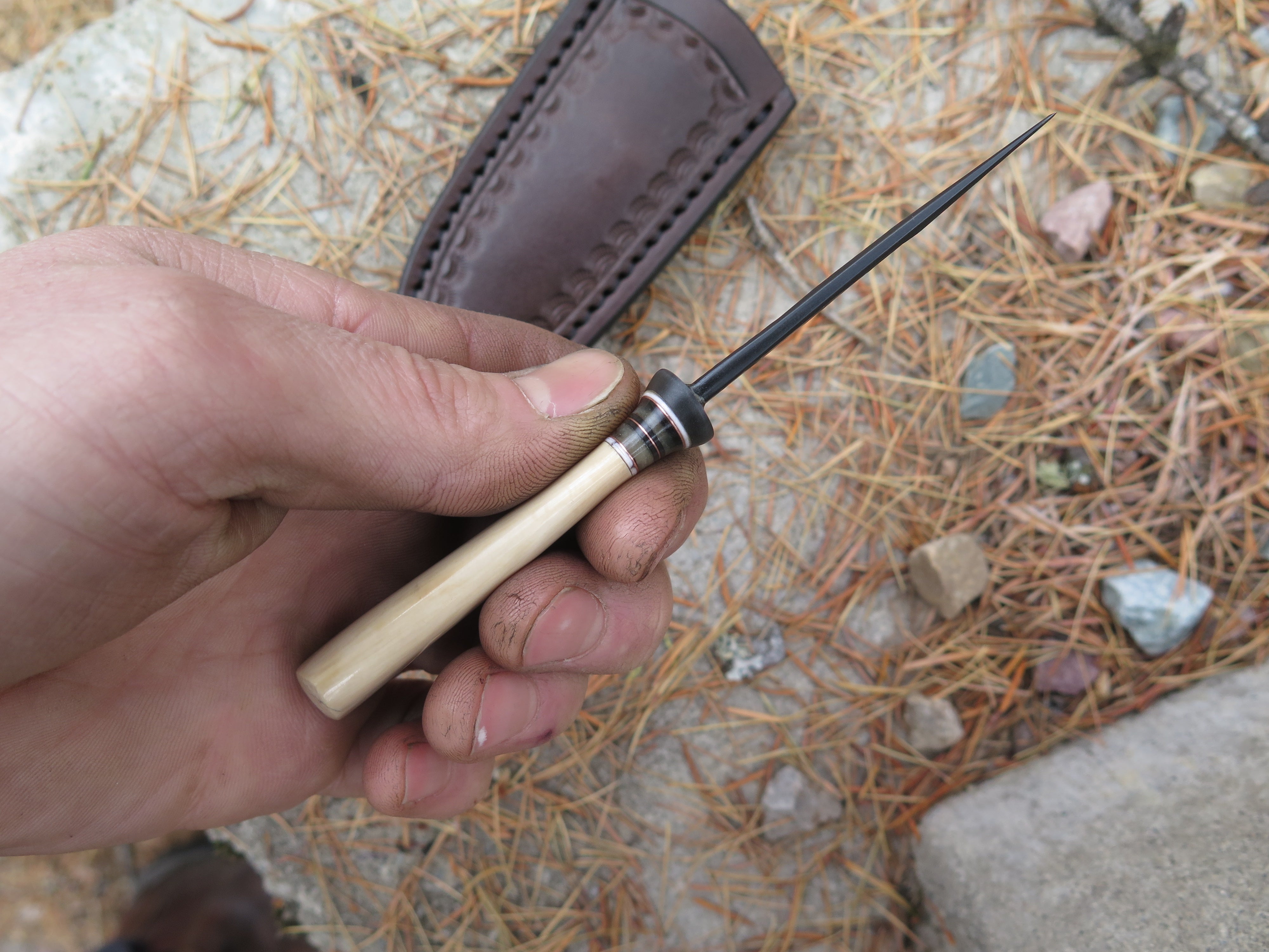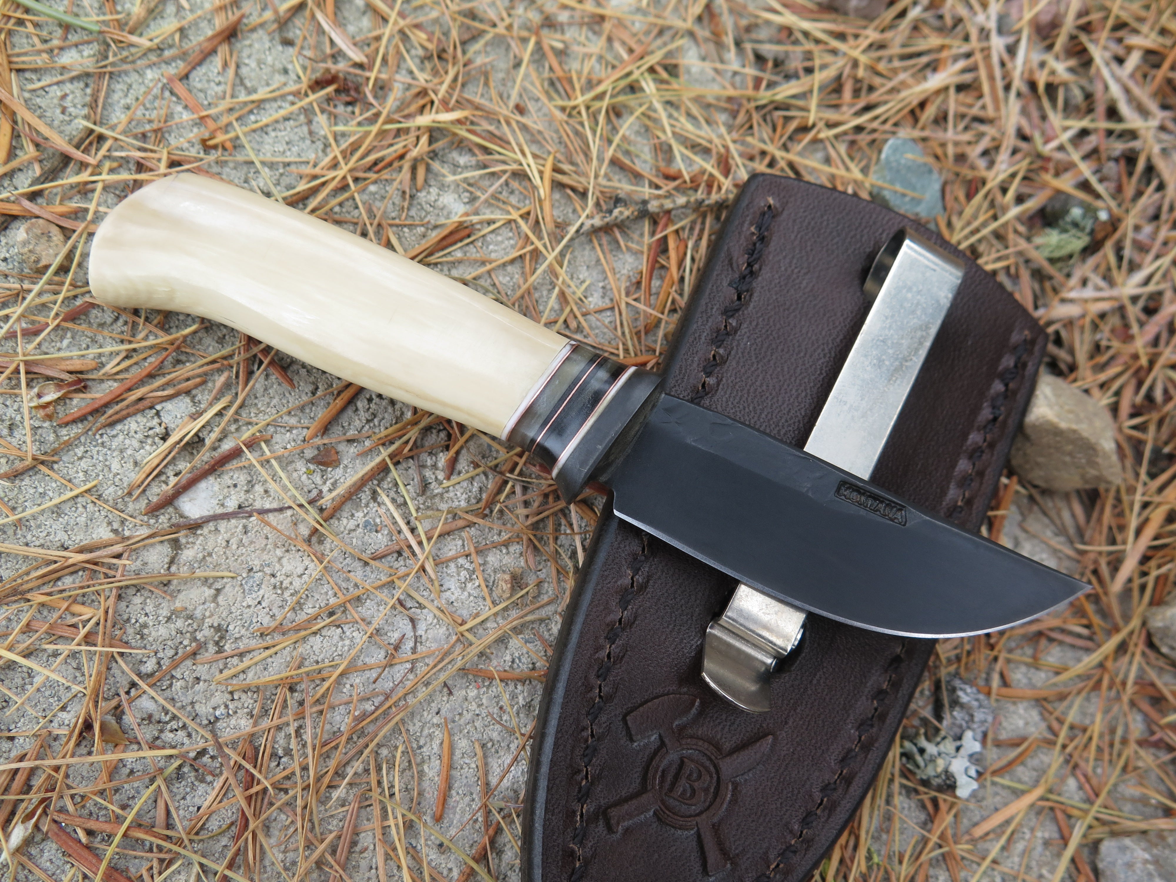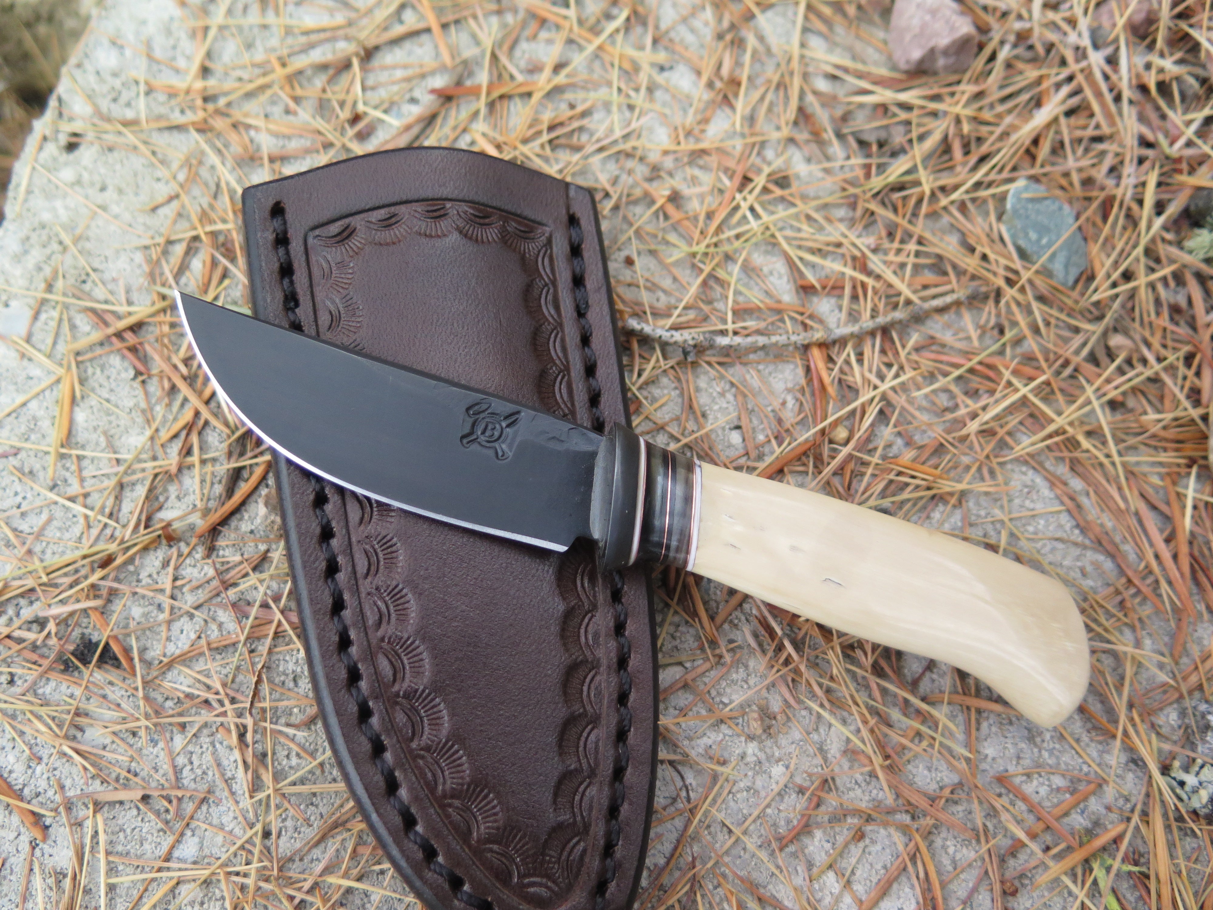 This beautiful new 5th pocket from Behring Made© is hand forged from 1/8" thick high carbon 01 tool steel and it measures 2 1/2" from tip to guard with a razor sharp hollow grind, hammermarks and a blued finish. The blued steel guard is soldered in place above white and black fiber, copper and dall's sheep horn spacers atop an ancient mammoth ivory handle. The overall length measures 5 1/8" and it comes in a clip style 5h pocket sheath.