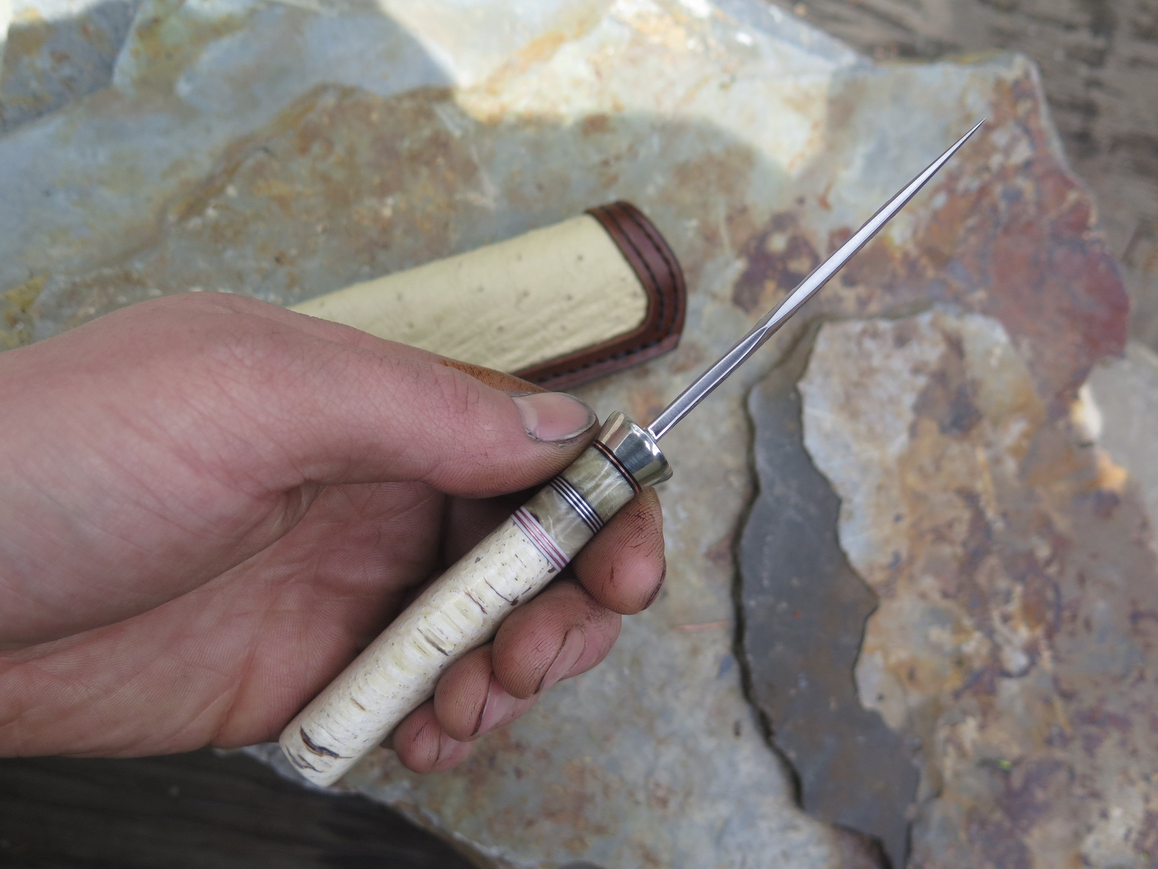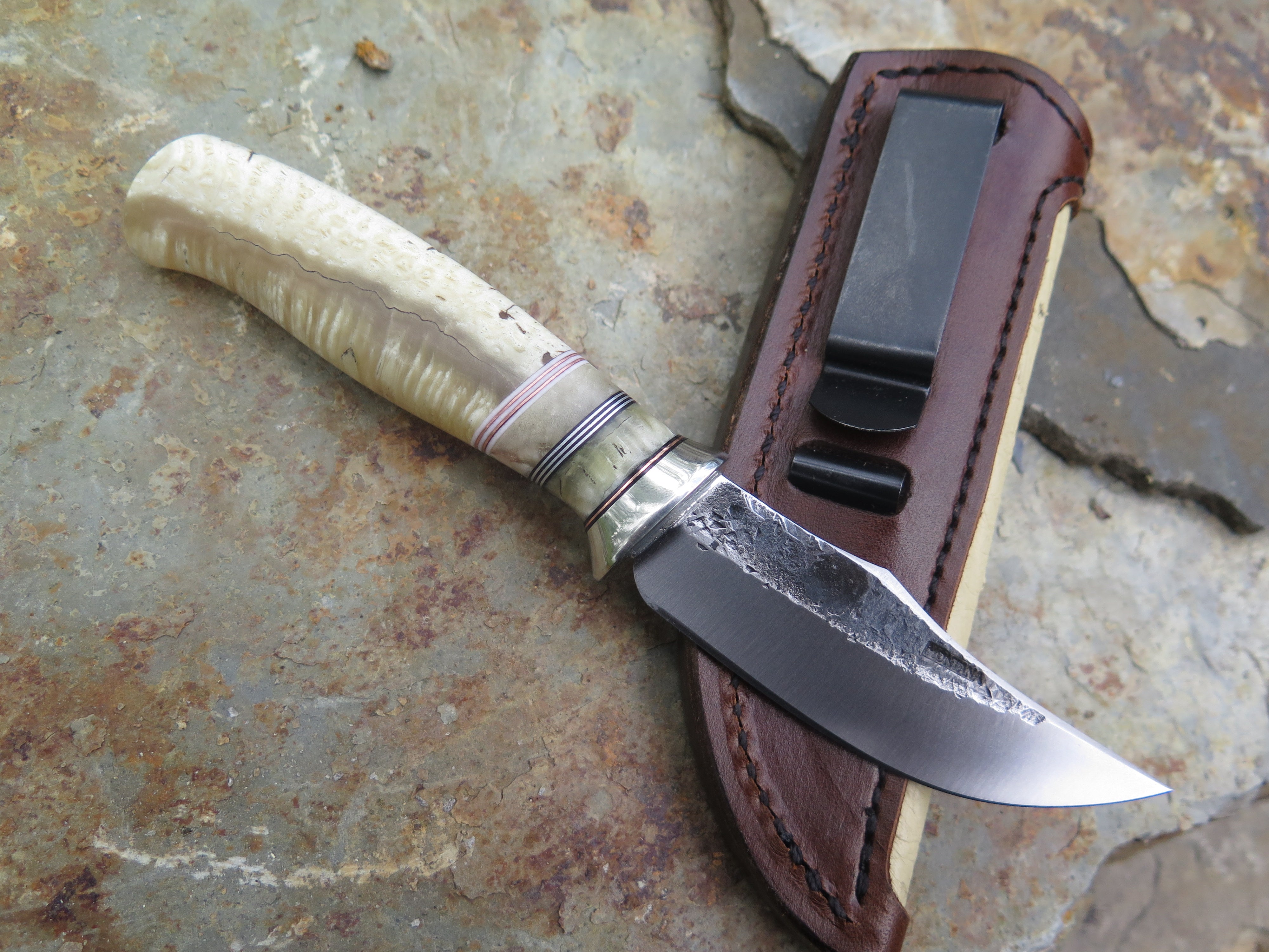 This new Behring Made© Pocket Knife is hand forged from 1/8" thick high carbon 01 tool steel and it measures just shy of 3 1/4" from tip to guard with a razor sharp hollow grind and our hammermark finish. The nickel silver guard is soldered in place above black and white fiber, copper, aluminum and musk ox boss spacers which top a full musk ox boss handle- and the figure is outstanding! Overall length measures 6 5/8" and it comes in a right handed pocket clip sheath with an ostrich inlay.