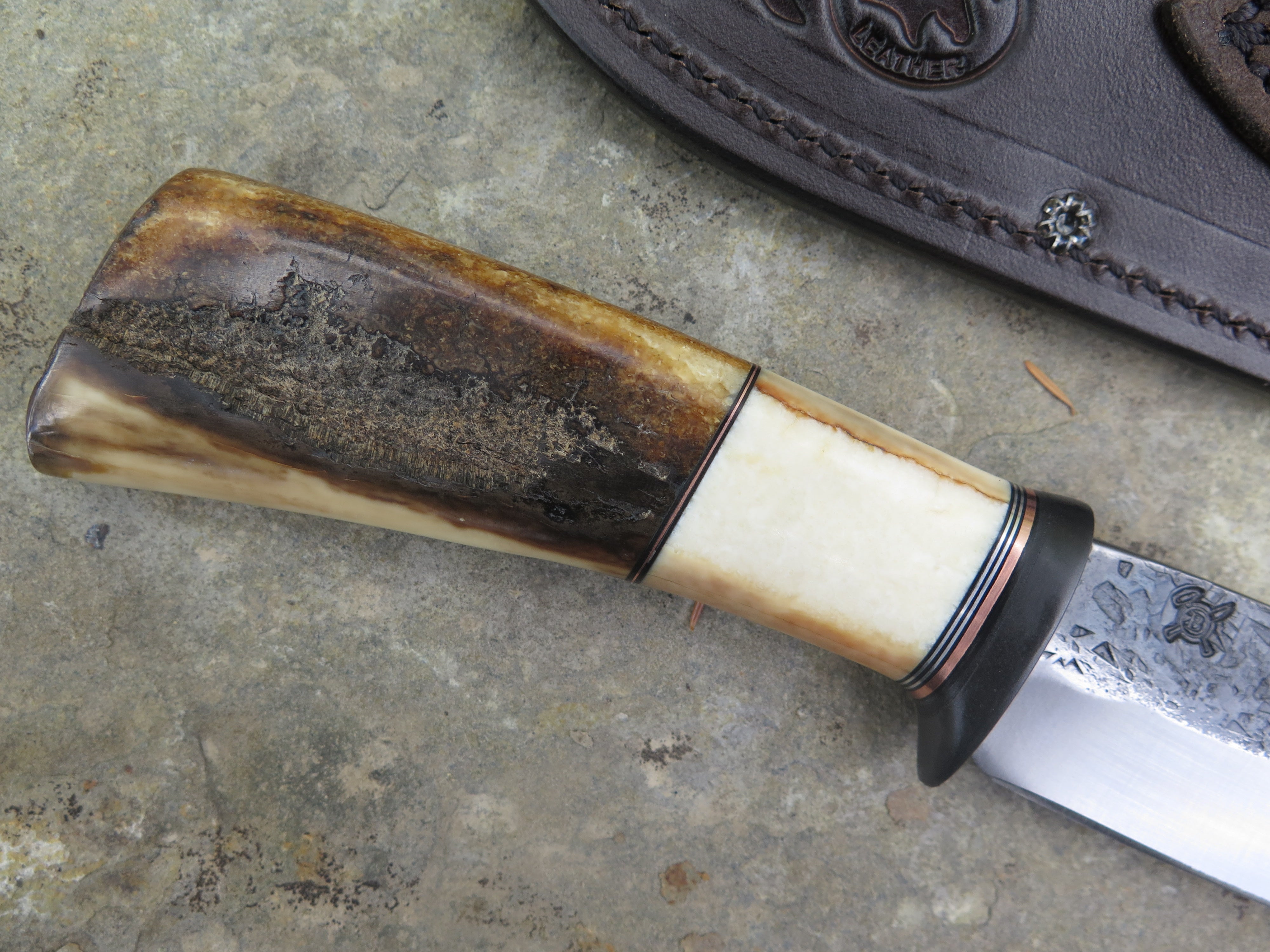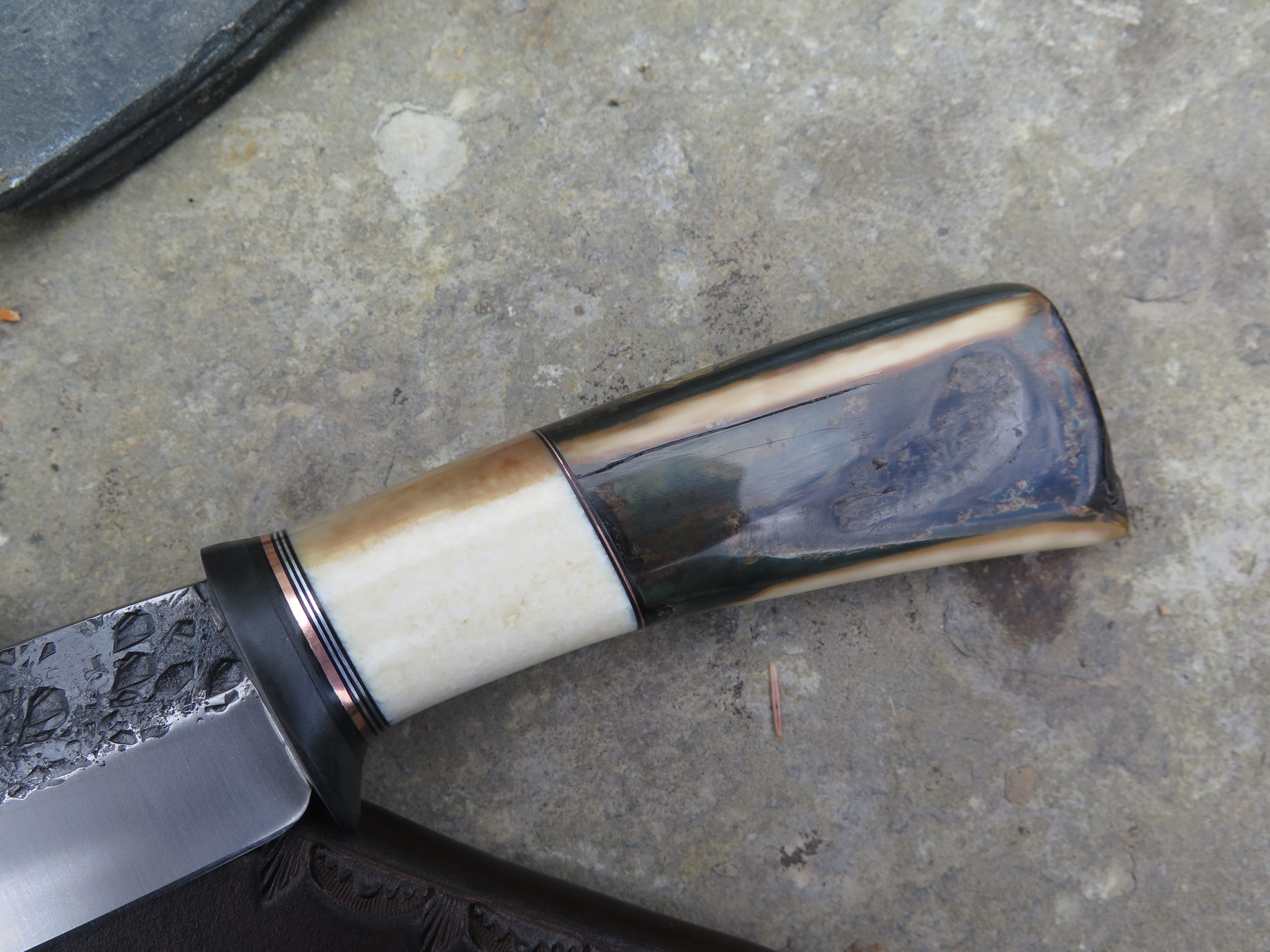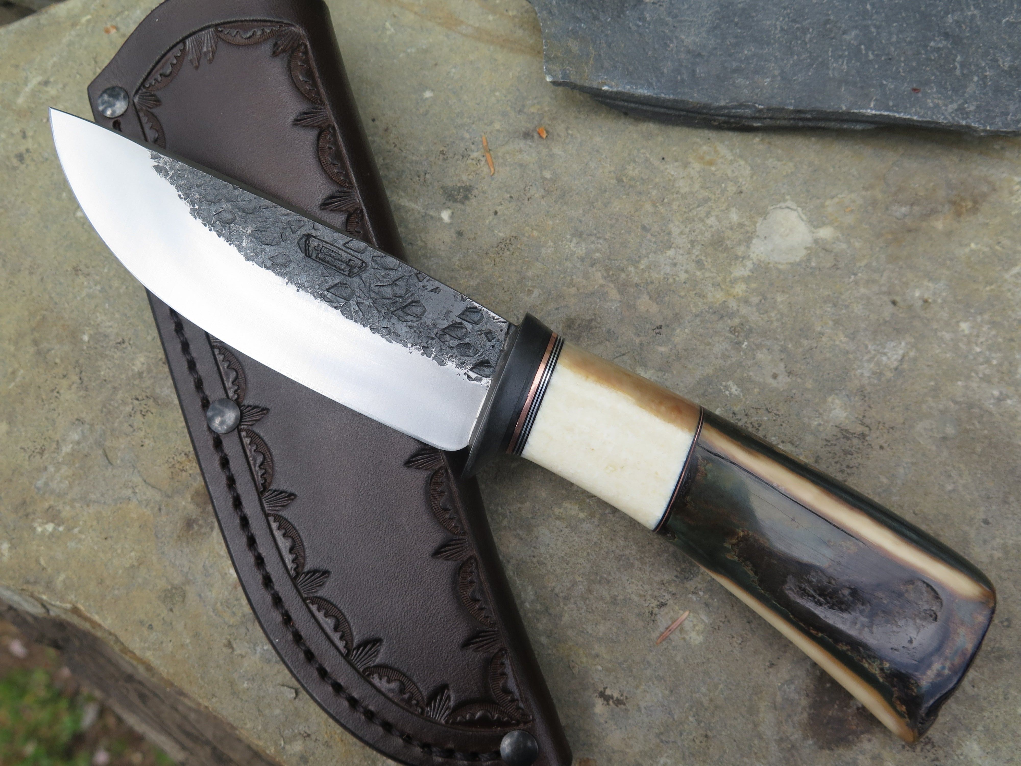 This incredible new Behring Made© Drop Point is hand forged from 3/16" thick high carbon 01 tool steel and it measures 4 3/4" from tip to guard with a razor sharp hollow grind and our hammermark finish. The blued steel guard is soldered in place above black fiber, copper and aluminum spacers amidst a two-piece artifact and fossil walrus ivory handle with truly astounding figure and contrast. The overall length measures 9 1/4" and it comes in a custom tooled pouch sheath.