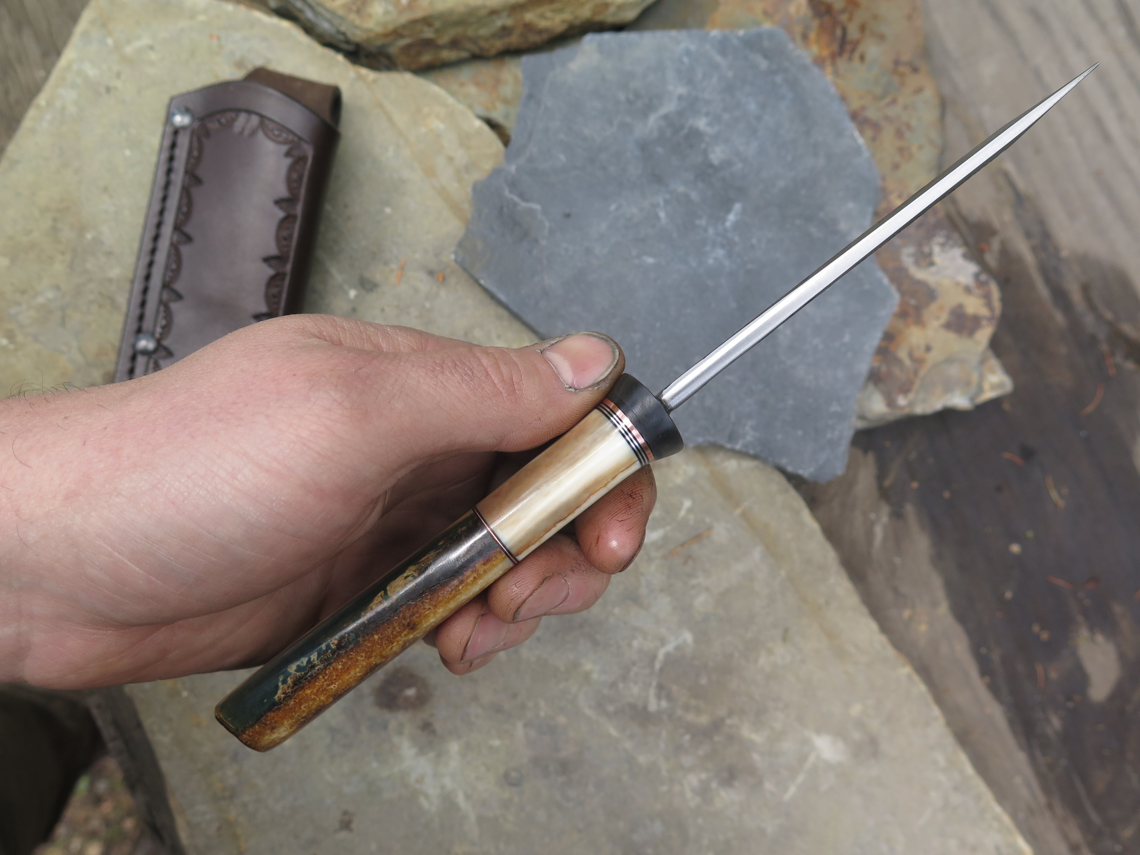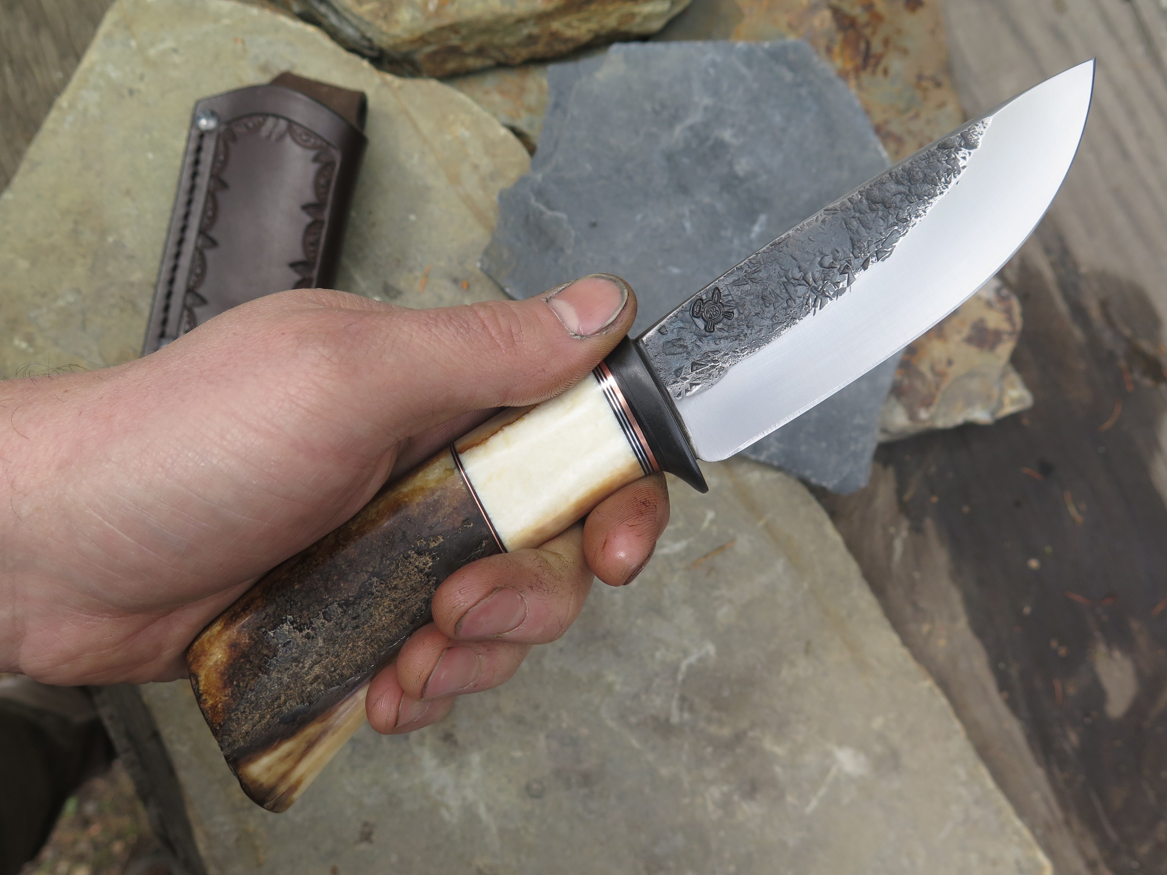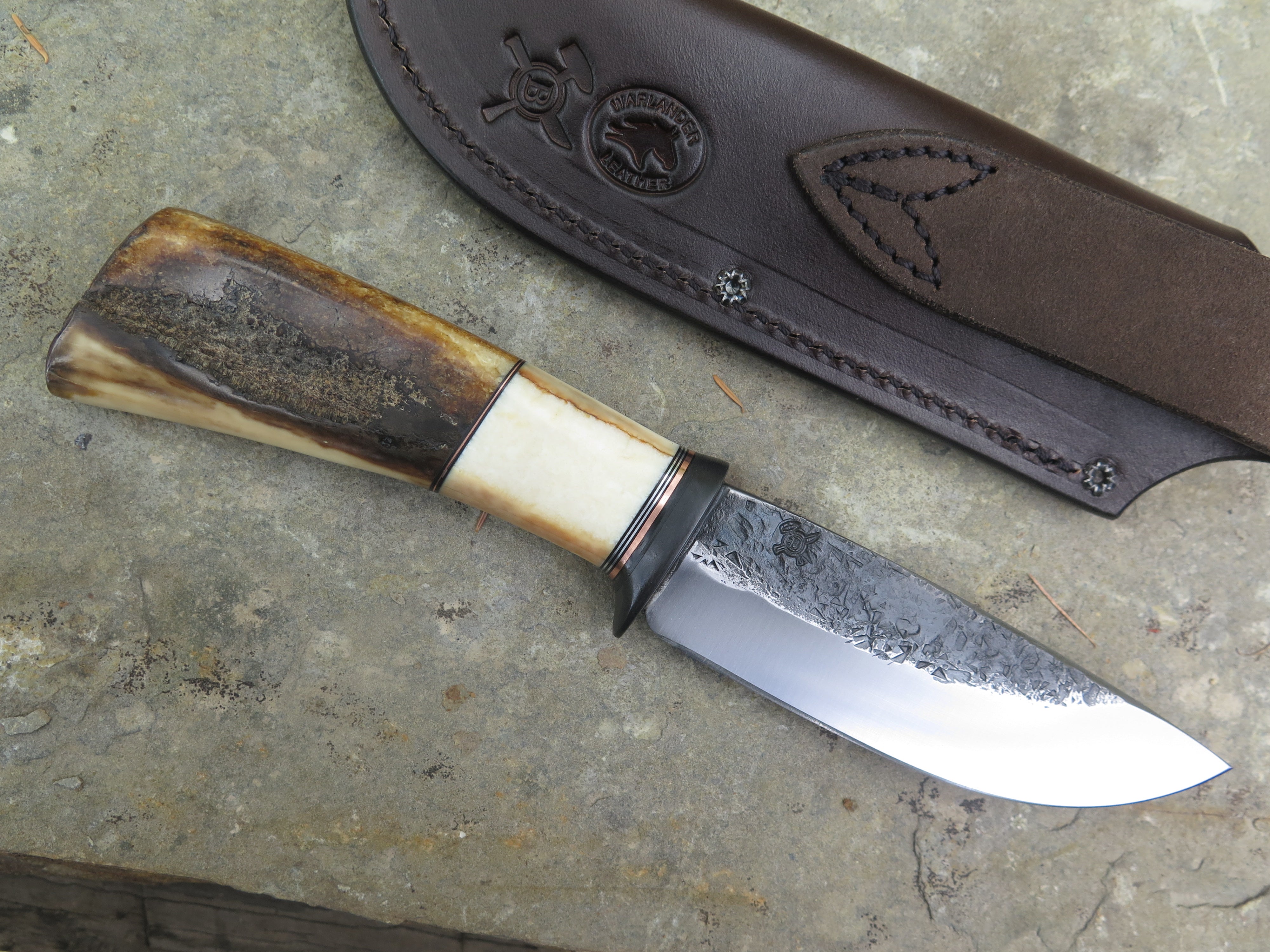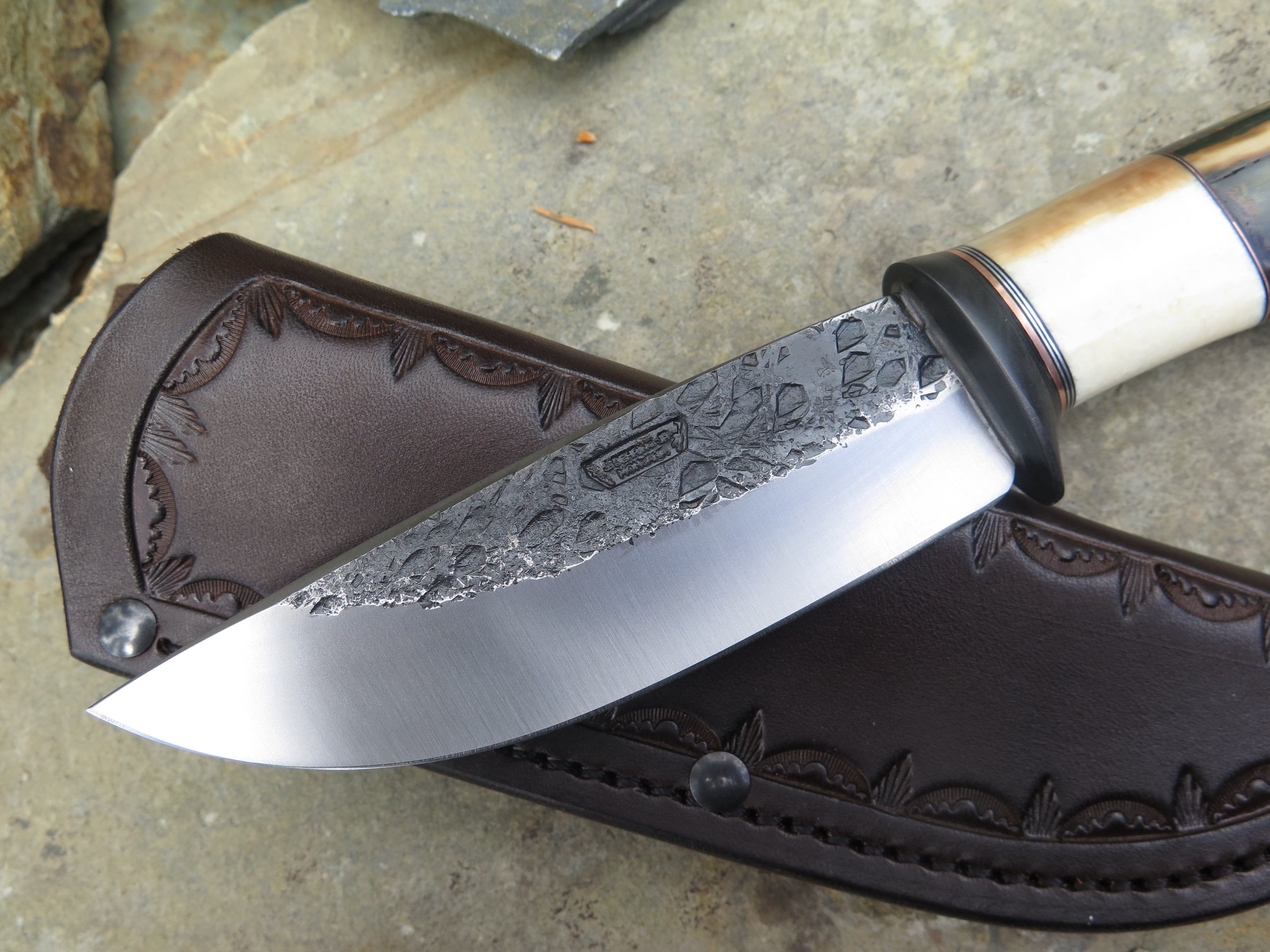 This incredible new Behring Made© Drop Point is hand forged from 3/16" thick high carbon 01 tool steel and it measures 4 3/4" from tip to guard with a razor sharp hollow grind and our hammermark finish. The blued steel guard is soldered in place above black fiber, copper and aluminum spacers amidst a two-piece artifact and fossil walrus ivory handle with truly astounding figure and contrast. The overall length measures 9 1/4" and it comes in a custom tooled pouch sheath.