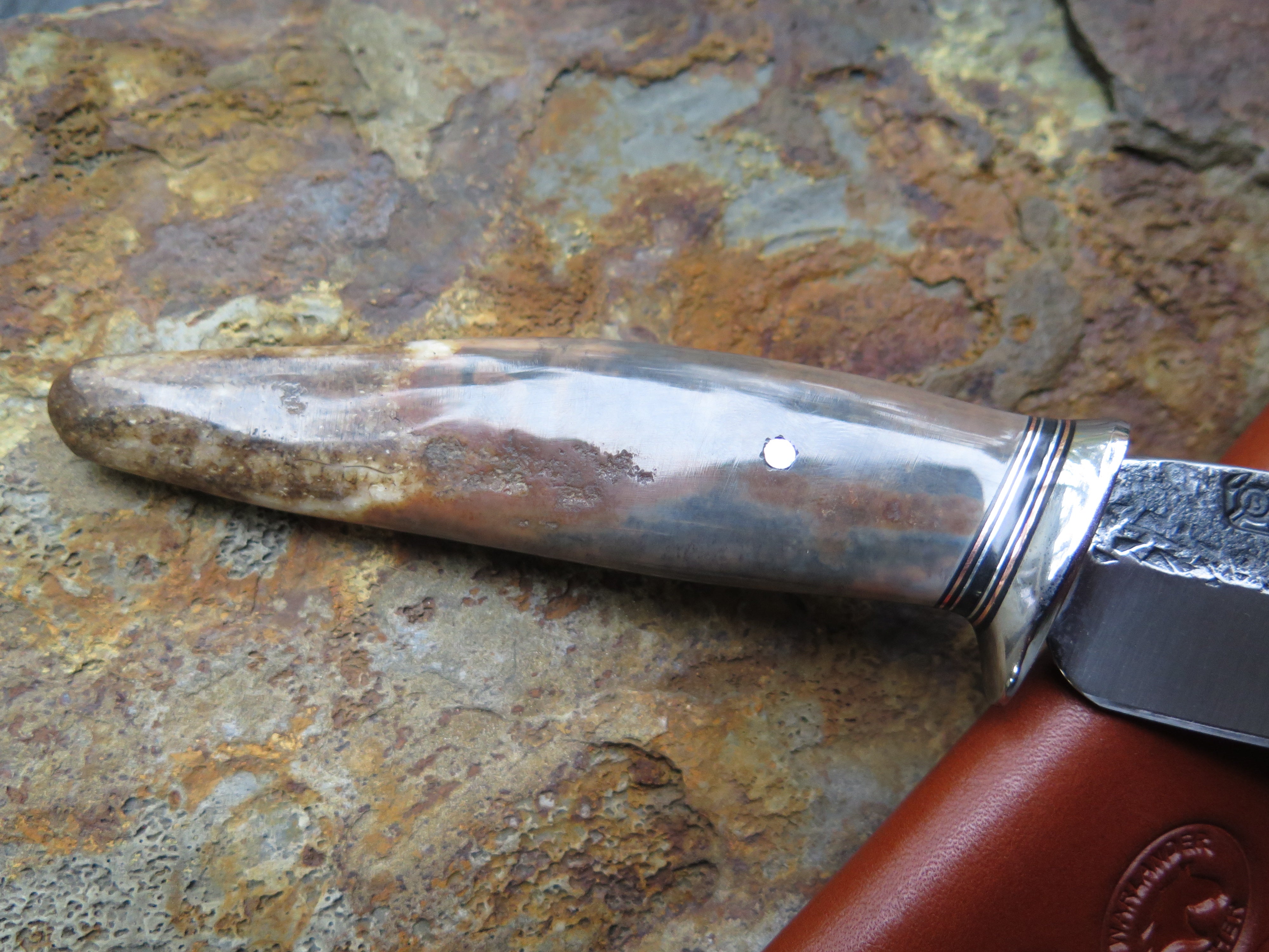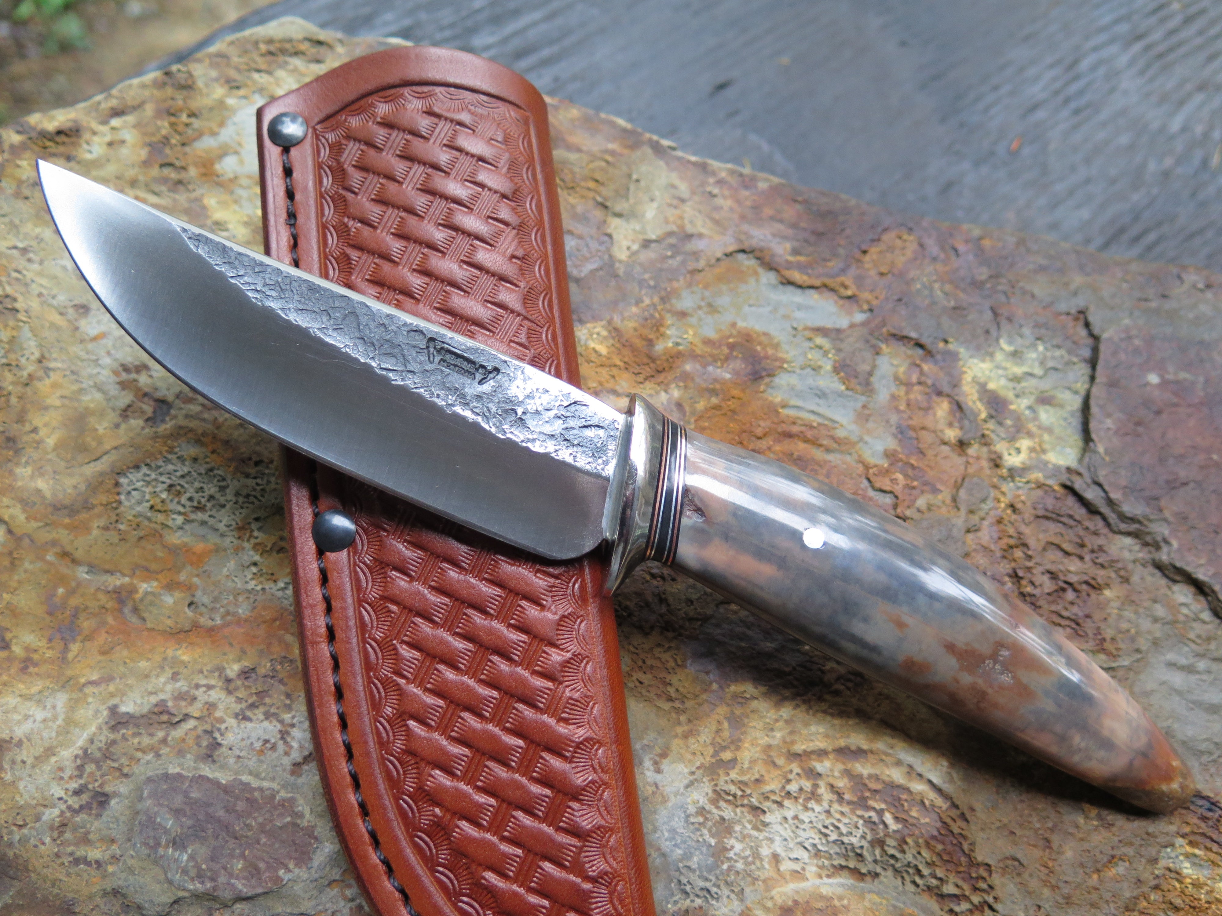This incredible new Hunter from Behring Made© is hand forged from 3/16" thick 01 tool steel and it measures 4 3/4" from tip to guard with a razor sharp hollow grind and our hammermark finish. The stainless steel guard is soldered in place above black fiber, copper and aluminum spacers as well as a premium artifact walrus handle that's pinned through the tang with aluminum. The overall length measures 9 5/8" and it comes in a basketweave tooled pouch sheath.