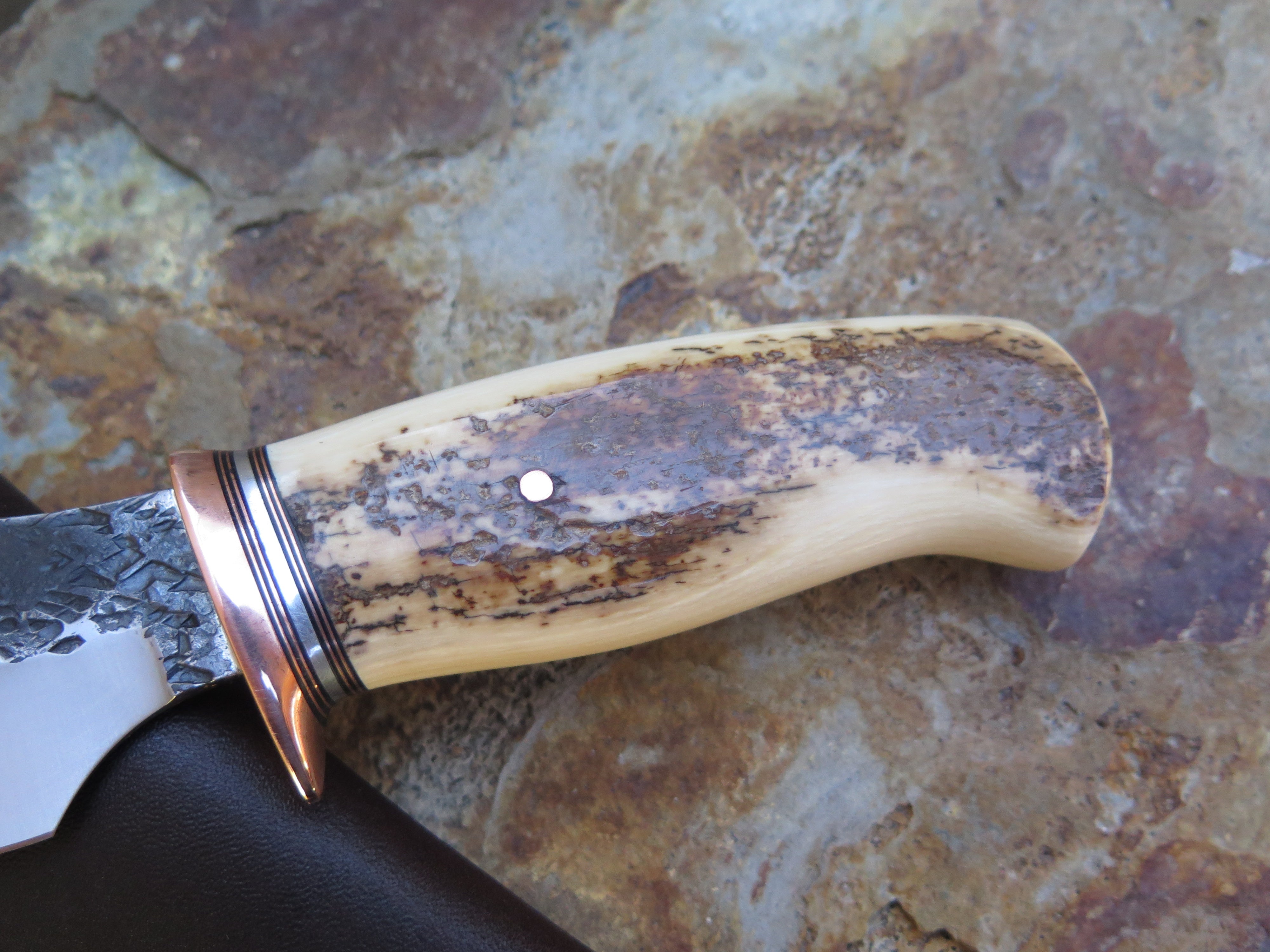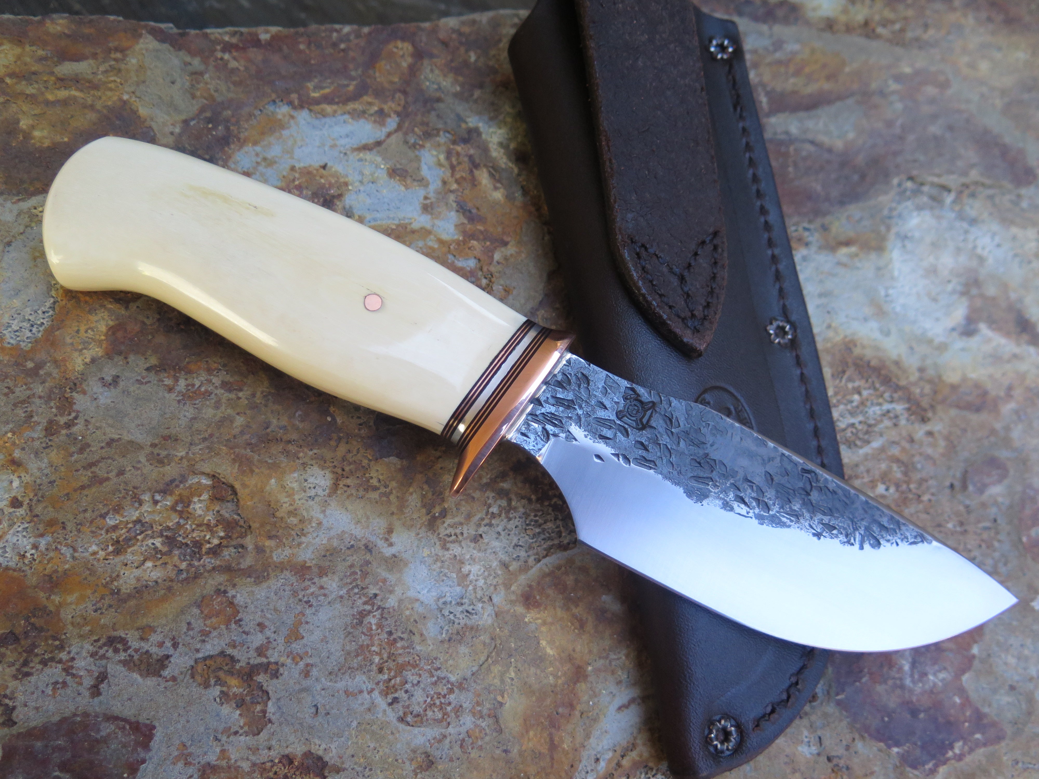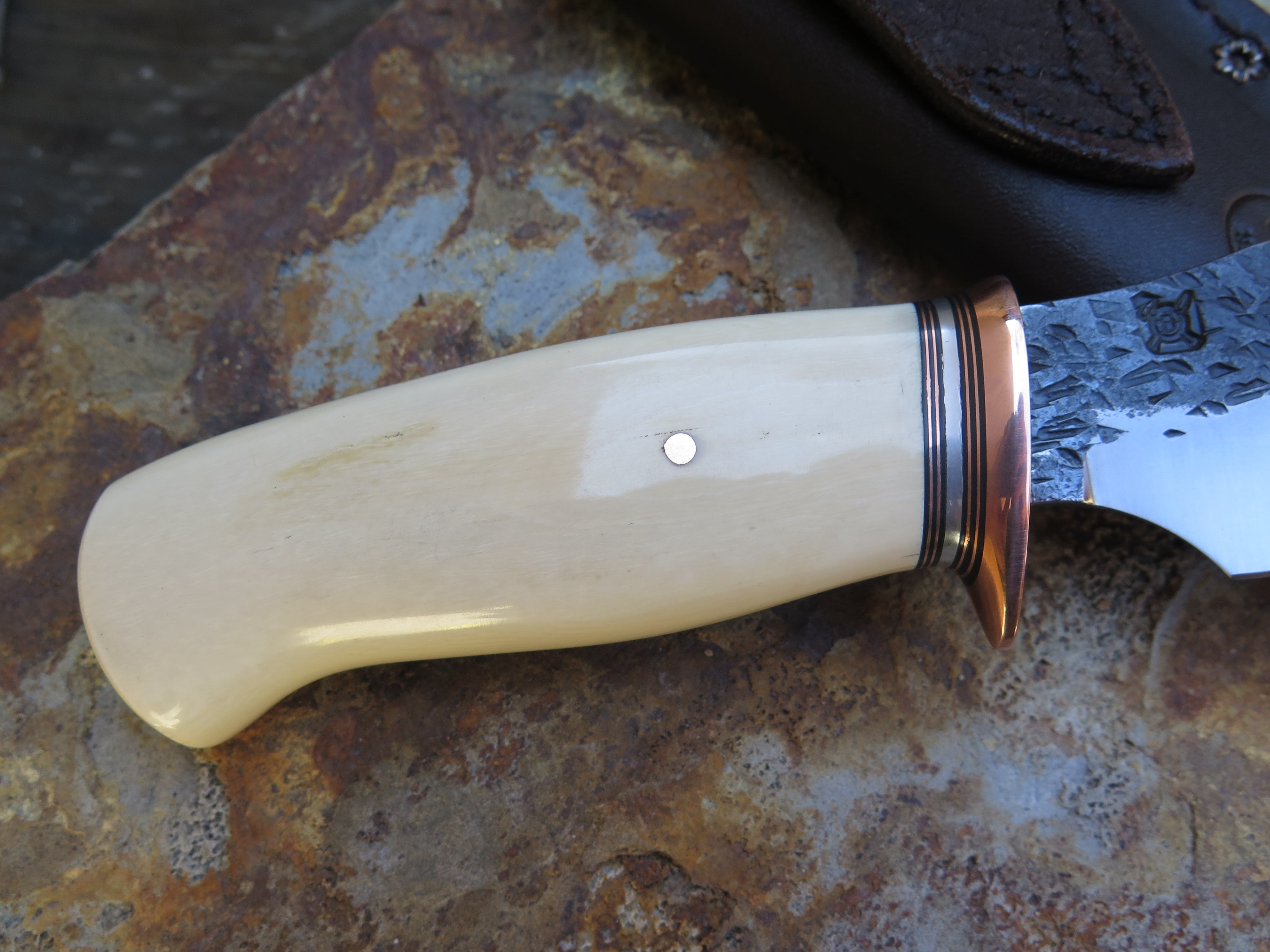 This astounding Alaskan from Behring Made© is hand forged from 3/16" thick high carbon 01 tool steel and it measures 4 3/4" from tip to guard with a razor sharp hollow grind and our hammermark finish. The copper guard is soldered in place above black fiber, copper and aluminum spacers which transition to a remarkable ancient mammoth ivory handle that is pinned through the tang with copper. The overall length is just about 9 1/4" and it comes in a classic leather belt pouch sheath.