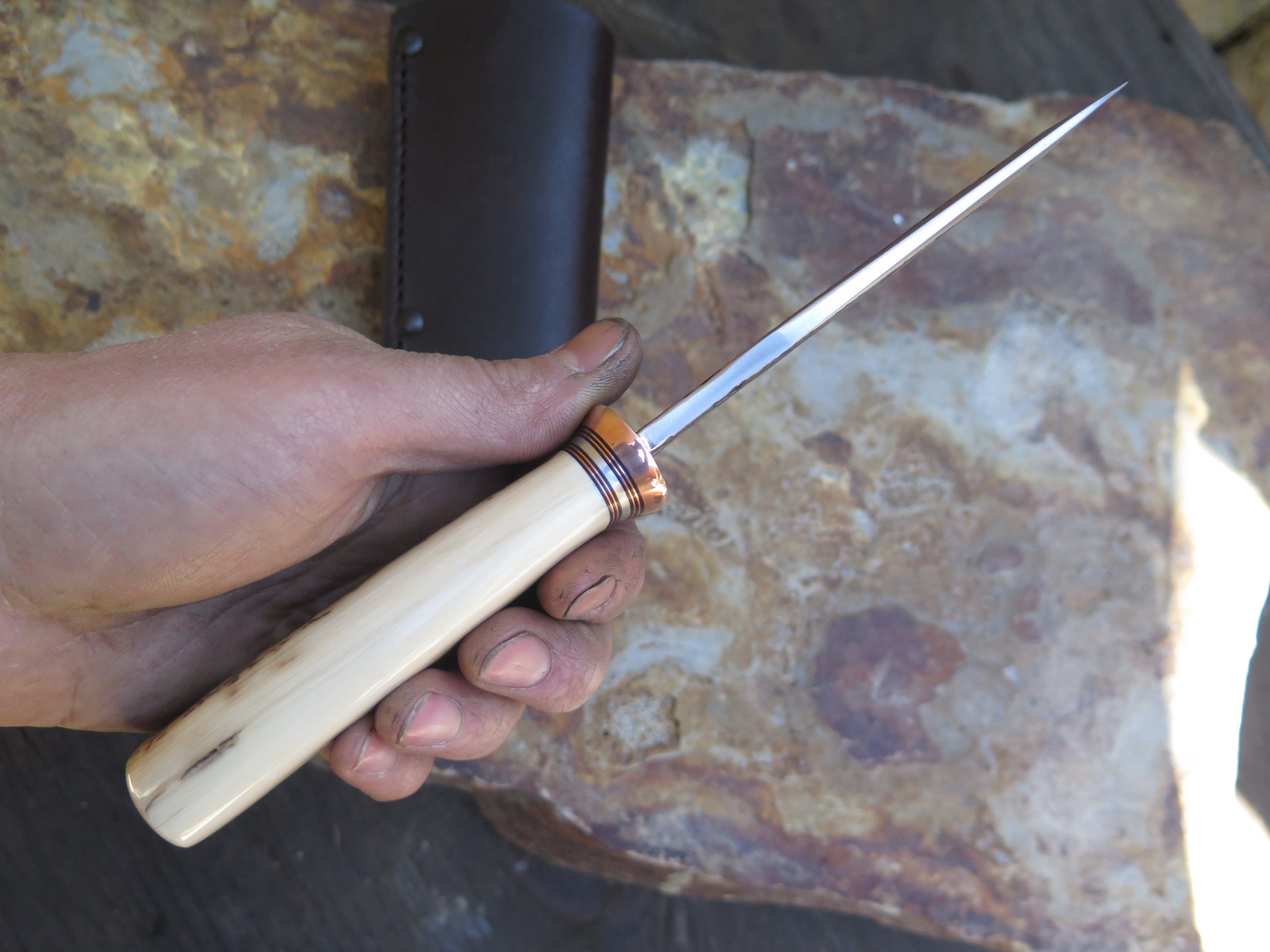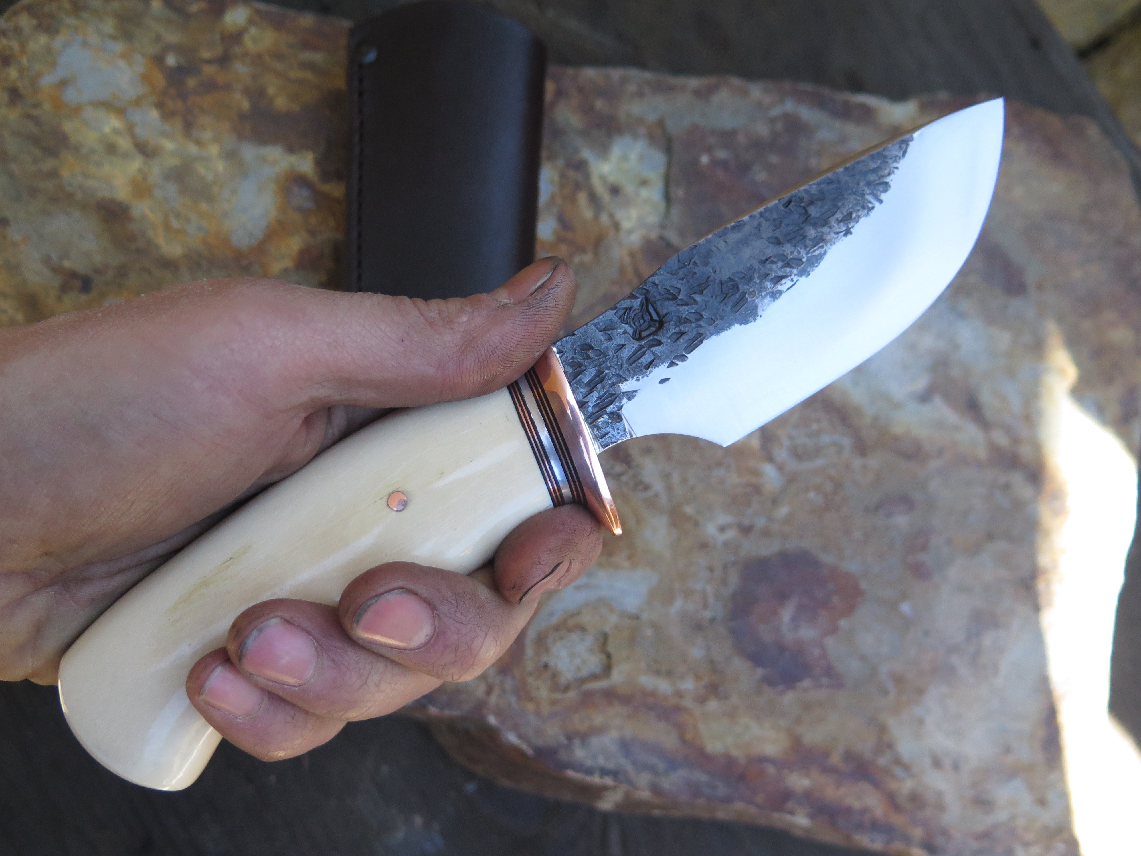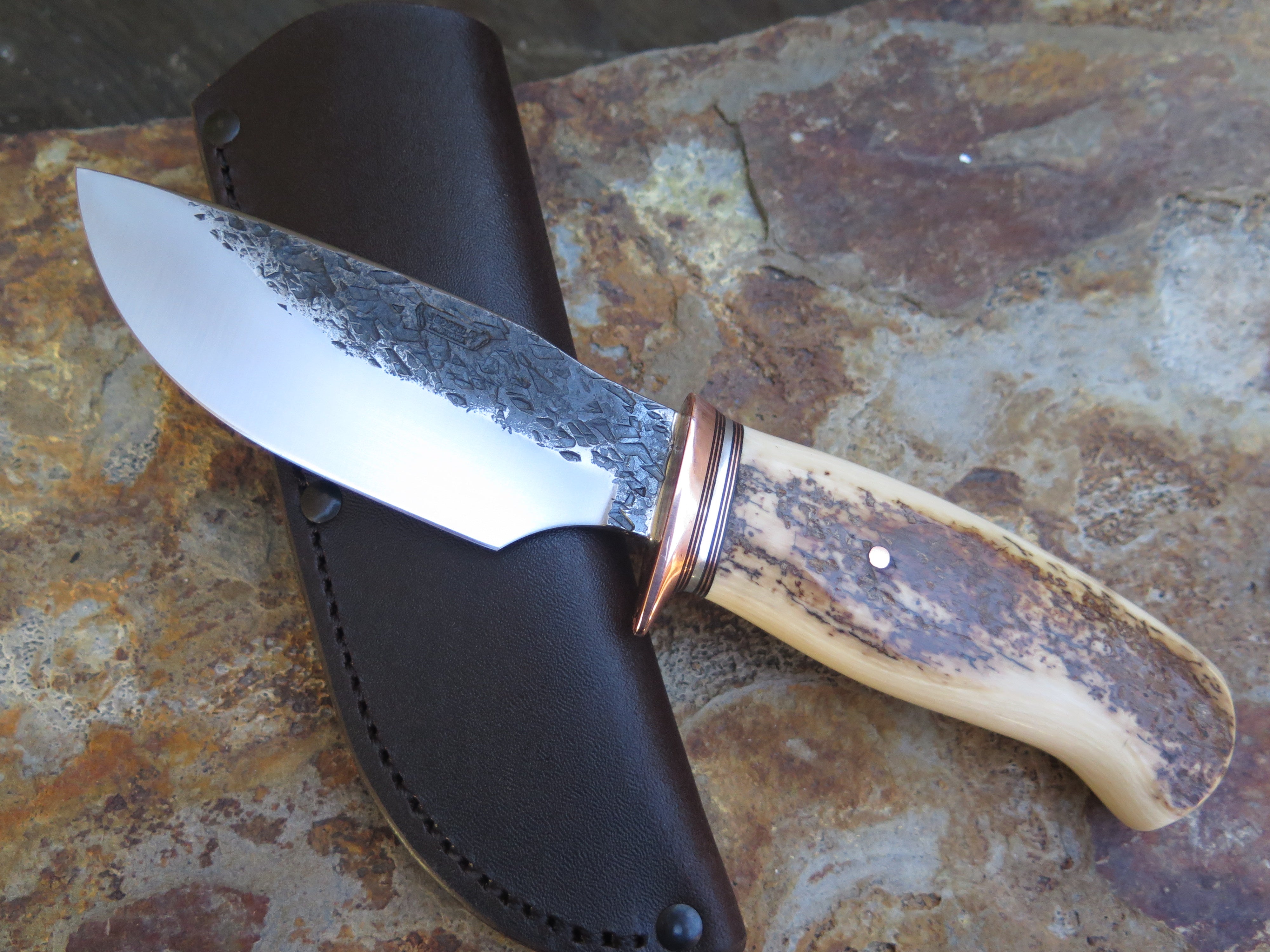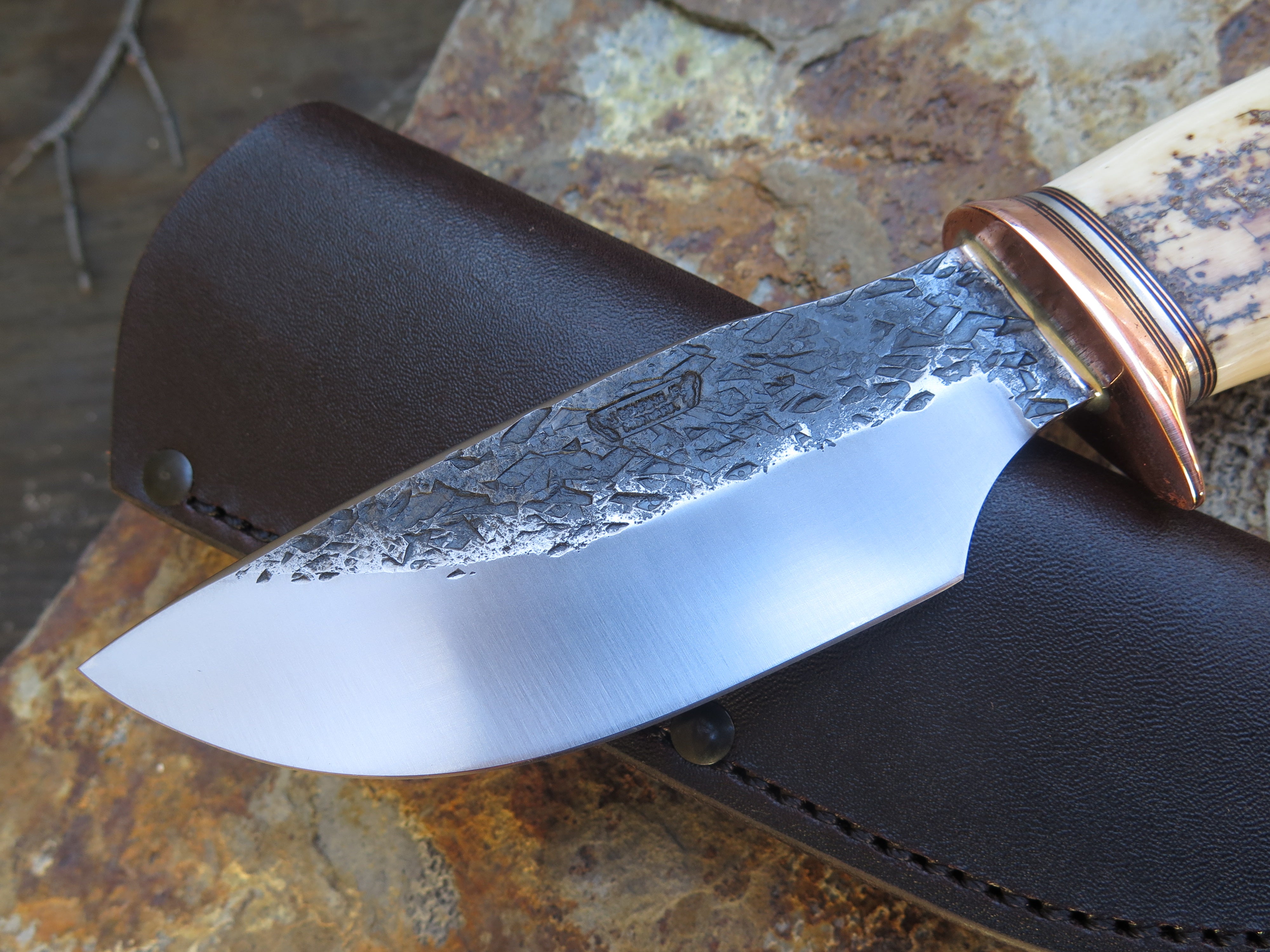 This astounding Alaskan from Behring Made© is hand forged from 3/16" thick high carbon 01 tool steel and it measures 4 3/4" from tip to guard with a razor sharp hollow grind and our hammermark finish. The copper guard is soldered in place above black fiber, copper and aluminum spacers which transition to a remarkable ancient mammoth ivory handle that is pinned through the tang with copper. The overall length is just about 9 1/4" and it comes in a classic leather belt pouch sheath.