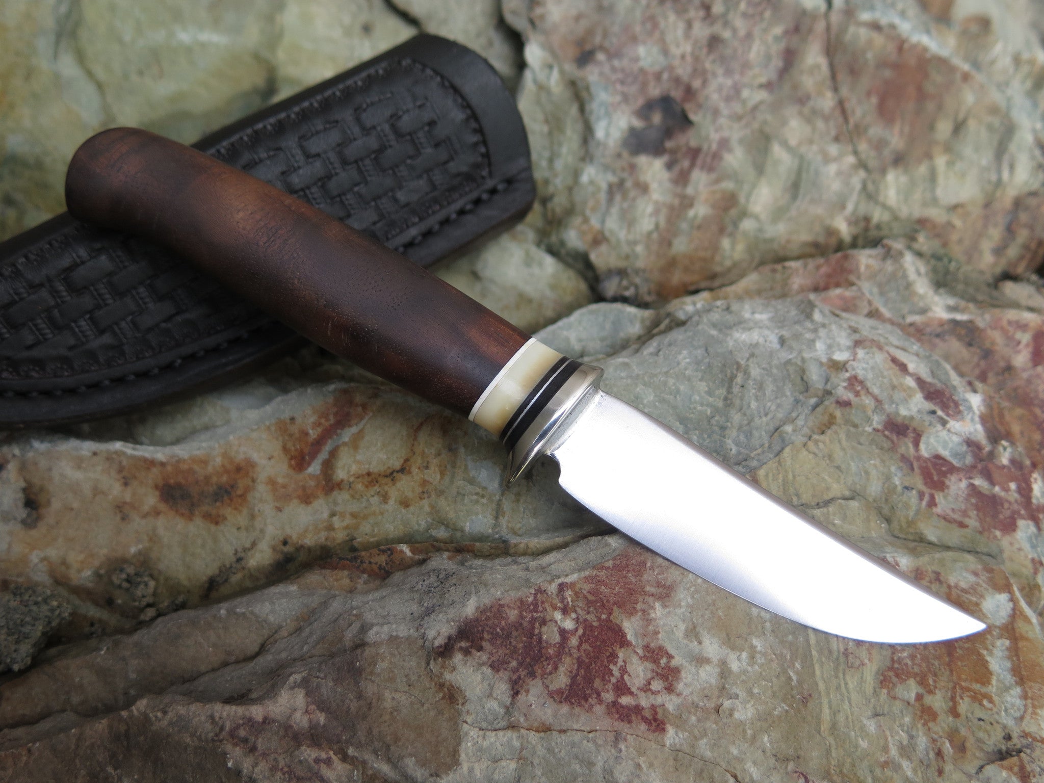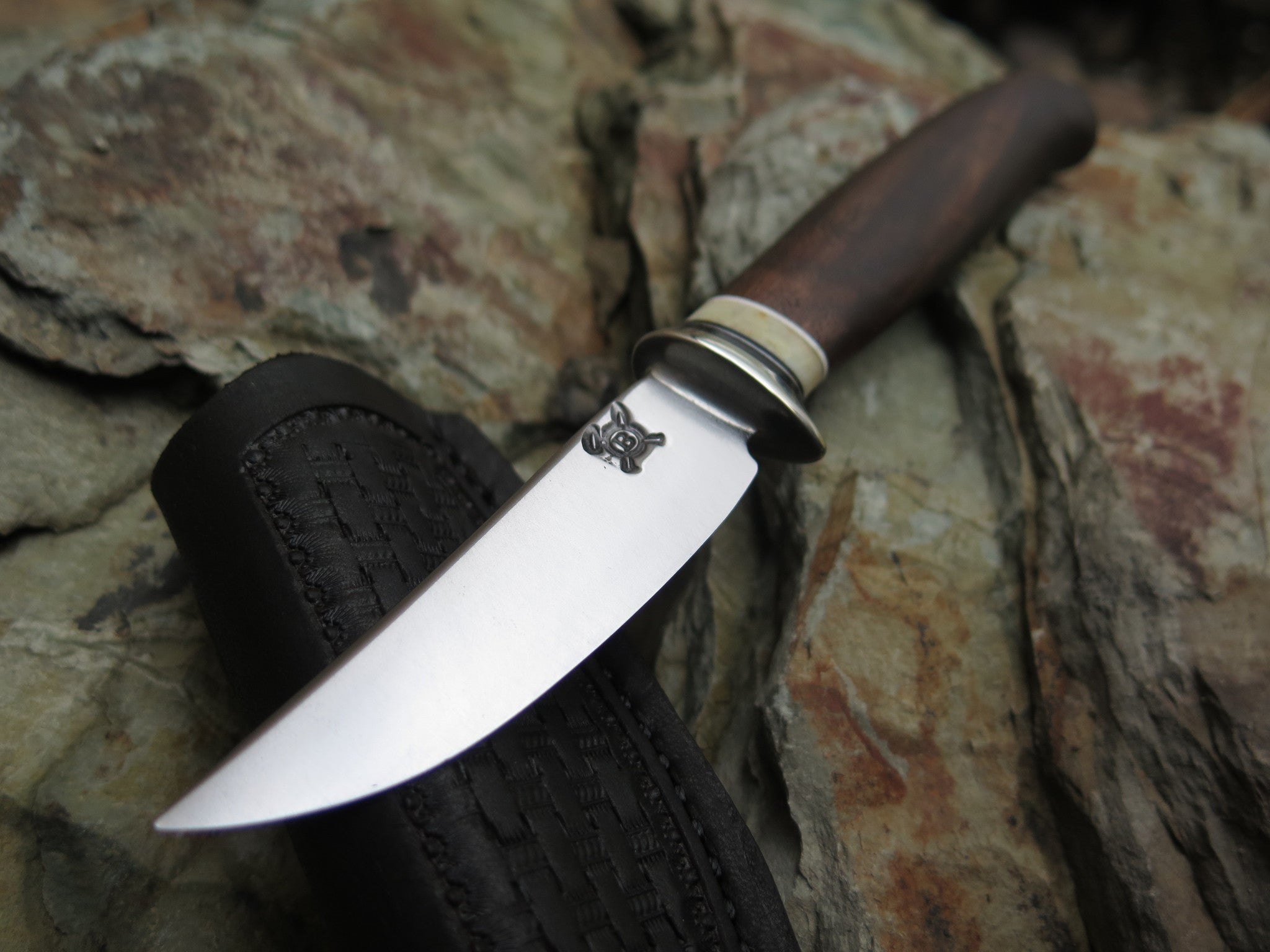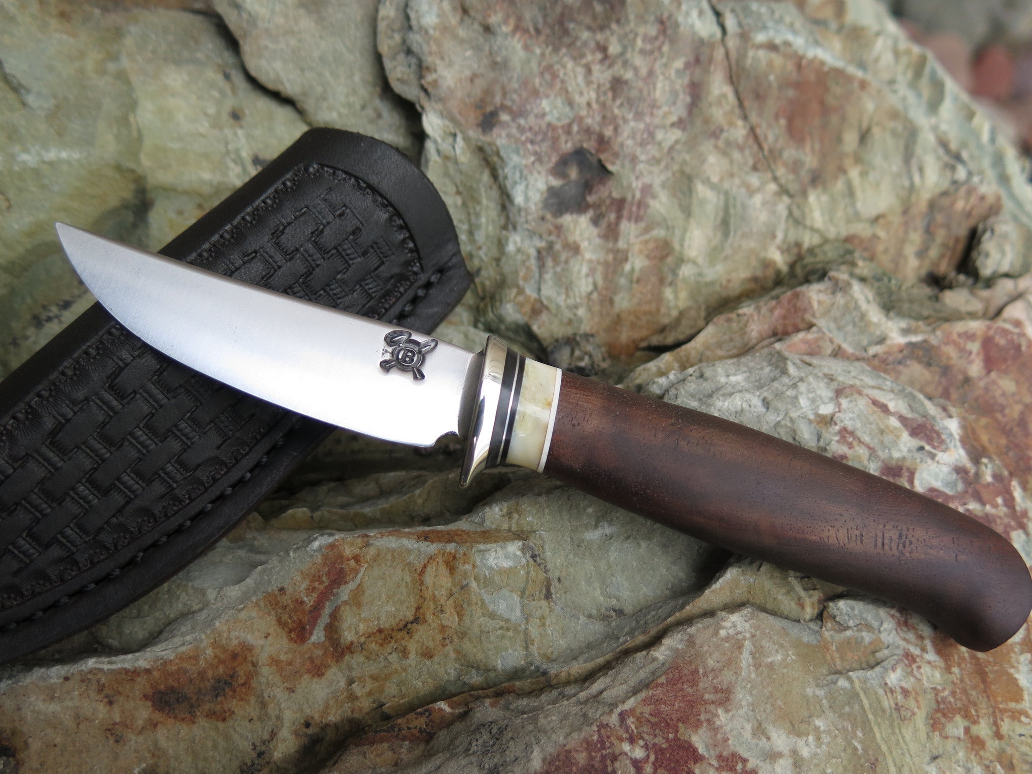 This beautiful Behring Made fits right inside the pocket with ease like any folding knife, with the integrity of a fixed blade. Hand forged from high carbon 01 tool steel, this convenient razor sharp convex edge measures just over 2". The nickel silver guard is soldered in place above black, white, aluminum and walrus ivory spacers as well as a beautiful walnut handle. The overall length measures just under 5 1/2" and it comes in a pocket sheath from Glacier Leather.
