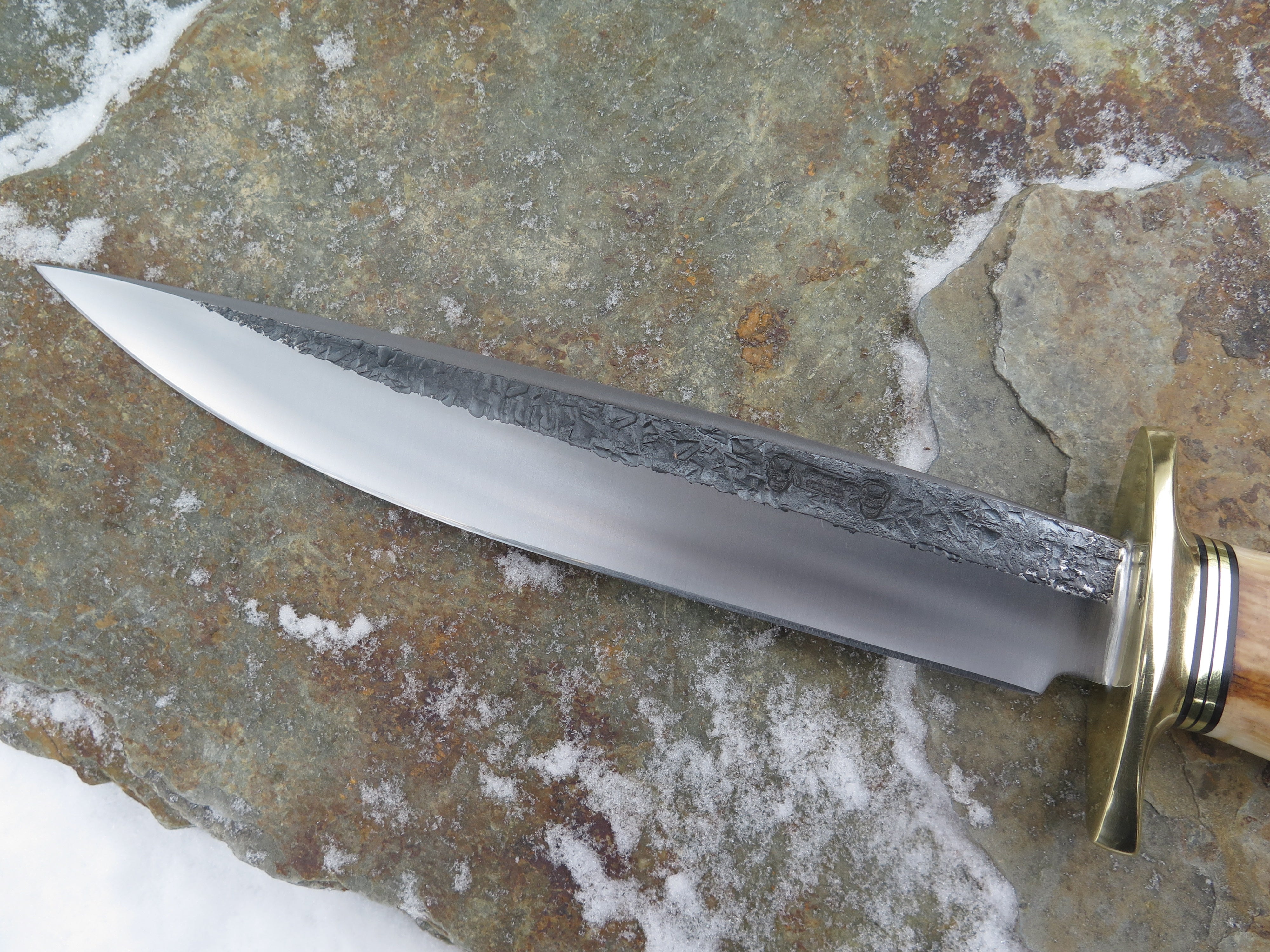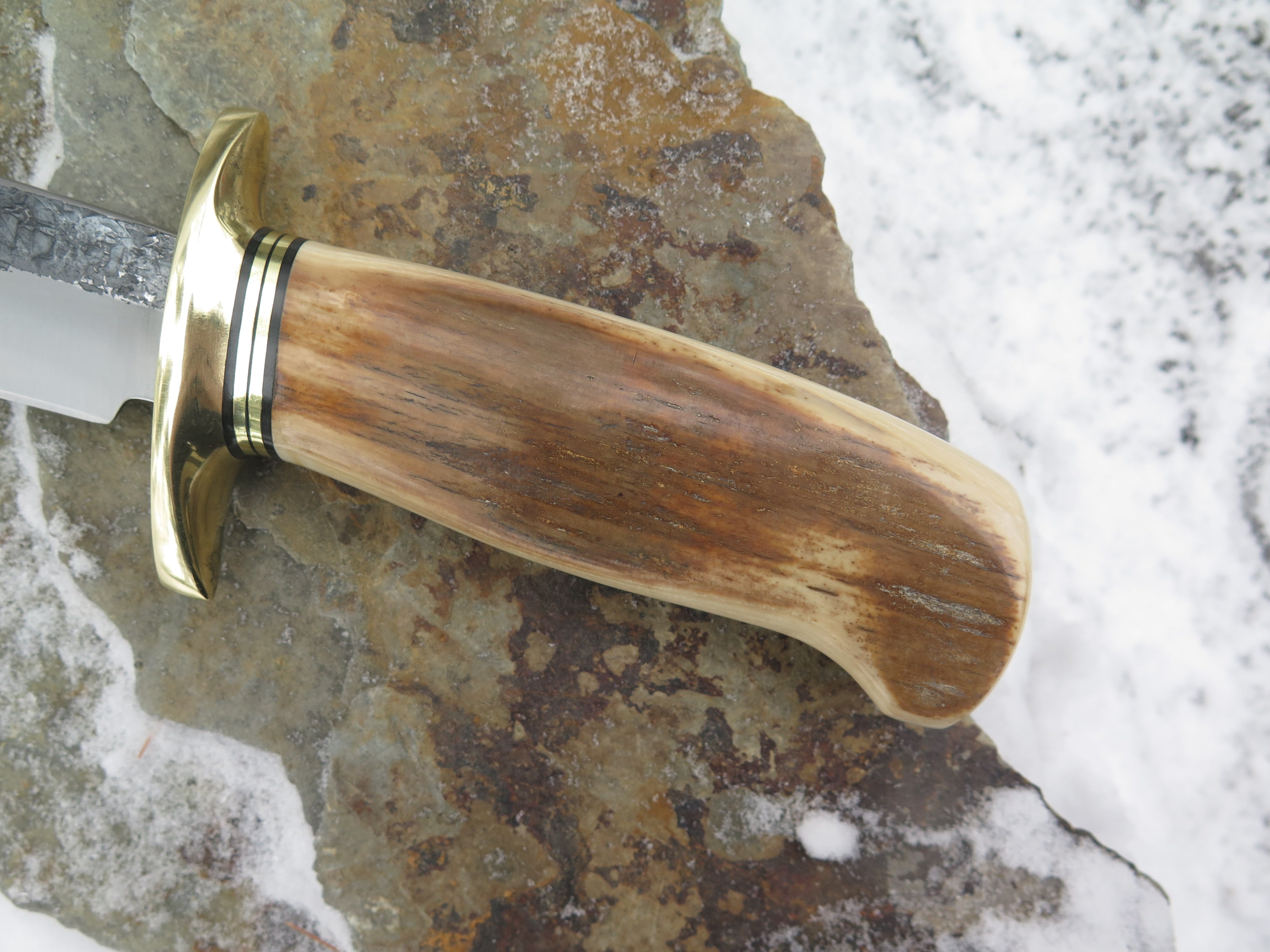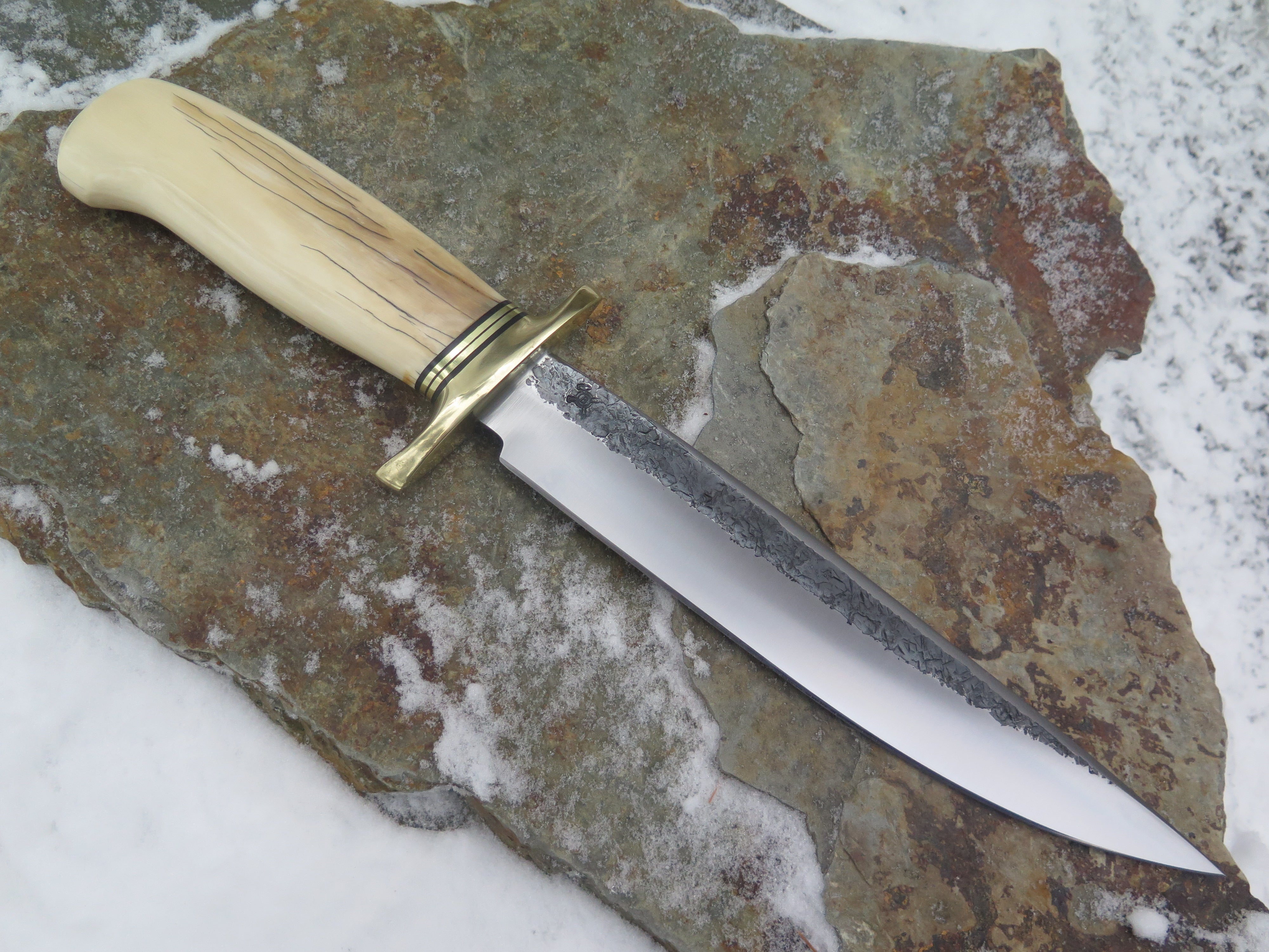 This beastly new creation is the Behring Made© XL Field Knife It's hand forged from 13/64" 5160 spring steel and the blade measures 8 1/2" from tip to guard with a razor sharp hollow grind and our hammermark finish. The tall brass guard is soldered in place above black fiber and brass spacers as well as a beautiful ancient mammoth ivory handle featuring a crow's beak grind. The overall length measures 13 3/4" and it will come in a custom sheath.