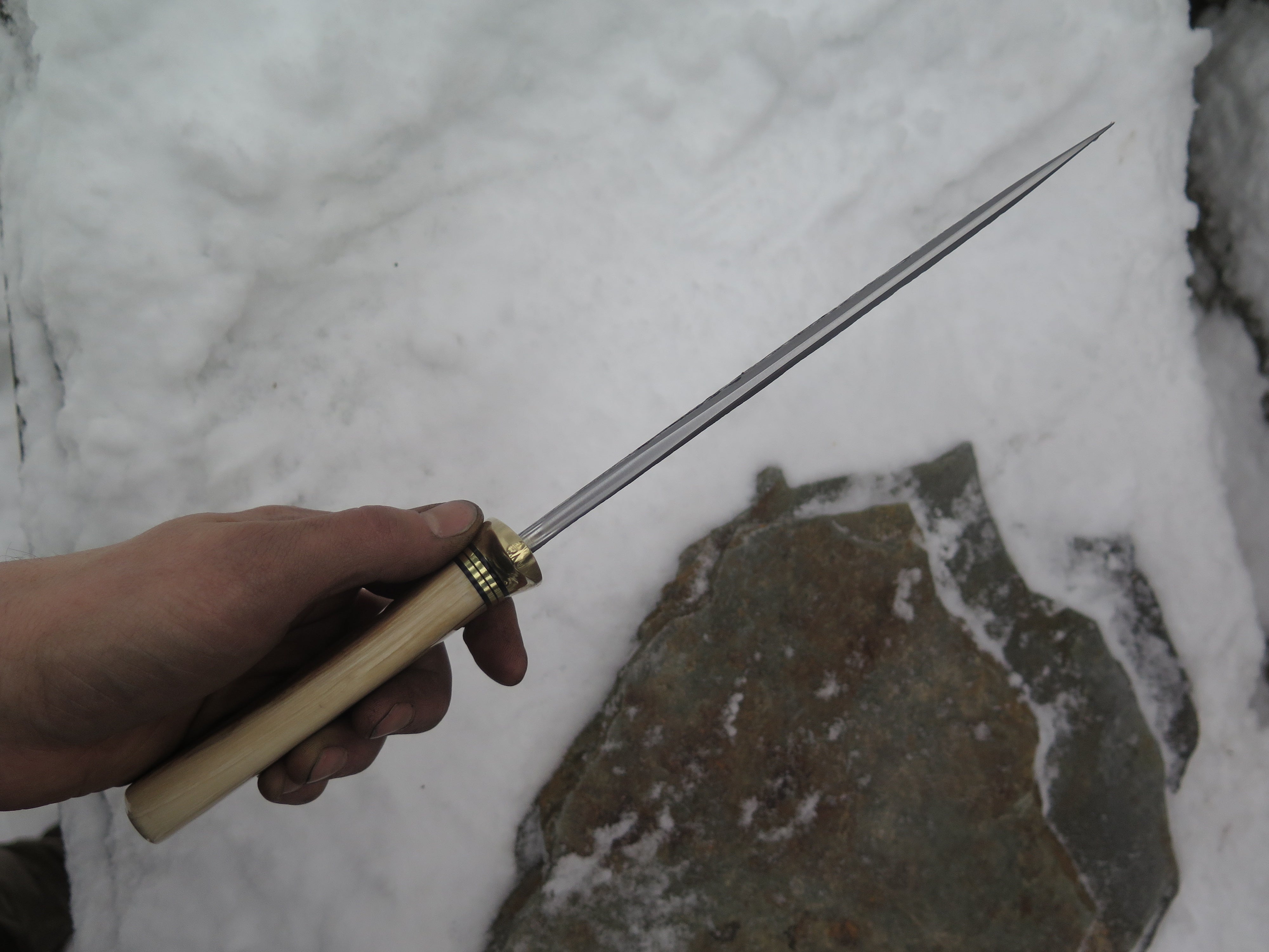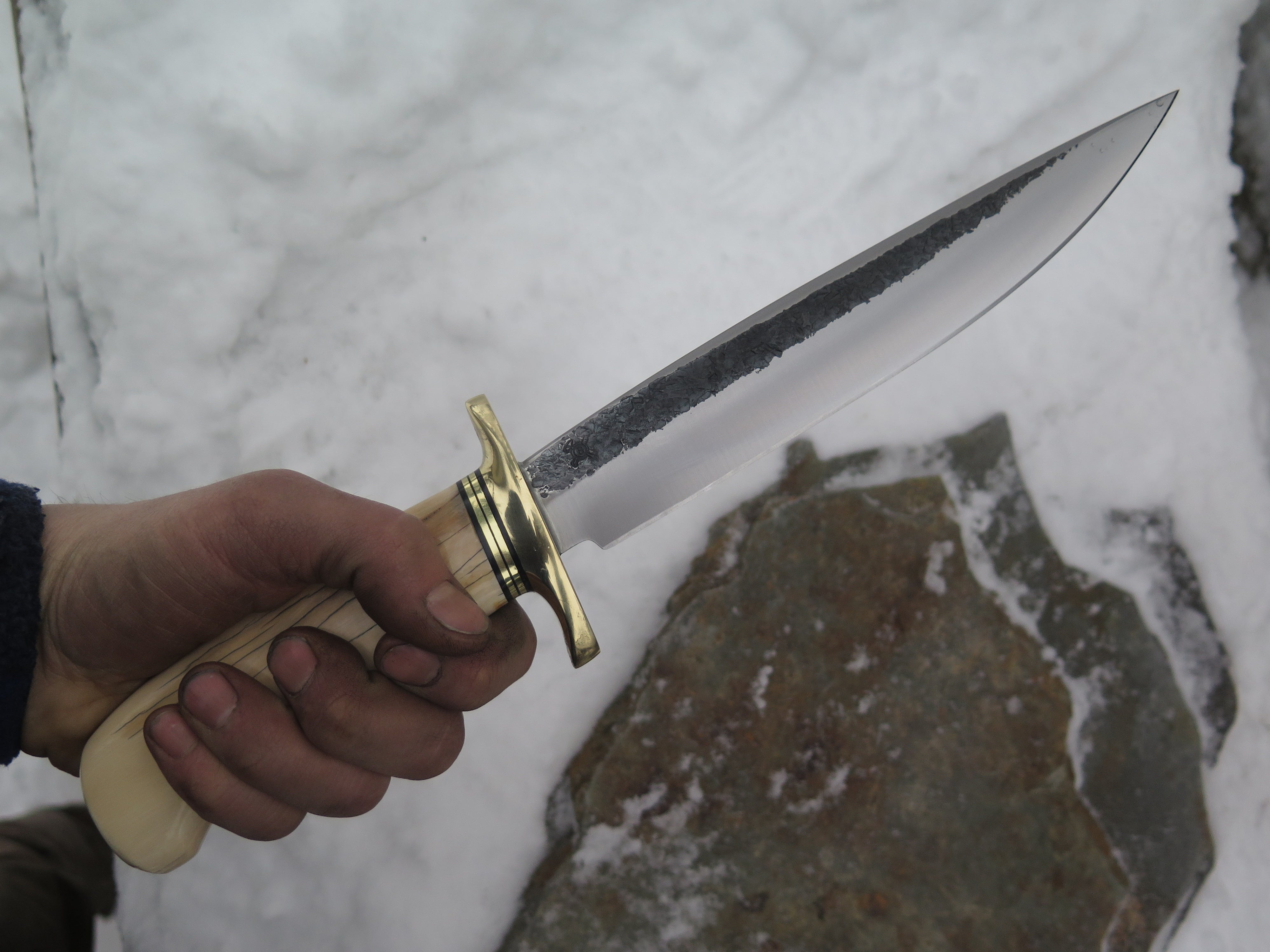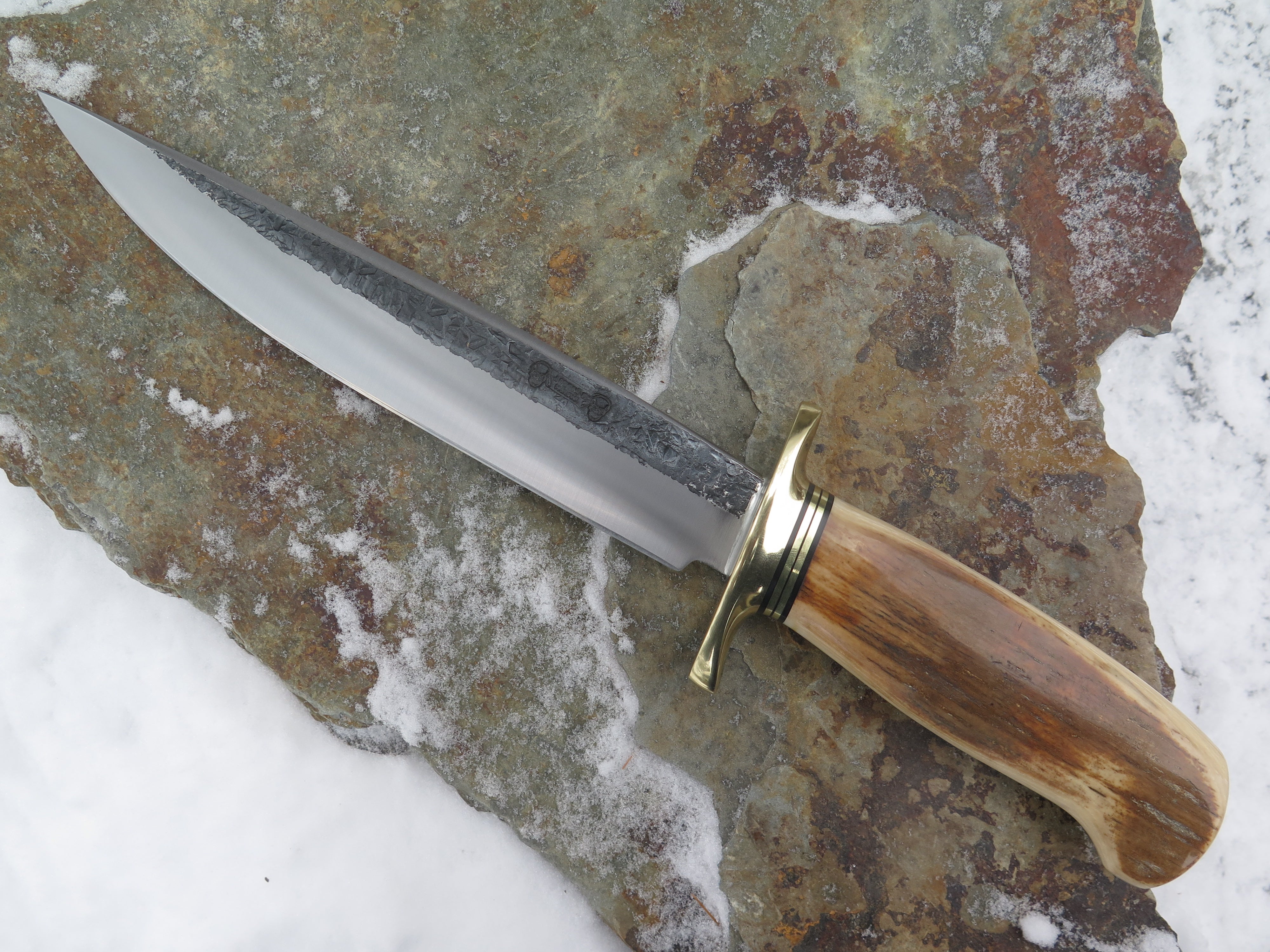 This beastly new creation is the Behring Made© XL Field Knife It's hand forged from 13/64" 5160 spring steel and the blade measures 8 1/2" from tip to guard with a razor sharp hollow grind and our hammermark finish. The tall brass guard is soldered in place above black fiber and brass spacers as well as a beautiful ancient mammoth ivory handle featuring a crow's beak grind. The overall length measures 13 3/4" and it will come in a custom sheath.