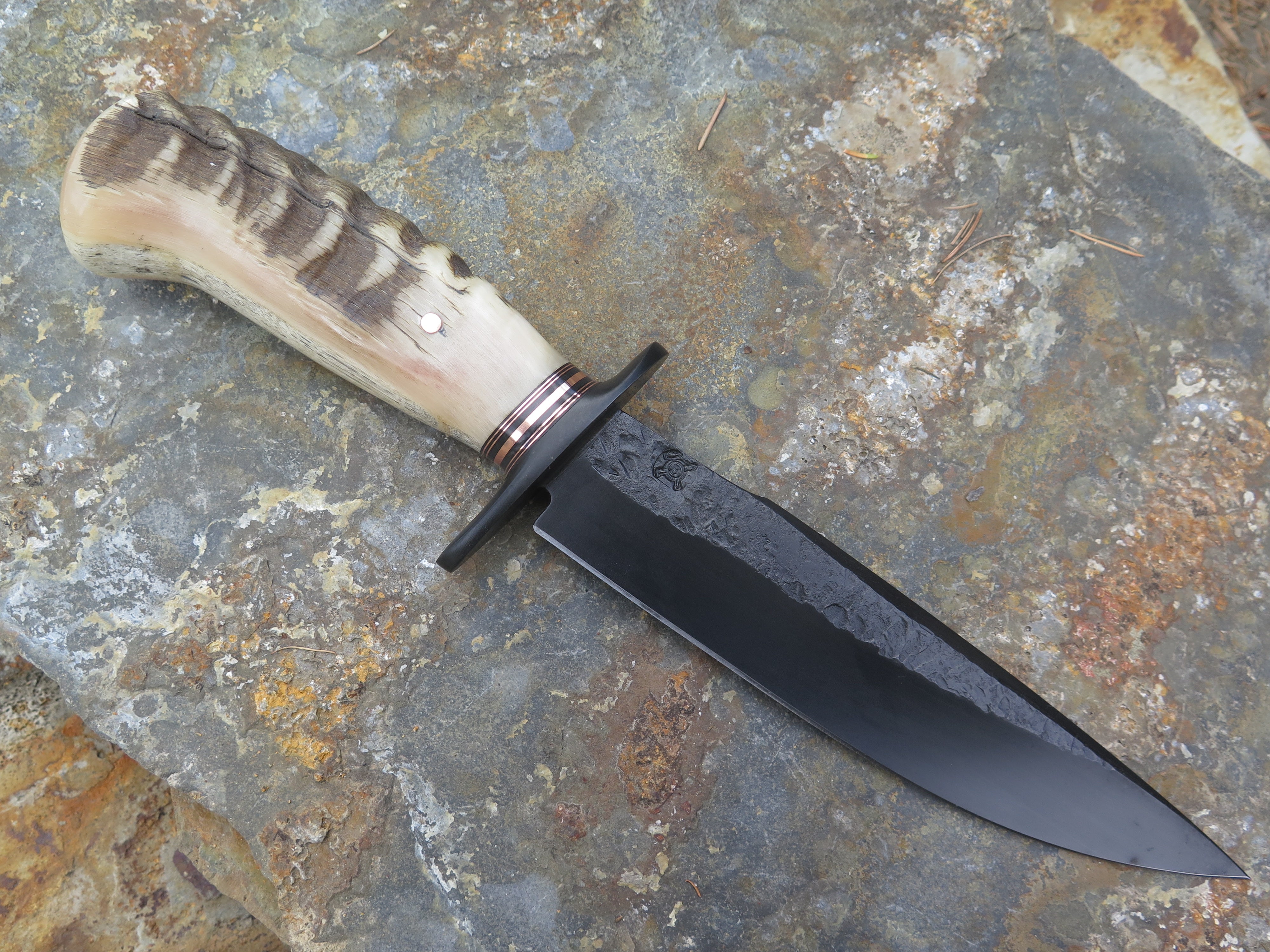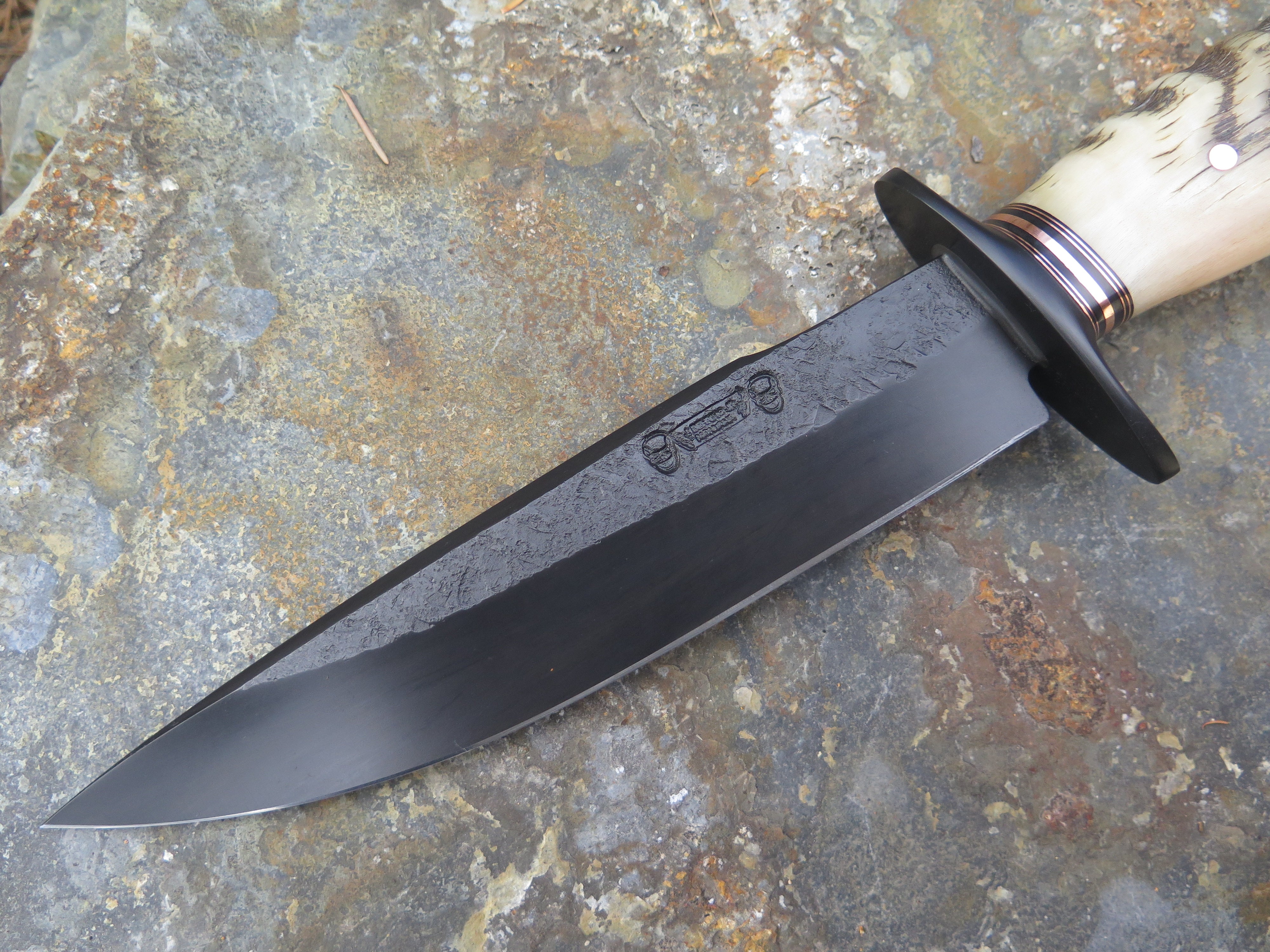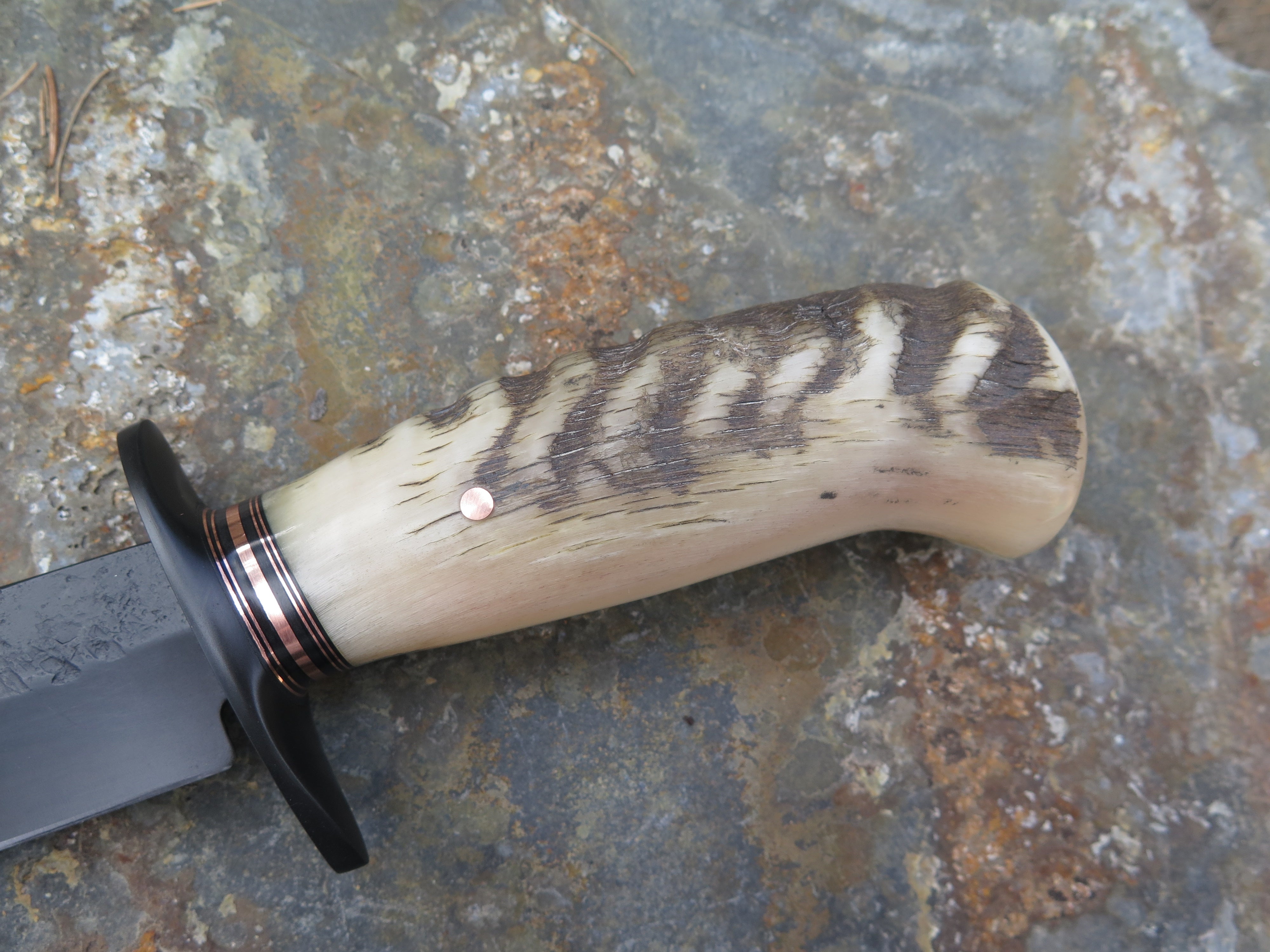This beautiful new modified Field Knife from Behring Made© is hand forged from 13/64" thick 5160 spring steel and it measures 7" from tip to guard with a razor sharp hollow grind, hammermarks and our forced patina blued finish. The tall blued steel guard is soldered in place above black fiber and copper spacers as well as a premium section Dall's sheep horn handle with a texture that wraps around both sides with a copper pin running through the tang. The overall length measures 11 1/2" and it will come in a custom sheath.