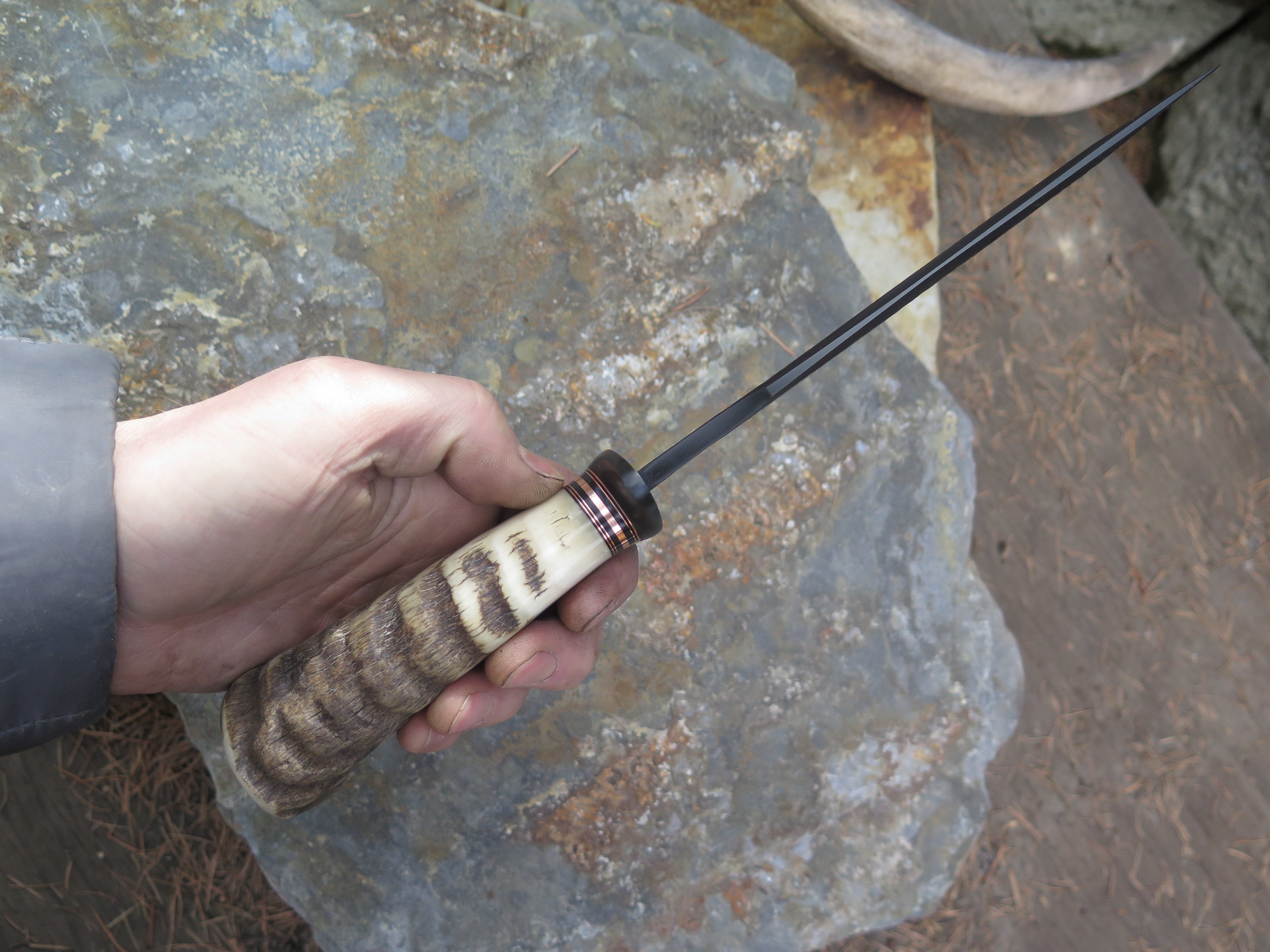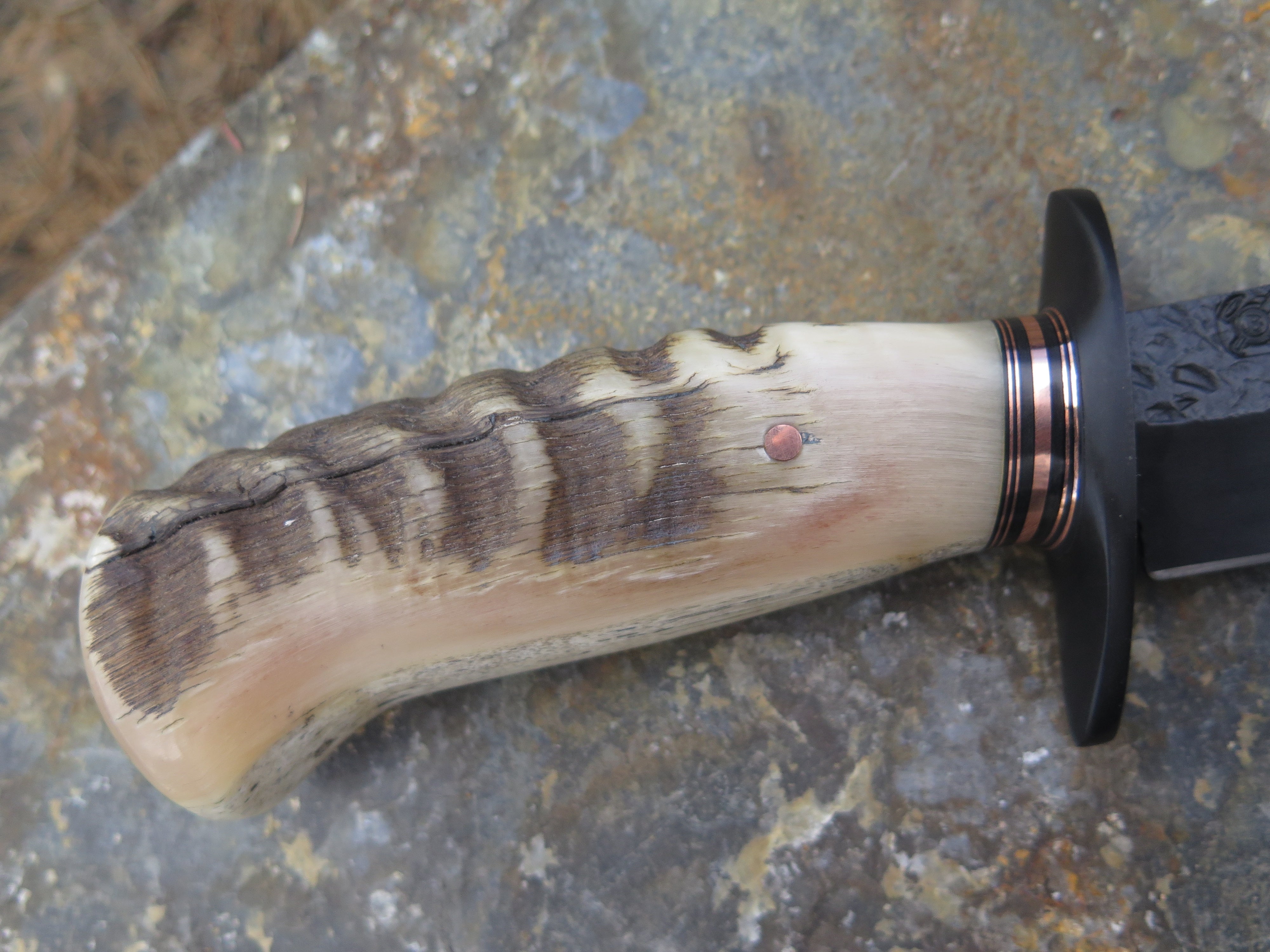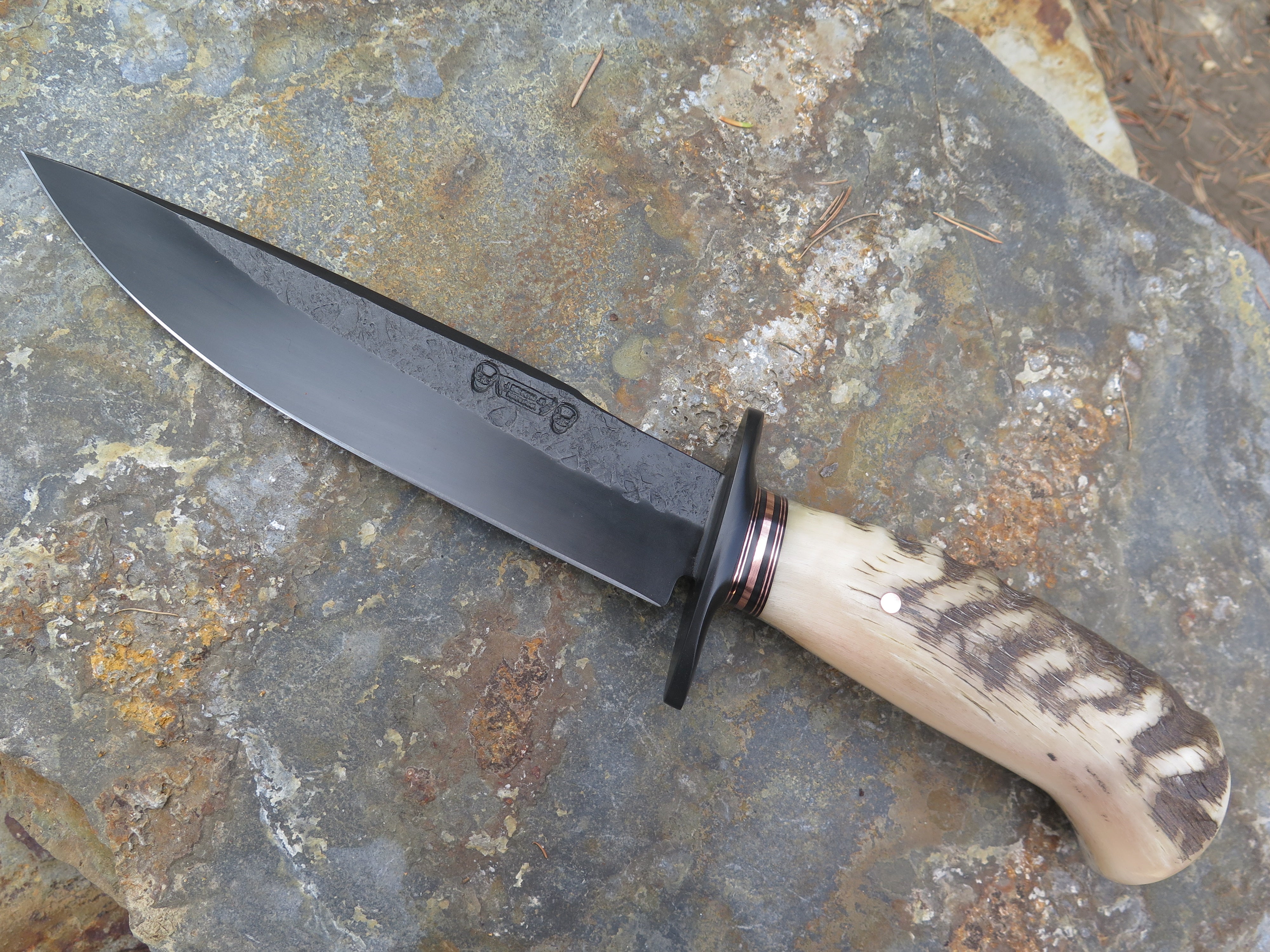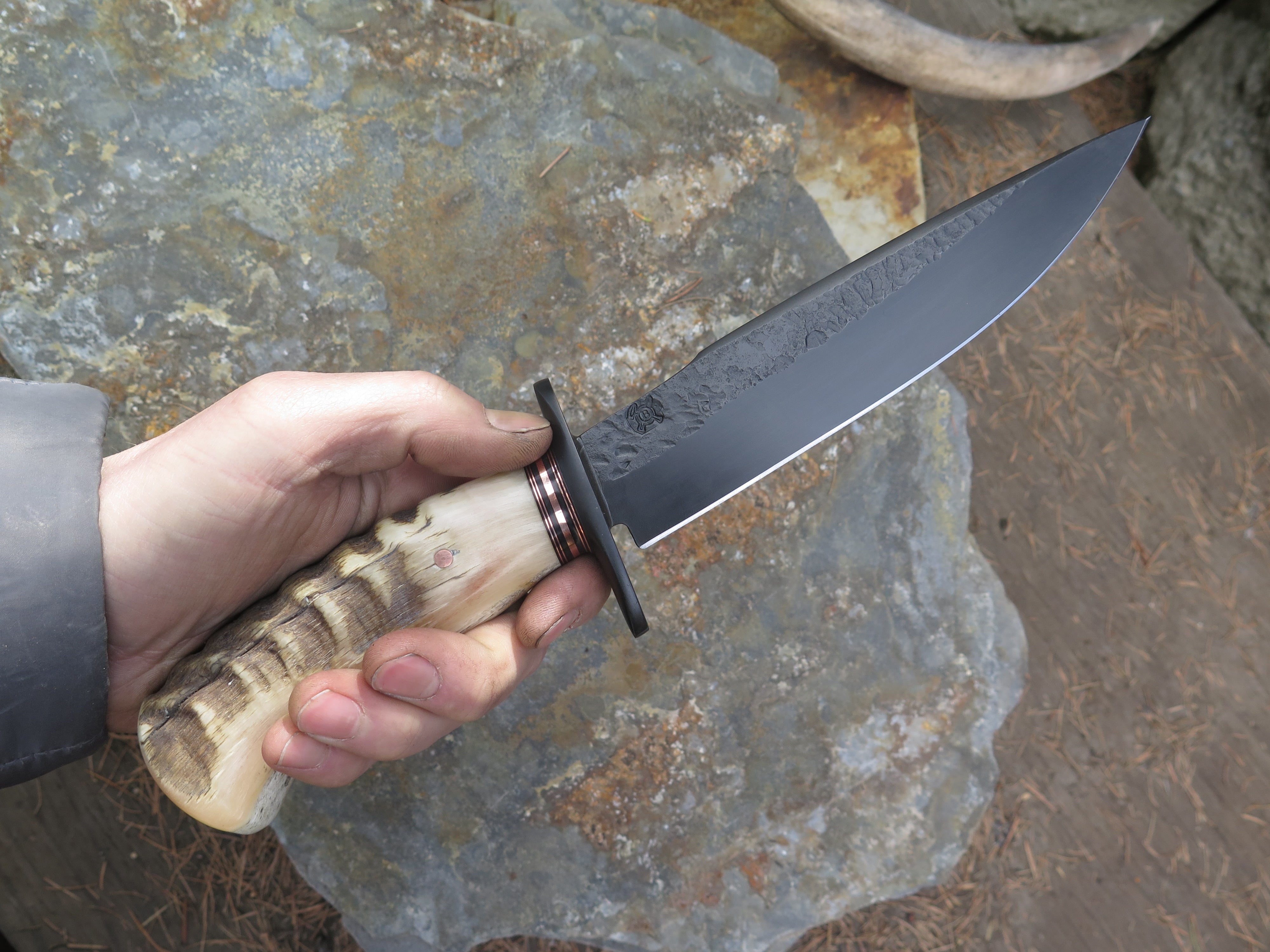 This beautiful new modified Field Knife from Behring Made© is hand forged from 13/64" thick 5160 spring steel and it measures 7" from tip to guard with a razor sharp hollow grind, hammermarks and our forced patina blued finish. The tall blued steel guard is soldered in place above black fiber and copper spacers as well as a premium section Dall's sheep horn handle with a texture that wraps around both sides with a copper pin running through the tang. The overall length measures 11 1/2" and it will come in a custom sheath.