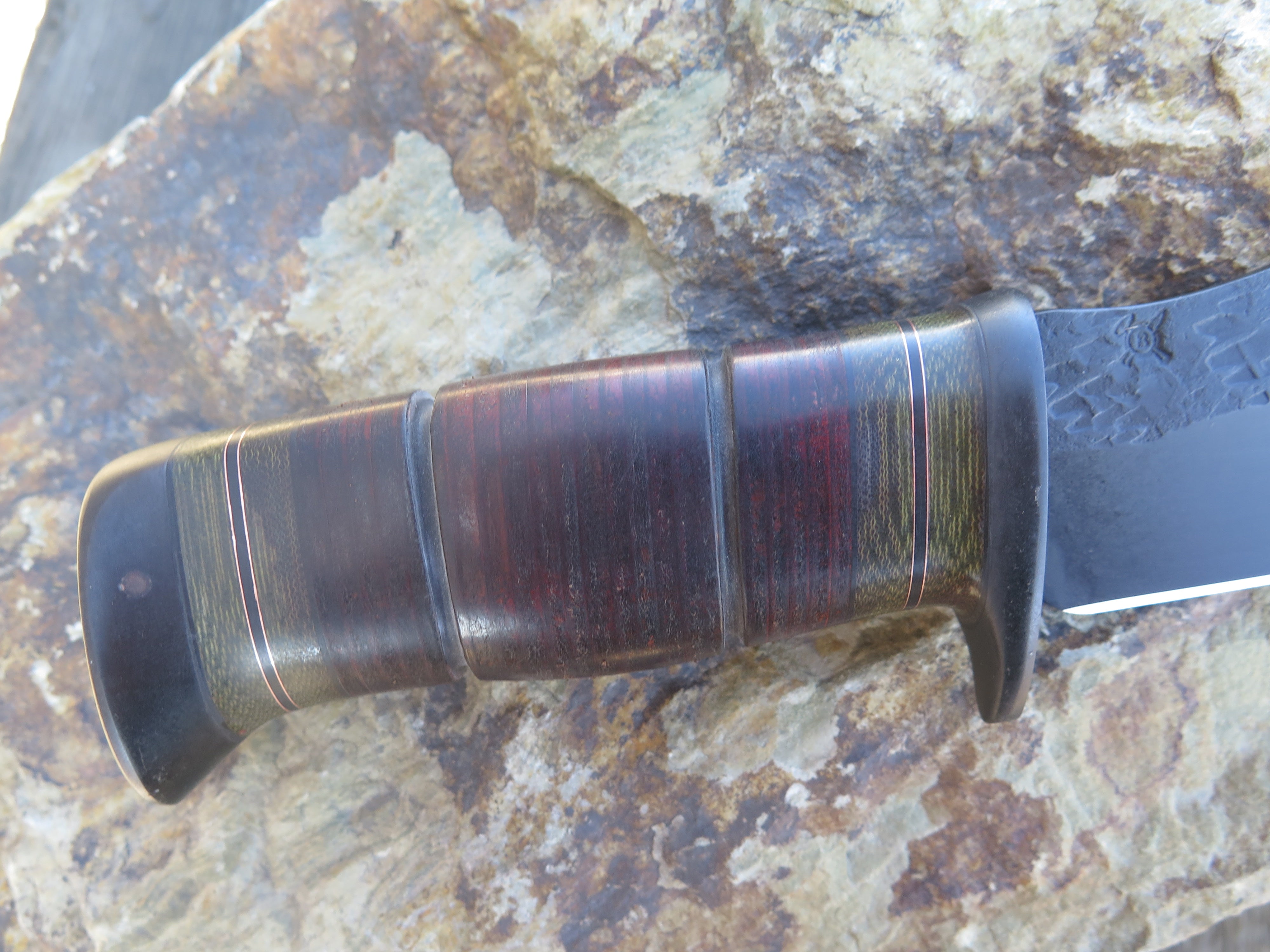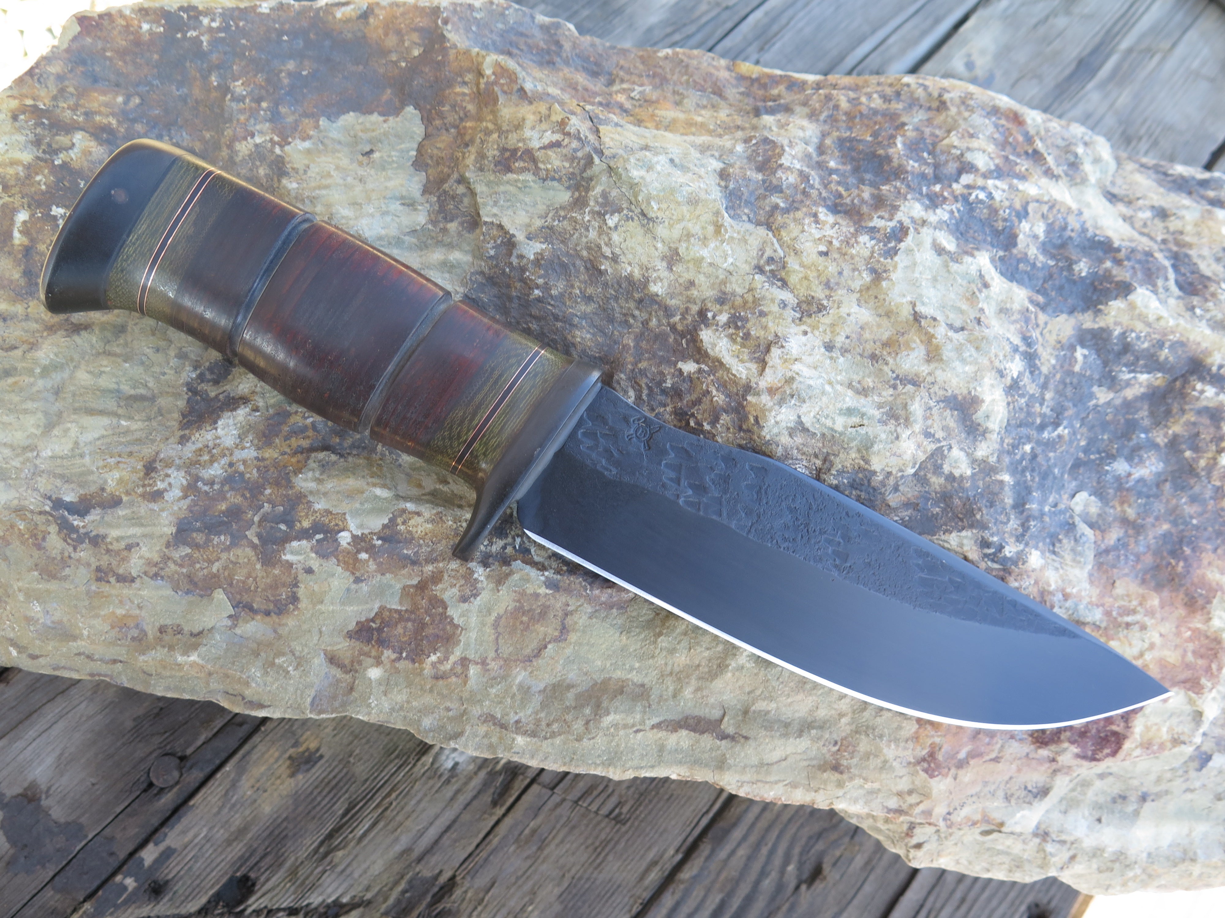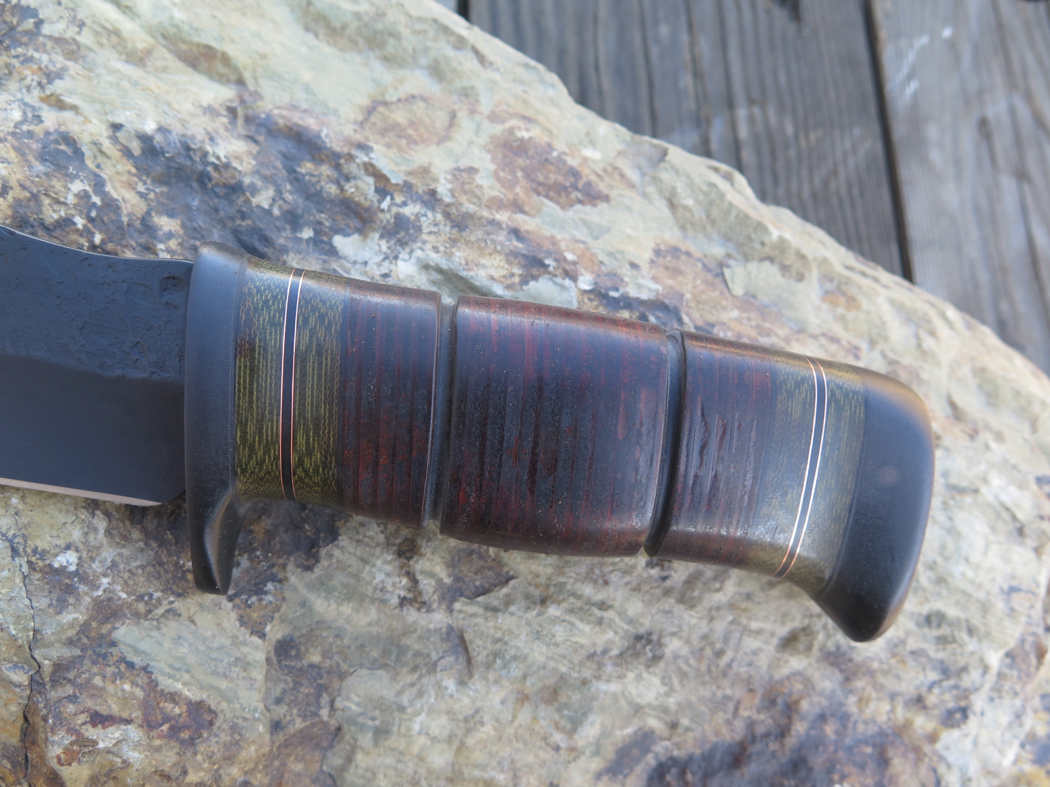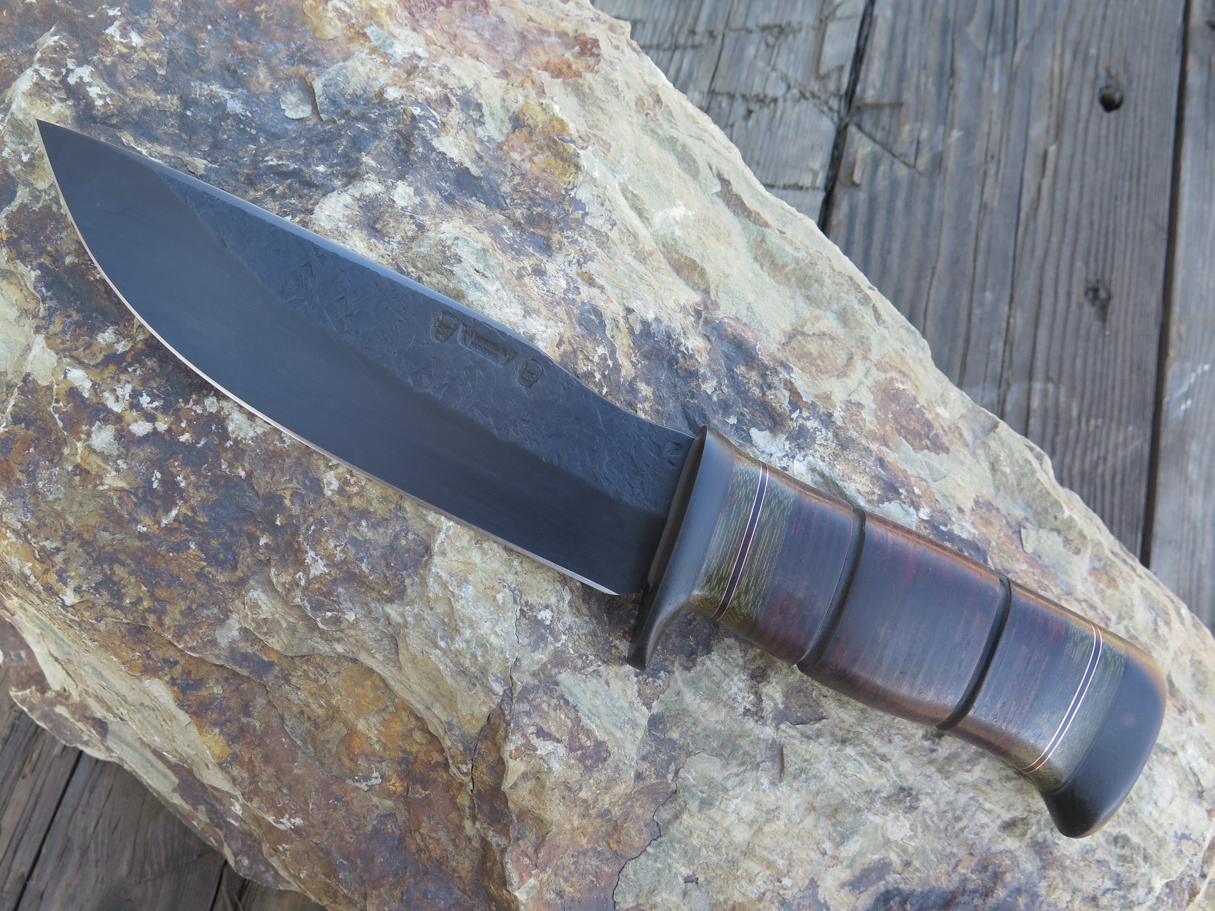 This behemoth of a Drop Point from Behring Made© is hand forged from 1/4" thick 5160 spring steel and it measures 6 1/2" from tip to guard with a razor sharp hollow grind, hammermarks and our forced patina blued finish. The blued steel guard is soldered in place above black fiber, green micarta and copper spacers in addition the the WWII style stack of horsehide leather that is capped with steel and pinned through the tang. The overall length measures 11 1/8" and this one comes with a custom sheath from Warlander Leather in style of your choosing.