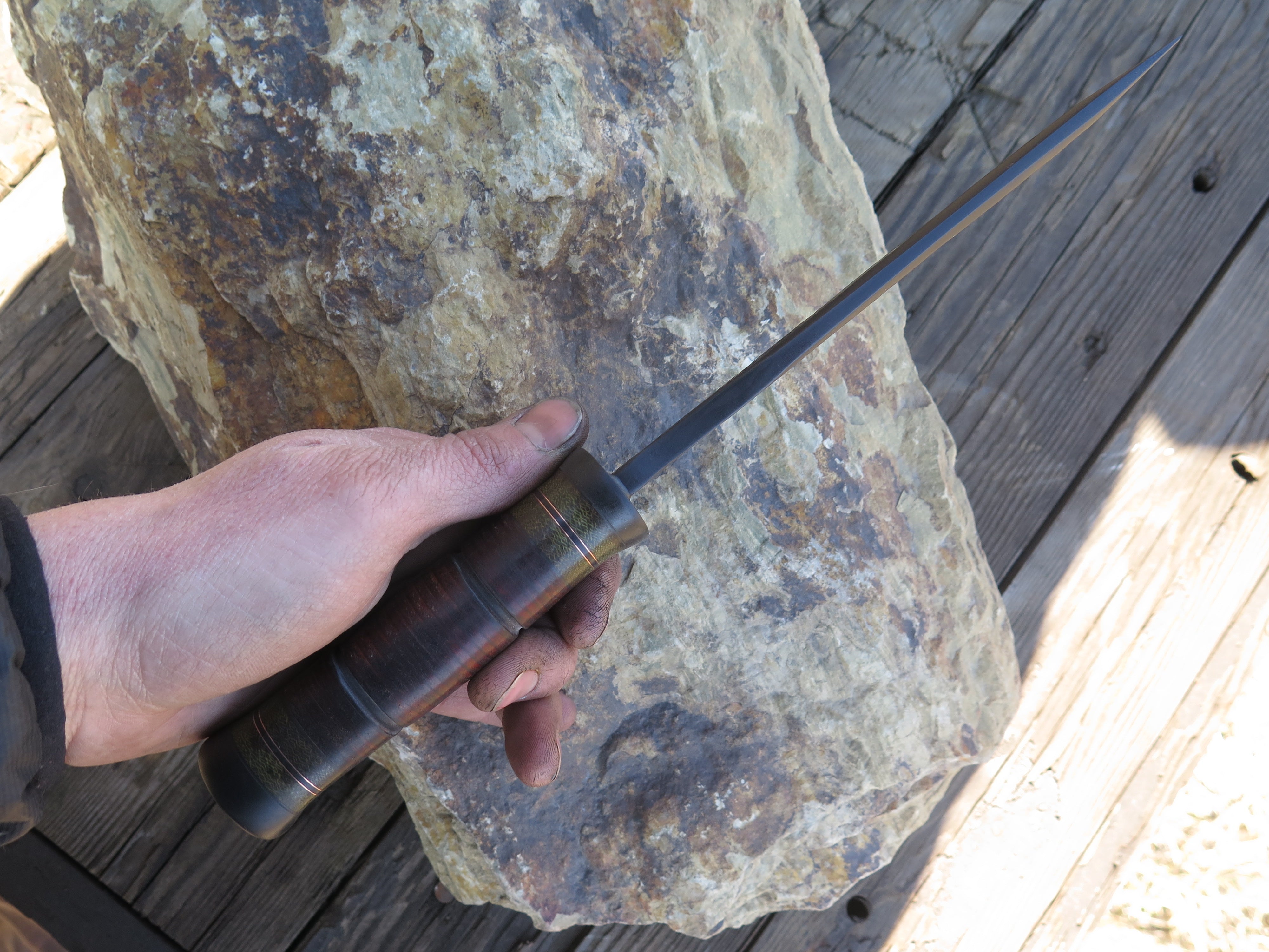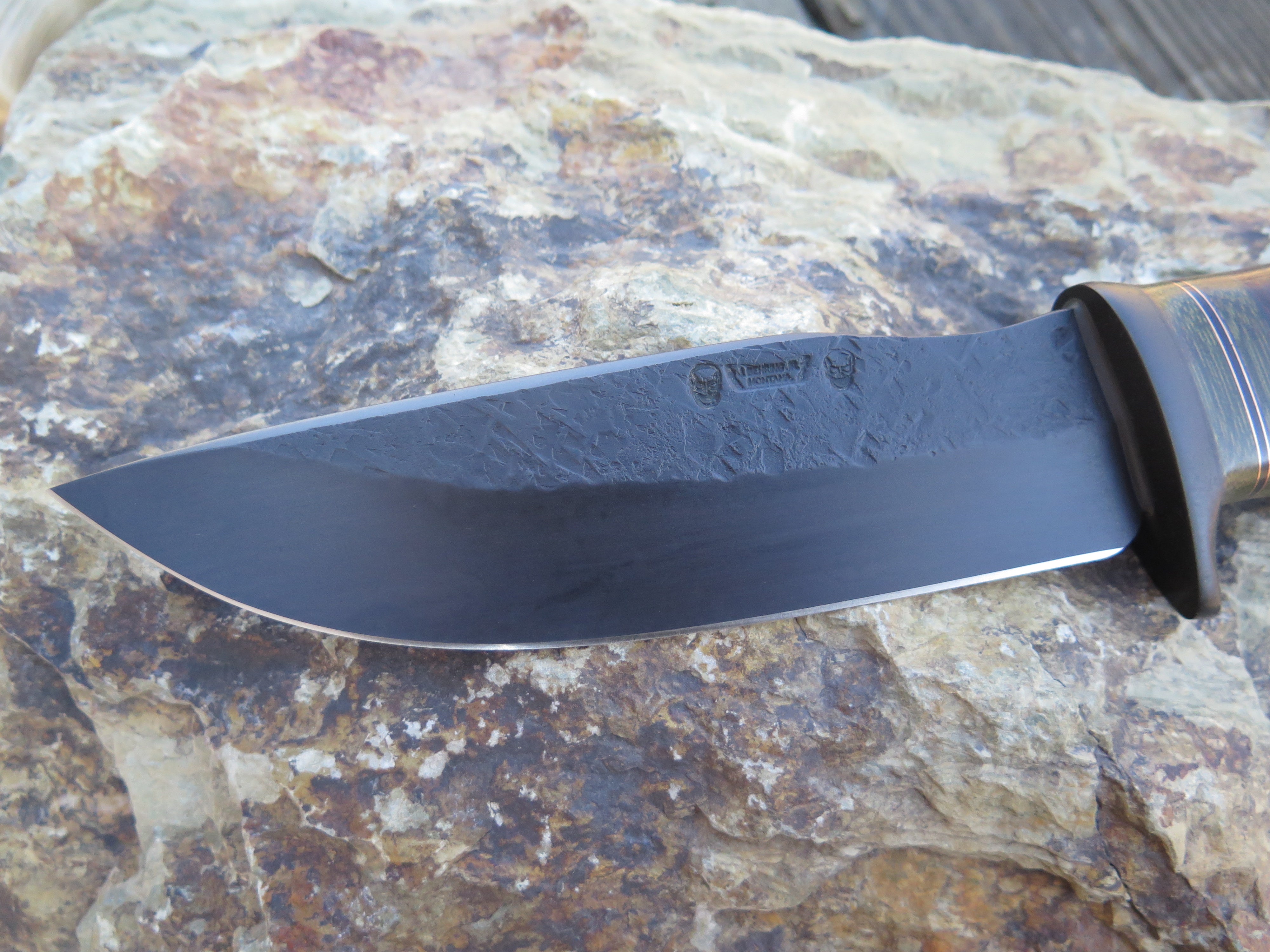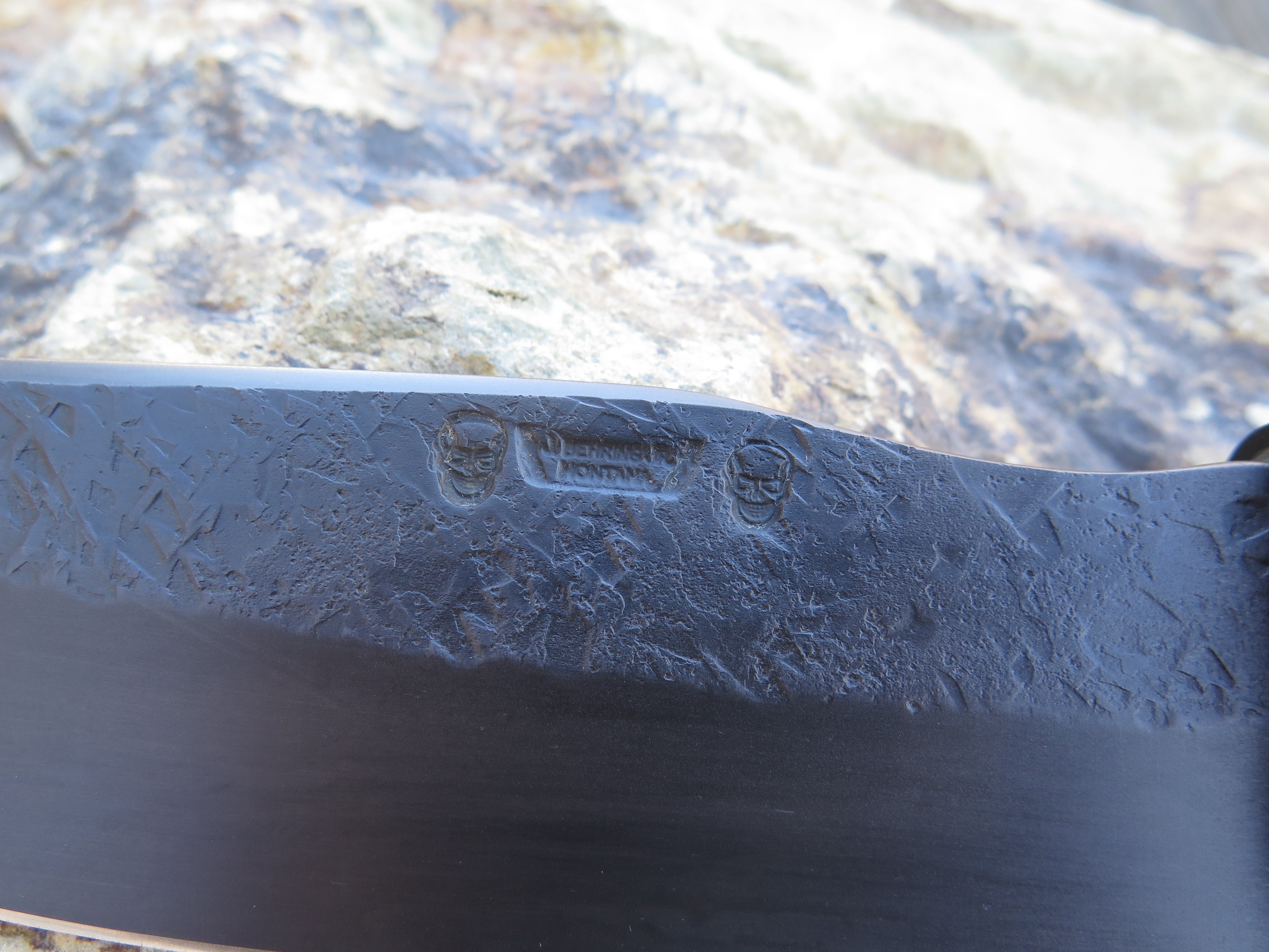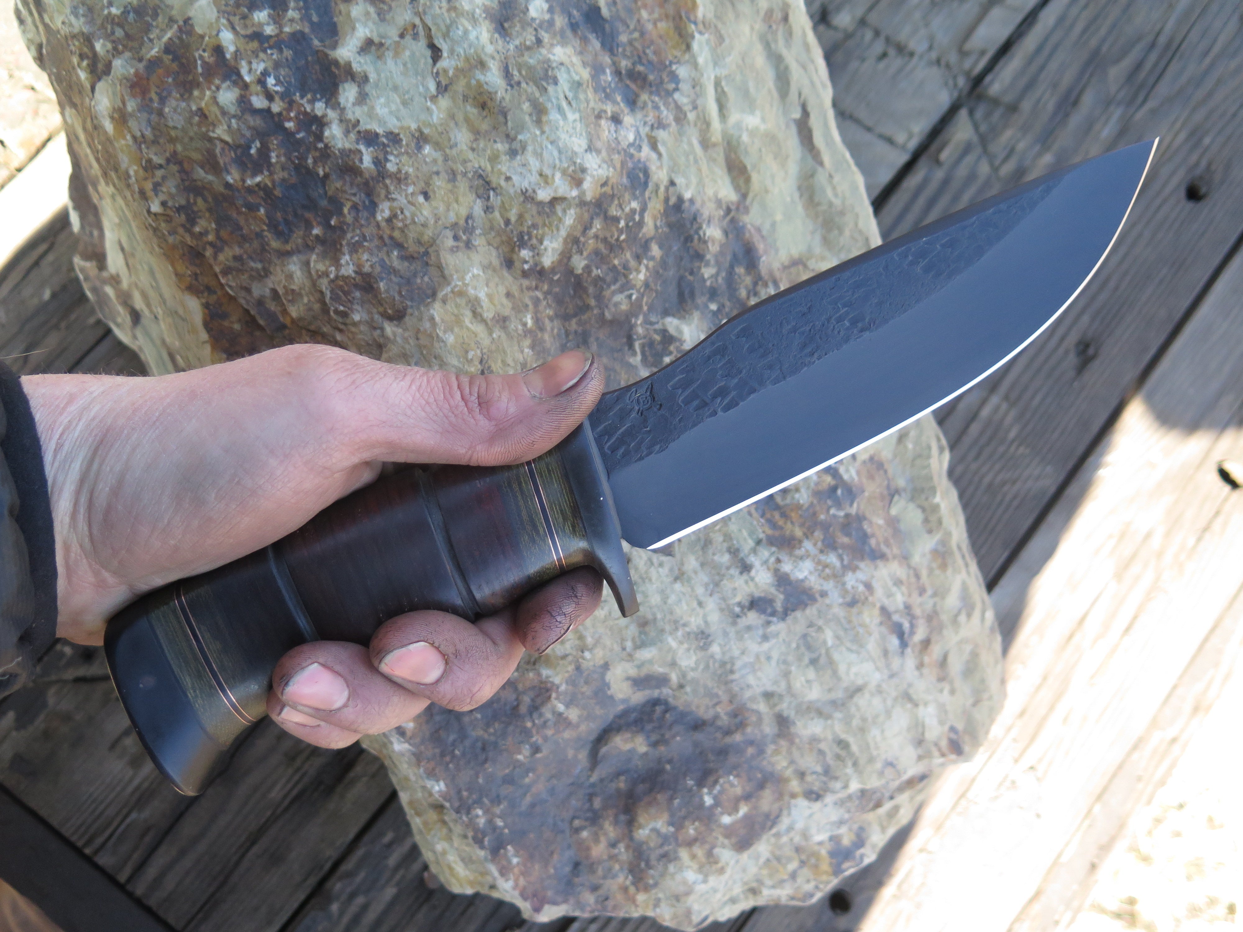 This behemoth of a Drop Point from Behring Made© is hand forged from 1/4" thick 5160 spring steel and it measures 6 1/2" from tip to guard with a razor sharp hollow grind, hammermarks and our forced patina blued finish. The blued steel guard is soldered in place above black fiber, green micarta and copper spacers in addition the the WWII style stack of horsehide leather that is capped with steel and pinned through the tang. The overall length measures 11 1/8" and this one comes with a custom sheath from Warlander Leather in style of your choosing.