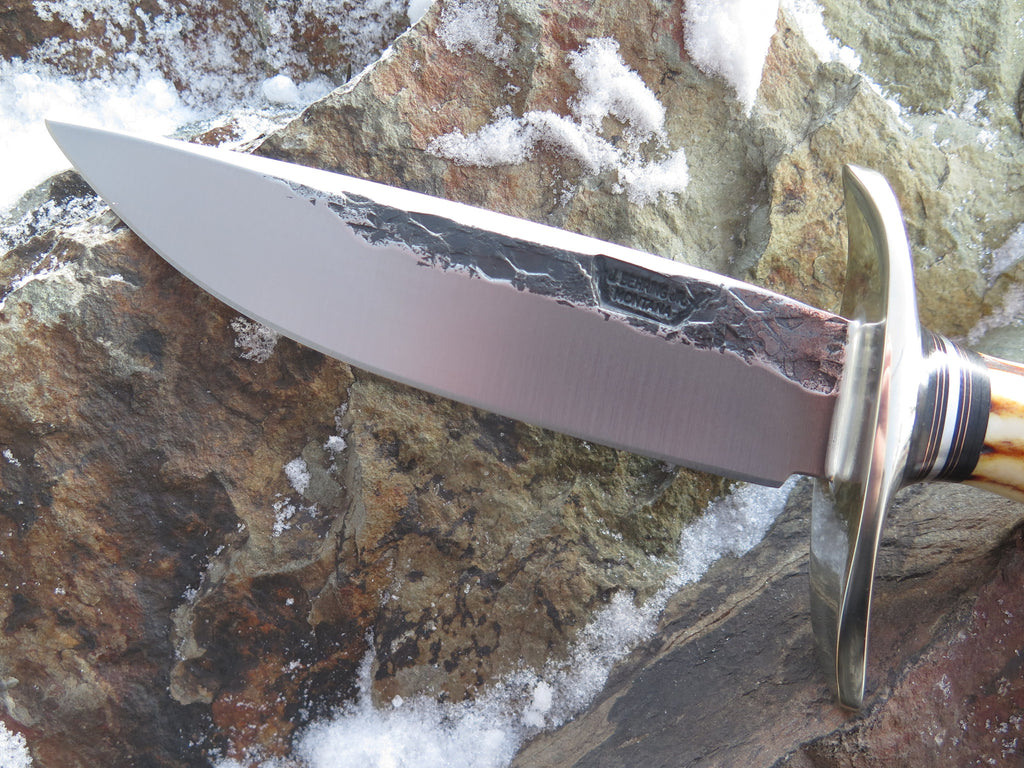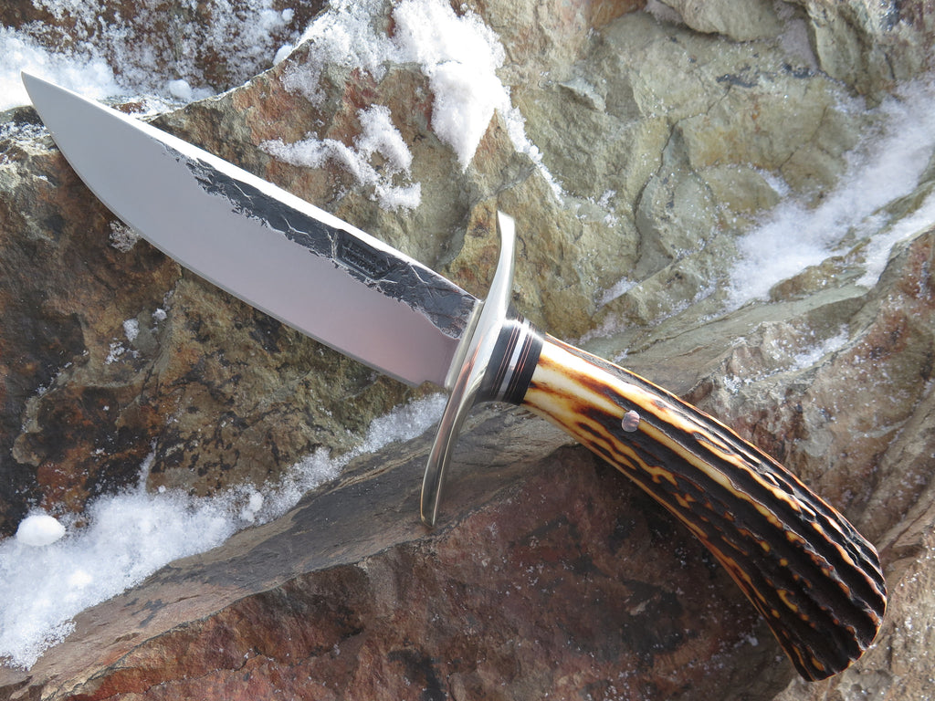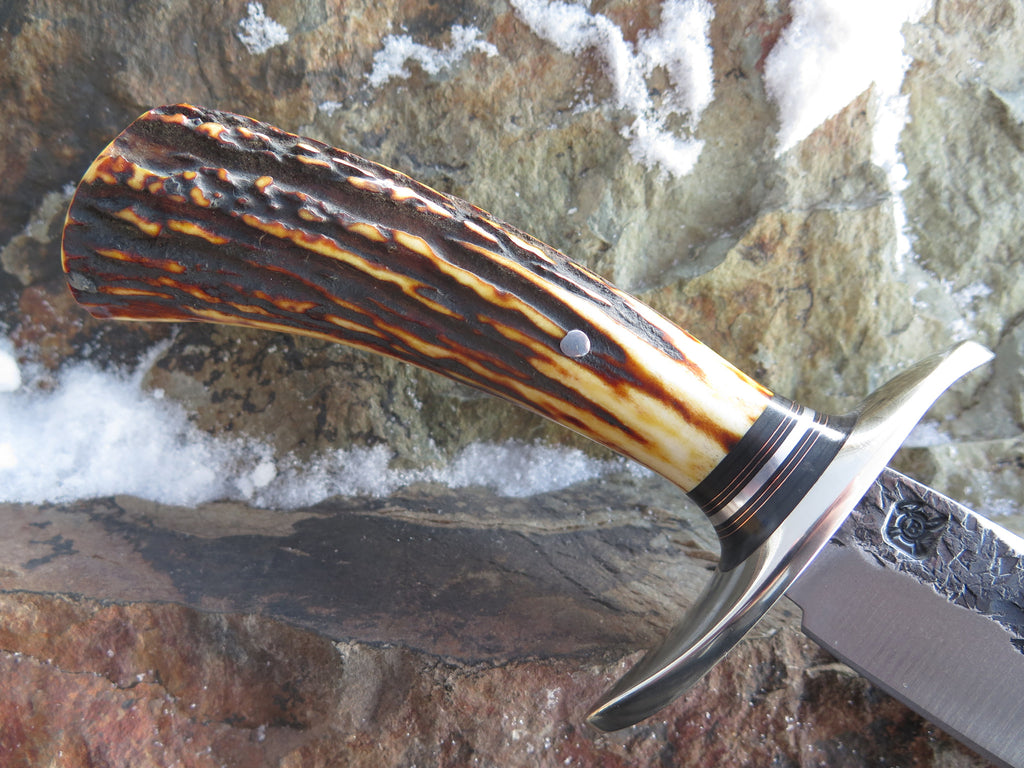 This bad ass new Fighter from Behring Made is hand forged from 3/16" thick high carbon steel and it measures 5 1/2" from tip to guard with a razor sharp hollow grind and a hammermark finish. The forged nickel silver s-guard is soldered in place above black fiber, copper and aluminum spacers. The handle is a sambar stag-collector's dream with bright reds to light creams and dark browns, not to mention the remarkable texture. The overall length measures 10 3/8" and it comes in a custom sheath from Rowe's Leather.