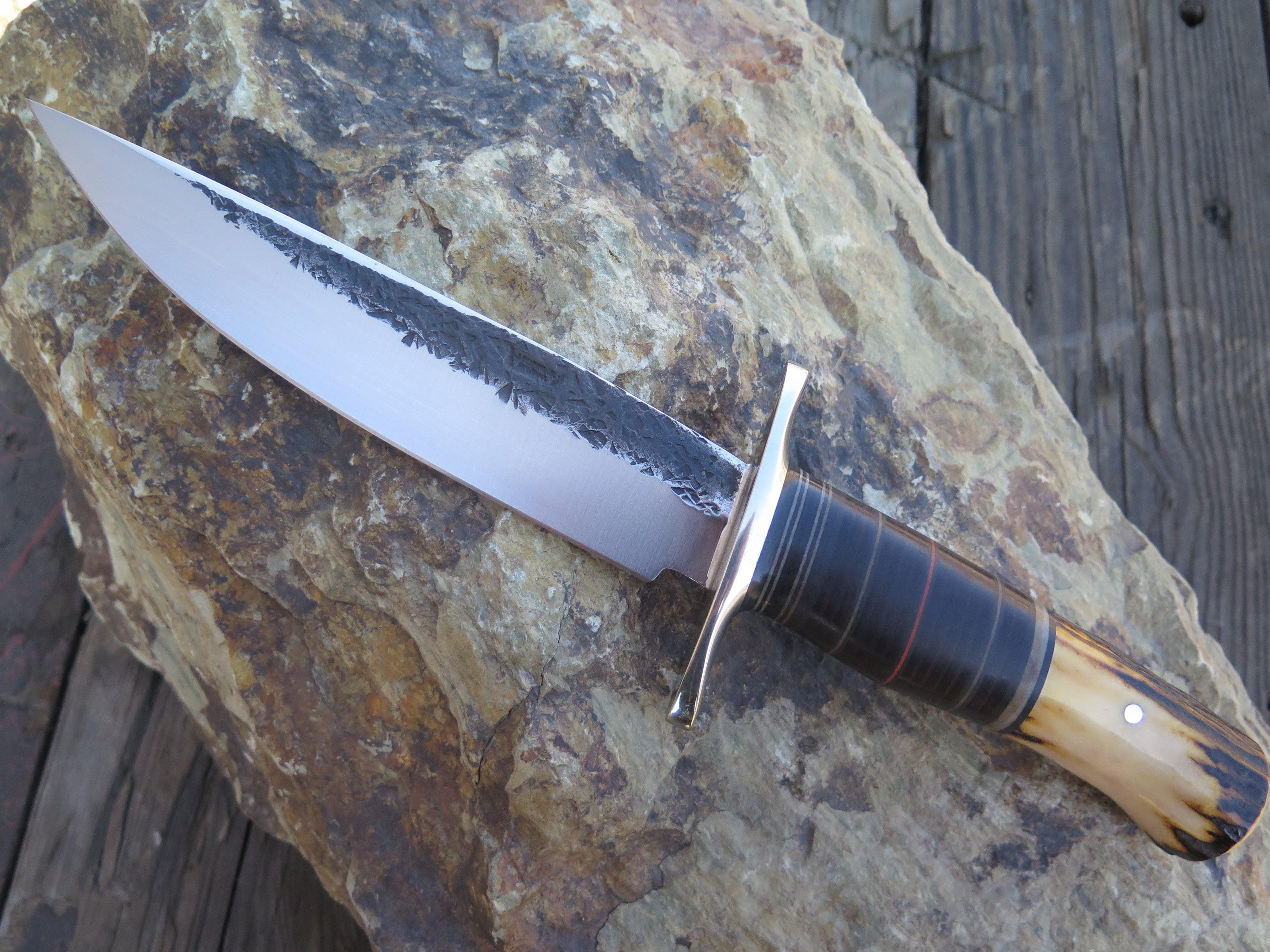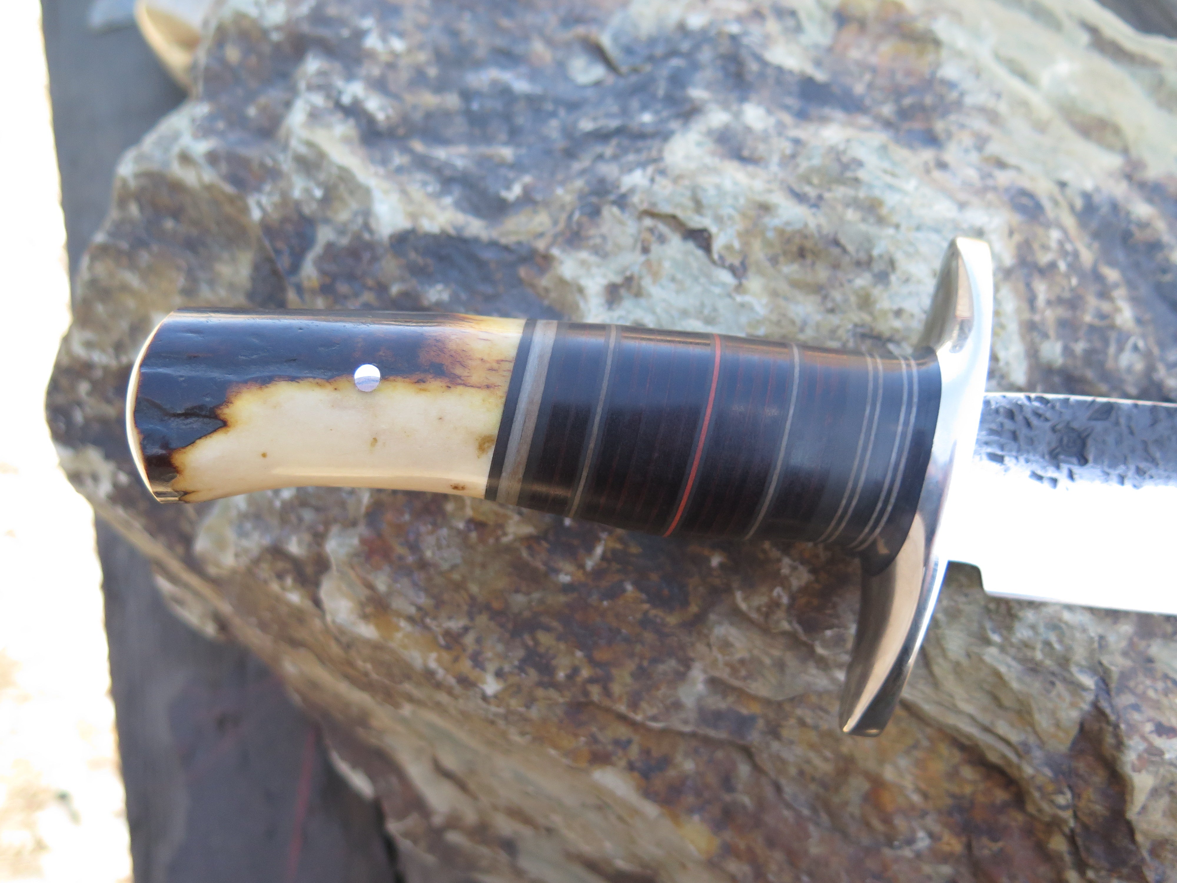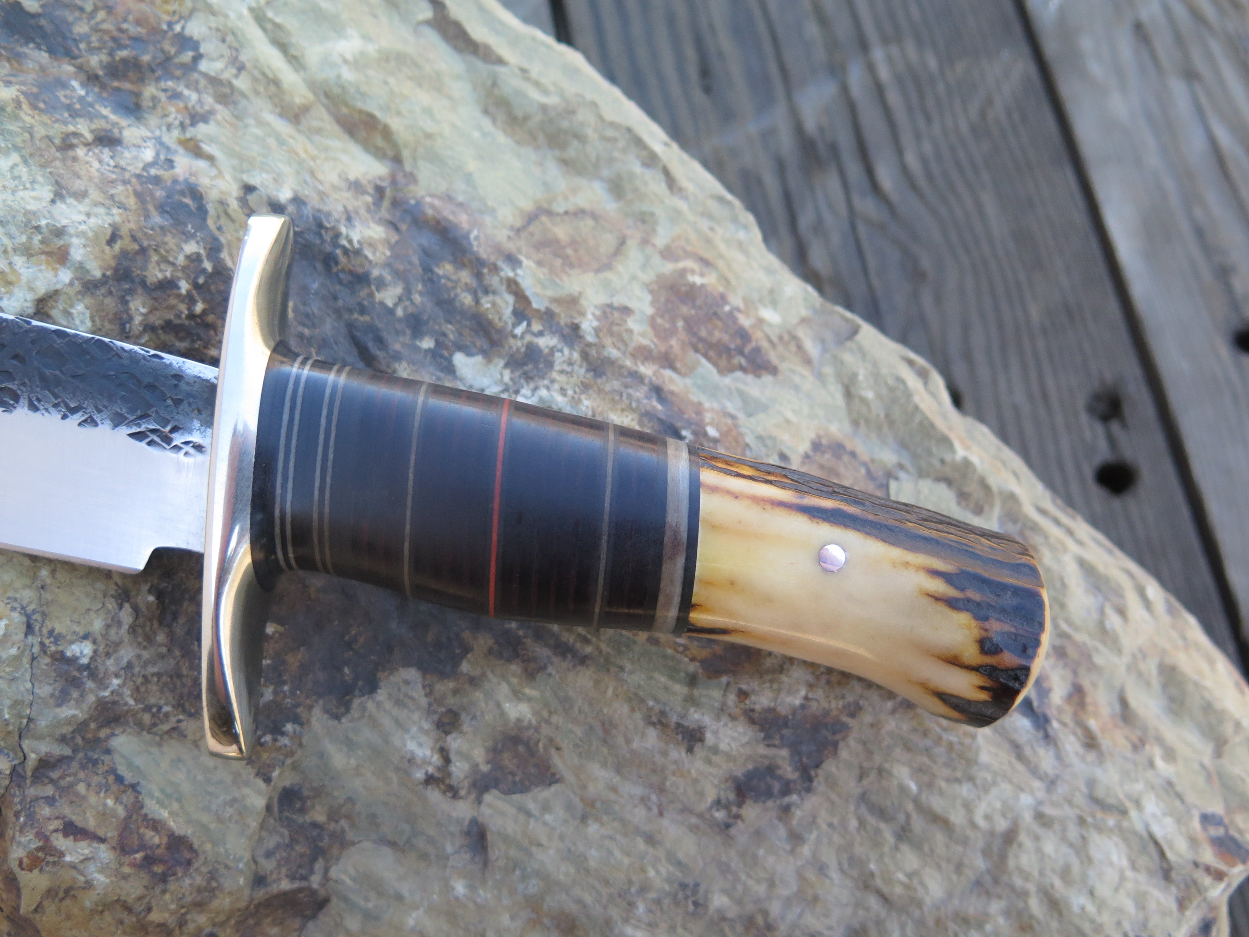 This incredible new Fighter from Behring Made© is hand forged from 13/64" thick 5160 spring steel and it measures 7" from tip to guard with a razor sharp hollow grind and our hammermark finish. The tall nickel silver guard is soldered in place above black, gray and maroon fiber and chocolate horsehide spacers with a premium sambar stag butt that's pinned through the tang with aluminum. The overall length measures 11 5/8" and it comes with a custom leather sheath in the style of your choosing.