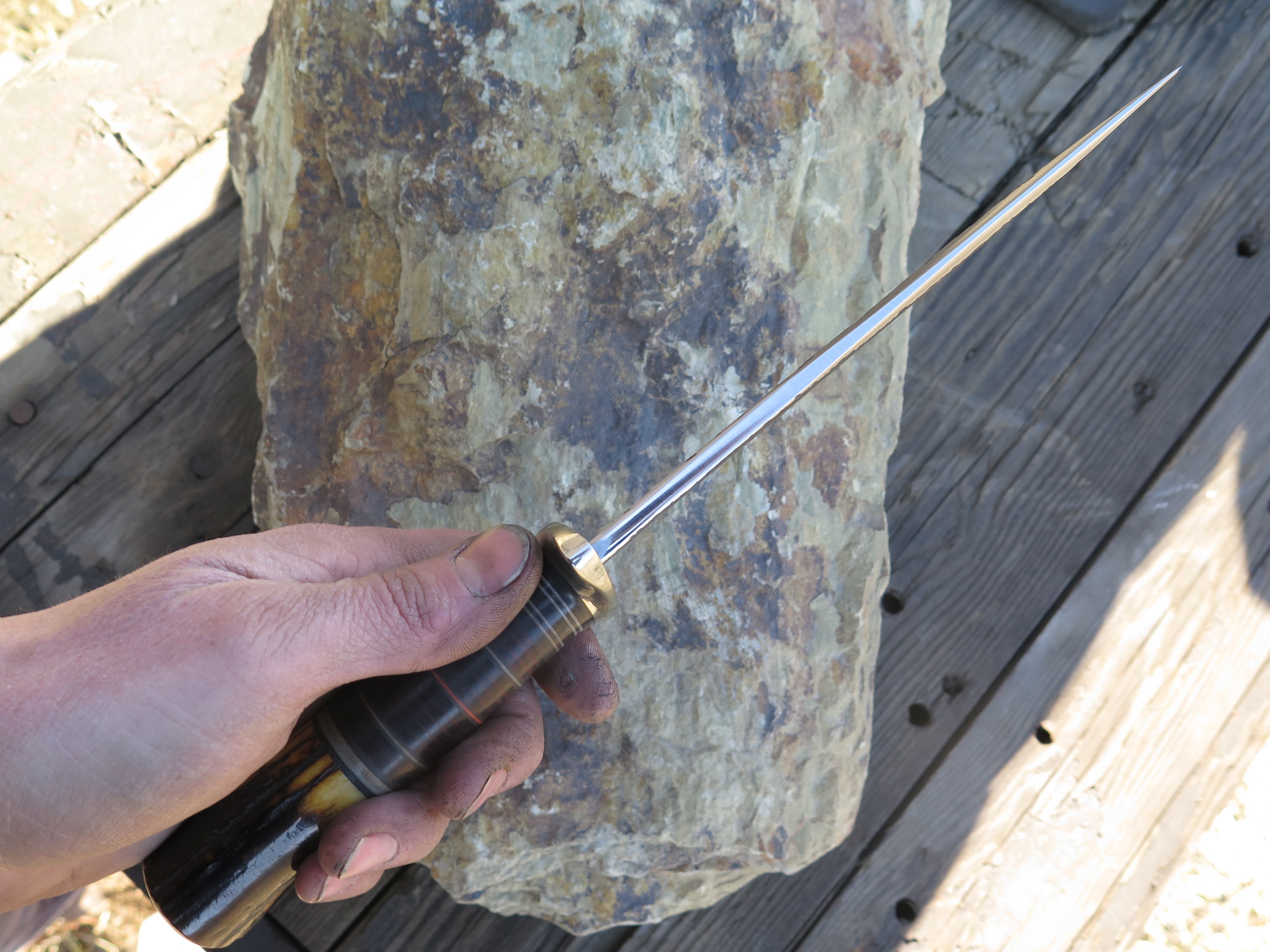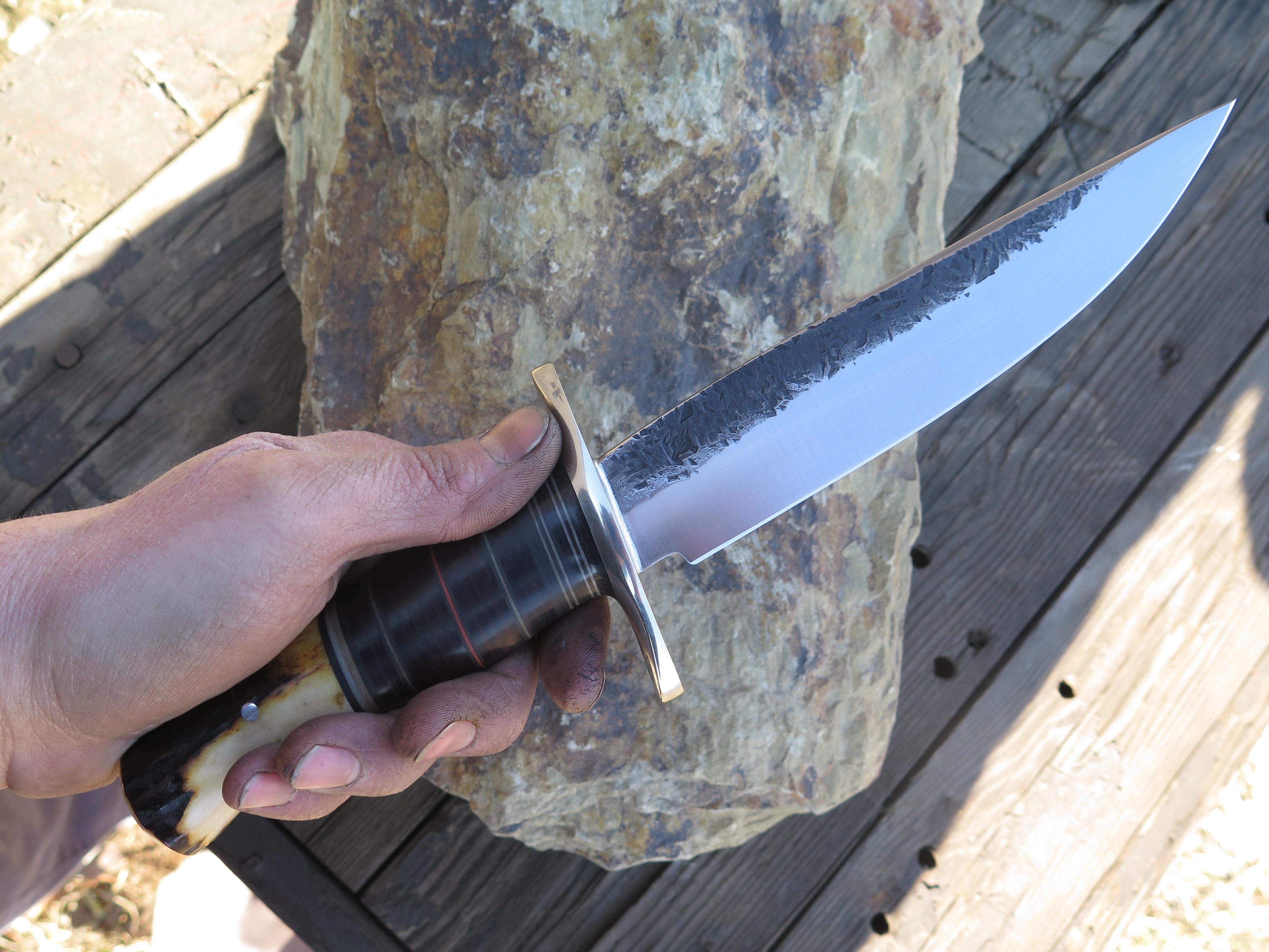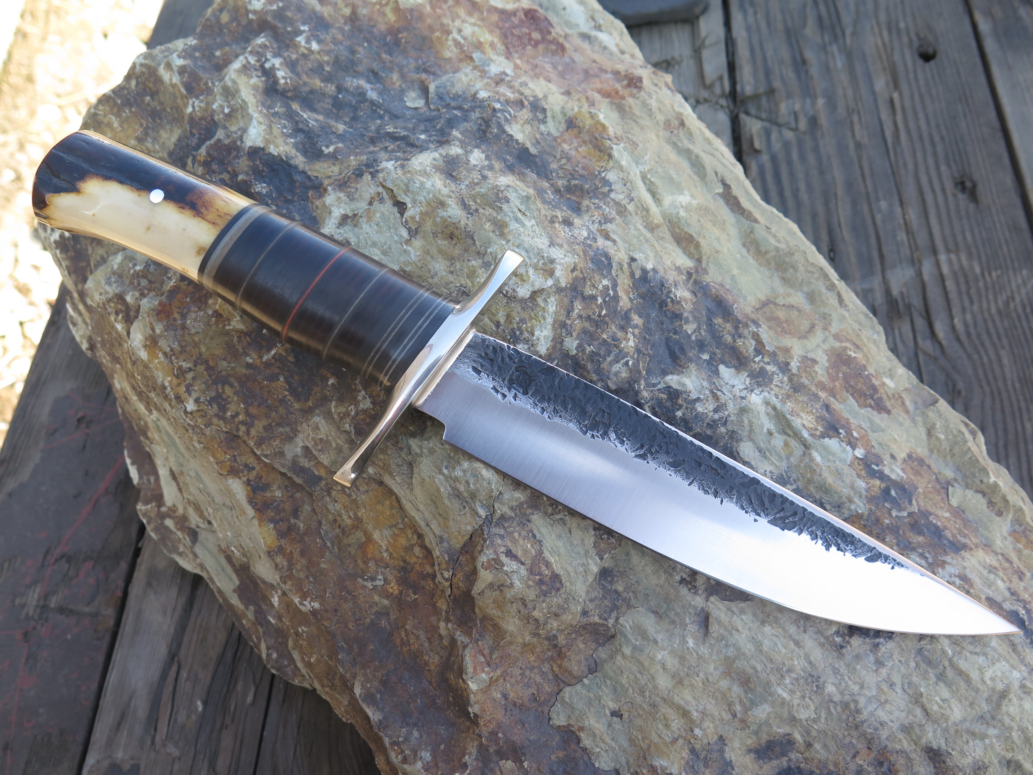 This incredible new Fighter from Behring Made© is hand forged from 13/64" thick 5160 spring steel and it measures 7" from tip to guard with a razor sharp hollow grind and our hammermark finish. The tall nickel silver guard is soldered in place above black, gray and maroon fiber and chocolate horsehide spacers with a premium sambar stag butt that's pinned through the tang with aluminum. The overall length measures 11 5/8" and it comes with a custom leather sheath in the style of your choosing.