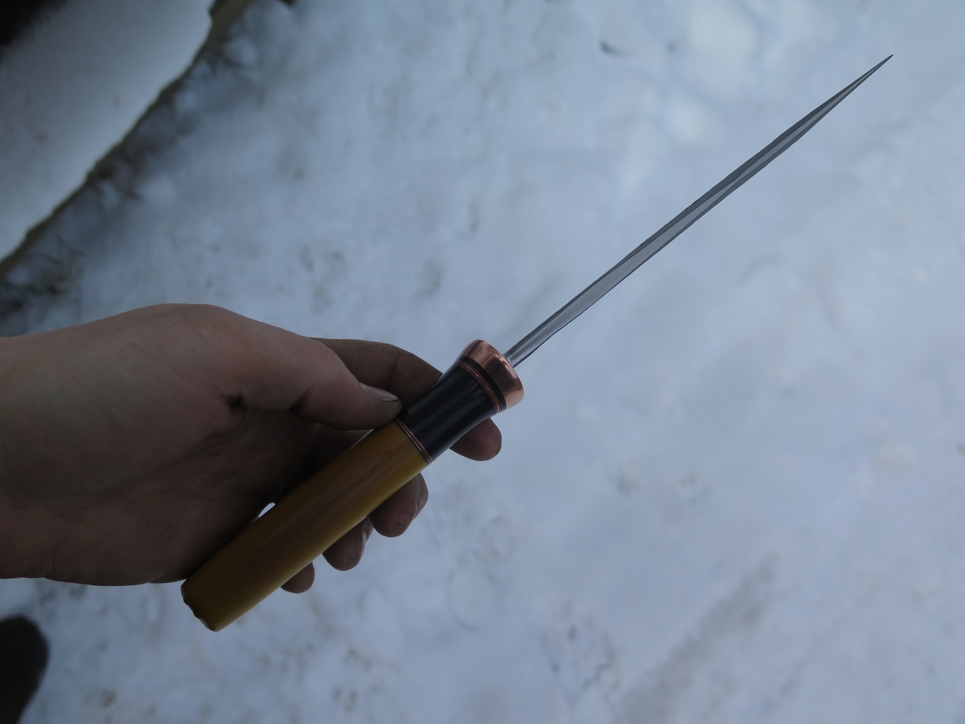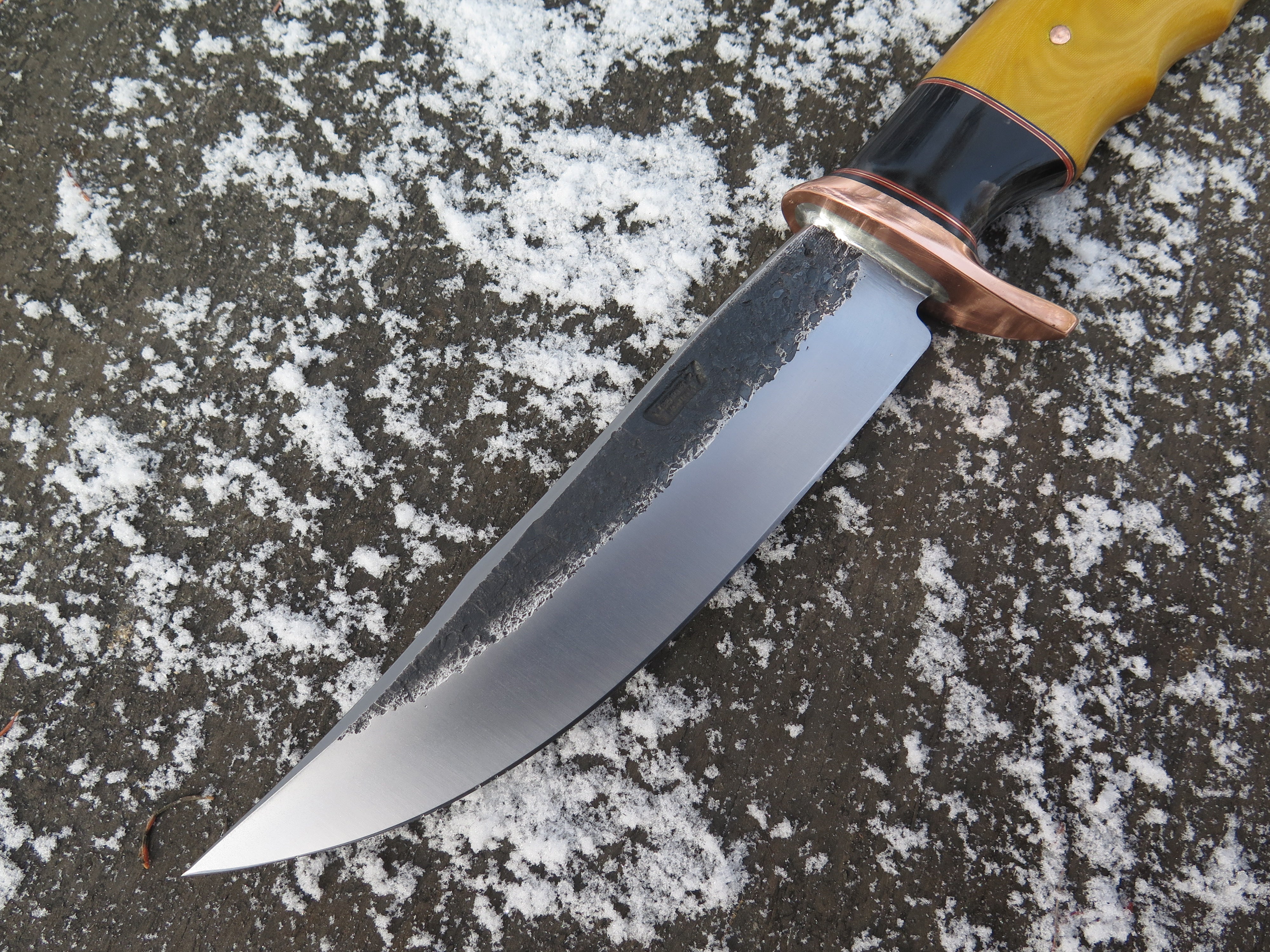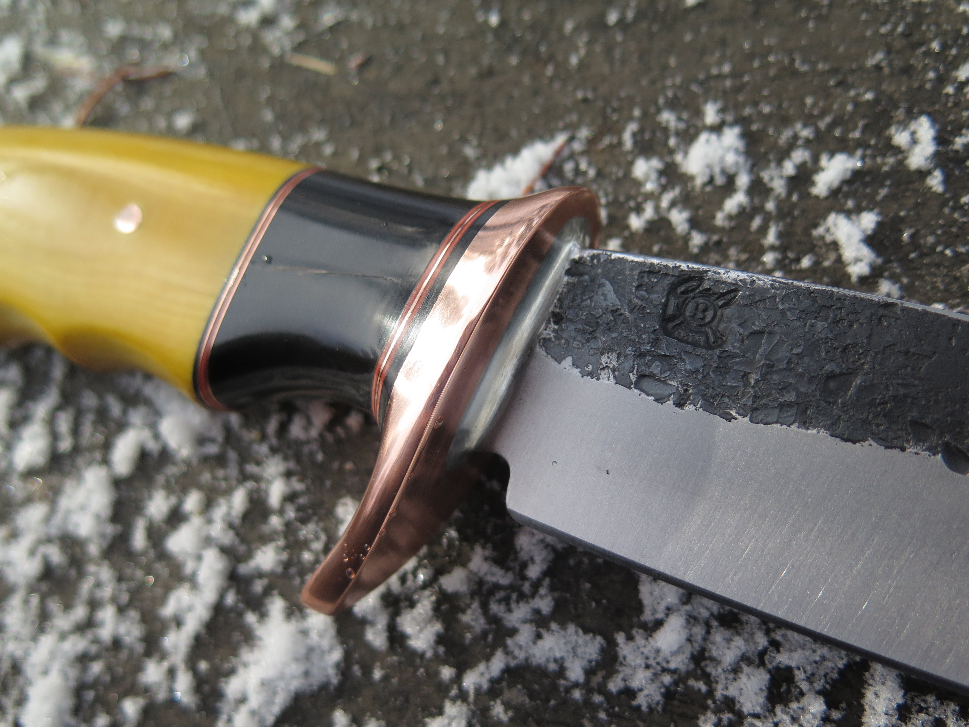 This bad ass new Fighter from Behring Made© is hand forged from 13/64" thick 5160 spring steel and it measures 6 1/2" from tip to guard with a razor sharp hollow grind and our hammermark finish. The forged copper half-s guard is soldered in place above black and maroon fiber, copper and buffalo horn spacers as well as a finger grip yellow micarta that is pinned through the tang with copper. The overall length measures 11 1/4" and it comes in a custom sheath from Warlander Leather.