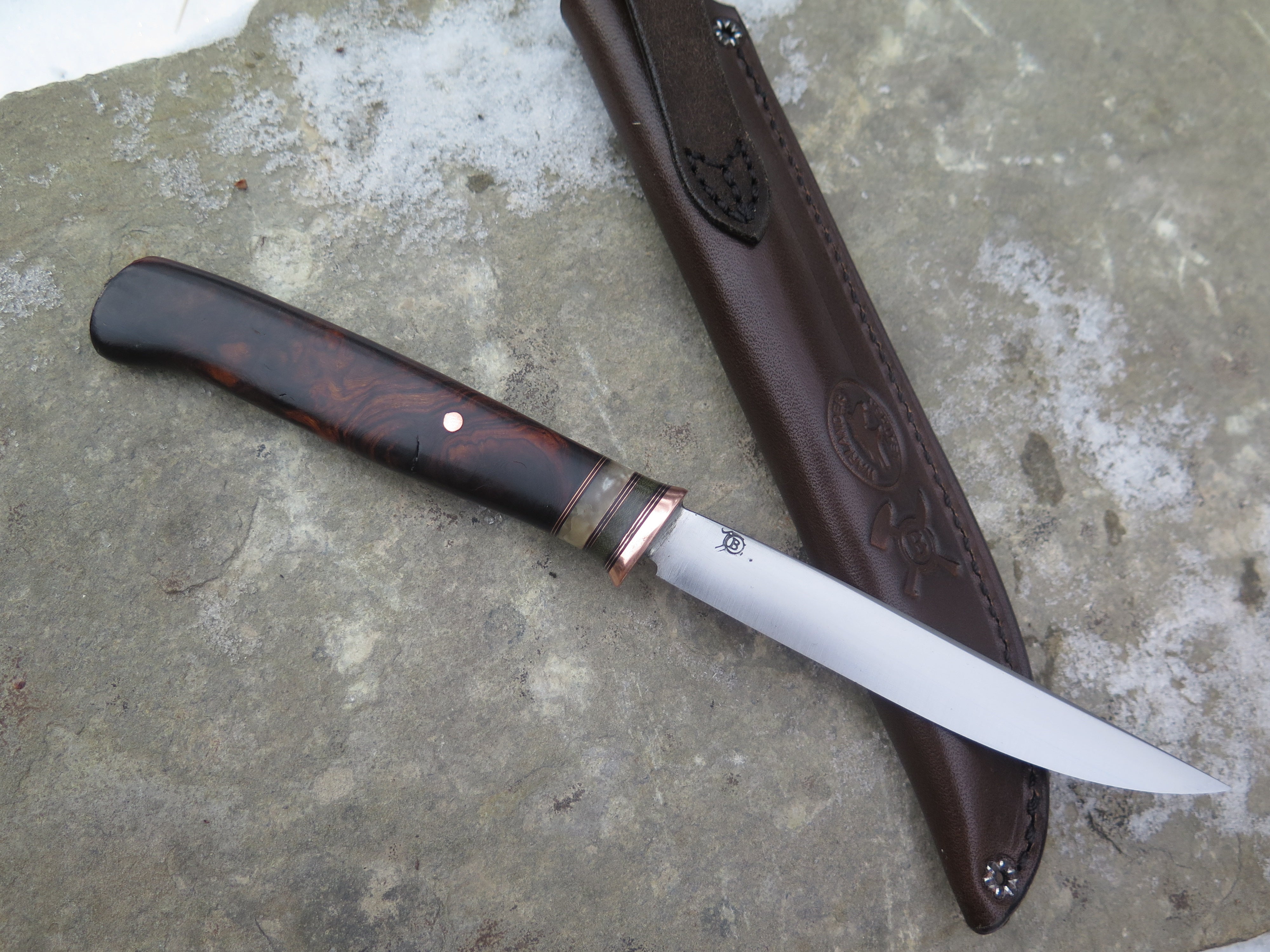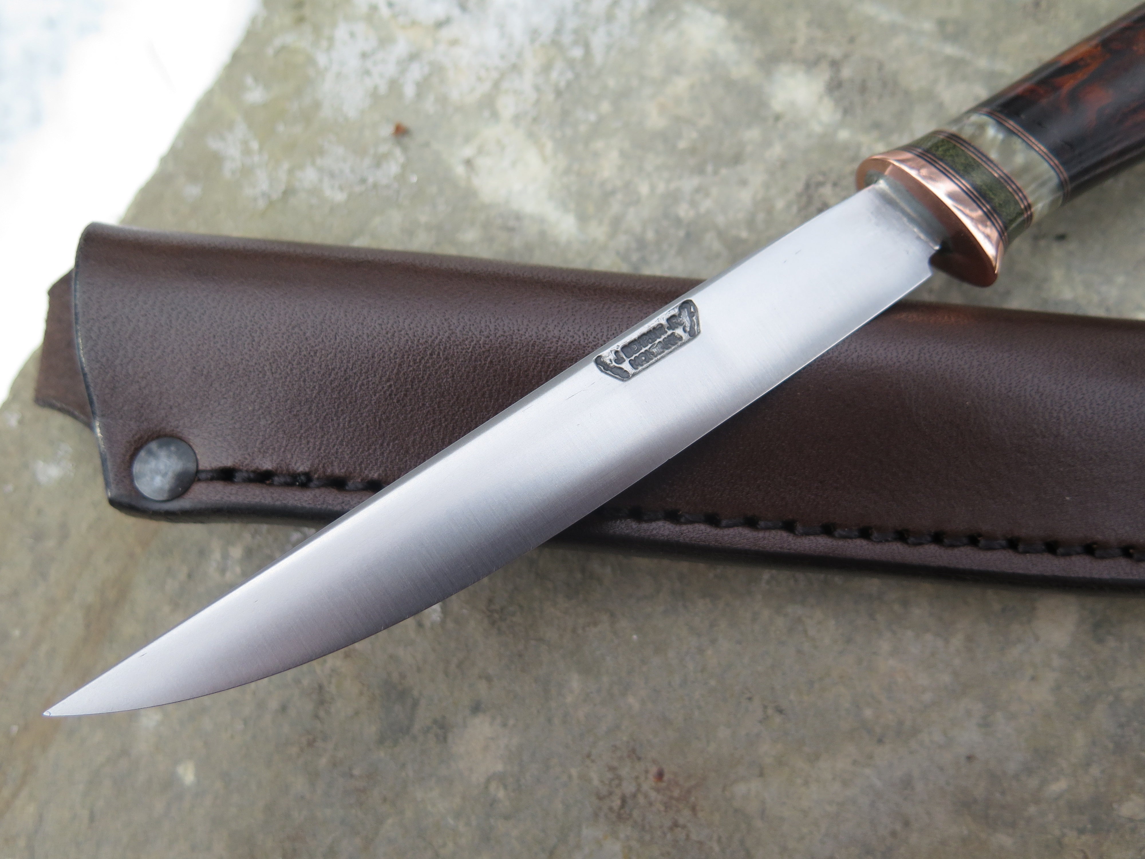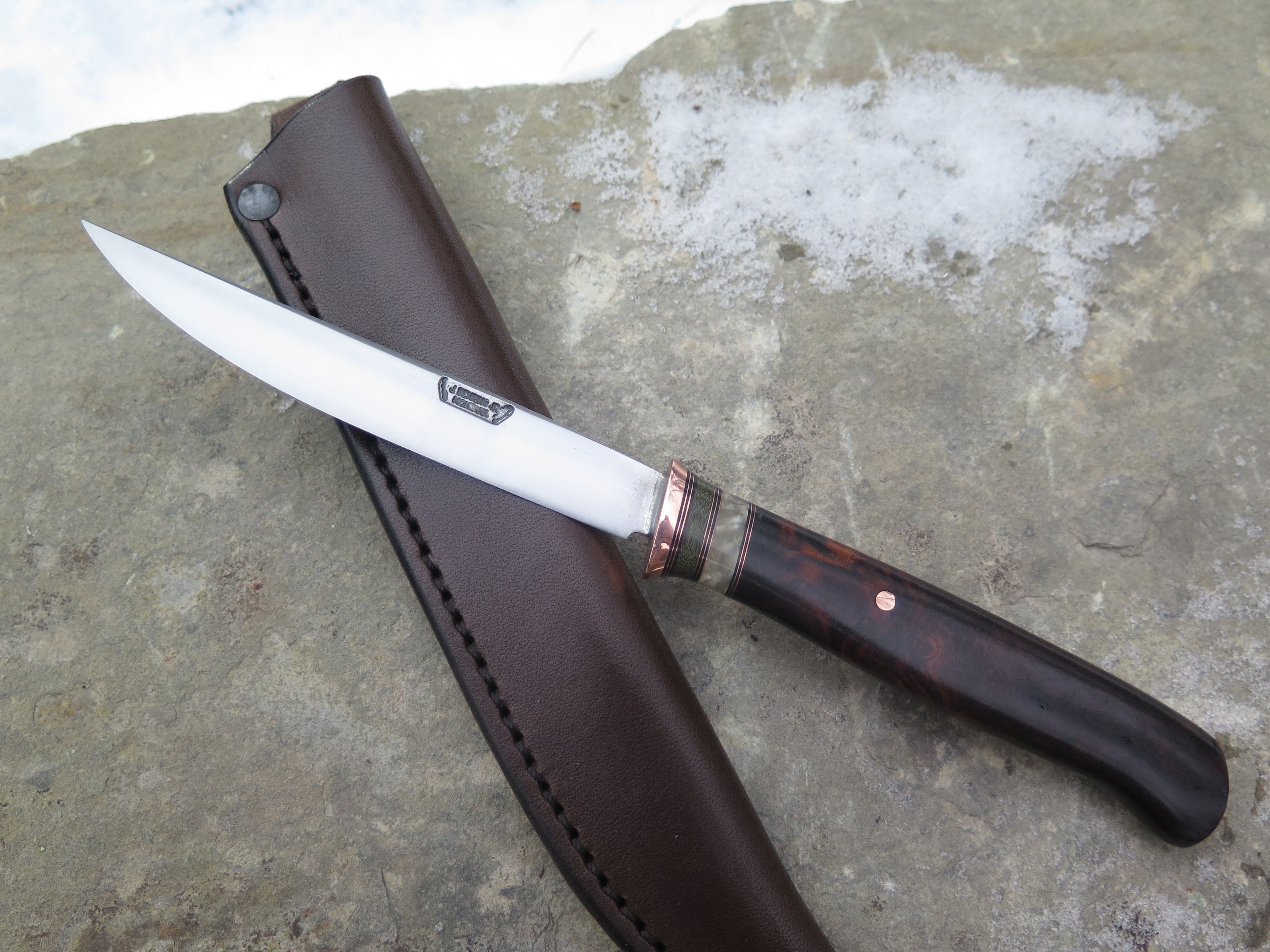This beautiful Alpine Fillet from Behring Made© is hand forged from 1/8" thick high carbon 01 tool steel and it measures 4 1/2" from tip to guard with a razor sharp convex grind. The copper guard is soldered in place above black fiber, copper, green micarta and musk ox boss spacers as well as a deep tone desert ironwood burl handle that's pinned through the tang with copper. The overall length measures just over 9" and it comes in a classic leather pouch sheath. *This is an Archive listing and so will vary in material figure and take 4-8 weeks to ship.