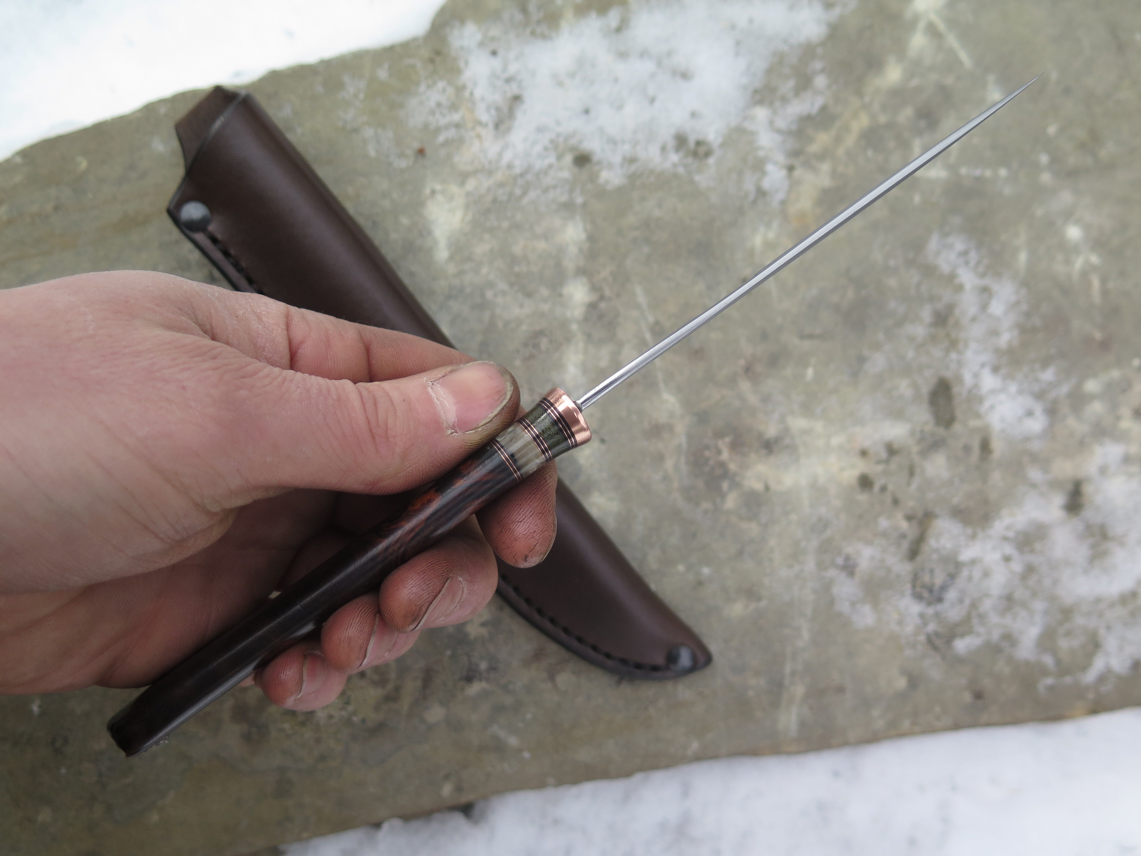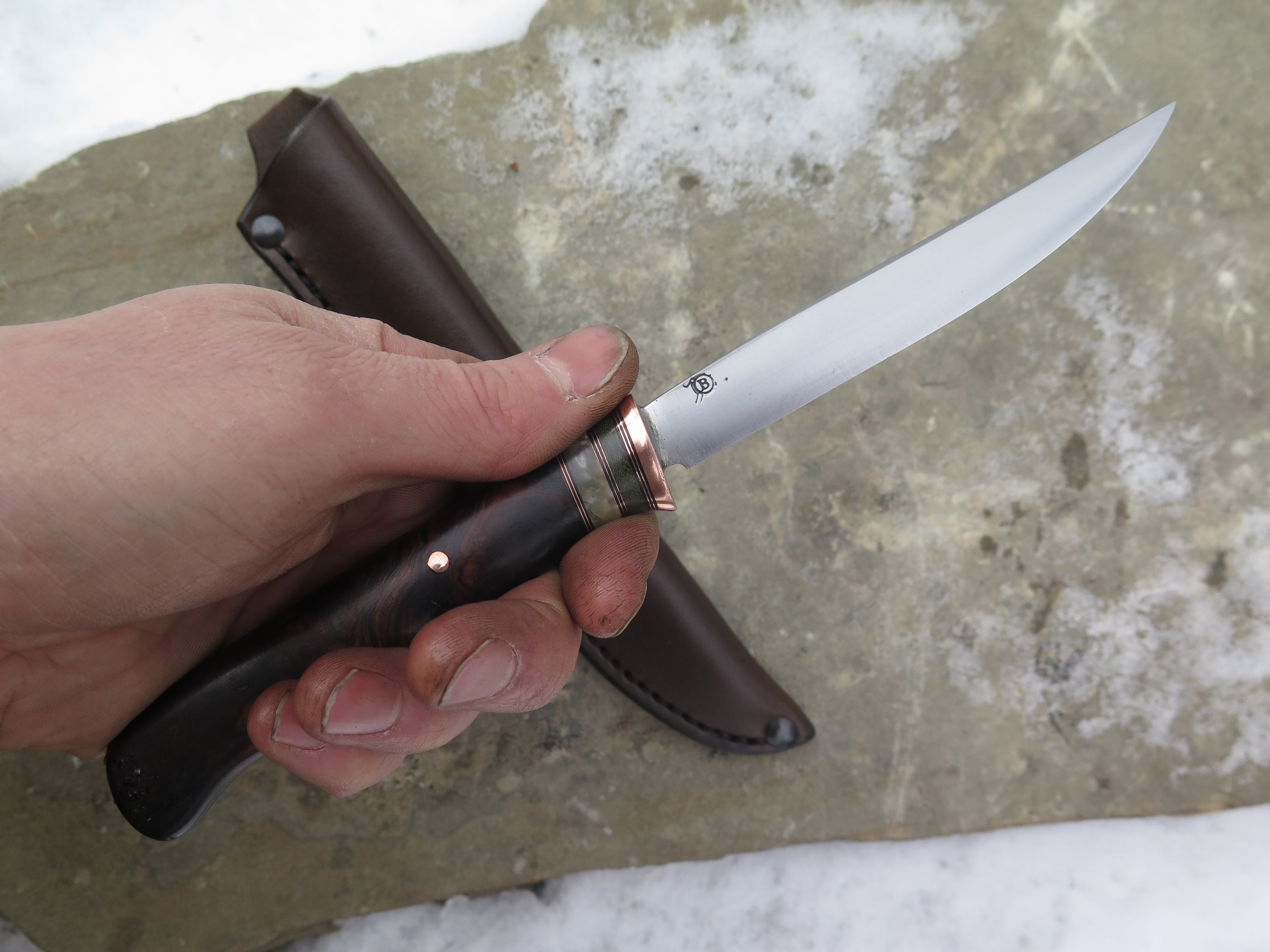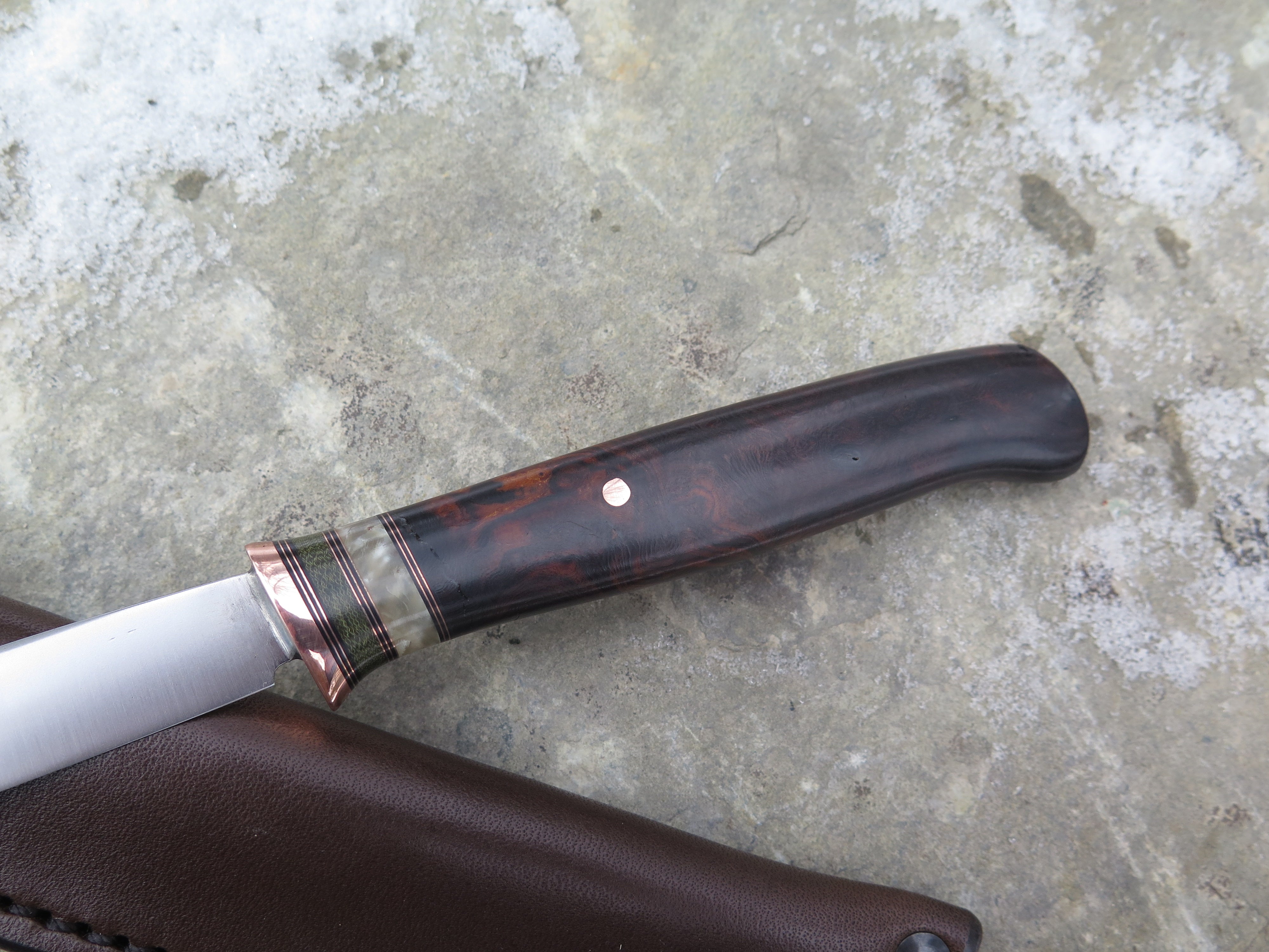 This beautiful Alpine Fillet from Behring Made© is hand forged from 1/8" thick high carbon 01 tool steel and it measures 4 1/2" from tip to guard with a razor sharp convex grind. The copper guard is soldered in place above black fiber, copper, green micarta and musk ox boss spacers as well as a deep tone desert ironwood burl handle that's pinned through the tang with copper. The overall length measures just over 9" and it comes in a classic leather pouch sheath. *This is an Archive listing and so will vary in material figure and take 4-8 weeks to ship.