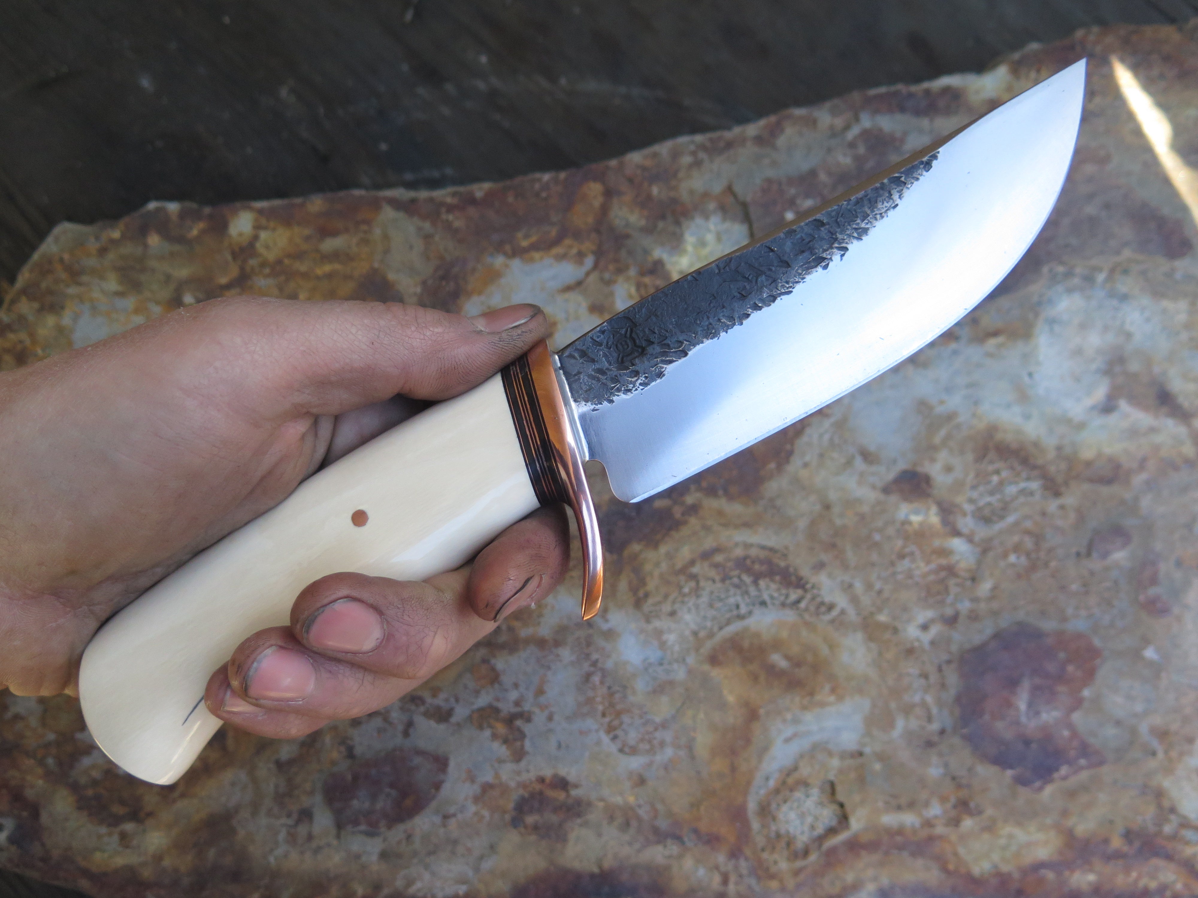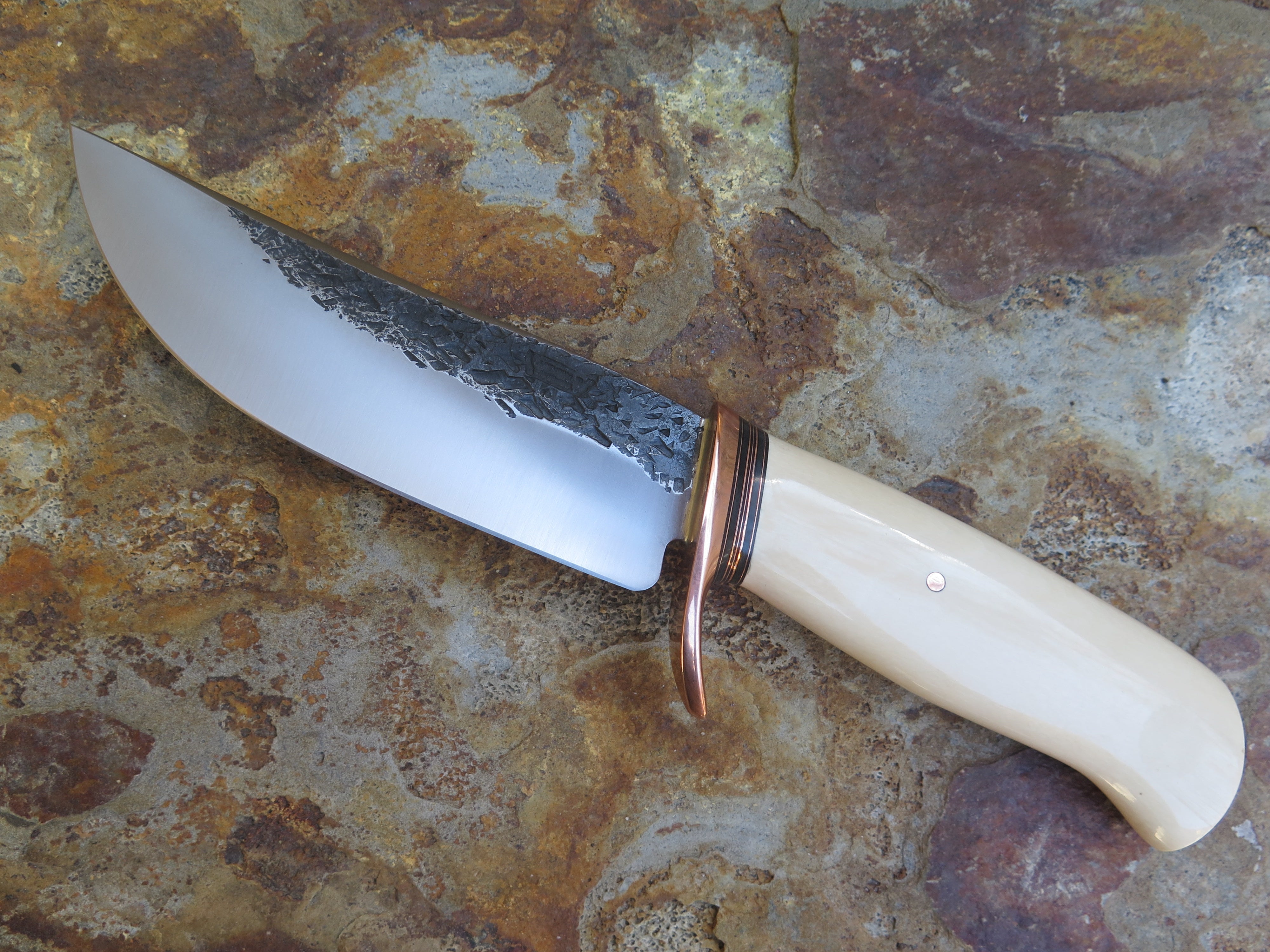 This beautiful new Hunter from Behring Made© is hand forged from 3/16" thick high carbon 01 tool steel and it measures 5 1/2" from tip to guard with a razor sharp hollow grind and our hammermark finish. The forged copper half-s guard is soldered in place above black fiber and copper spacers as well as a remarkable handle made from the tusk of an ancient mammoth- plus it's pinned through the tang with copper. The overall length measures just a hair over 10 1/8" and it will come in a custom sheath from Warlander Leather.