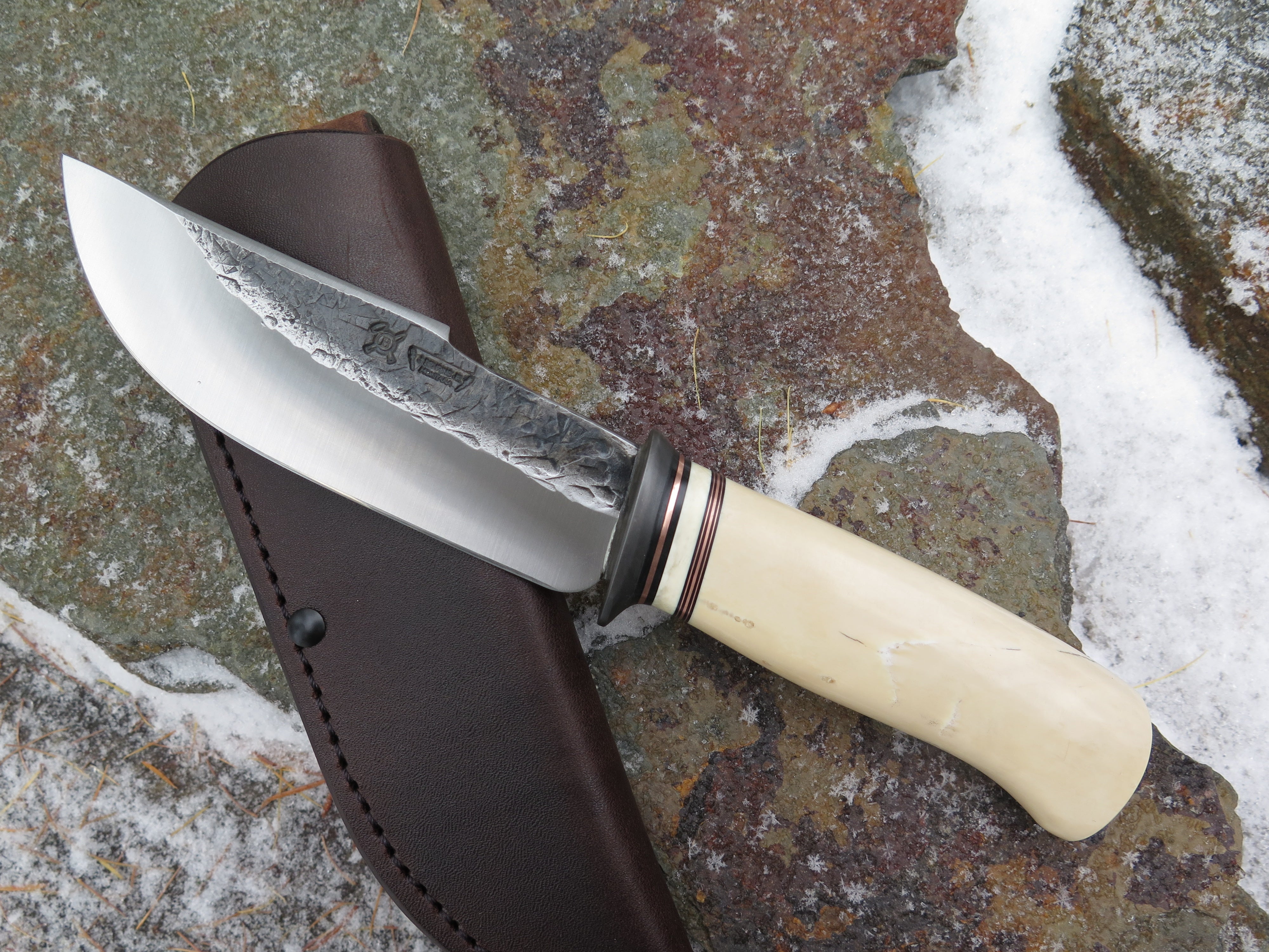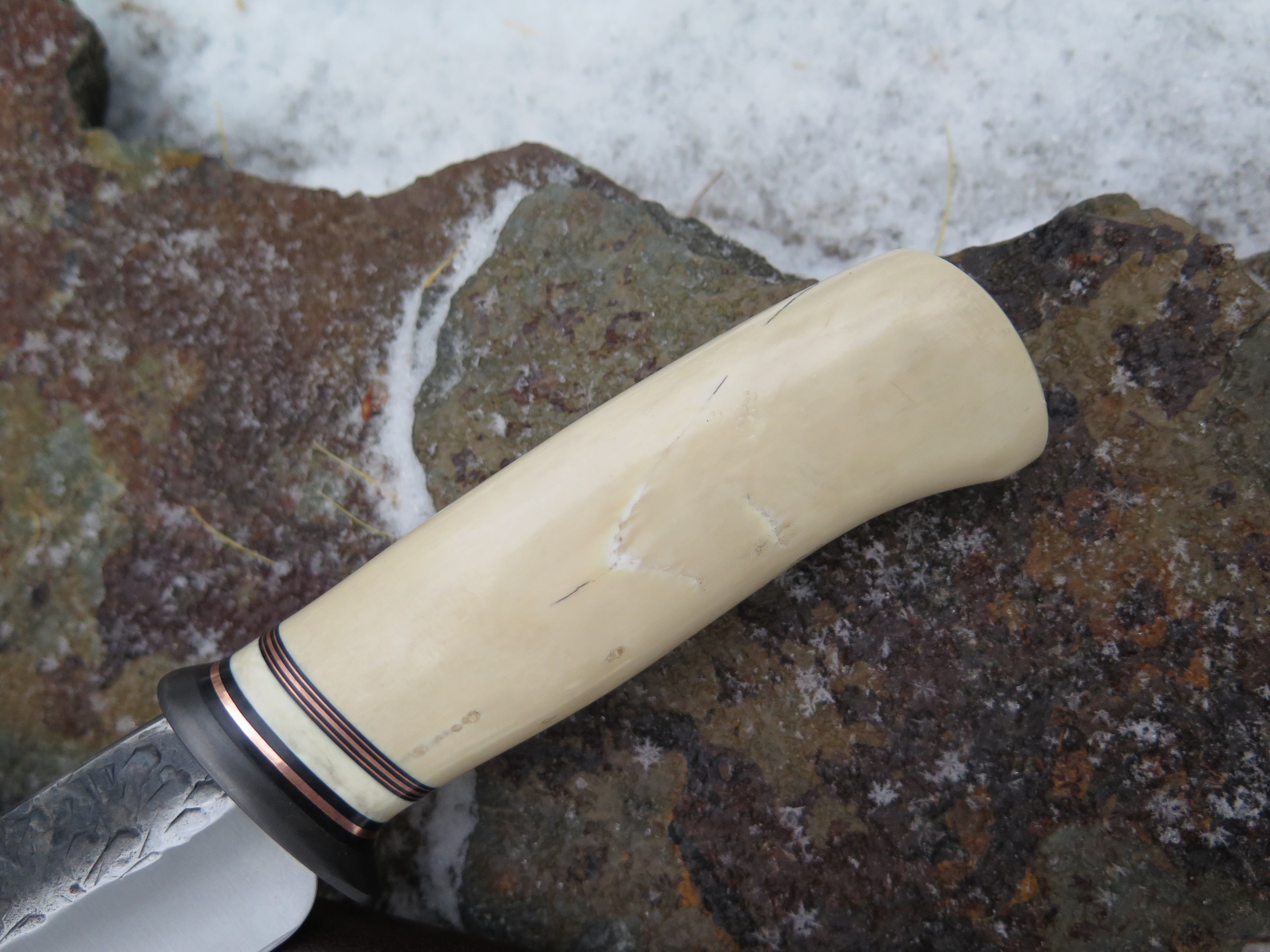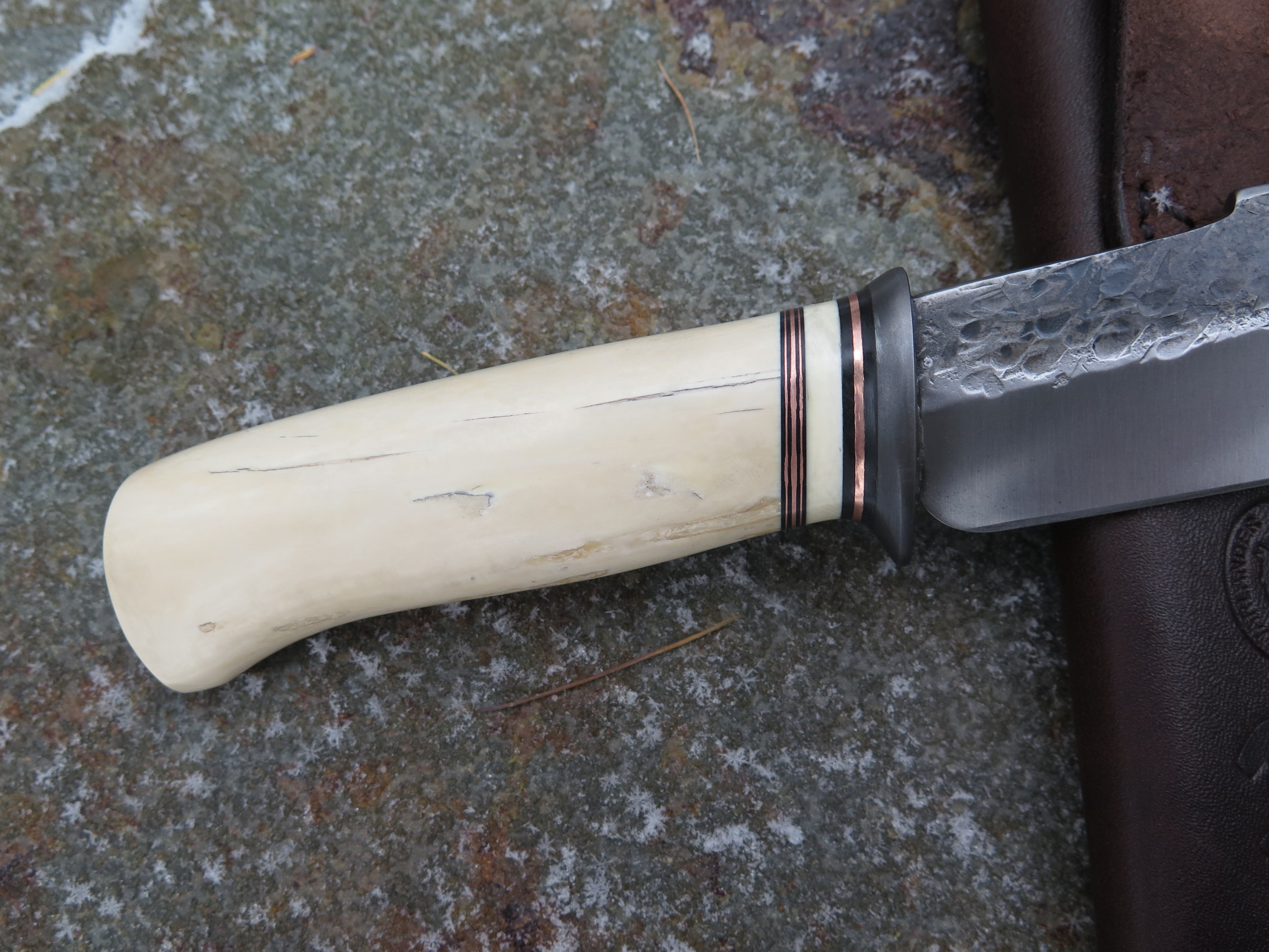 This bad ass new Spearpoint from Behring Made© is hand forged from 3/16" high carbon 01 tool steel and it measures 5" from tip to guard with a razor sharp hollow grind and our hammermark finish. The blued steel guard is soldered in place above black fiber, copper and mammoth spacers which top an ancient mammoth ivory handle with unique figure from the core throughout. The overall length measures just over 9 1/2" and it comes in classic leather belt pouch, though substitutions are available upon request.