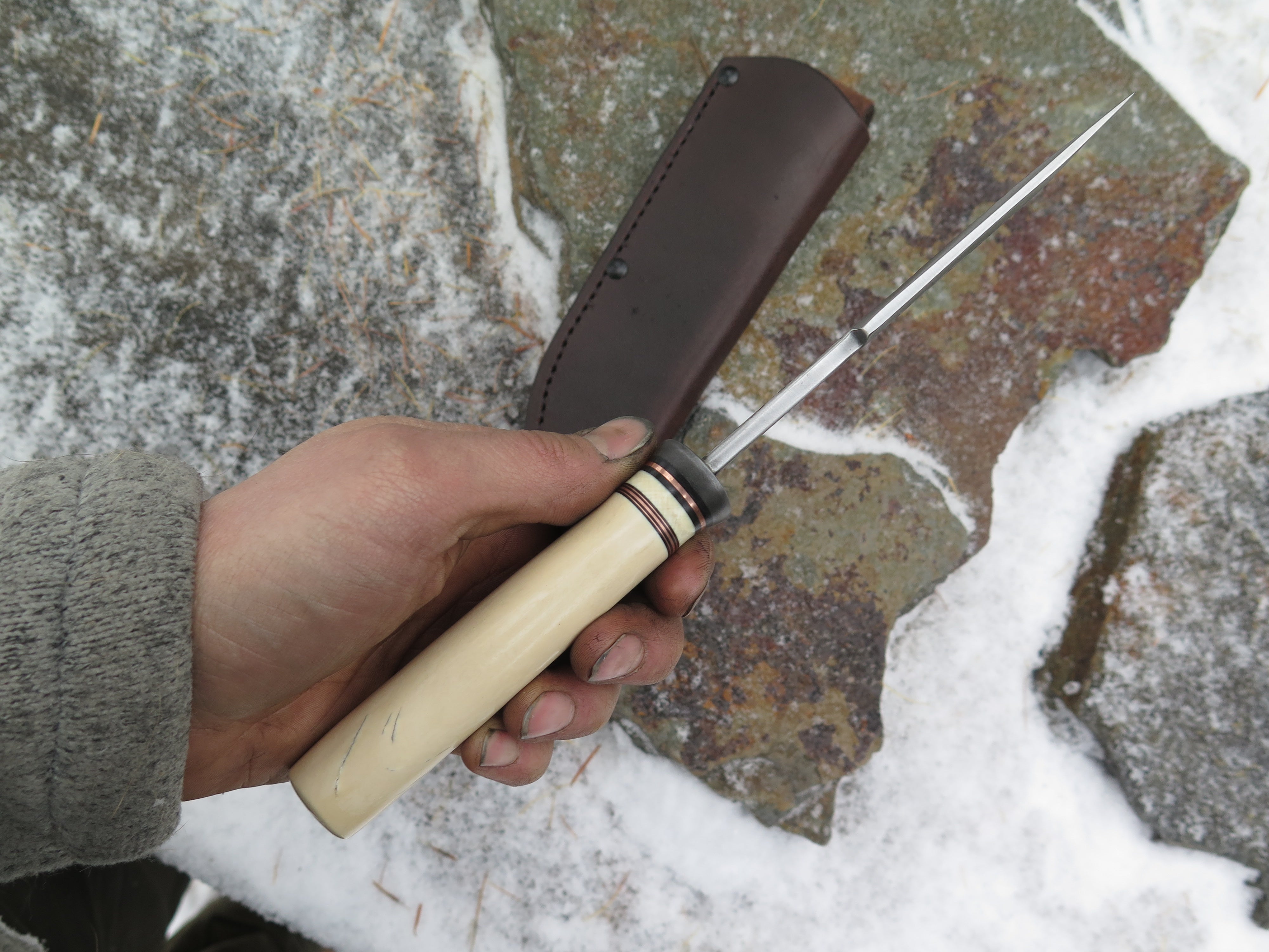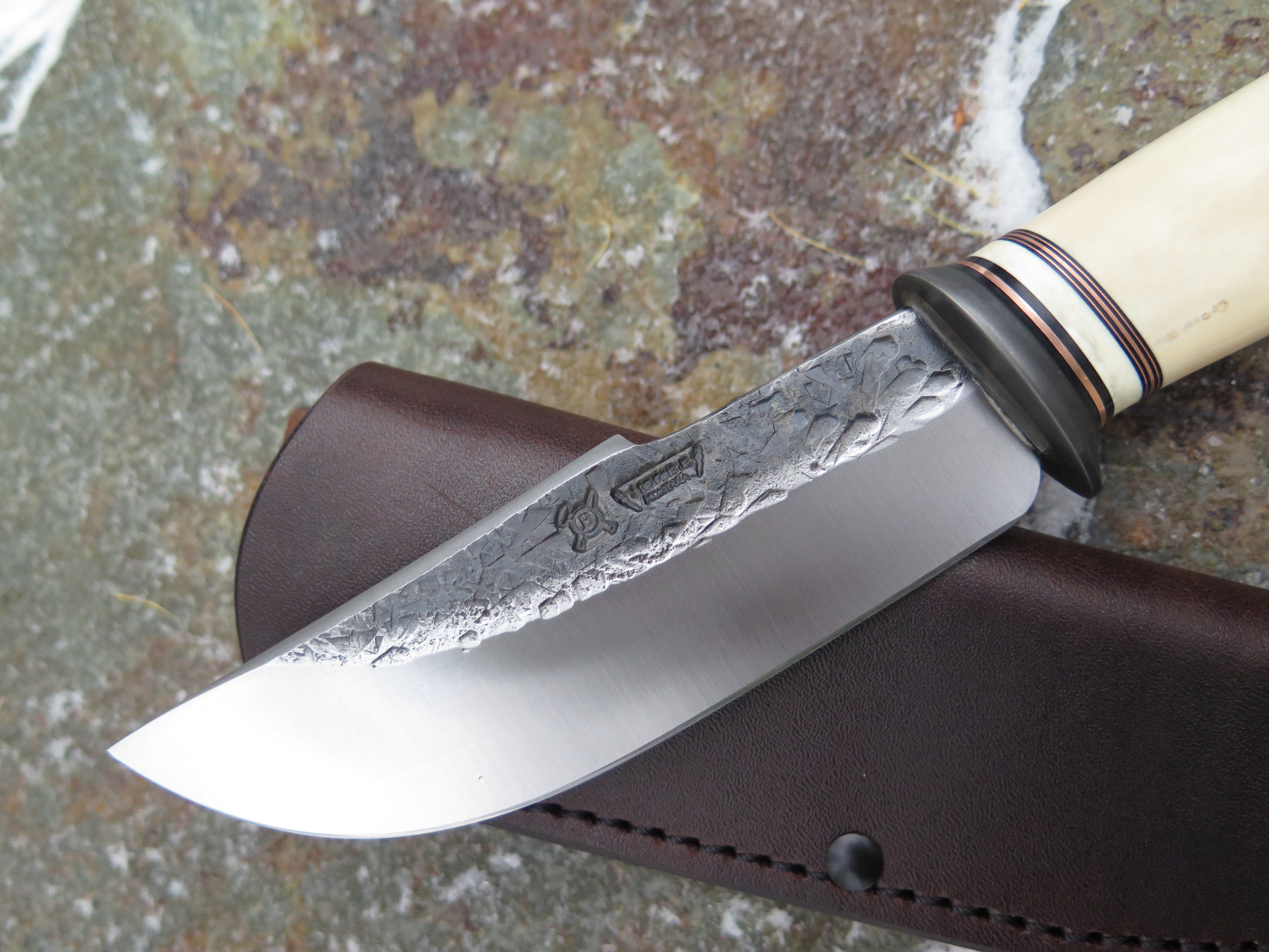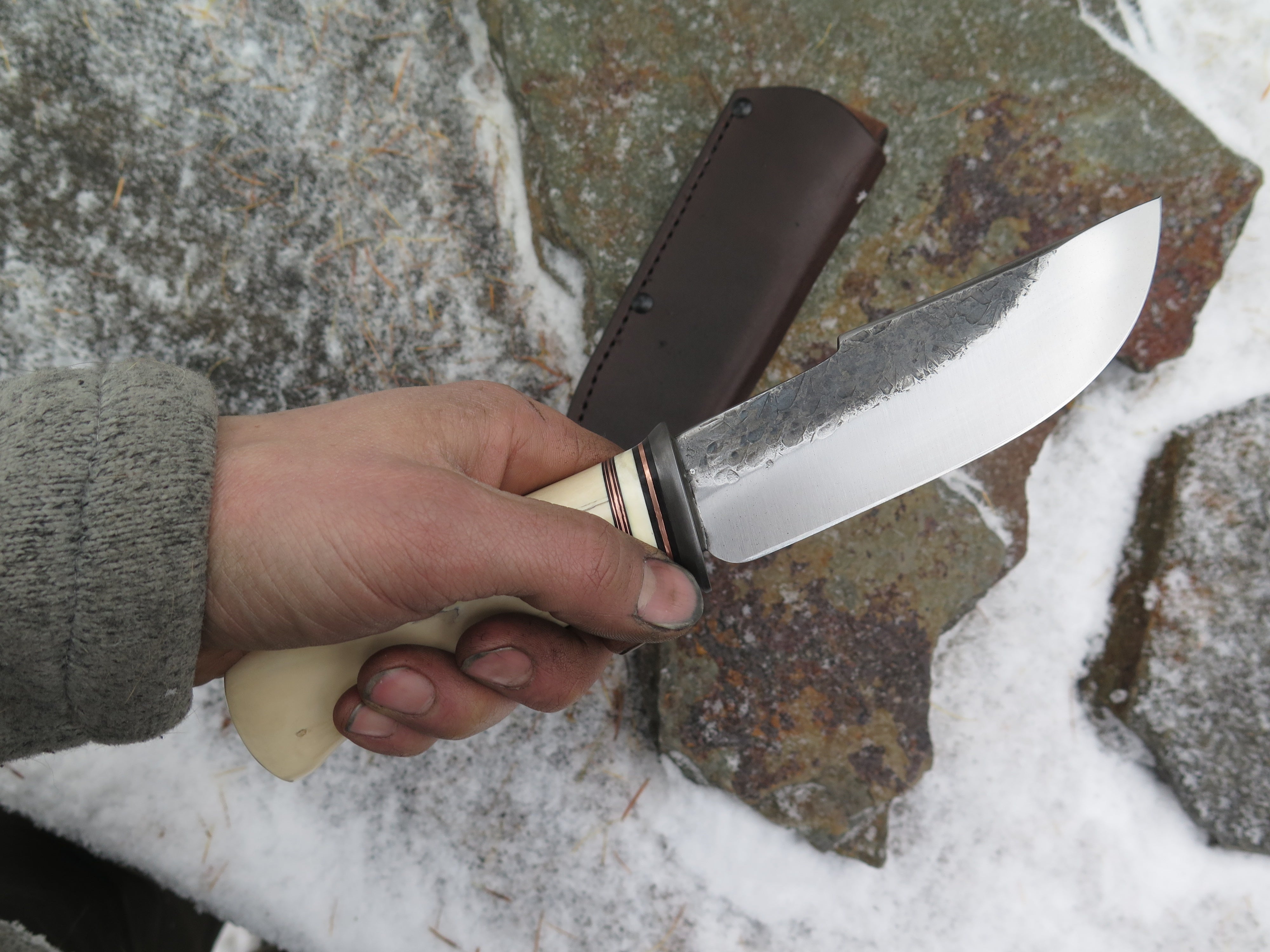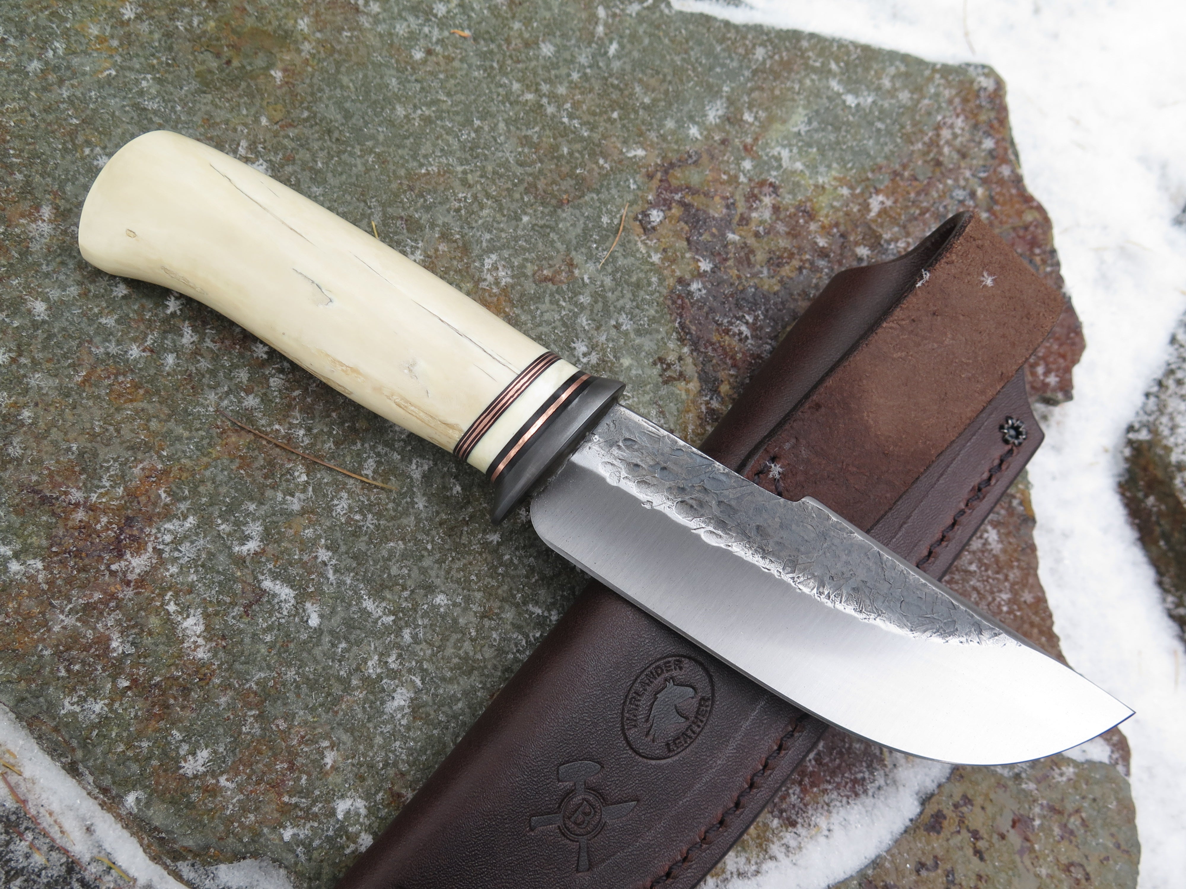 This bad ass new Spearpoint from Behring Made© is hand forged from 3/16" high carbon 01 tool steel and it measures 5" from tip to guard with a razor sharp hollow grind and our hammermark finish. The blued steel guard is soldered in place above black fiber, copper and mammoth spacers which top an ancient mammoth ivory handle with unique figure from the core throughout. The overall length measures just over 9 1/2" and it comes in classic leather belt pouch, though substitutions are available upon request.