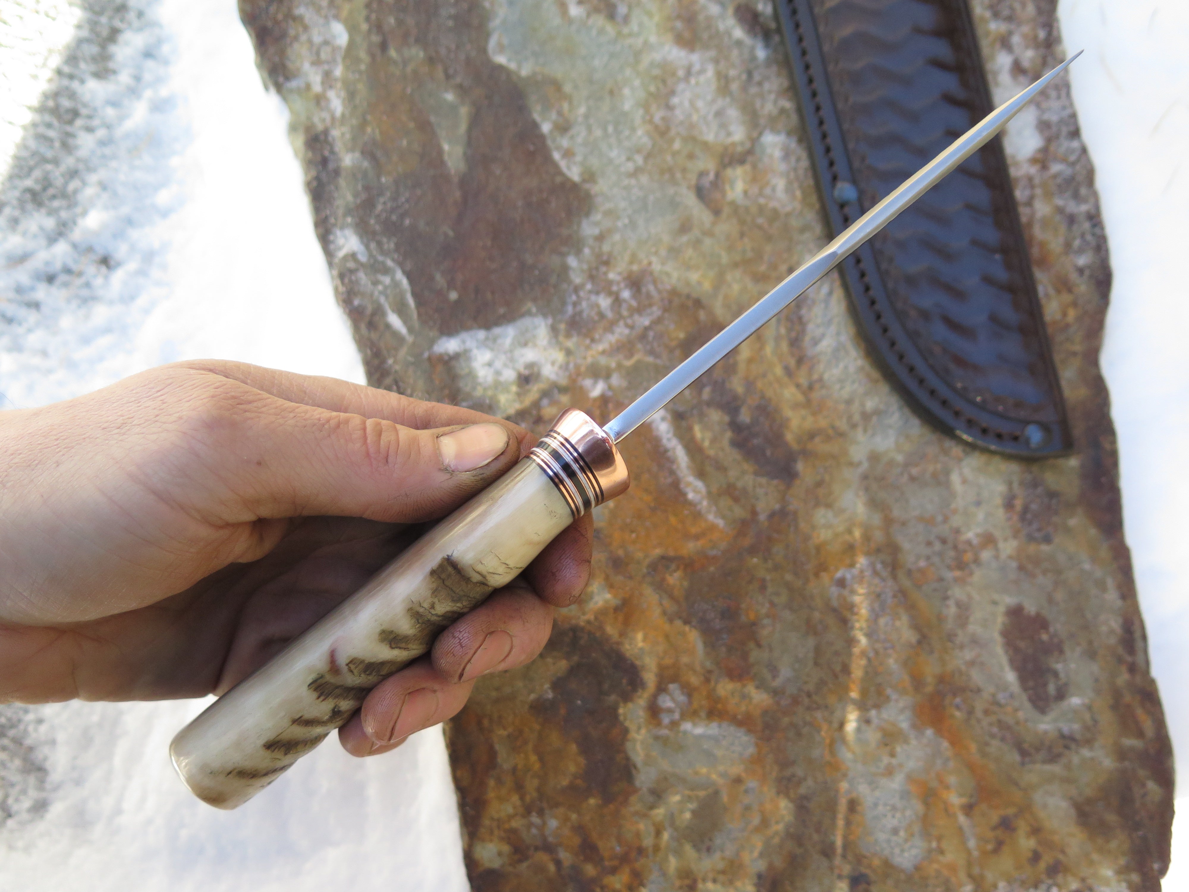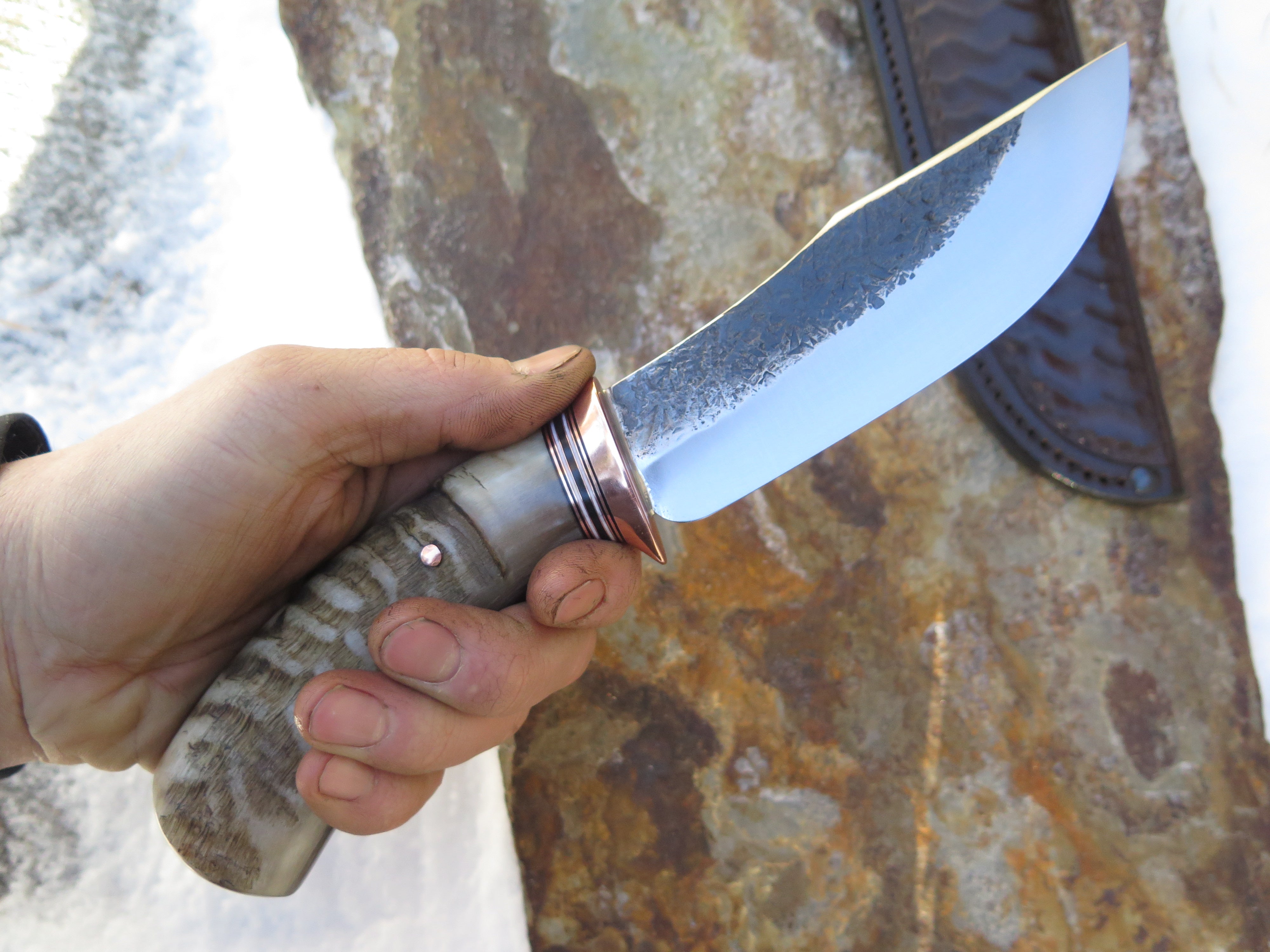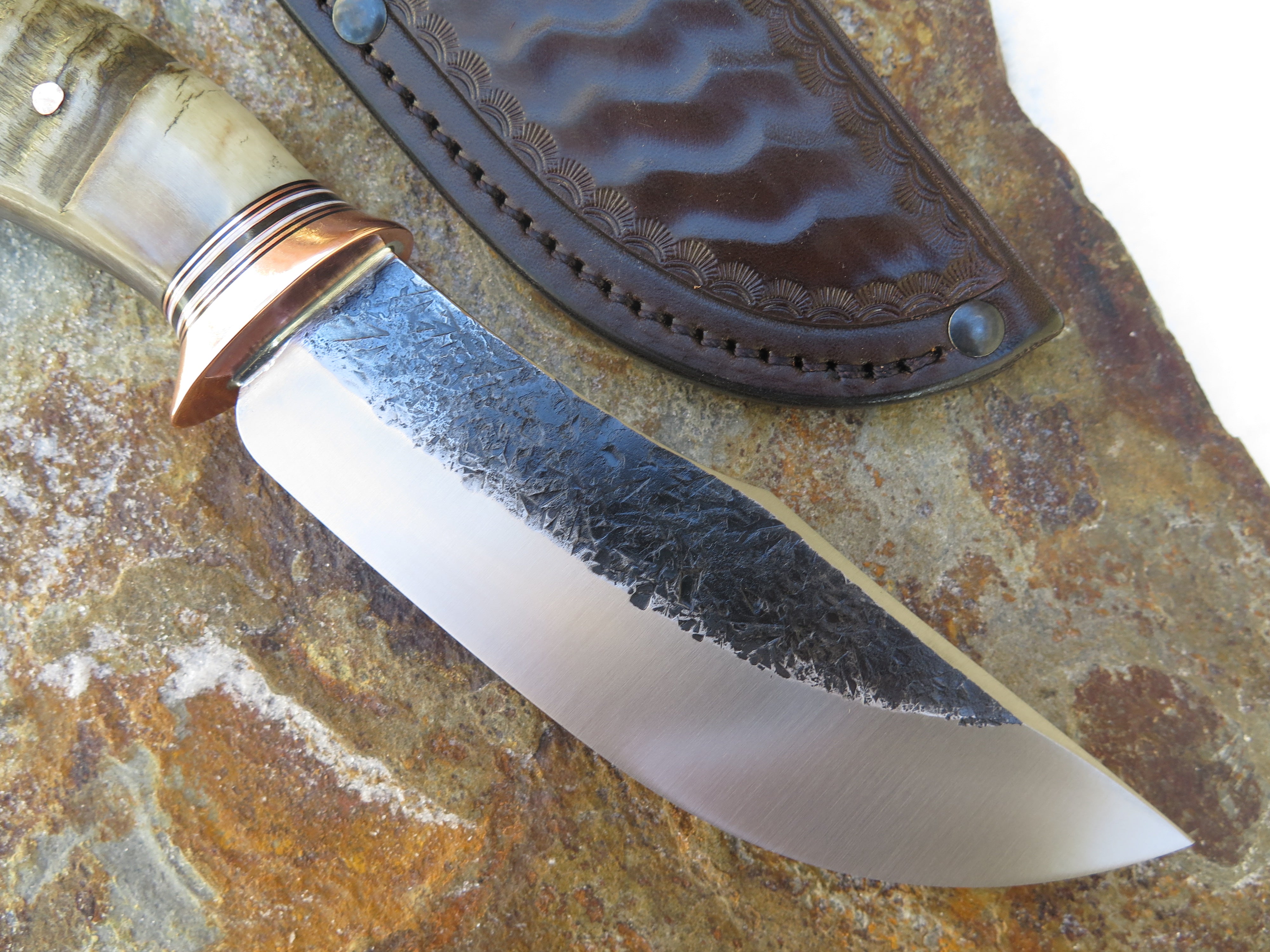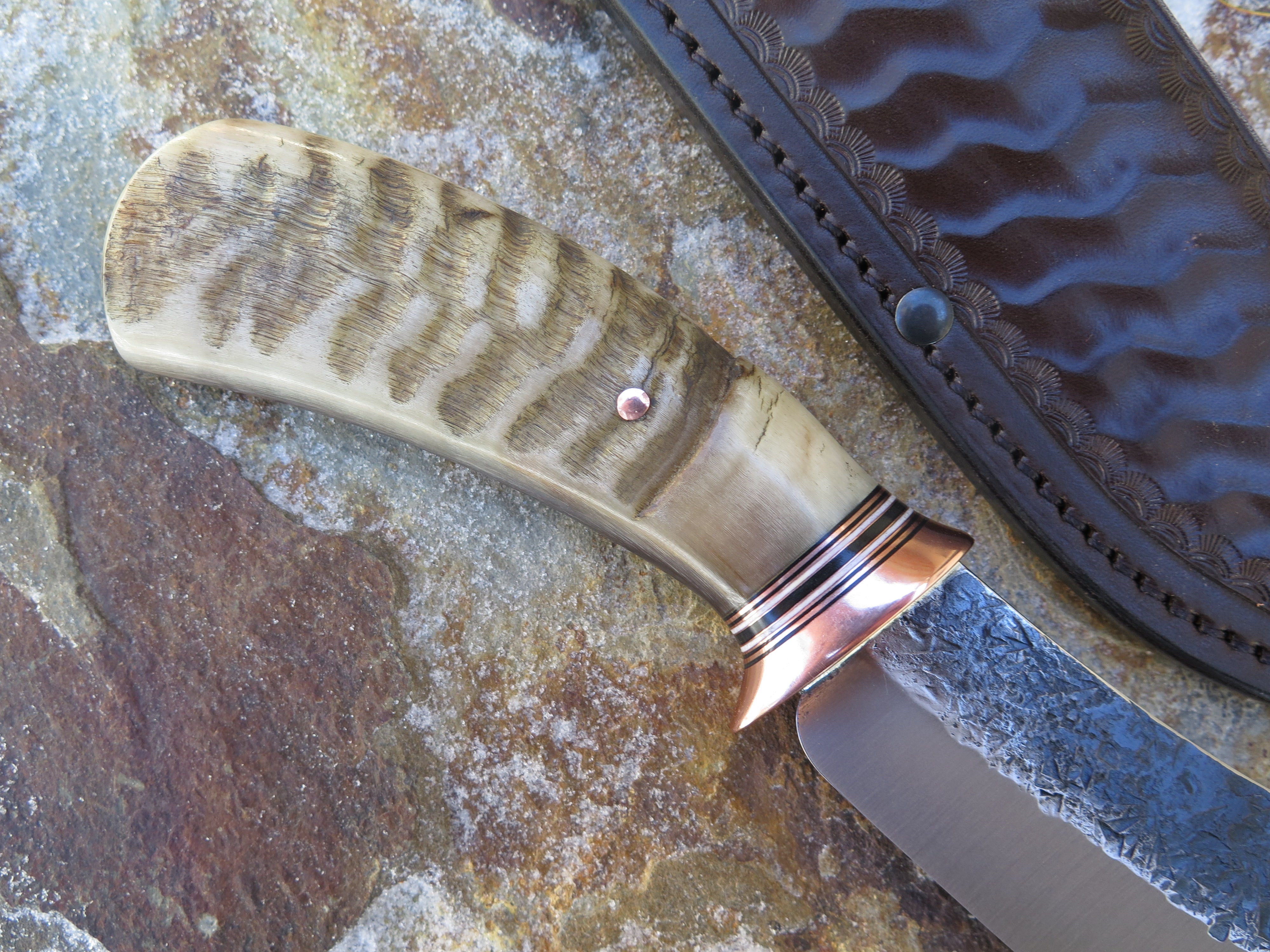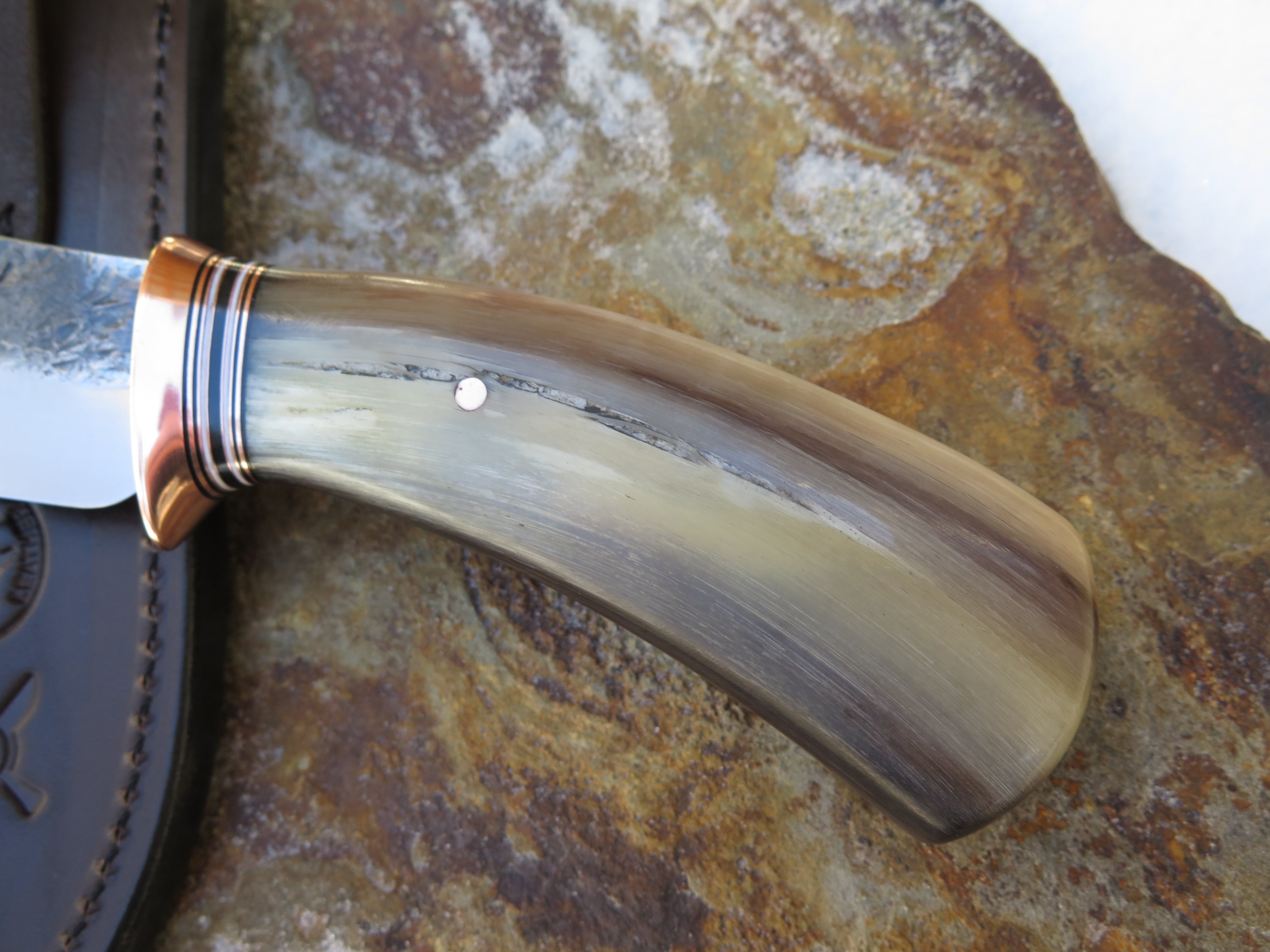 This beautiful new Clip Point from Behring Made© is hand forged from 13/64" thick 5160 spring steel and it measures 5 1/2" from tip to guard with a razor sharp hollow grind and our hammermark finish. The copper guard is soldered in place above black, white and copper spacers that top a high figure big horn sheep handle that's pinned through the tang with copper. The overall length measures 10 1/4" and this one comes in a ripple tooled belt pouch sheath.