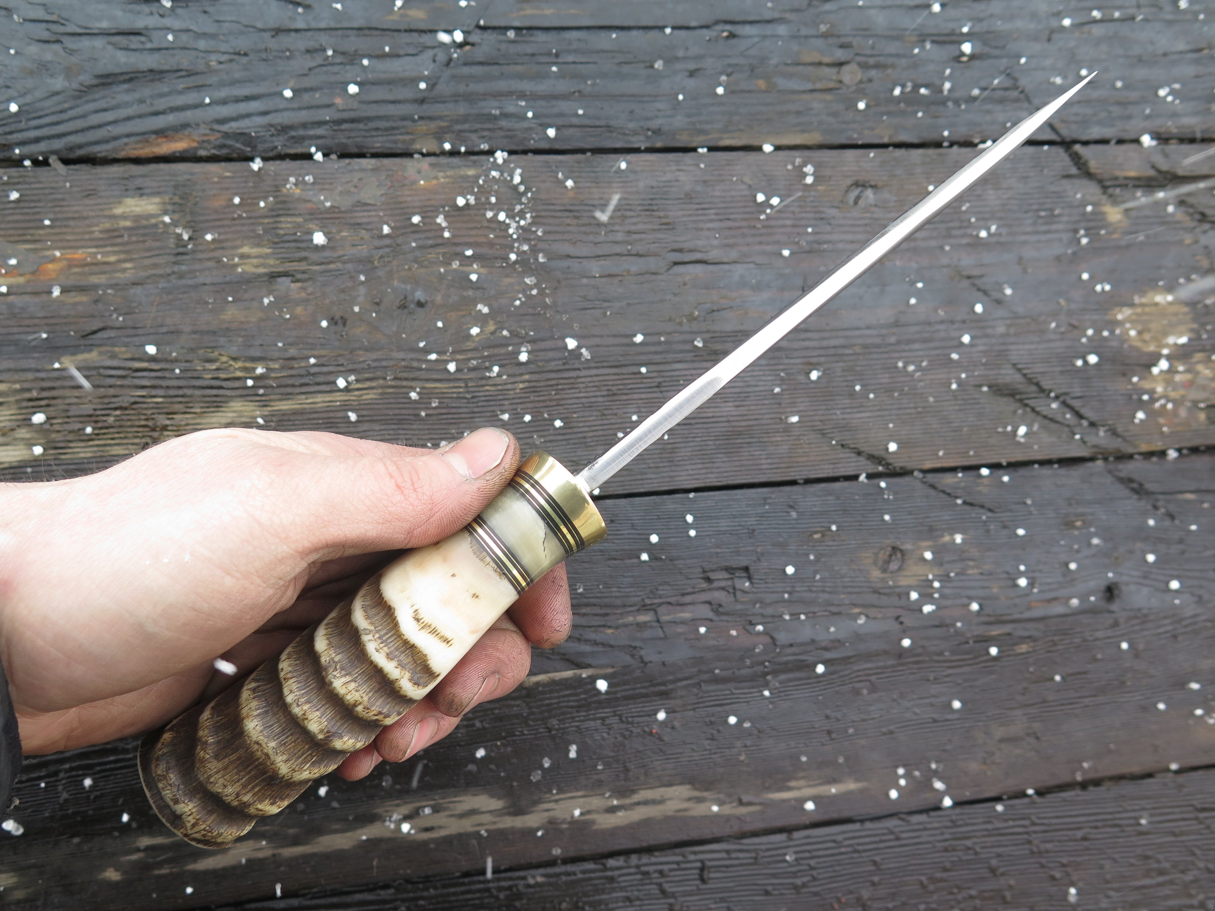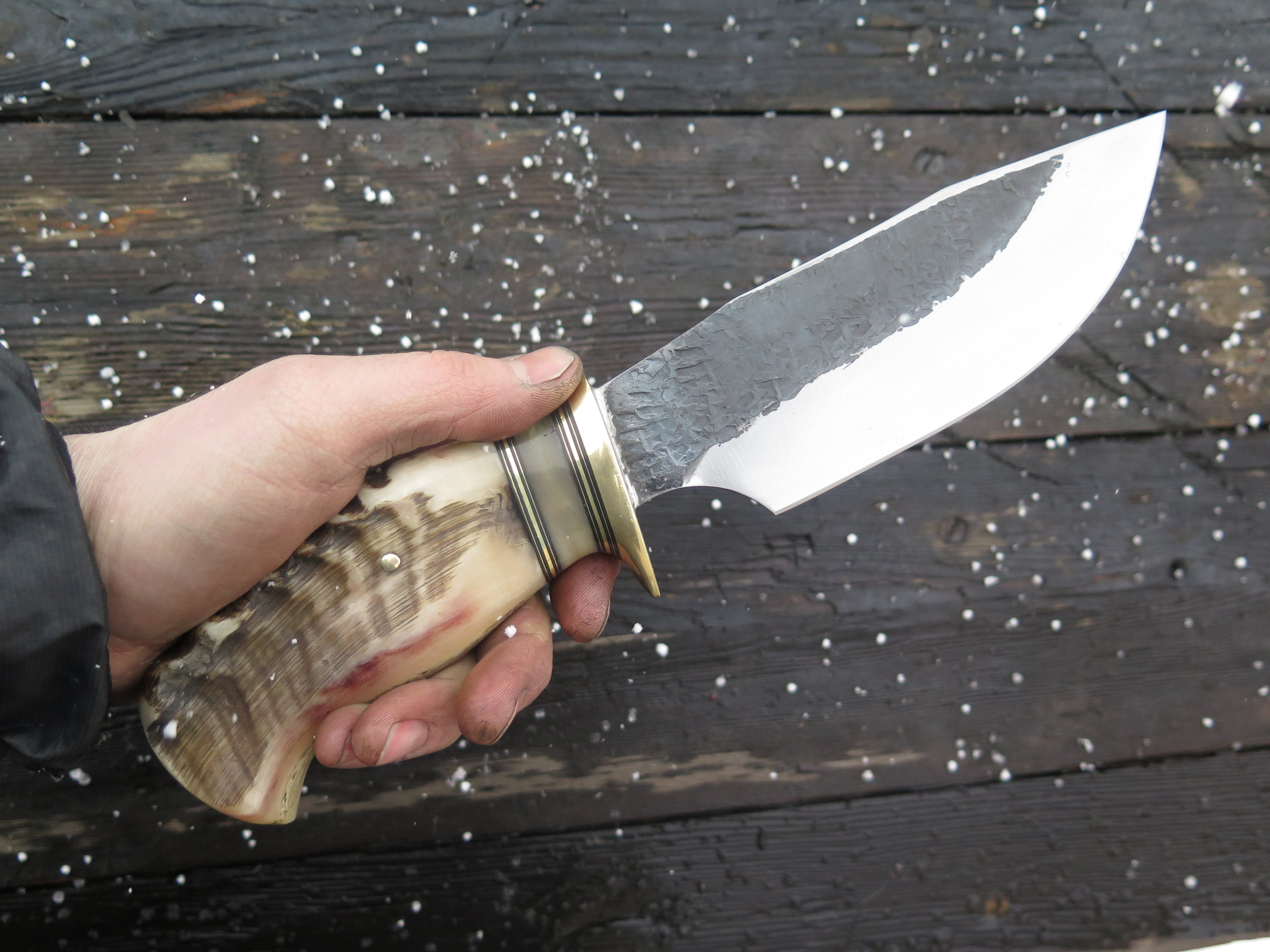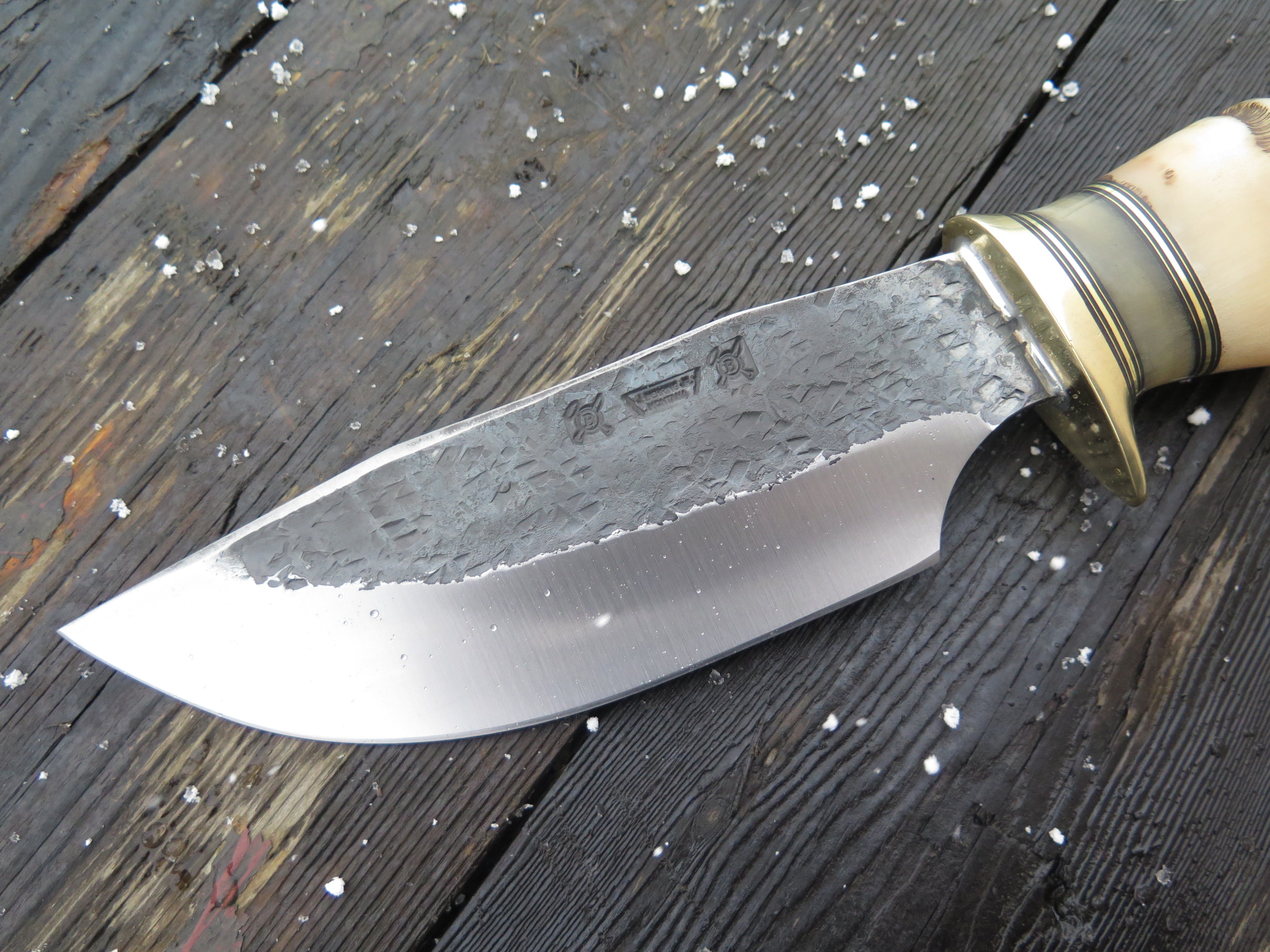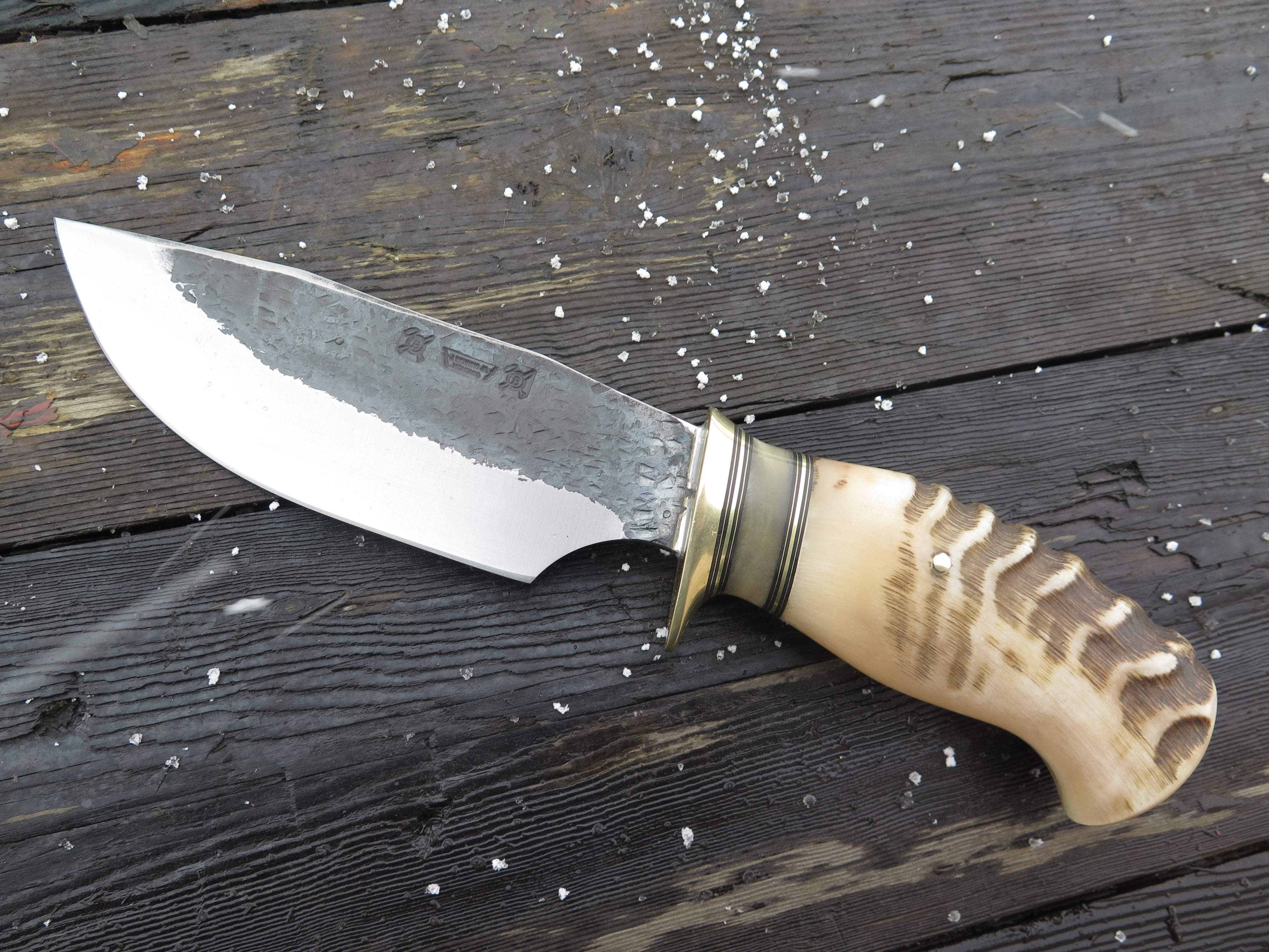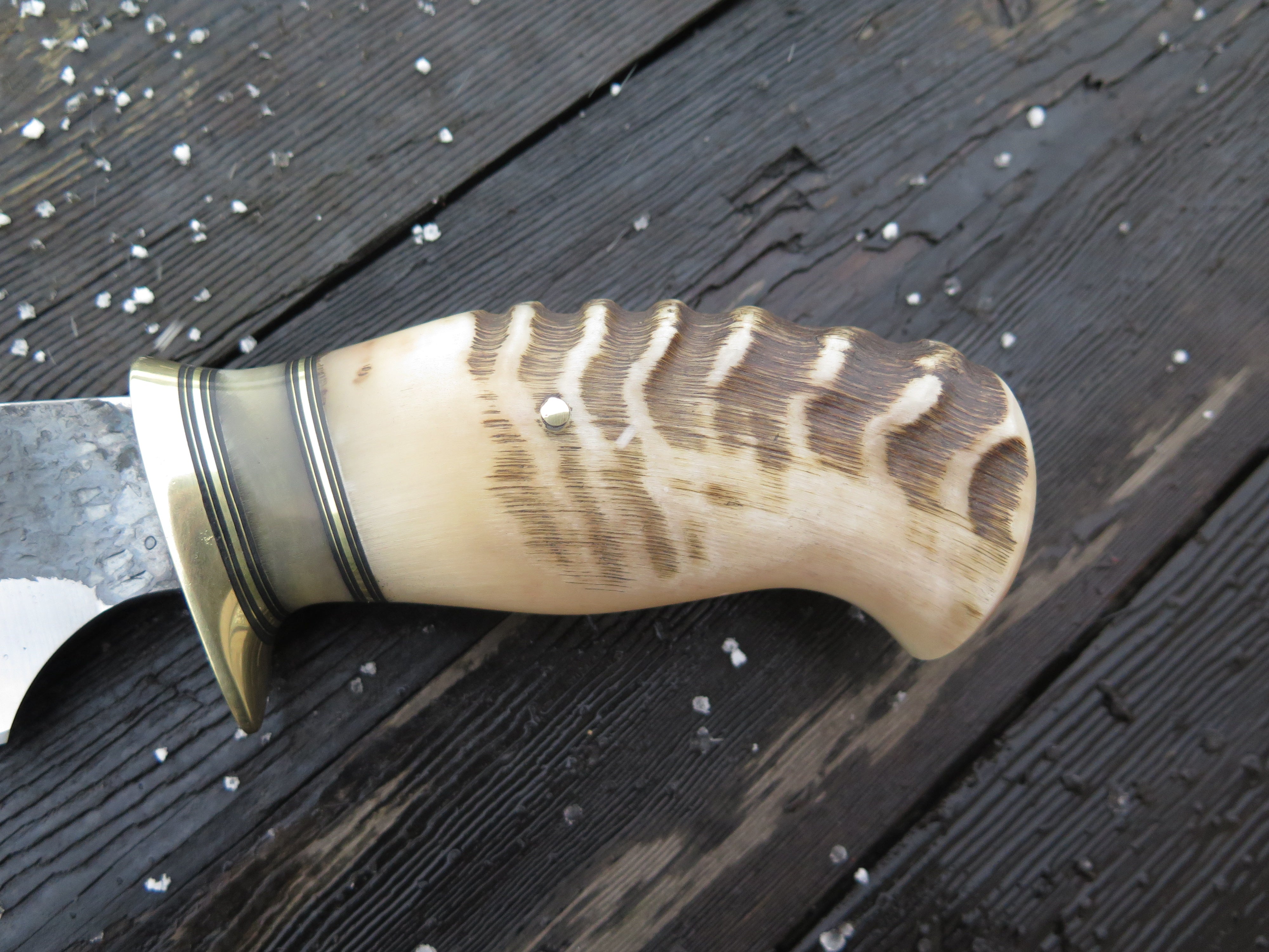 This beast from Behring Made© is every bit as beastly and rugged as the state for which it's named- the Alaskan. We hand forged the 13/64" thick 5160 spring steel blade to measure 6 1/2" from tip to guard with a razor sharp hollow grind and our hammermark finish. The brass guard is soldered in place above black fiber and brass spacers with a healthy thickness of inner sheep horn that's contrasted by a handle of the same sheep horn but showing that gnarly outside texture. Overall length measures 11 1/4" and it comes in a custom sheath from Warlander Leather.
