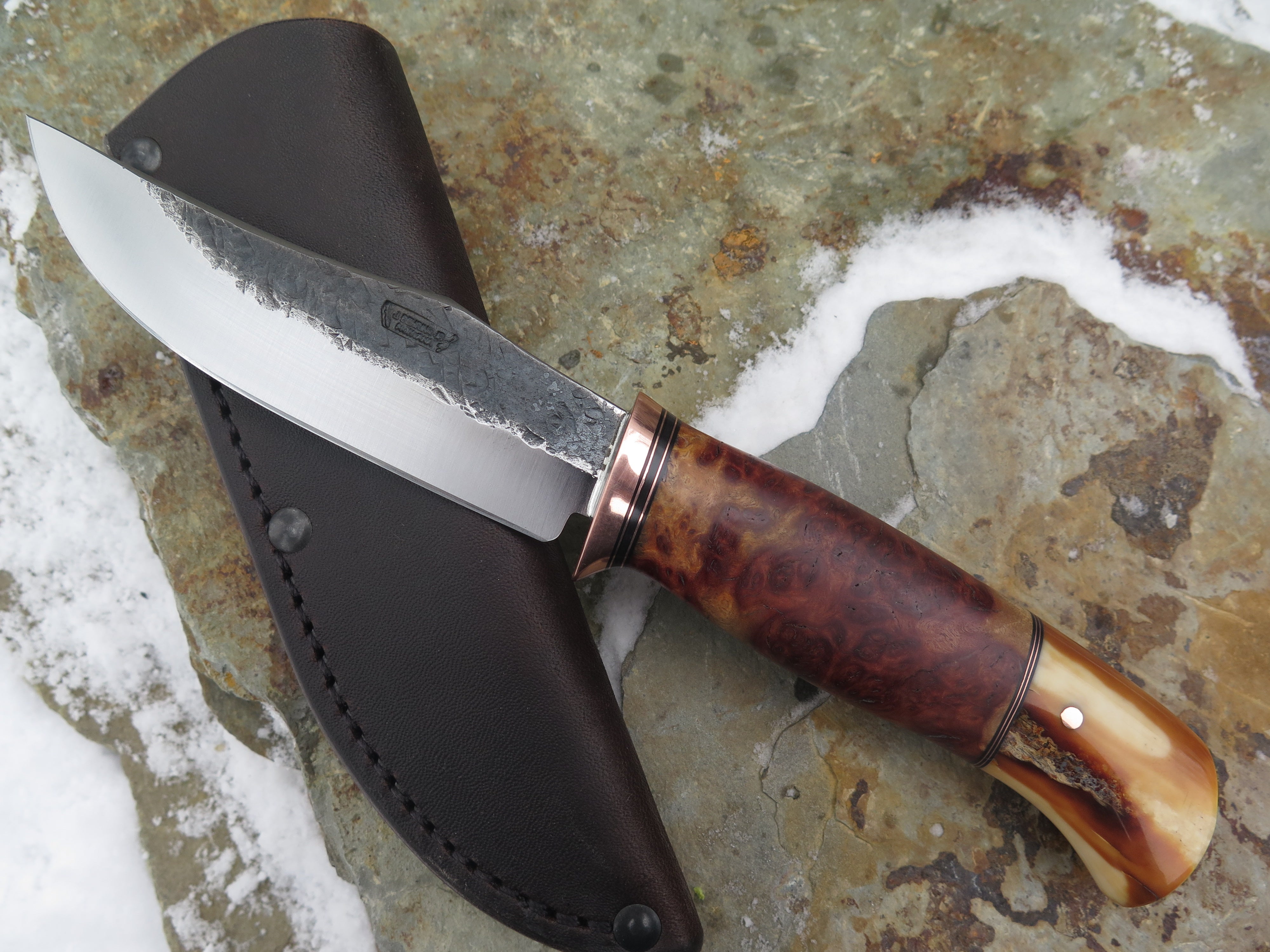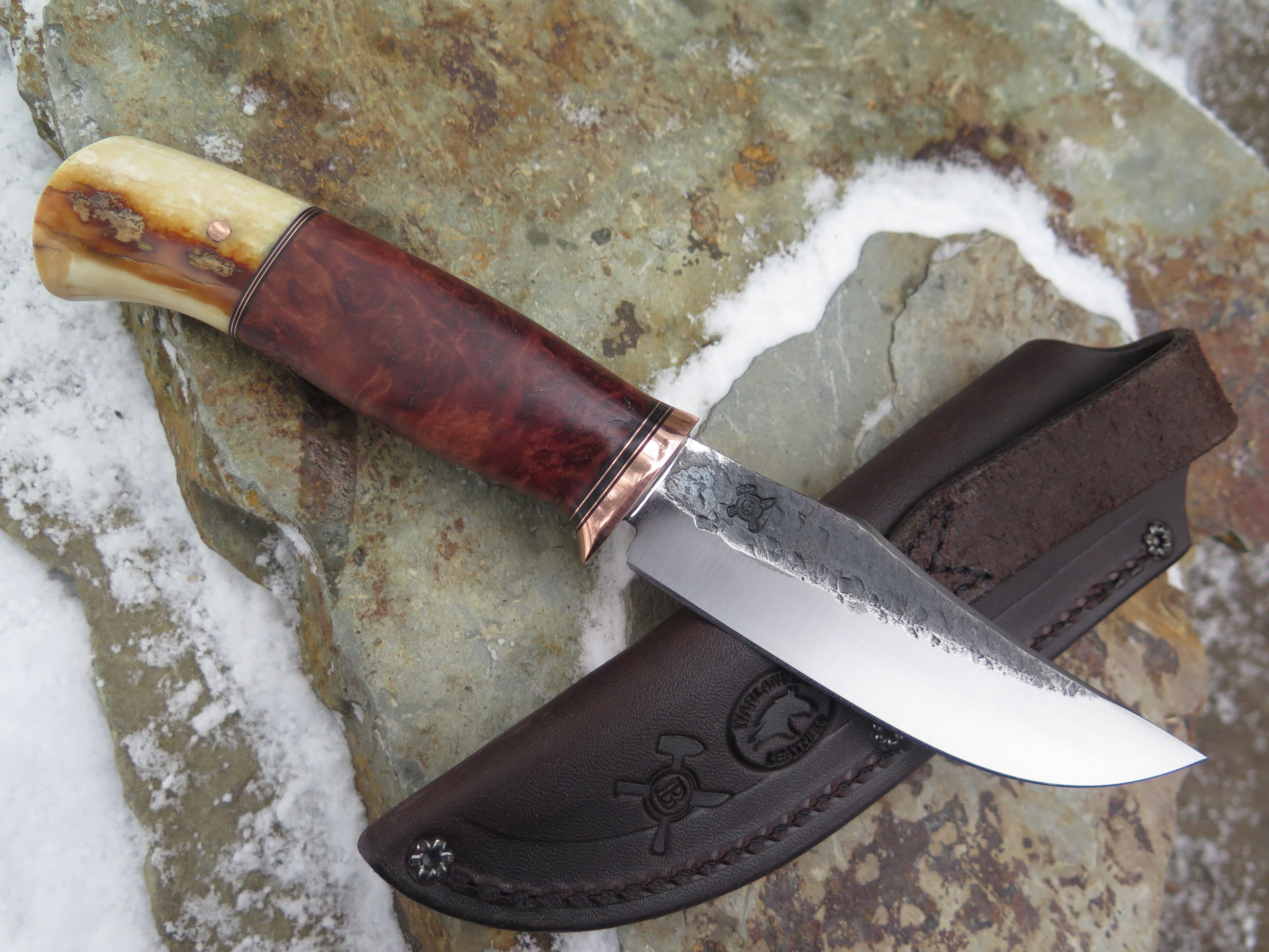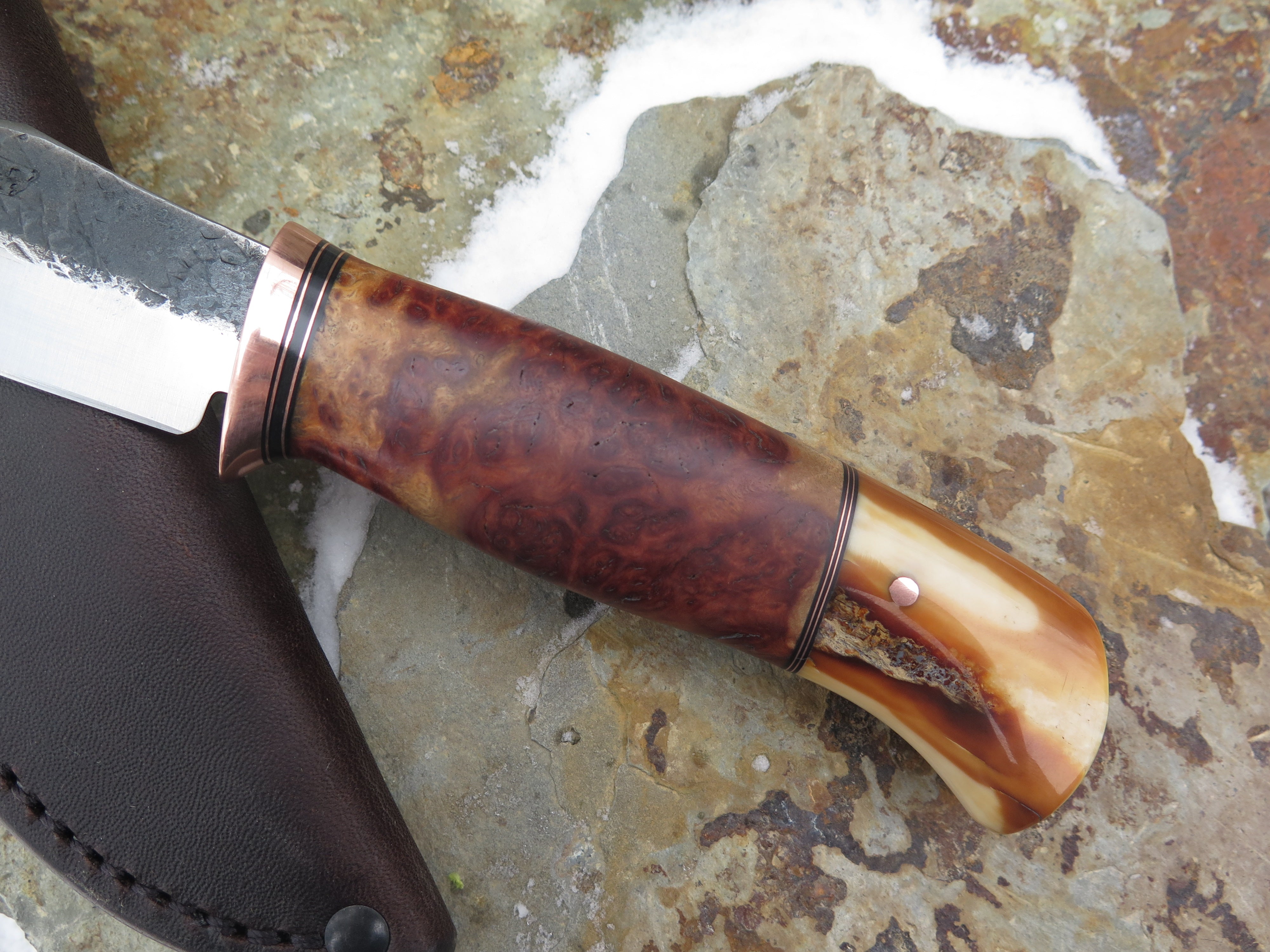 This astounding new Clip Point from Behring Made© is hand forged from 1/8" thick high carbon 01 tool steel and it measures 4 1/2" from tip to guard with a razor sharp hollow grind and our hammermark finish. The copper guard is soldered in place above black fiber and copper spacers amidst a two-piece stack of marvelous amboyna burl wood and fossil walrus ivory that's pinned through the tang with copper. The overall length measures 9 1/4" and it comes in a classic leather belt pouch sheath.