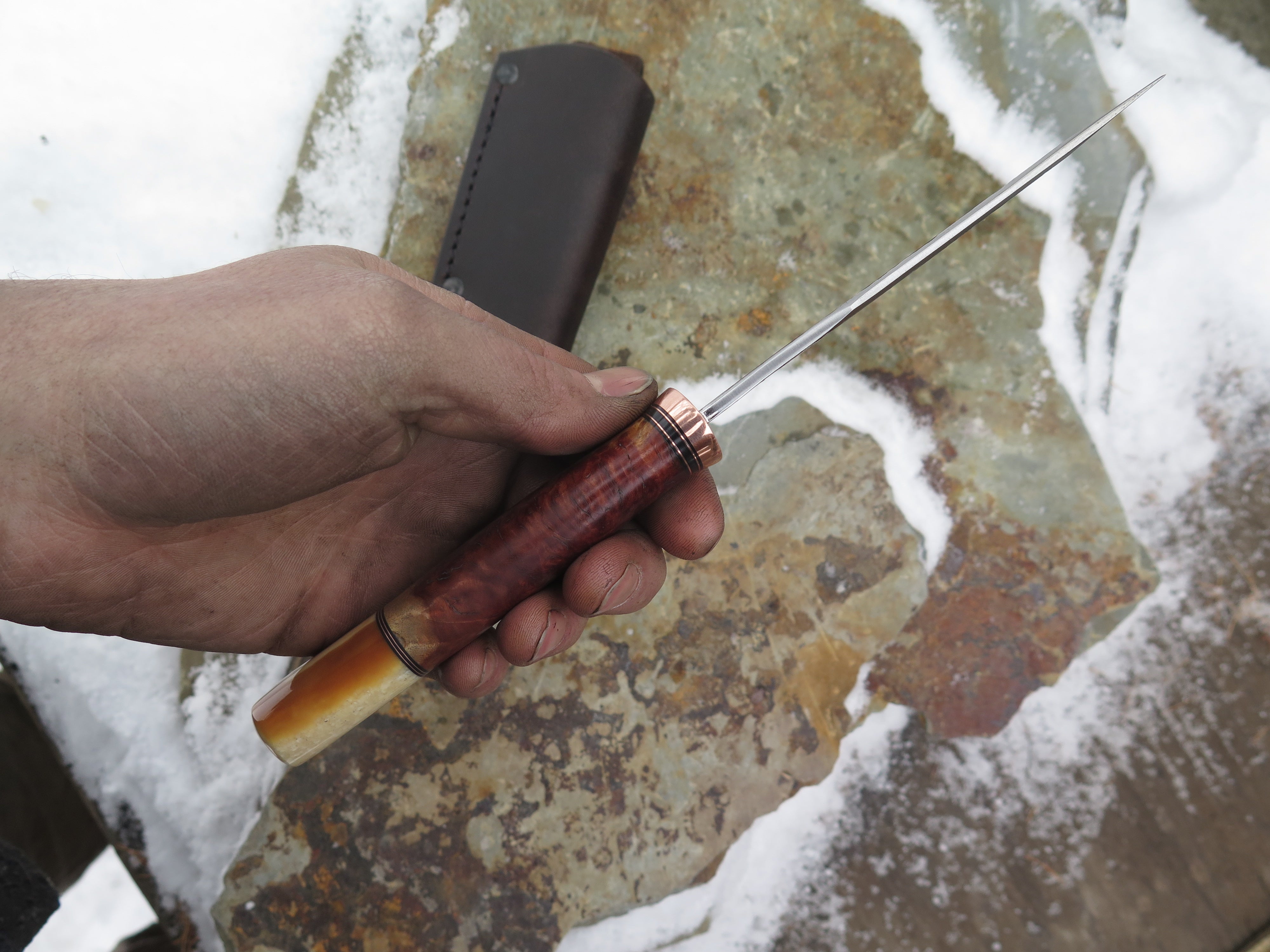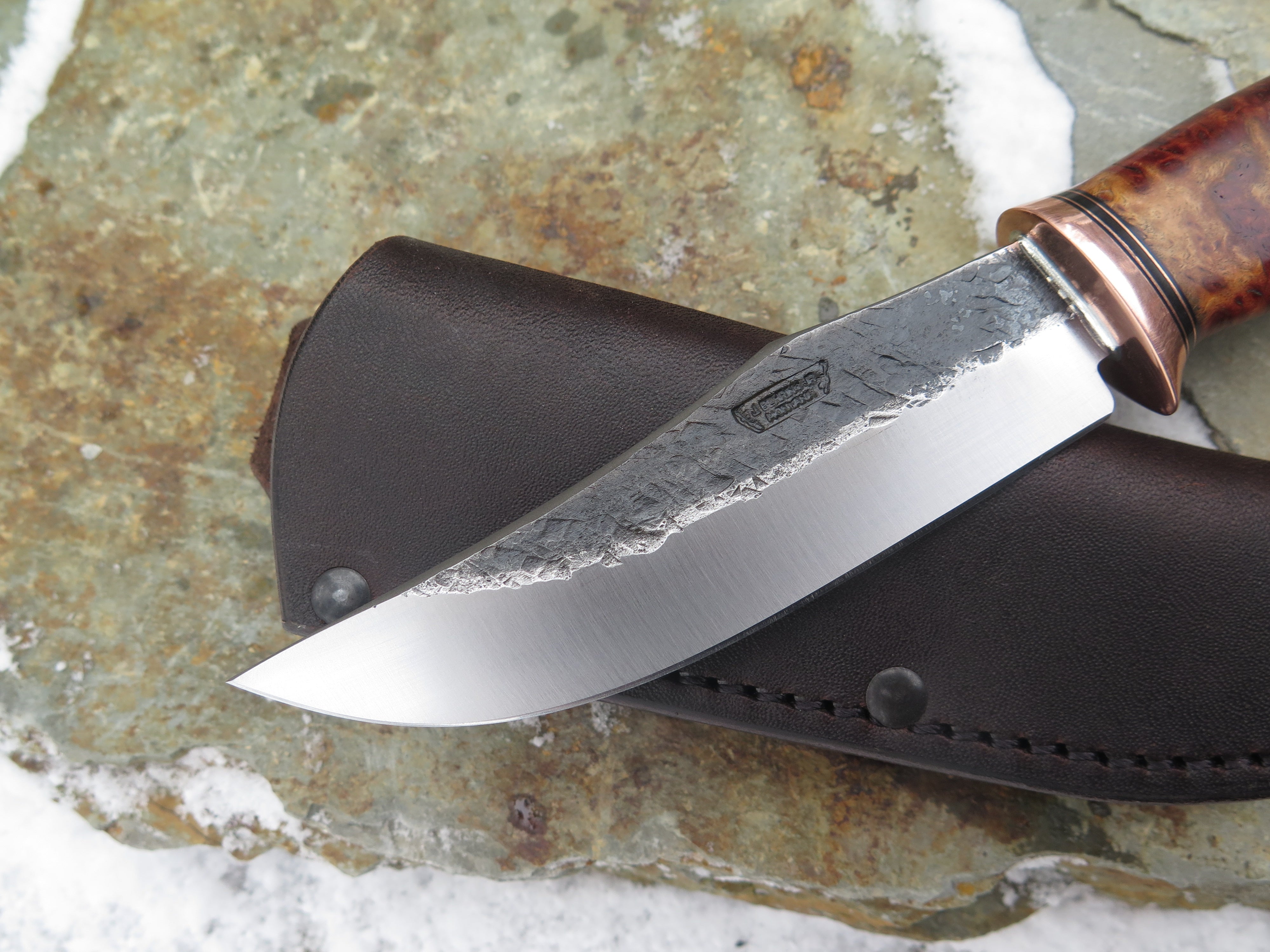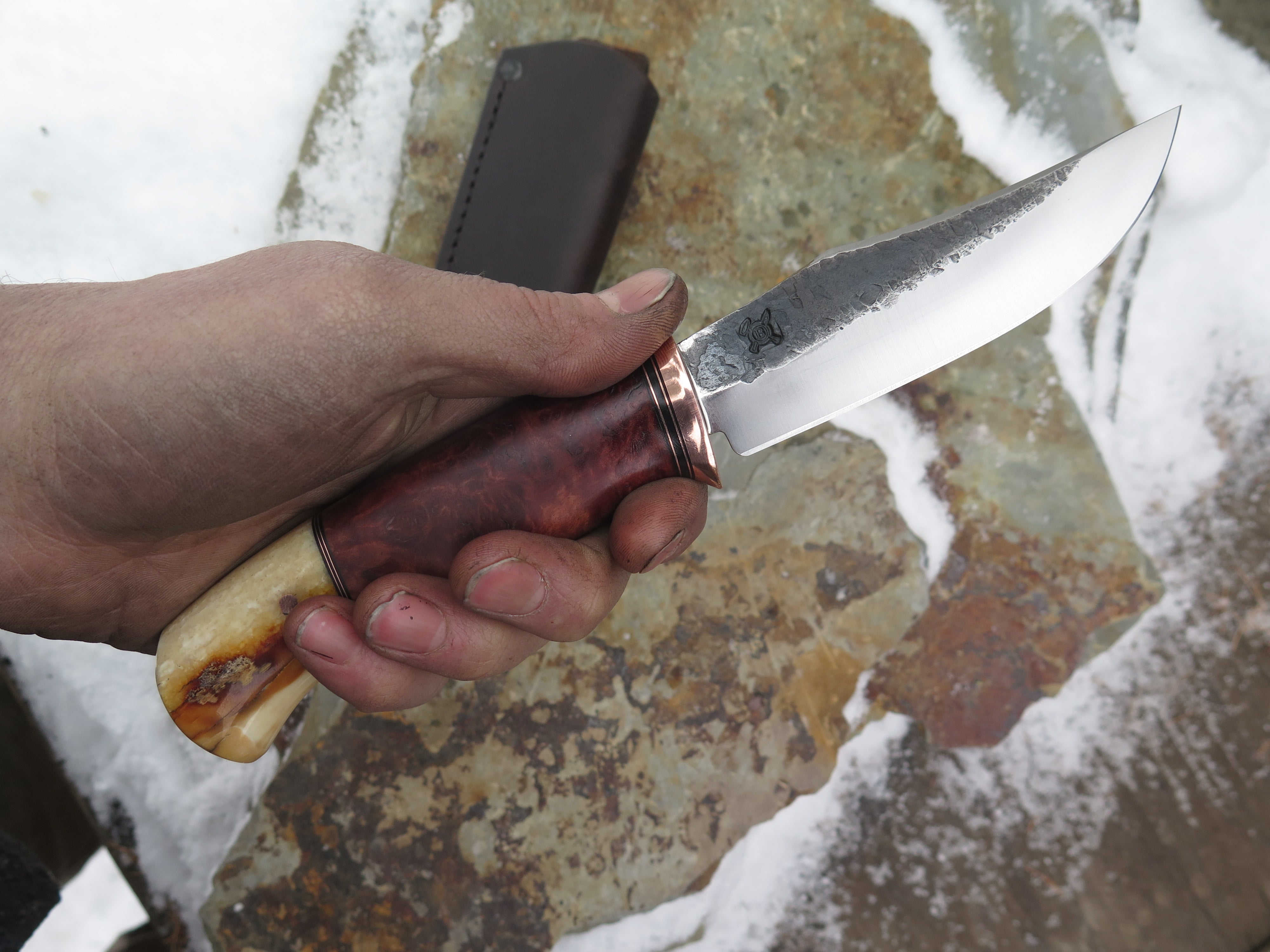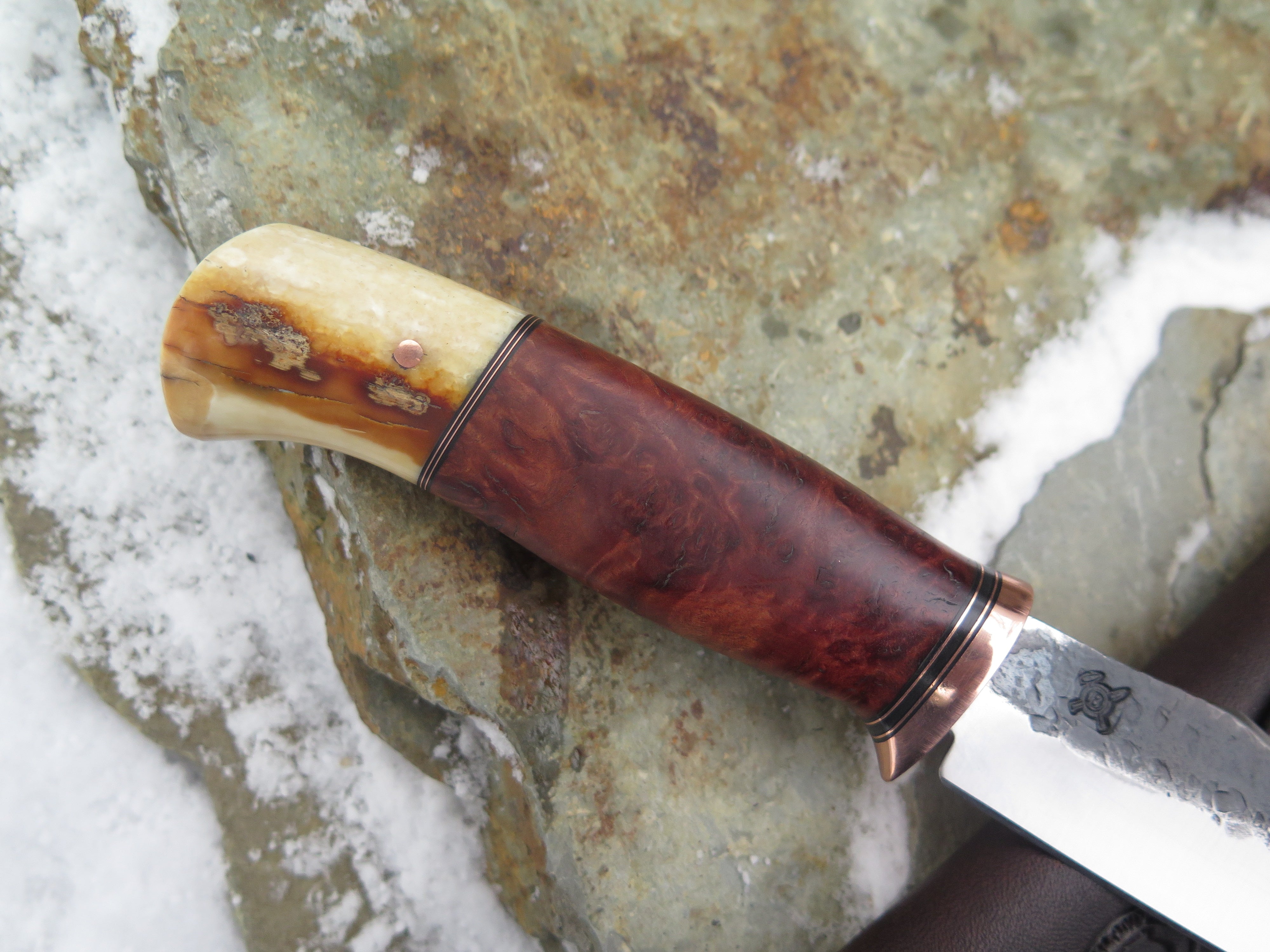 This astounding new Clip Point from Behring Made© is hand forged from 1/8" thick high carbon 01 tool steel and it measures 4 1/2" from tip to guard with a razor sharp hollow grind and our hammermark finish. The copper guard is soldered in place above black fiber and copper spacers amidst a two-piece stack of marvelous amboyna burl wood and fossil walrus ivory that's pinned through the tang with copper. The overall length measures 9 1/4" and it comes in a classic leather belt pouch sheath.