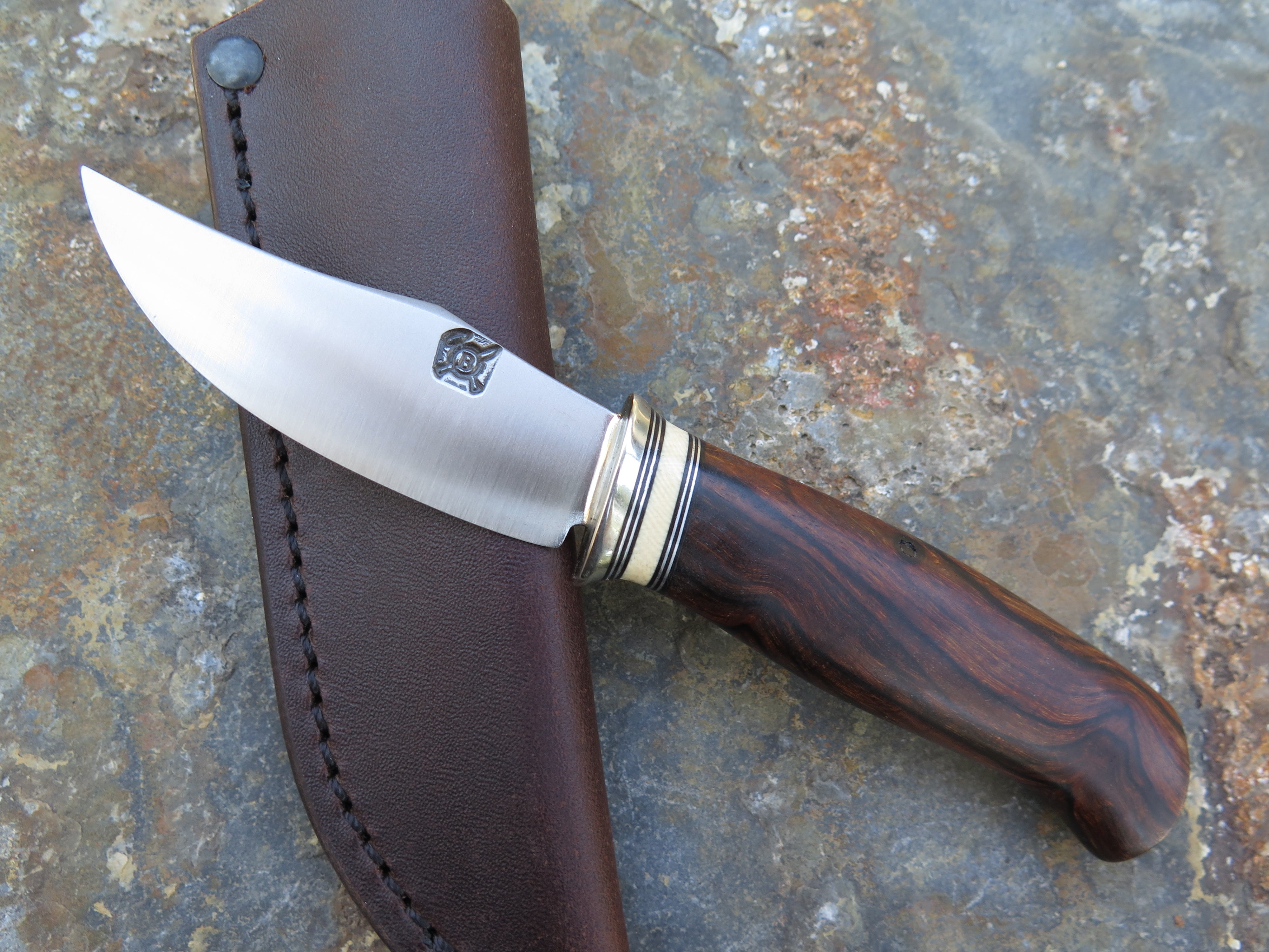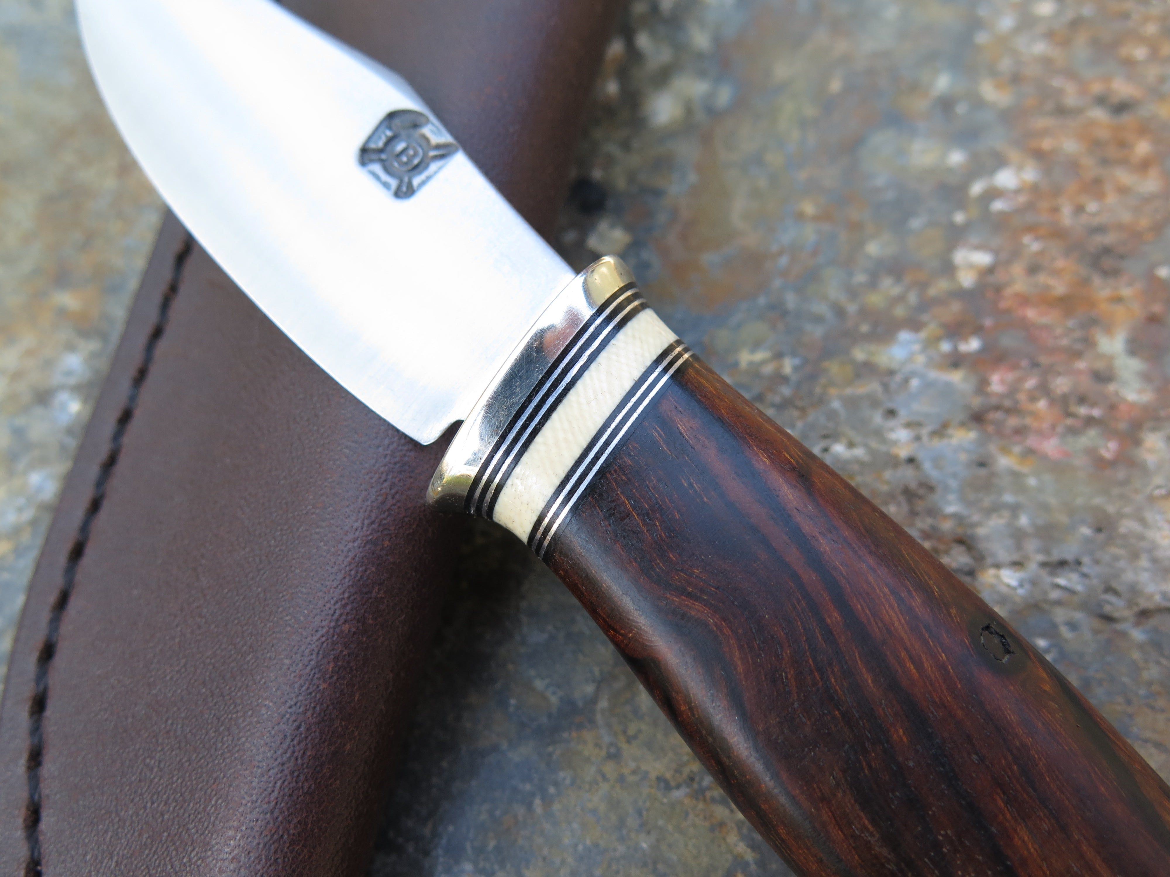 This handsome new Clip Point from Behring Made© is hand forged from 1/8" thick high carbon 01 tool steel and it measures 3" from tip to guard with a razor sharp convex grind. The nickel silver guard is soldered in place above black, aluminum and mammoth ivory spacers as well as a premium desert ironwood handle. The overall length measures just under 6 1/2" and it comes in a classic leather belt pouch sheath.