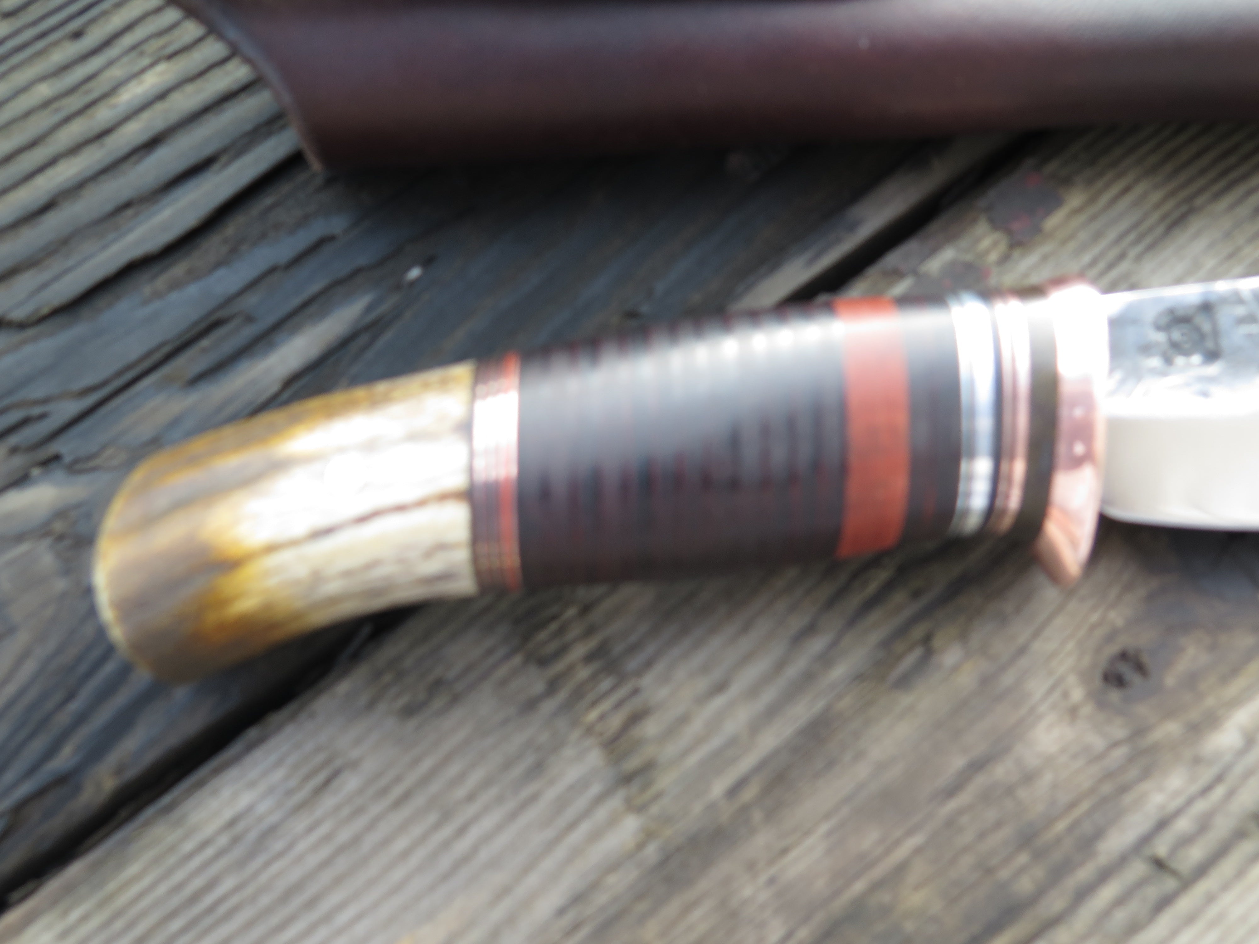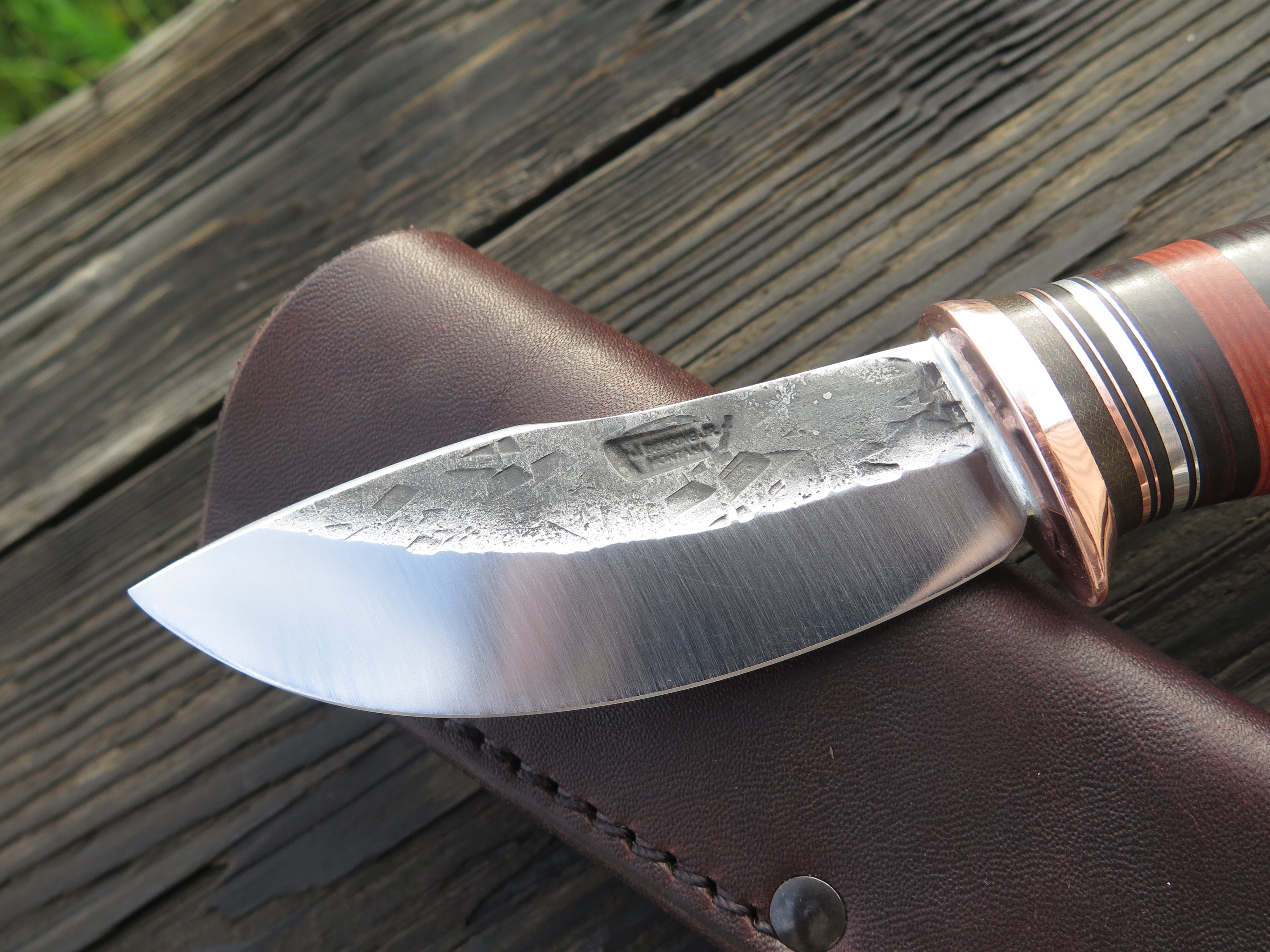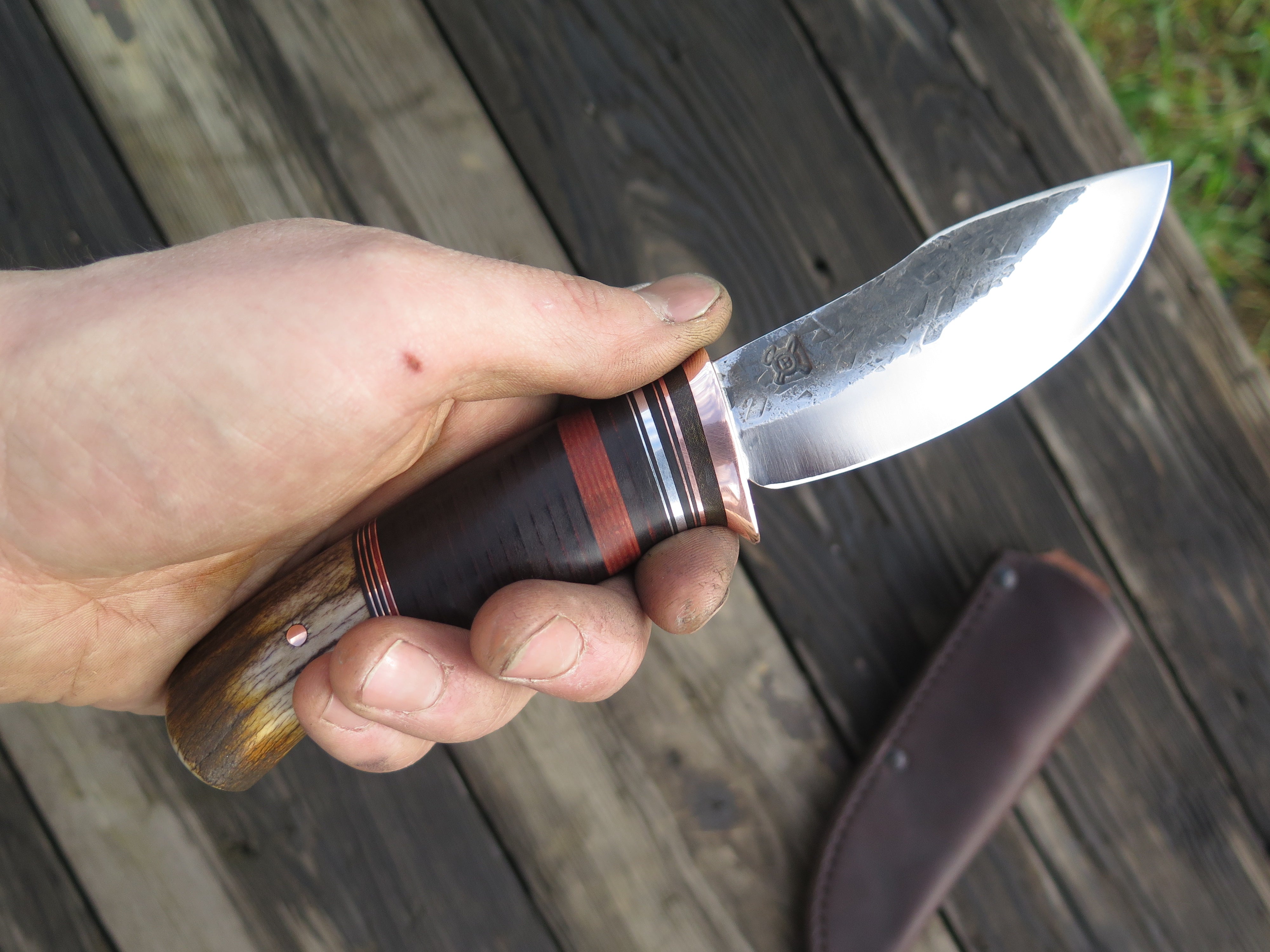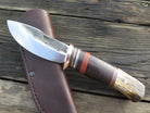 This new shape from Behring Made© is the Canoe Knife. Lightweight and versatile, it's an excellent field shape for when every ounce counts. It's hand forged from 1/8" thick high carbon 01 tool steel and measures 3 1/2" from tip to guard with a razor sharp hollow grind and our hammermark finish. The copper guard is soldered in place above green, black, maroon, aluminum and copper spacers. The premium whitetail stag handle is pinned through the tang with aluminum and the overall length measures 7 3/4". The canoe knife comes in your choice of the shown pouch sheath or an upgraded Mudbone sheath that will feature tooled imagery of an old handmade canoe.