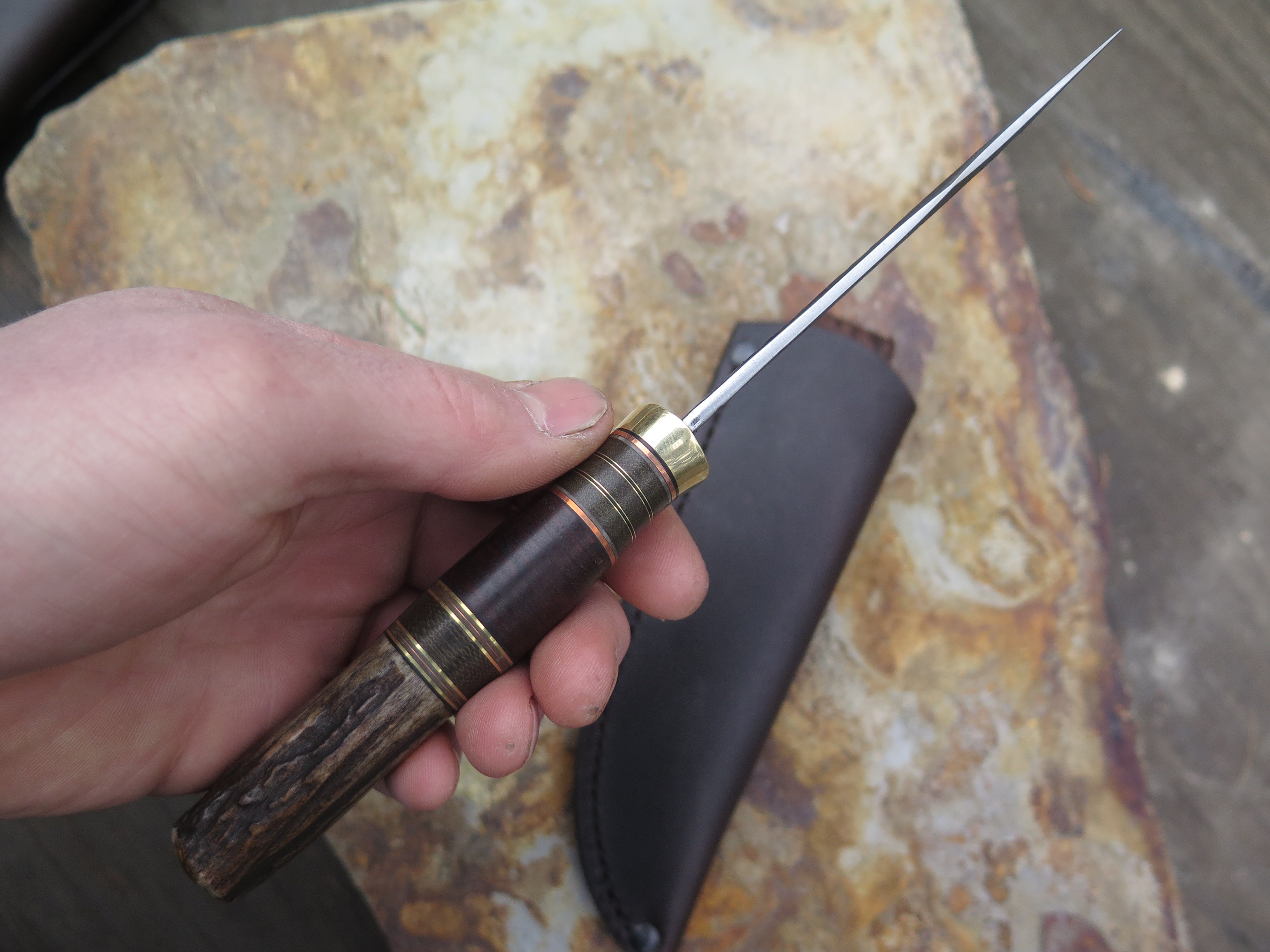 This beautiful new Clip Point from Behring Made© is hand forged from 1/8" thick high carbon 01 tool steel and it measures 4 1/4" from tip to guard with a razor sharp hollow grind and our hammermark finish. The brass guard is soldered in place above black and gray fiber, green micarta, copper, brass and horsehide spacers as well as a shiras moose butt that we pinned with brass. The overall length measures 8 1/2" and it comes in a classic leather belt pouch sheath.