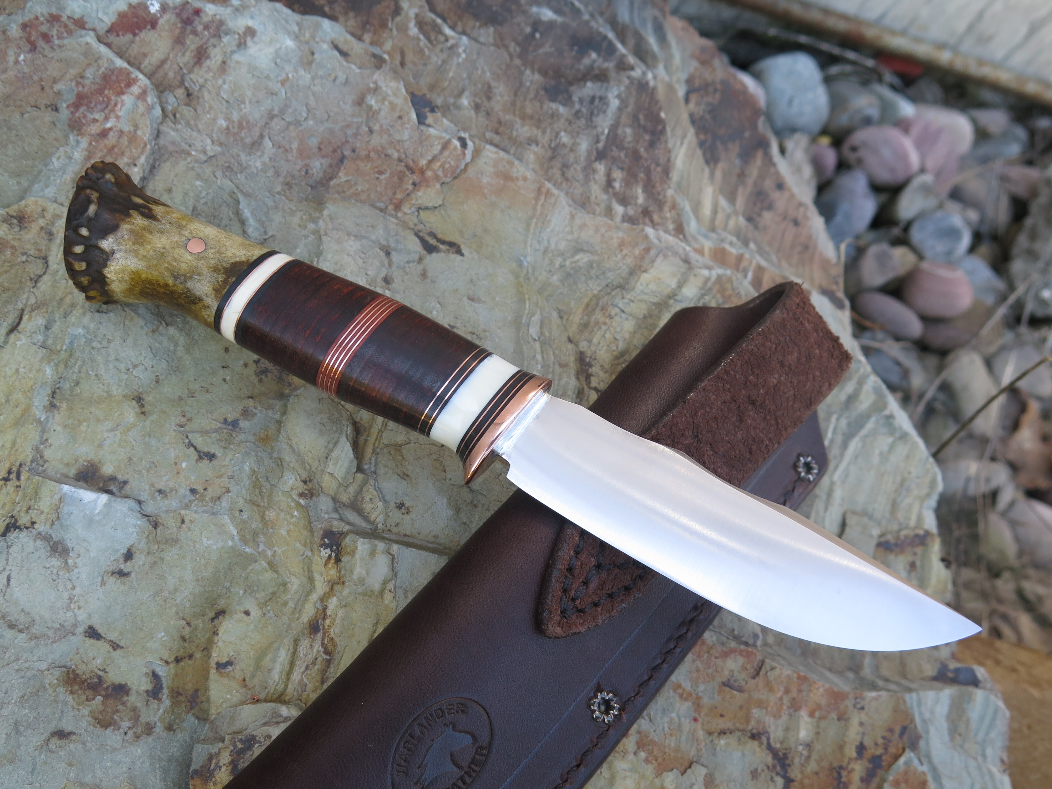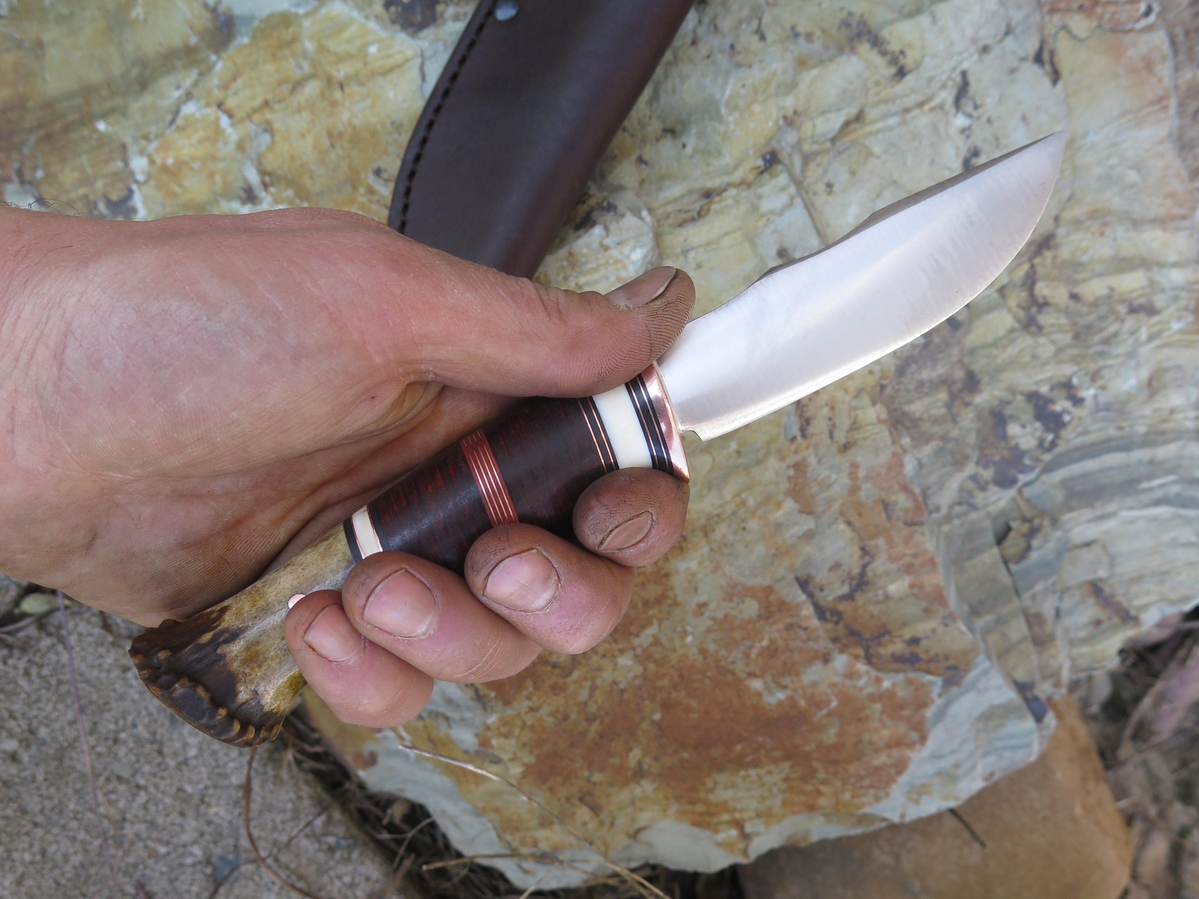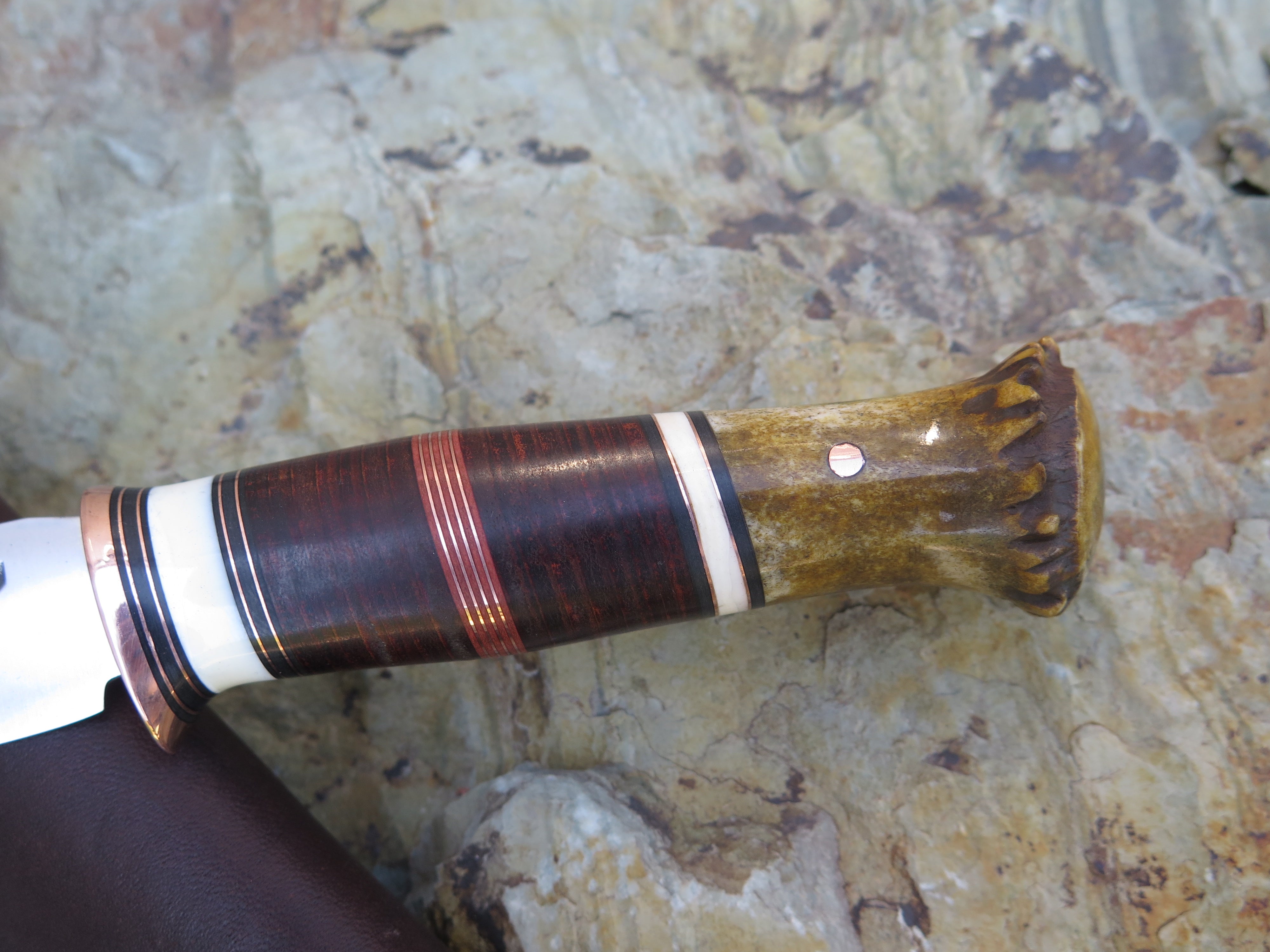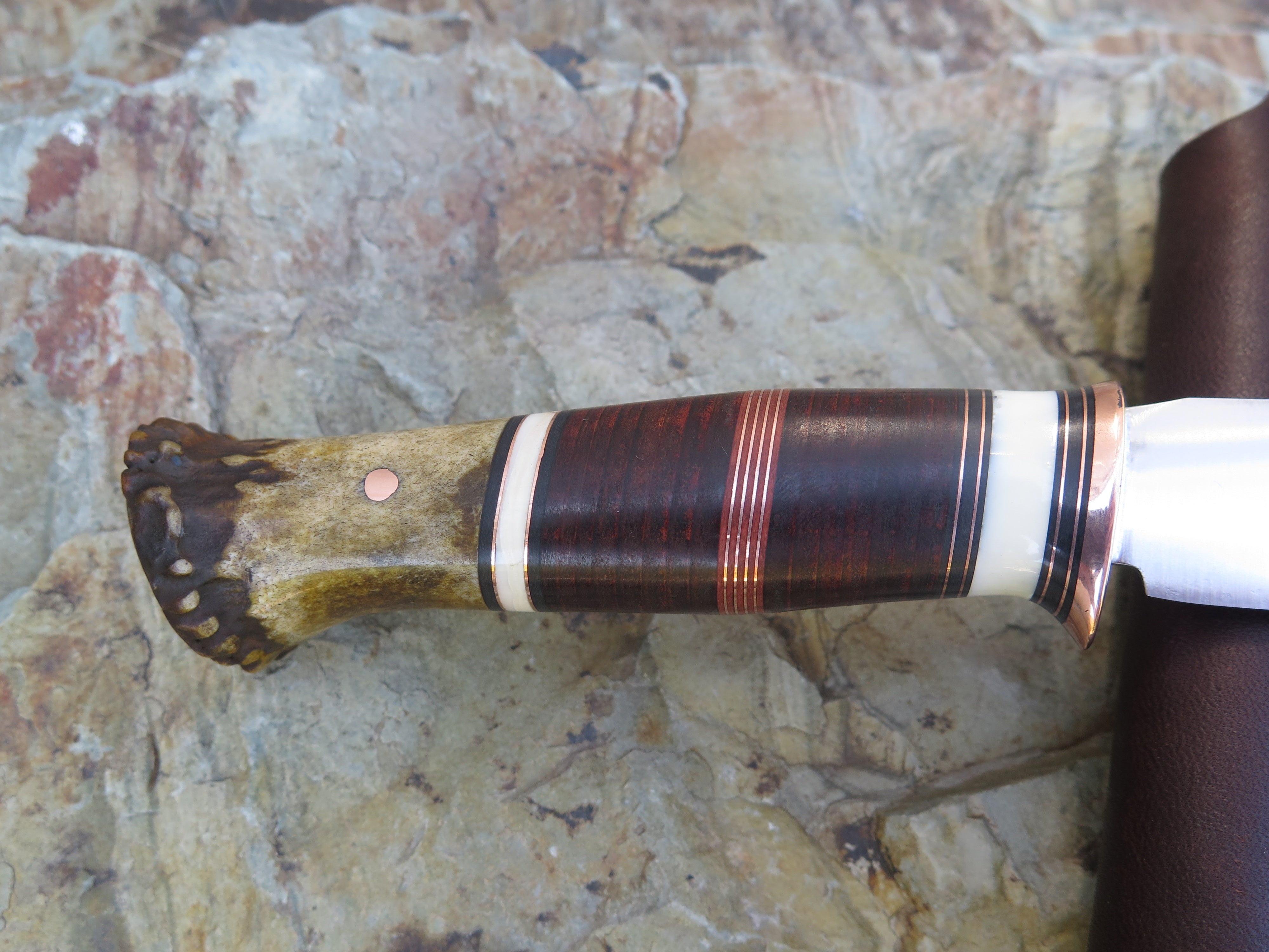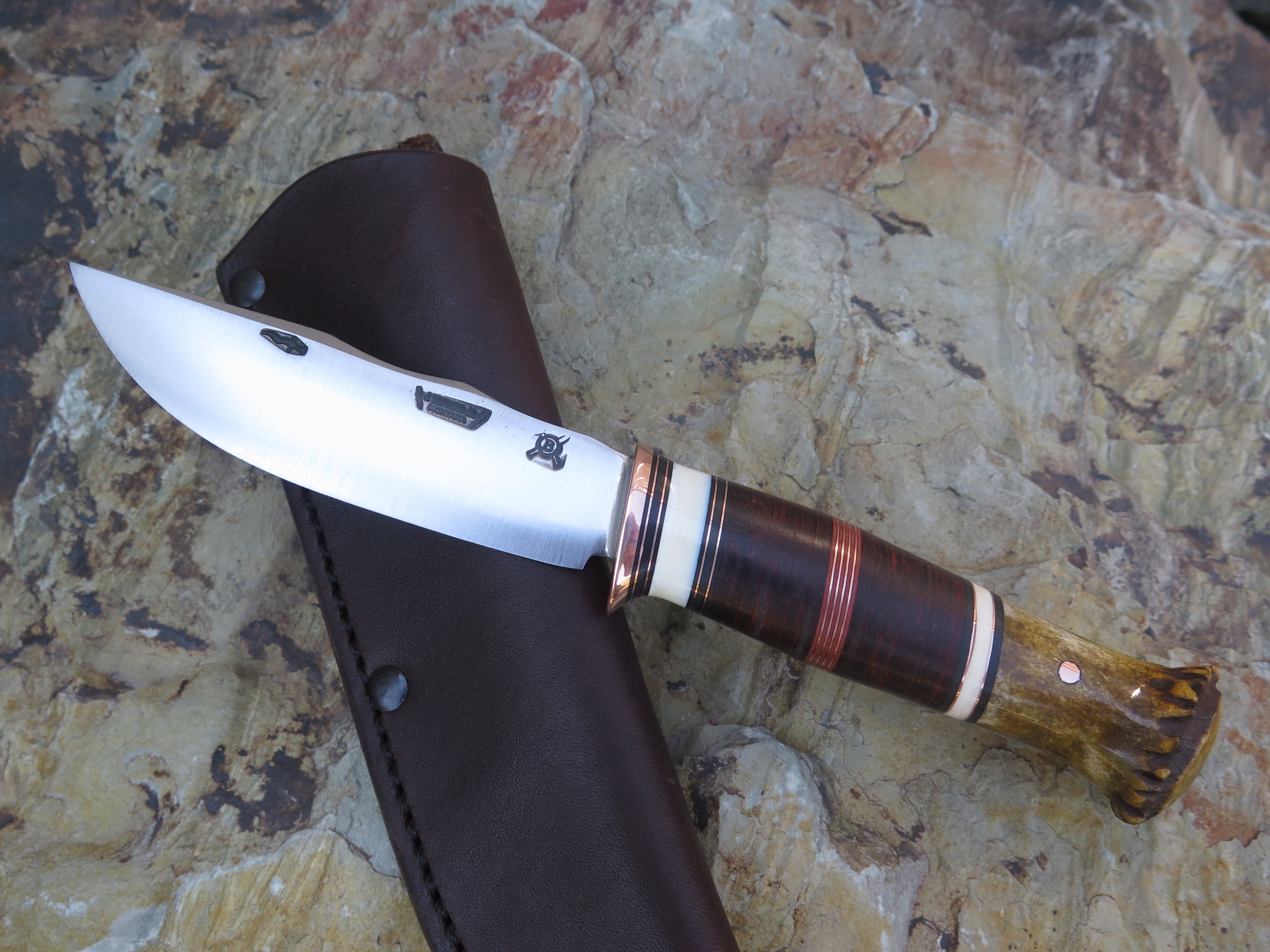 This incredible new custom from Behring Made© is a hats-off tribute to the great Bill Scagel. The blade is hand forged from 1/8" thick high carbon 01 tool steel and it measures 4 1/4" from tip to guard with a razor sharp convex grind. The copper guard is soldered in place above black and maroon fiber, copper, fossil walrus and horsehide leather spacers as well as a crown stag butt that's pinned through the tang with copper. The overall length measures 8 1/2" and it comes in a classic belt pouch sheath.
